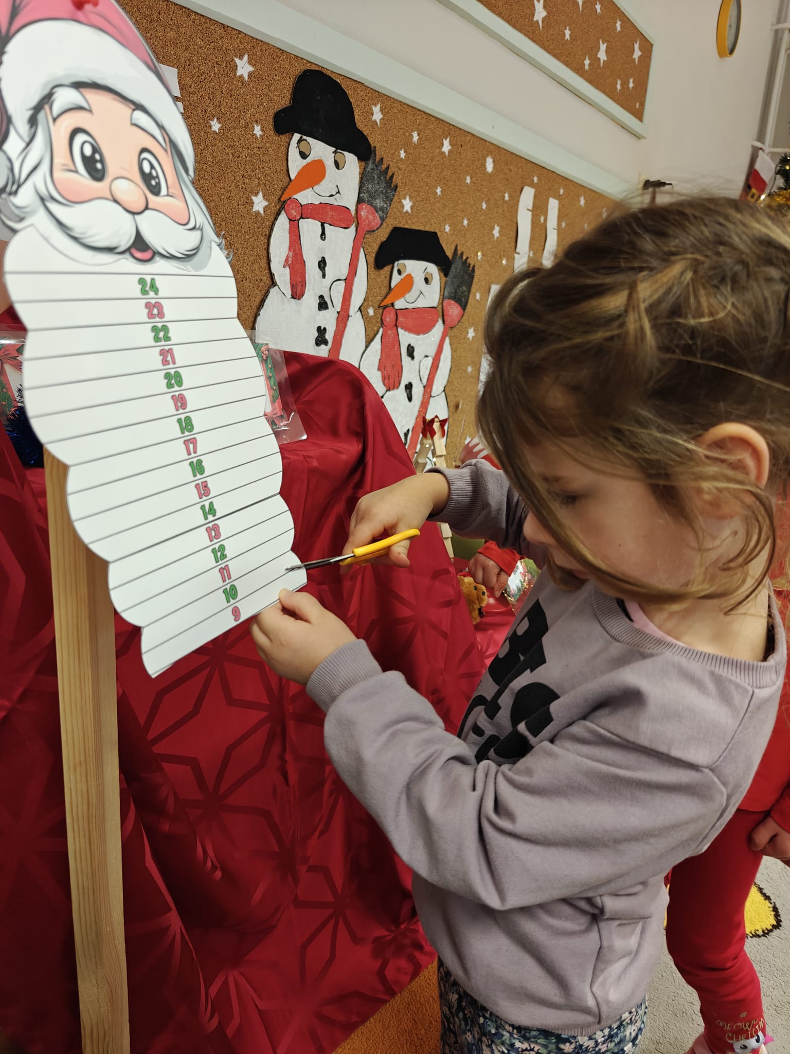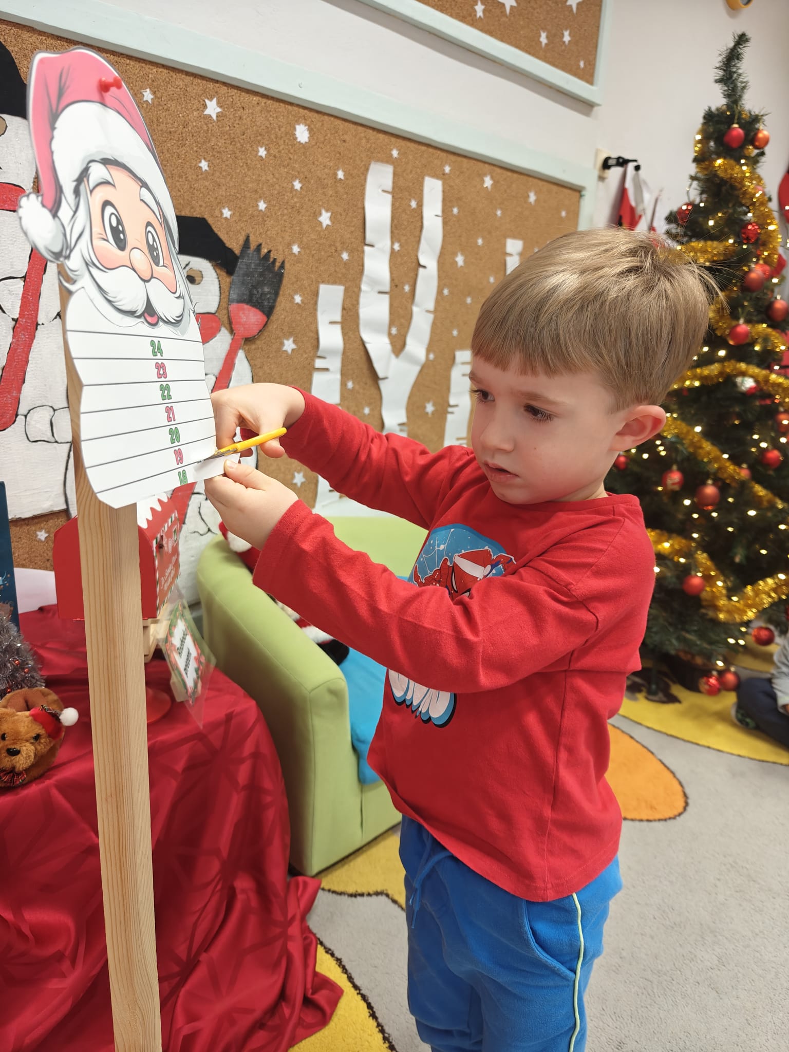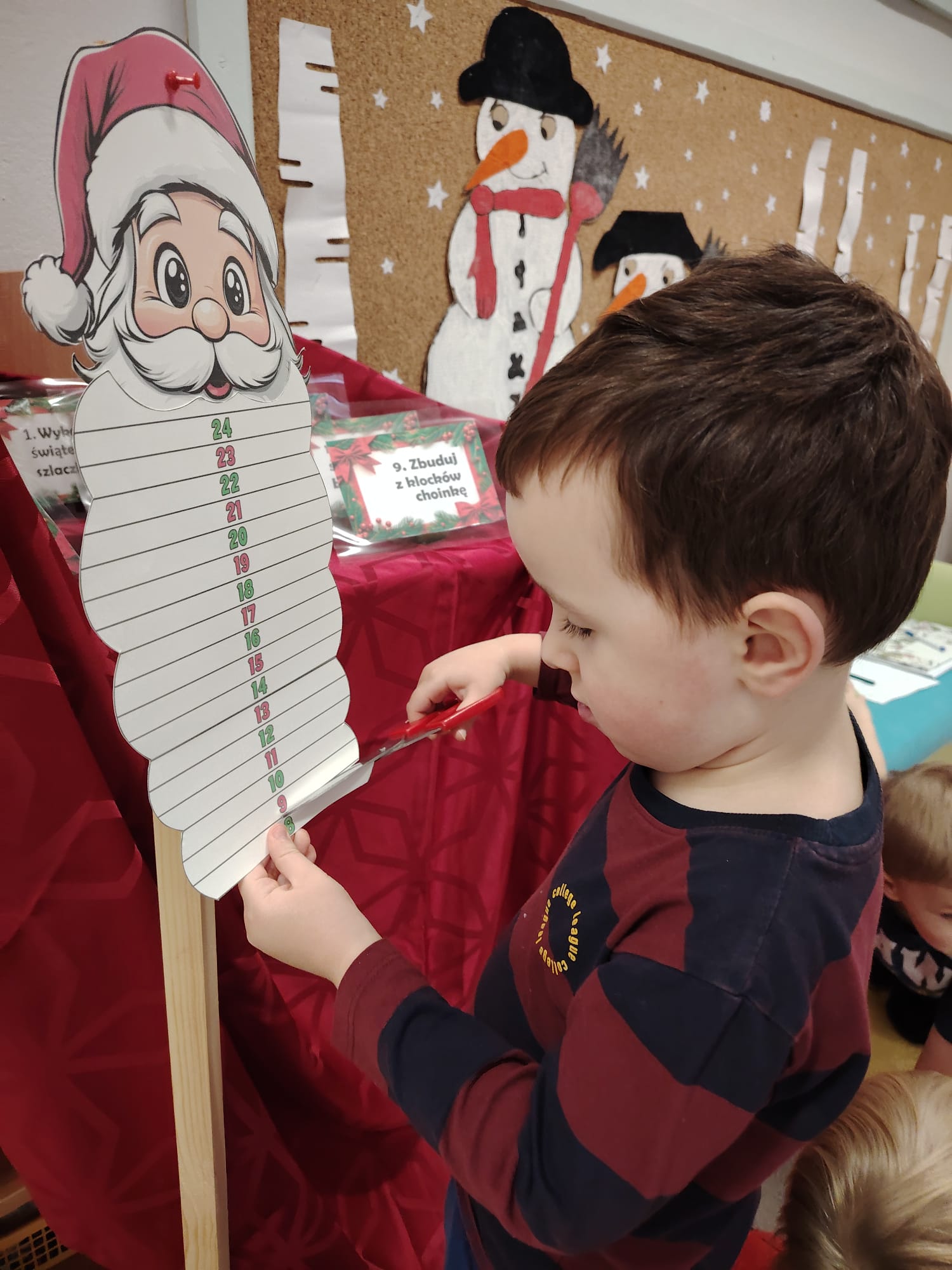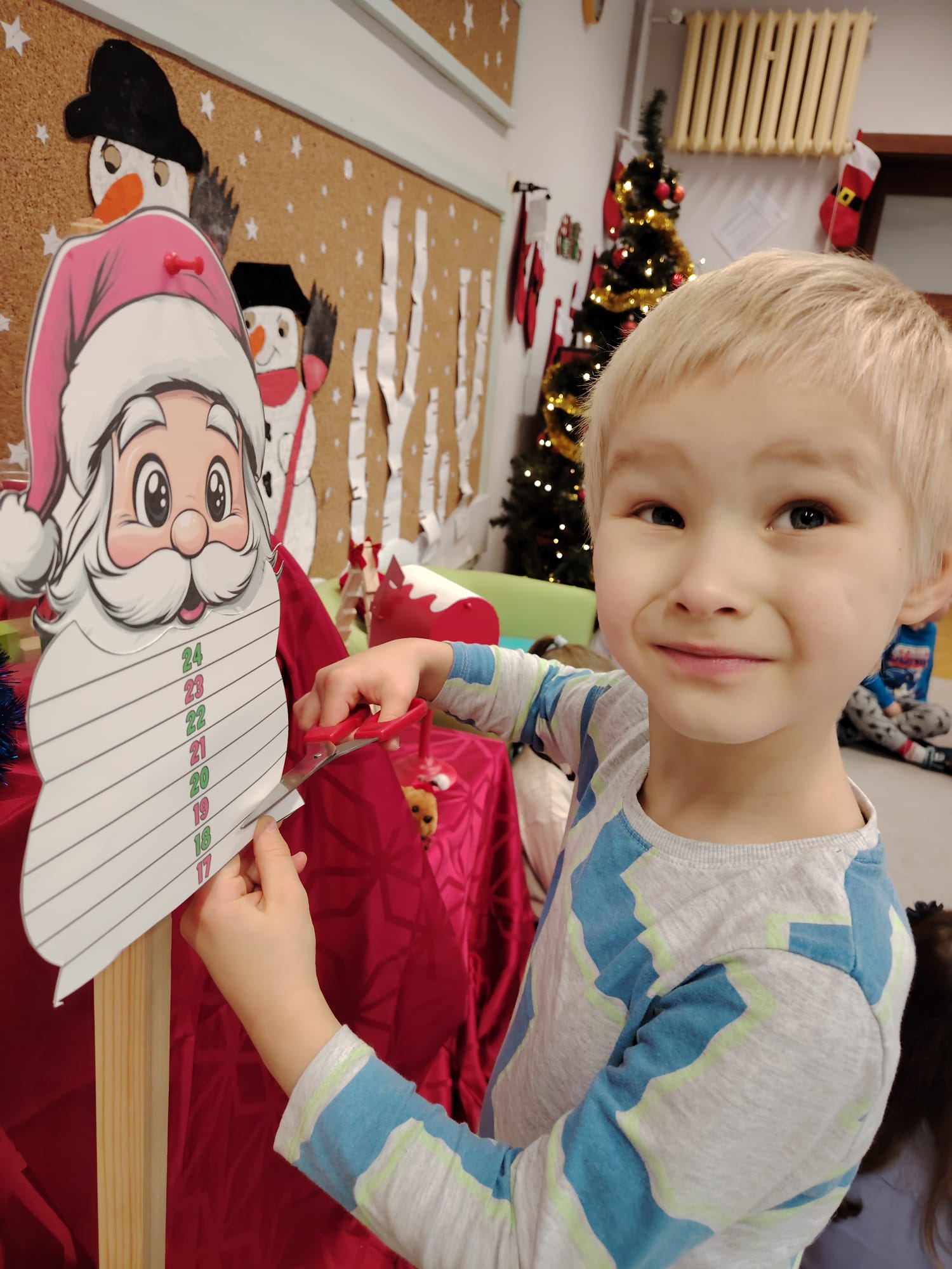 Grudzień w naszym przedszkolu był wyjątkowym czasem radosnego oczekiwania na Święta Bożego Narodzenia. Każdego dnia dzieci z wielkim zaciekawieniem odkrywały kolejne zadania ukryte w kalendarzu adwentowym. Codzienne niespodzianki wprowadzały wszystkich w świąteczny nastrój i sprawiały, że poranki rozpoczynały się z uśmiechem i entuzjazmem. Zadania adwentowe miały różnorodny charakter – były to zajęcia plastyczne, ruchowe, muzyczne oraz związane z rozwijaniem empatii i współpracy w grupie. Dzieci z ogromnym zaangażowaniem podejmowały wyzwania, rozwijając swoją kreatywność, samodzielność oraz umiejętność działania zespołowego. Wspólne wykonywanie zadań sprzyjało integracji grupy i budowaniu pozytywnych relacji rówieśniczych. Kalendarz adwentowy stanowił także doskonałą okazję do przybliżenia dzieciom tradycji i zwyczajów związanych z okresem świątecznym. Poprzez rozmowy, wspólne działania i zabawy dzieci uczyły się okazywania życzliwości, dzielenia się radością oraz dostrzegania potrzeb innych. Istotnym celem było również budowanie pozytywnych emocji związanych z oczekiwaniem, a nie tylko z samym dniem świąt. Czas spędzony z kalendarzem adwentowym był nie tylko atrakcyjną formą zabawy, ale również wartościowym doświadczeniem edukacyjnym i wychowawczym, które na długo pozostanie w pamięci dzieci, jako okres pełen magii, uśmiechów i wspólnych, pięknych chwil. Grupa II świątecznie zaprasza do galerii.