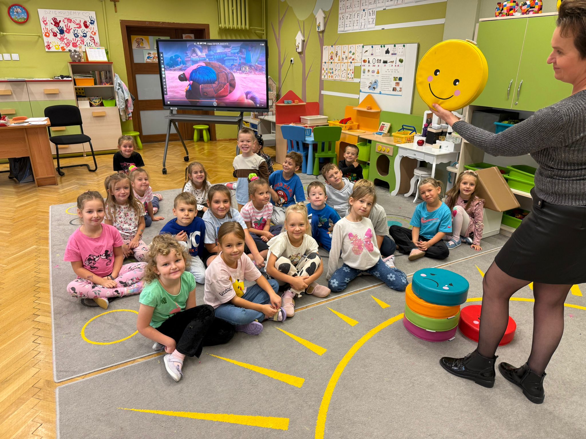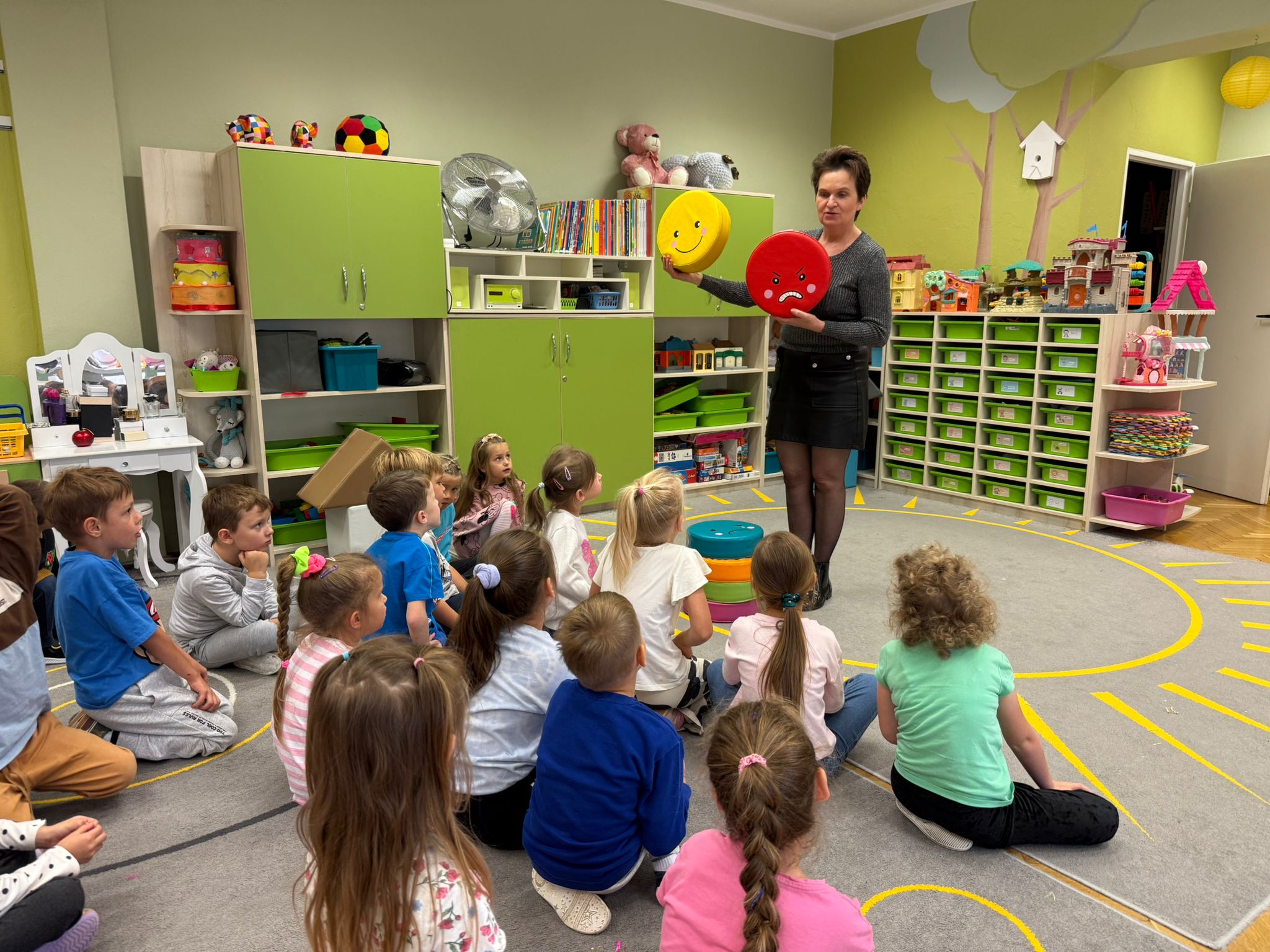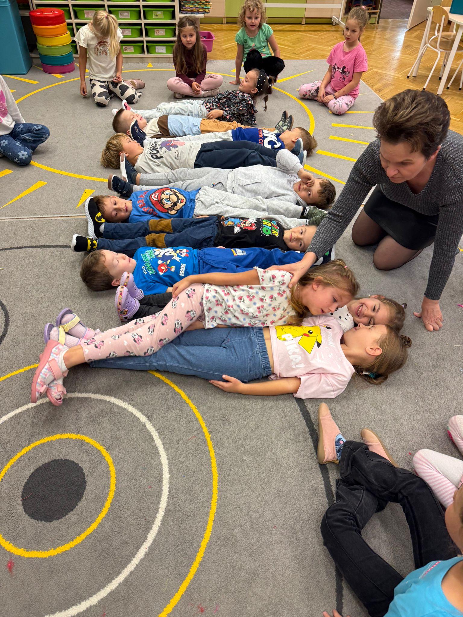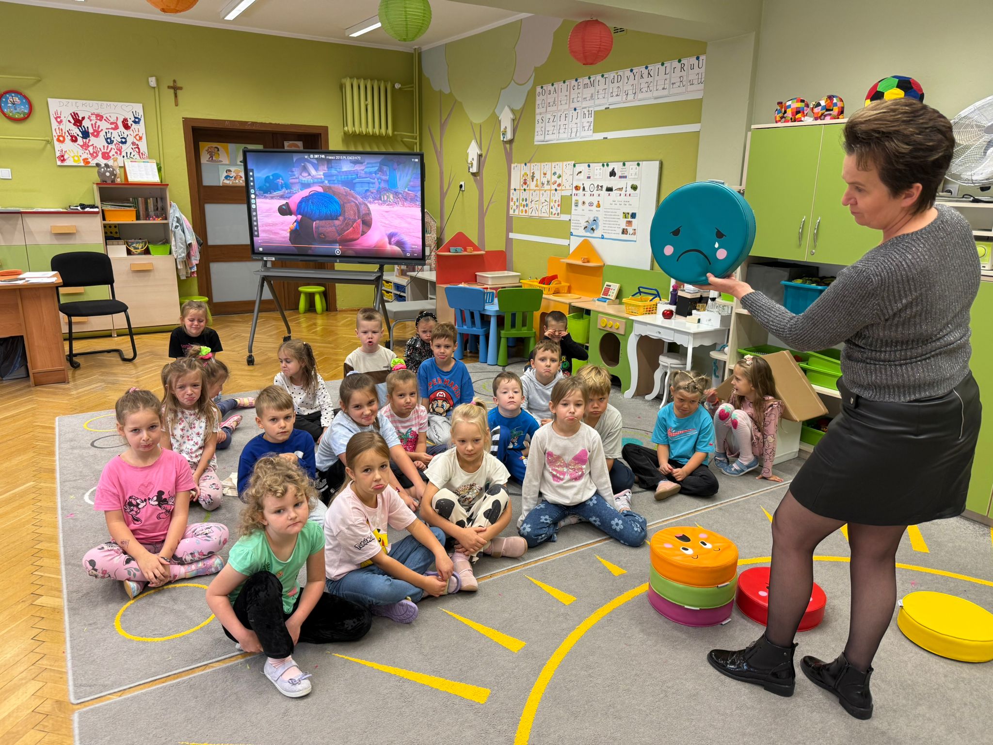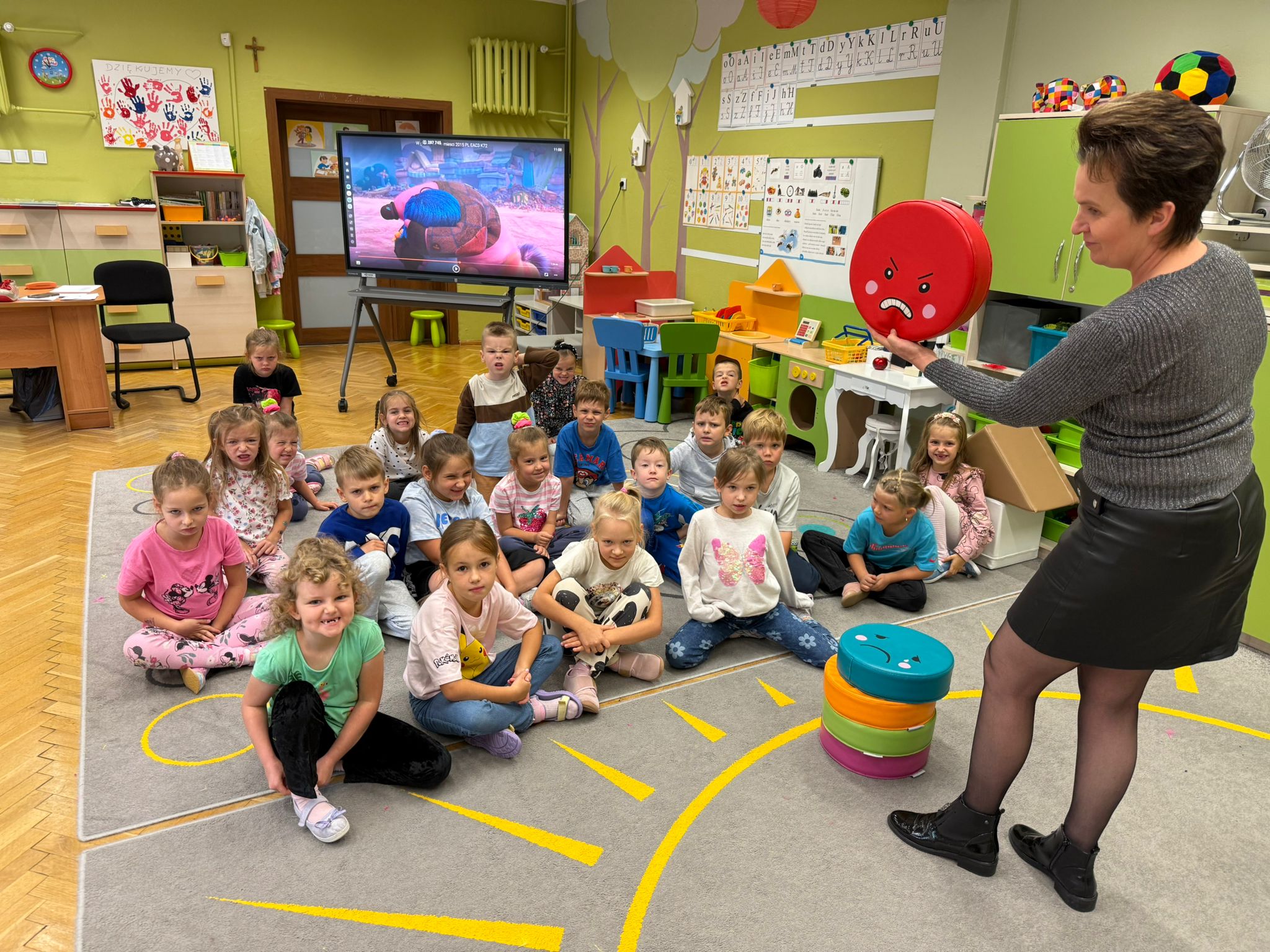 Relacja była słowem kluczem naszych zajęć. Celem spotkania było rozwijanie empatii wśród dzieci, umiejętności rozumienia i nazywania emocji oraz budowanie pozytywnych więzi w grupie. Na początku dzieci wysłuchały opowiadania pt. „Przygoda Małego Misia Empatka”, które pokazało, jak ważne jest dostrzeganie uczuć innych i reagowanie na nie wrażliwie. Następnie obejrzały film animowany – edukacyjny, który w przystępny sposób przybliżył temat emocji i ich roli w codziennym życiu. Kolejnym etapem były zabawy integracyjne. W ćwiczeniu „Kładka” dzieci uczyły się współpracy i zaufania, natomiast zabawa „Serce” pozwoliła im okazywać sobie nawzajem ciepło i troskę. Dużo radości przyniosła także zabawa w parach, podczas której dzieci podrzucały w rytm muzyki kolorowe piórka na zwiewnych chustach, ucząc się współdziałania i uważności na partnera. Nie zabrakło też ćwiczeń na rozpoznawanie i naśladowanie różnych emocji, takich jak radość, smutek, złość, zdziwienie, duma, zaskoczenie. Na zakończenie przedszkolaki wzięły udział w zabawie z zawiązanymi oczami, w której musiały zaufać kolegom i pozwolić się bezpiecznie poprowadzić pomiędzy przeszkodami. Dzieci aktywnie uczestniczyły w każdym etapie, z zaangażowaniem rozpoznawały emocje, uczyły się je nazywać i wyrażać, a także wspierały się nawzajem. Dzięki temu cała grupa mogła jeszcze lepiej zrozumieć, jak ważna jest empatia i jak buduje się dobre relacje.