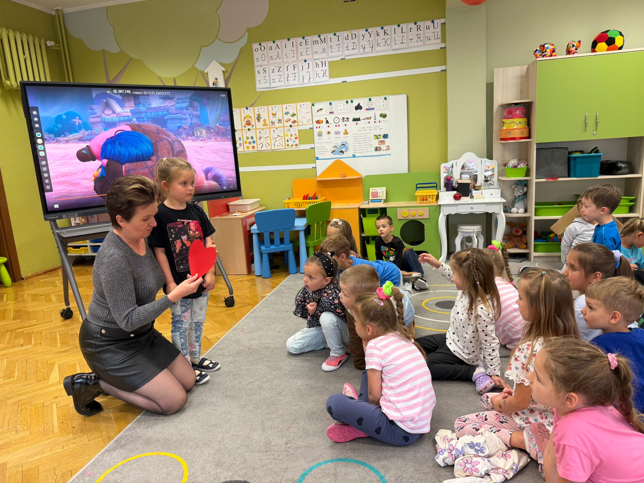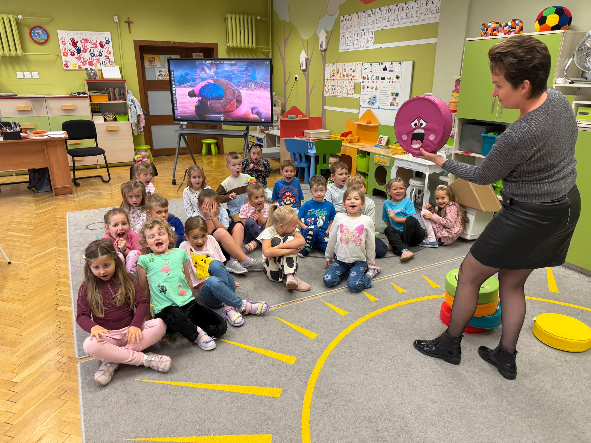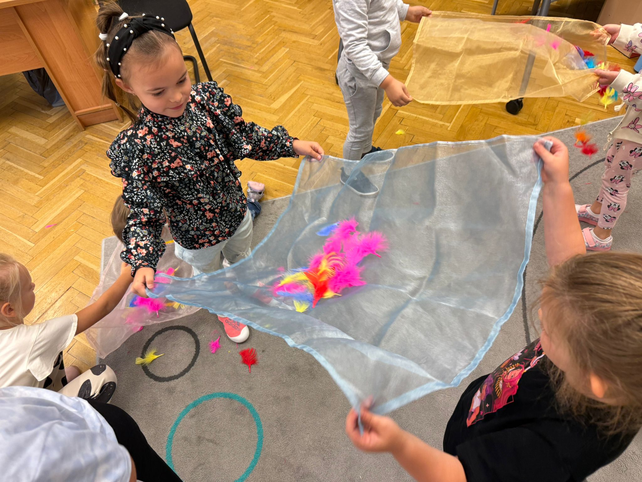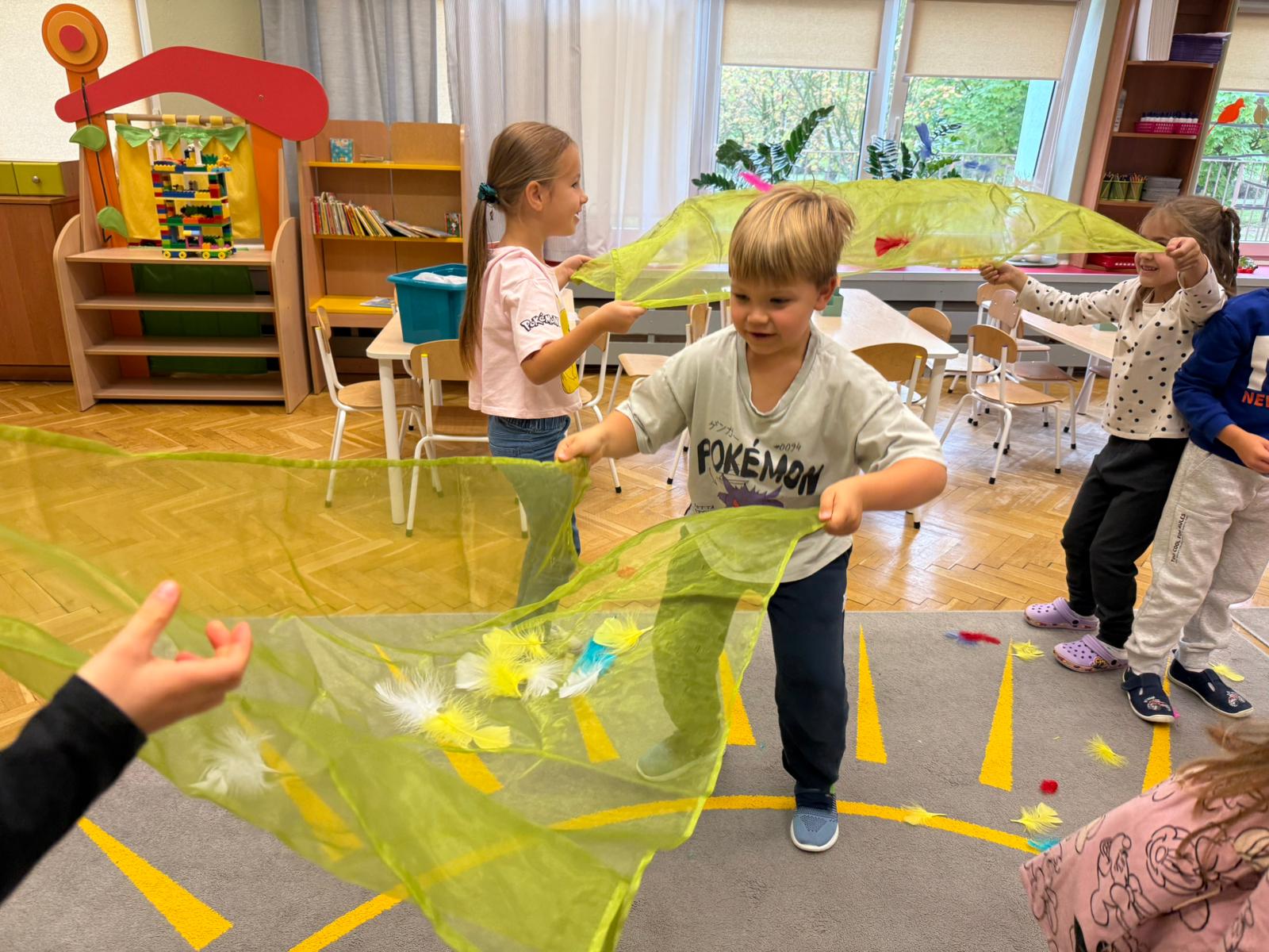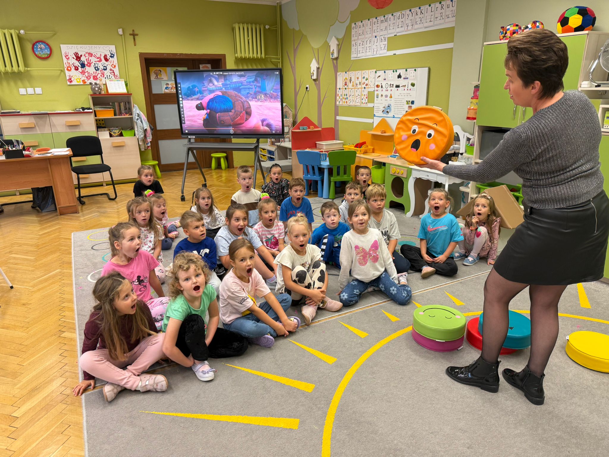 Relacja była słowem kluczem naszych zajęć. Celem spotkania było rozwijanie empatii wśród dzieci, umiejętności rozumienia i nazywania emocji oraz budowanie pozytywnych więzi w grupie. Na początku dzieci wysłuchały opowiadania pt. „Przygoda Małego Misia Empatka”, które pokazało, jak ważne jest dostrzeganie uczuć innych i reagowanie na nie wrażliwie. Następnie obejrzały film animowany – edukacyjny, który w przystępny sposób przybliżył temat emocji i ich roli w codziennym życiu. Kolejnym etapem były zabawy integracyjne. W ćwiczeniu „Kładka” dzieci uczyły się współpracy i zaufania, natomiast zabawa „Serce” pozwoliła im okazywać sobie nawzajem ciepło i troskę. Dużo radości przyniosła także zabawa w parach, podczas której dzieci podrzucały w rytm muzyki kolorowe piórka na zwiewnych chustach, ucząc się współdziałania i uważności na partnera. Nie zabrakło też ćwiczeń na rozpoznawanie i naśladowanie różnych emocji, takich jak radość, smutek, złość, zdziwienie, duma, zaskoczenie. Na zakończenie przedszkolaki wzięły udział w zabawie z zawiązanymi oczami, w której musiały zaufać kolegom i pozwolić się bezpiecznie poprowadzić pomiędzy przeszkodami. Dzieci aktywnie uczestniczyły w każdym etapie, z zaangażowaniem rozpoznawały emocje, uczyły się je nazywać i wyrażać, a także wspierały się nawzajem. Dzięki temu cała grupa mogła jeszcze lepiej zrozumieć, jak ważna jest empatia i jak buduje się dobre relacje.