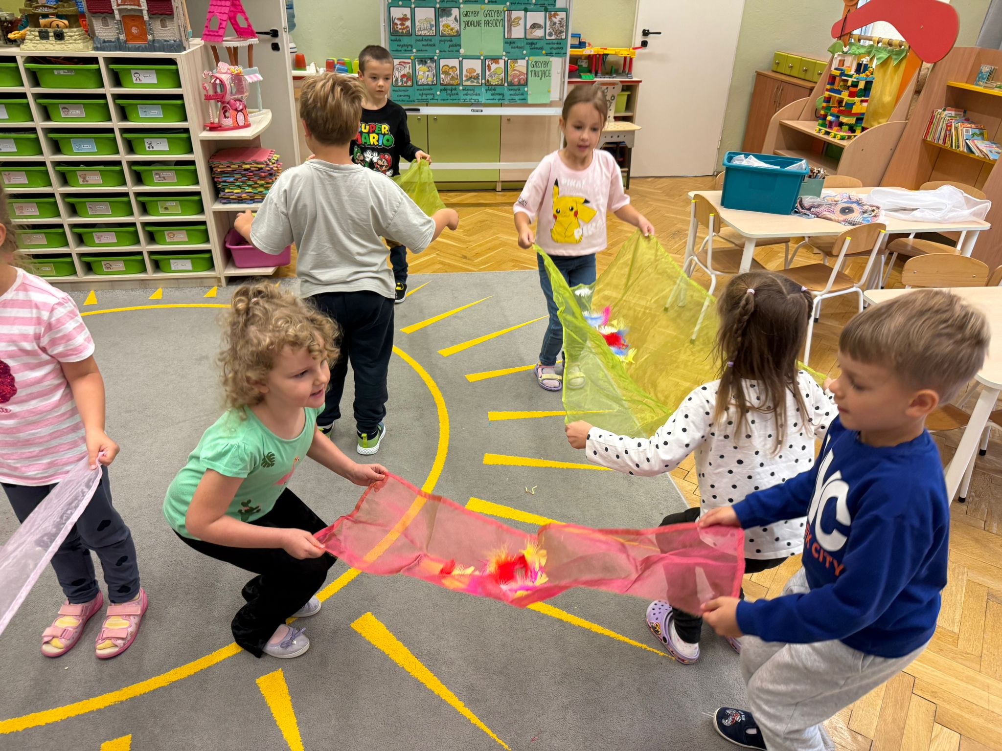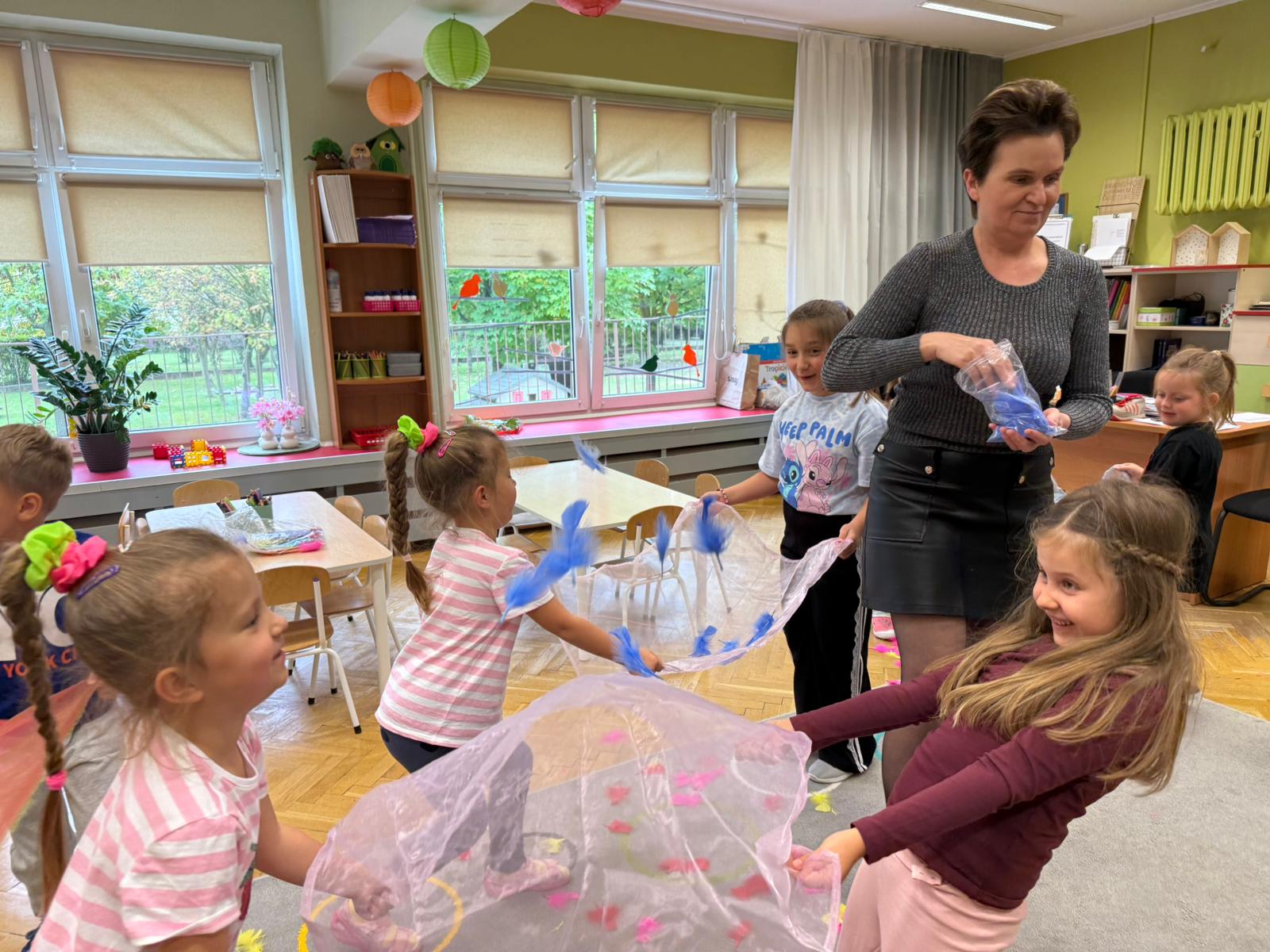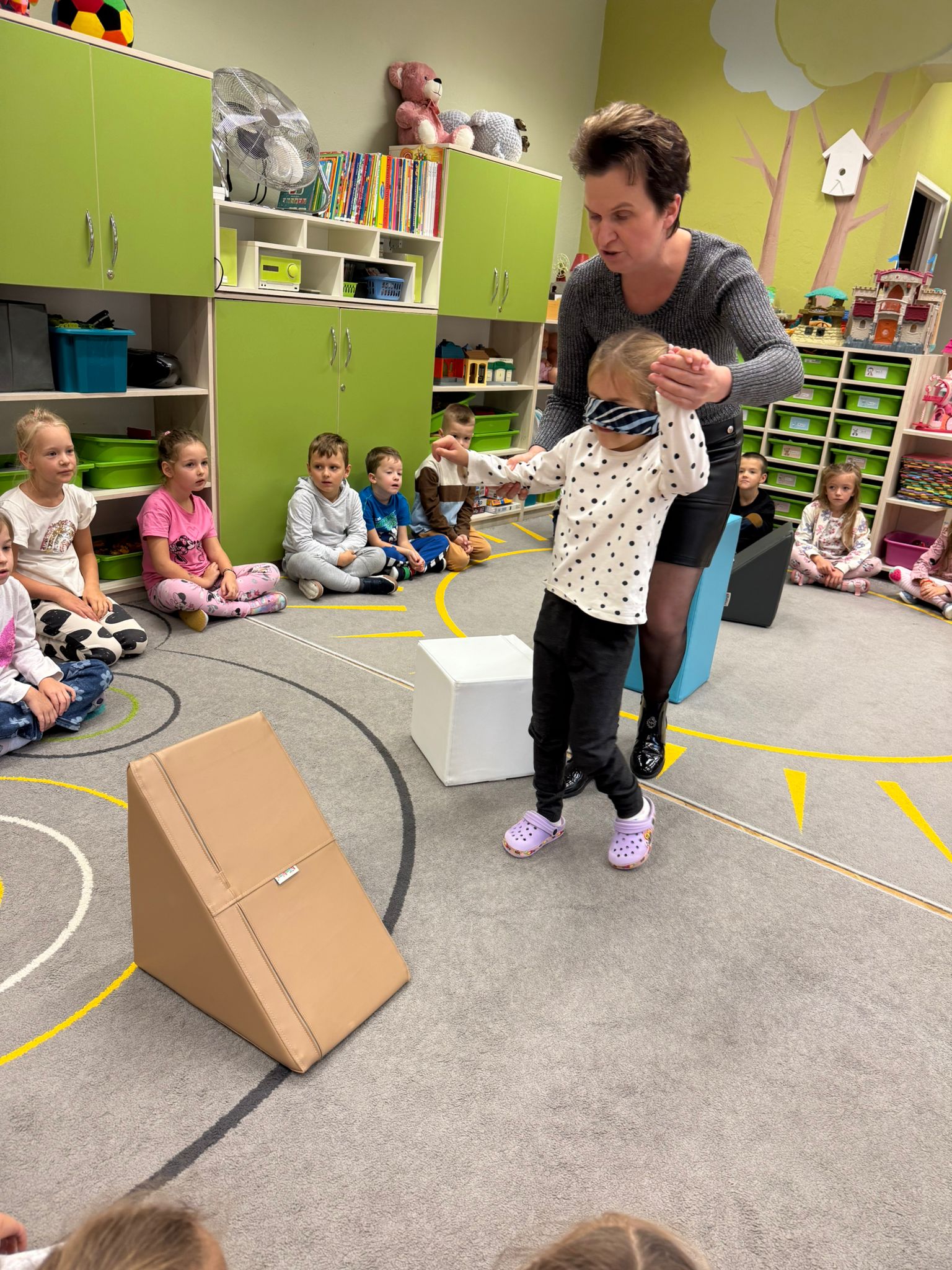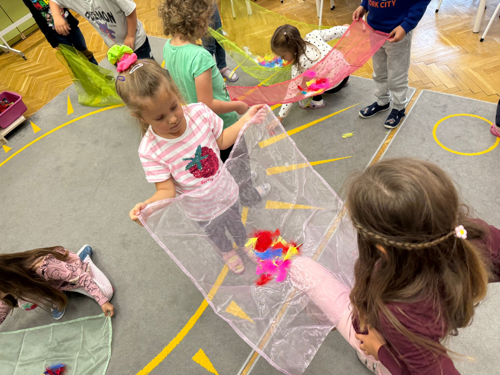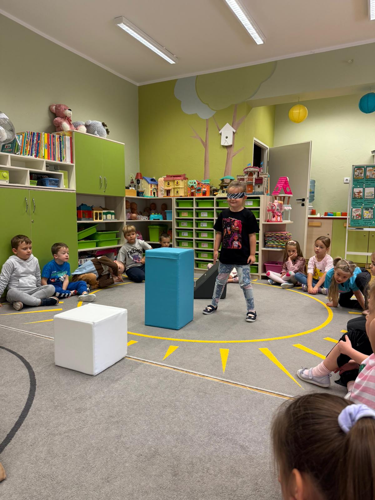 Relacja była słowem kluczem naszych zajęć. Celem spotkania było rozwijanie empatii wśród dzieci, umiejętności rozumienia i nazywania emocji oraz budowanie pozytywnych więzi w grupie. Na początku dzieci wysłuchały opowiadania pt. „Przygoda Małego Misia Empatka”, które pokazało, jak ważne jest dostrzeganie uczuć innych i reagowanie na nie wrażliwie. Następnie obejrzały film animowany – edukacyjny, który w przystępny sposób przybliżył temat emocji i ich roli w codziennym życiu. Kolejnym etapem były zabawy integracyjne. W ćwiczeniu „Kładka” dzieci uczyły się współpracy i zaufania, natomiast zabawa „Serce” pozwoliła im okazywać sobie nawzajem ciepło i troskę. Dużo radości przyniosła także zabawa w parach, podczas której dzieci podrzucały w rytm muzyki kolorowe piórka na zwiewnych chustach, ucząc się współdziałania i uważności na partnera. Nie zabrakło też ćwiczeń na rozpoznawanie i naśladowanie różnych emocji, takich jak radość, smutek, złość, zdziwienie, duma, zaskoczenie. Na zakończenie przedszkolaki wzięły udział w zabawie z zawiązanymi oczami, w której musiały zaufać kolegom i pozwolić się bezpiecznie poprowadzić pomiędzy przeszkodami. Dzieci aktywnie uczestniczyły w każdym etapie, z zaangażowaniem rozpoznawały emocje, uczyły się je nazywać i wyrażać, a także wspierały się nawzajem. Dzięki temu cała grupa mogła jeszcze lepiej zrozumieć, jak ważna jest empatia i jak buduje się dobre relacje.