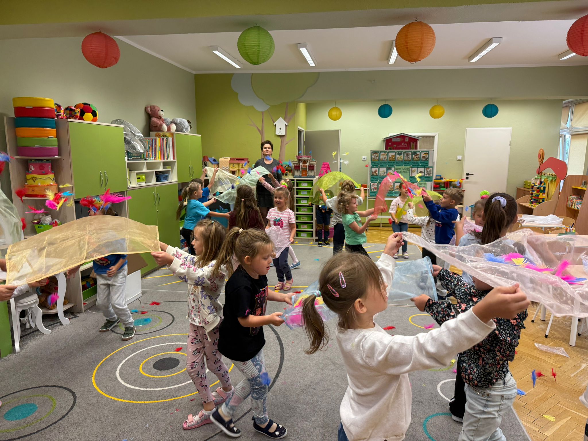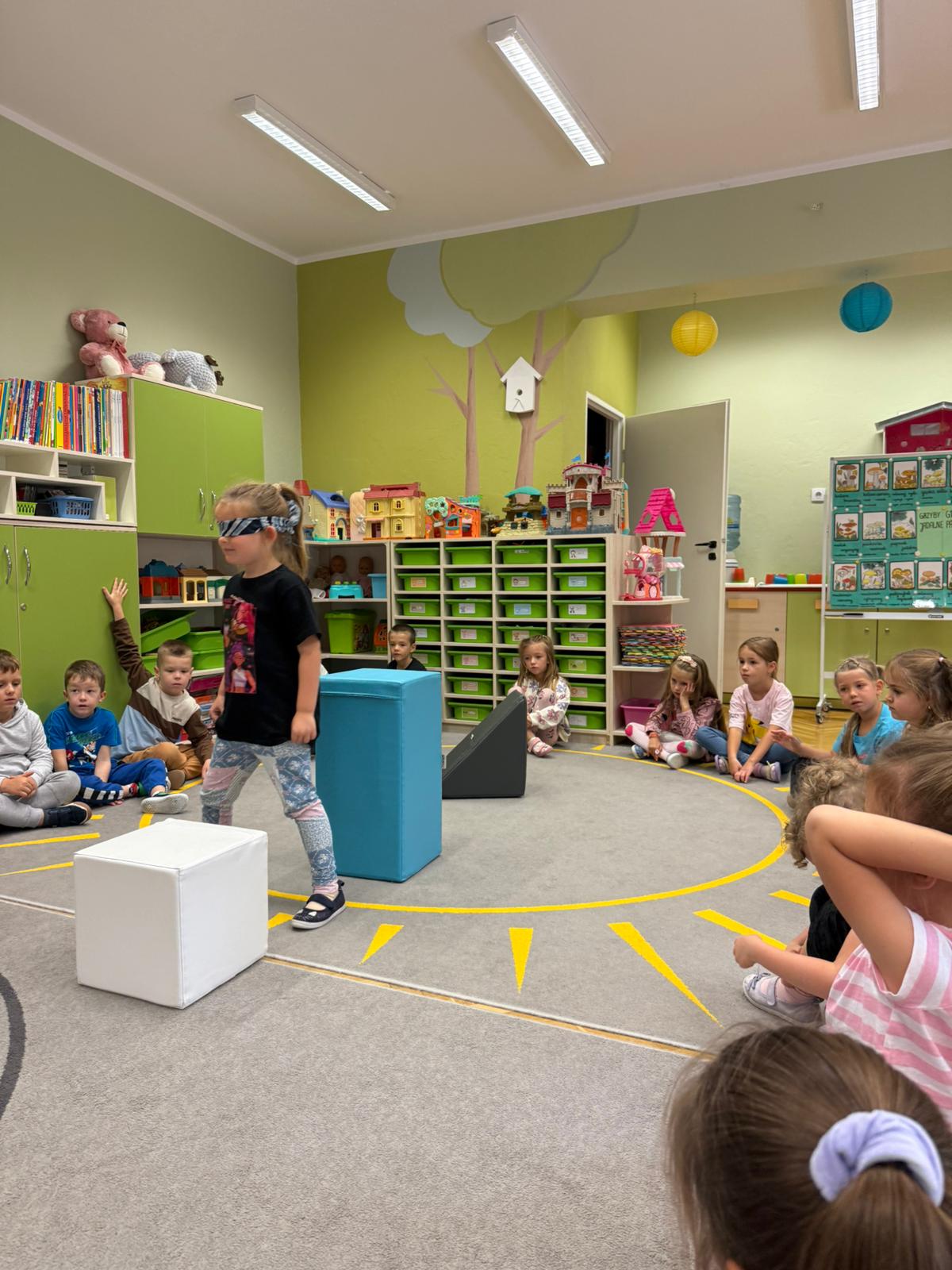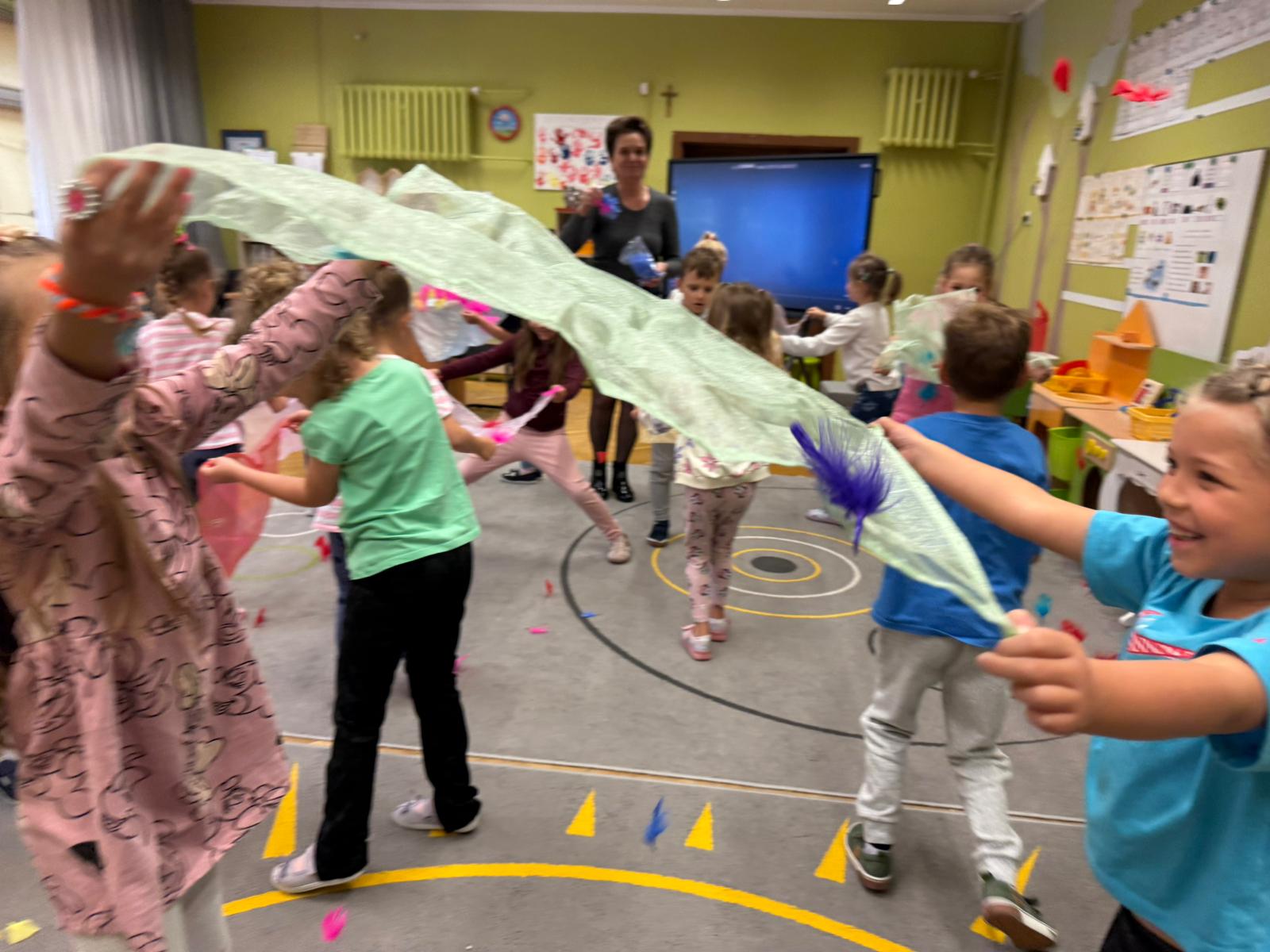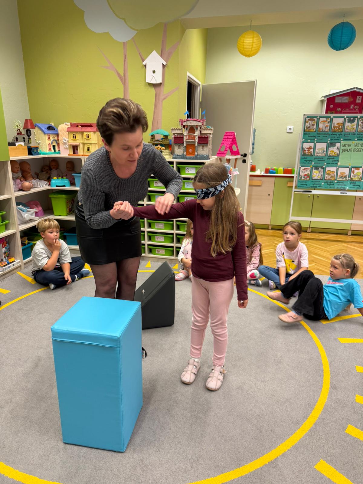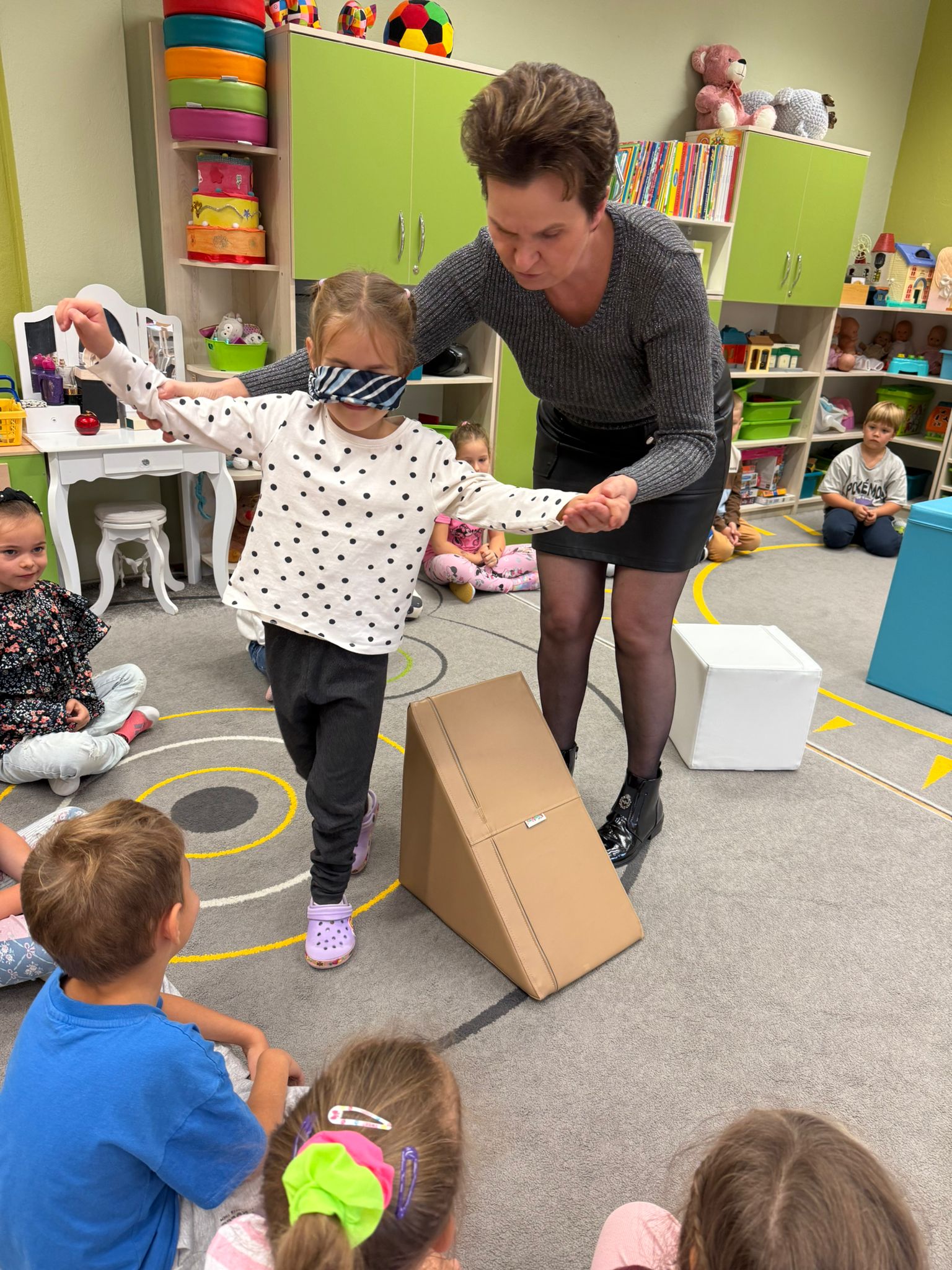 Relacja była słowem kluczem naszych zajęć. Celem spotkania było rozwijanie empatii wśród dzieci, umiejętności rozumienia i nazywania emocji oraz budowanie pozytywnych więzi w grupie. Na początku dzieci wysłuchały opowiadania pt. „Przygoda Małego Misia Empatka”, które pokazało, jak ważne jest dostrzeganie uczuć innych i reagowanie na nie wrażliwie. Następnie obejrzały film animowany – edukacyjny, który w przystępny sposób przybliżył temat emocji i ich roli w codziennym życiu. Kolejnym etapem były zabawy integracyjne. W ćwiczeniu „Kładka” dzieci uczyły się współpracy i zaufania, natomiast zabawa „Serce” pozwoliła im okazywać sobie nawzajem ciepło i troskę. Dużo radości przyniosła także zabawa w parach, podczas której dzieci podrzucały w rytm muzyki kolorowe piórka na zwiewnych chustach, ucząc się współdziałania i uważności na partnera. Nie zabrakło też ćwiczeń na rozpoznawanie i naśladowanie różnych emocji, takich jak radość, smutek, złość, zdziwienie, duma, zaskoczenie. Na zakończenie przedszkolaki wzięły udział w zabawie z zawiązanymi oczami, w której musiały zaufać kolegom i pozwolić się bezpiecznie poprowadzić pomiędzy przeszkodami. Dzieci aktywnie uczestniczyły w każdym etapie, z zaangażowaniem rozpoznawały emocje, uczyły się je nazywać i wyrażać, a także wspierały się nawzajem. Dzięki temu cała grupa mogła jeszcze lepiej zrozumieć, jak ważna jest empatia i jak buduje się dobre relacje.