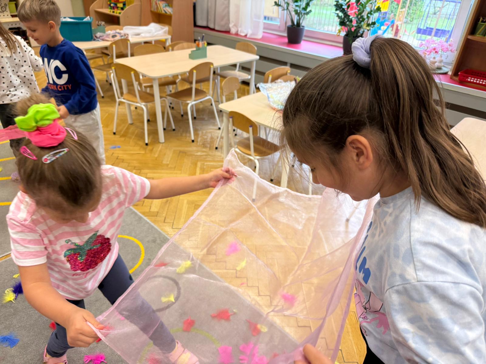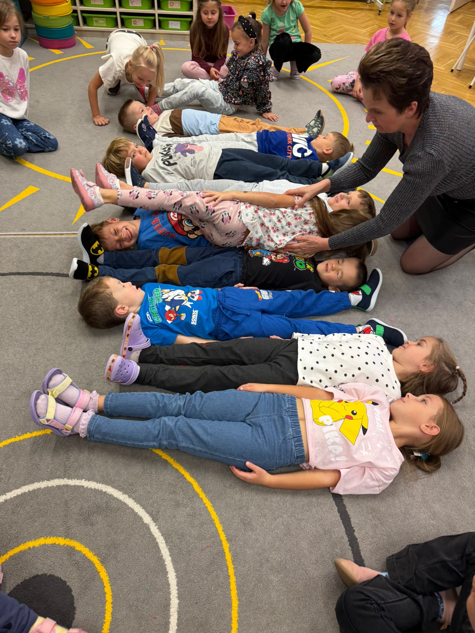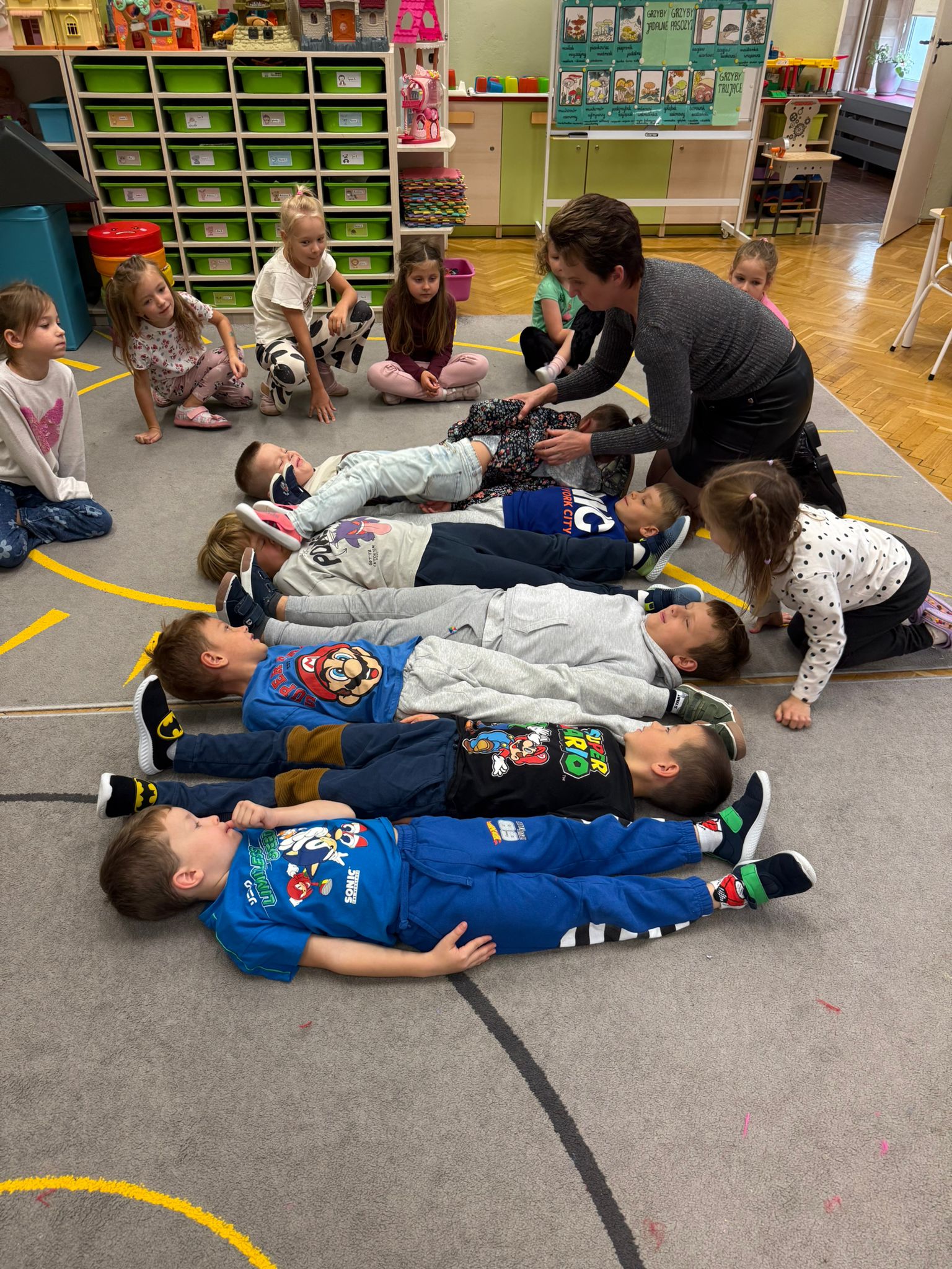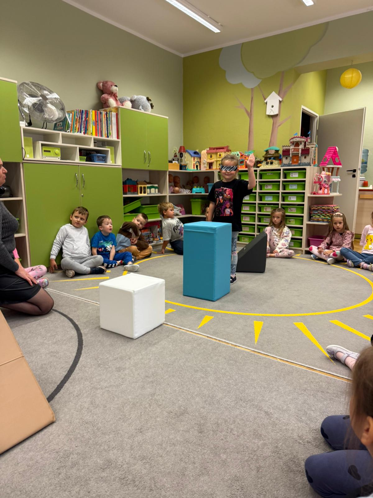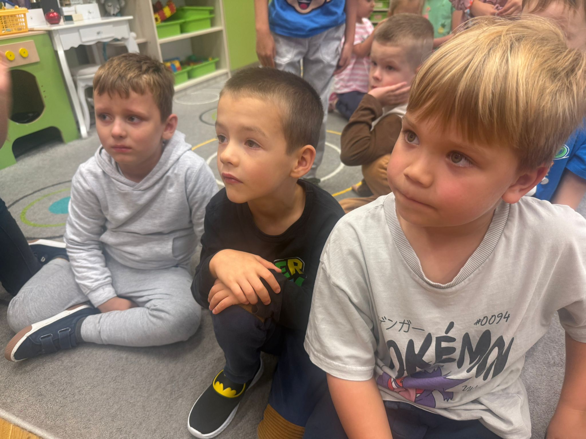 Relacja była słowem kluczem naszych zajęć. Celem spotkania było rozwijanie empatii wśród dzieci, umiejętności rozumienia i nazywania emocji oraz budowanie pozytywnych więzi w grupie. Na początku dzieci wysłuchały opowiadania pt. „Przygoda Małego Misia Empatka”, które pokazało, jak ważne jest dostrzeganie uczuć innych i reagowanie na nie wrażliwie. Następnie obejrzały film animowany – edukacyjny, który w przystępny sposób przybliżył temat emocji i ich roli w codziennym życiu. Kolejnym etapem były zabawy integracyjne. W ćwiczeniu „Kładka” dzieci uczyły się współpracy i zaufania, natomiast zabawa „Serce” pozwoliła im okazywać sobie nawzajem ciepło i troskę. Dużo radości przyniosła także zabawa w parach, podczas której dzieci podrzucały w rytm muzyki kolorowe piórka na zwiewnych chustach, ucząc się współdziałania i uważności na partnera. Nie zabrakło też ćwiczeń na rozpoznawanie i naśladowanie różnych emocji, takich jak radość, smutek, złość, zdziwienie, duma, zaskoczenie. Na zakończenie przedszkolaki wzięły udział w zabawie z zawiązanymi oczami, w której musiały zaufać kolegom i pozwolić się bezpiecznie poprowadzić pomiędzy przeszkodami. Dzieci aktywnie uczestniczyły w każdym etapie, z zaangażowaniem rozpoznawały emocje, uczyły się je nazywać i wyrażać, a także wspierały się nawzajem. Dzięki temu cała grupa mogła jeszcze lepiej zrozumieć, jak ważna jest empatia i jak buduje się dobre relacje.