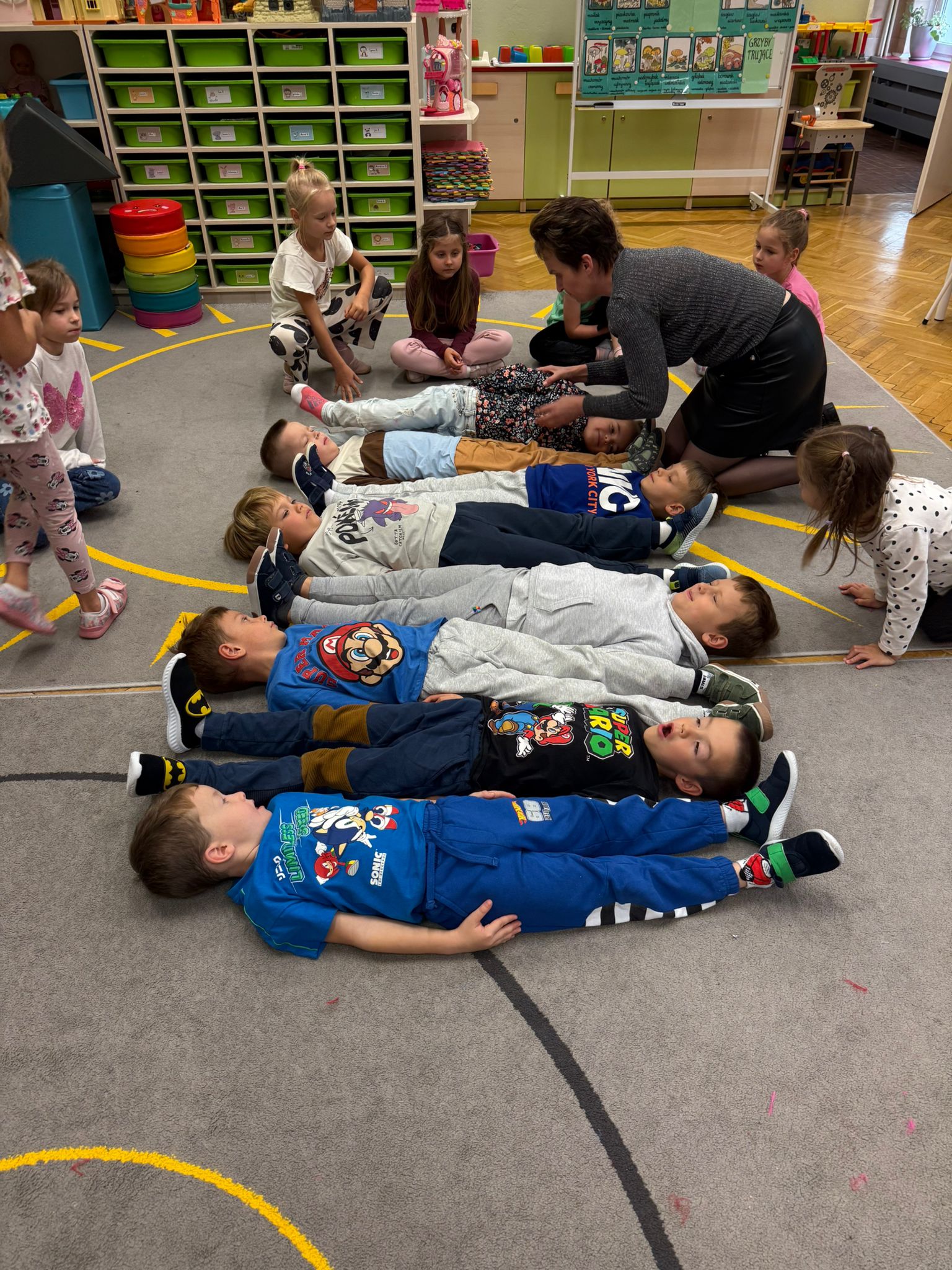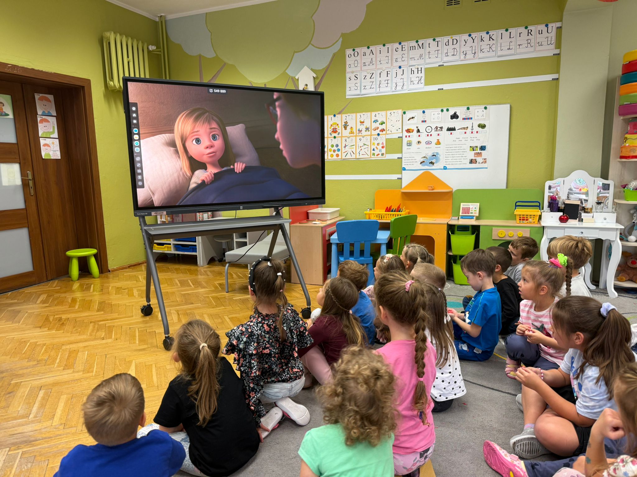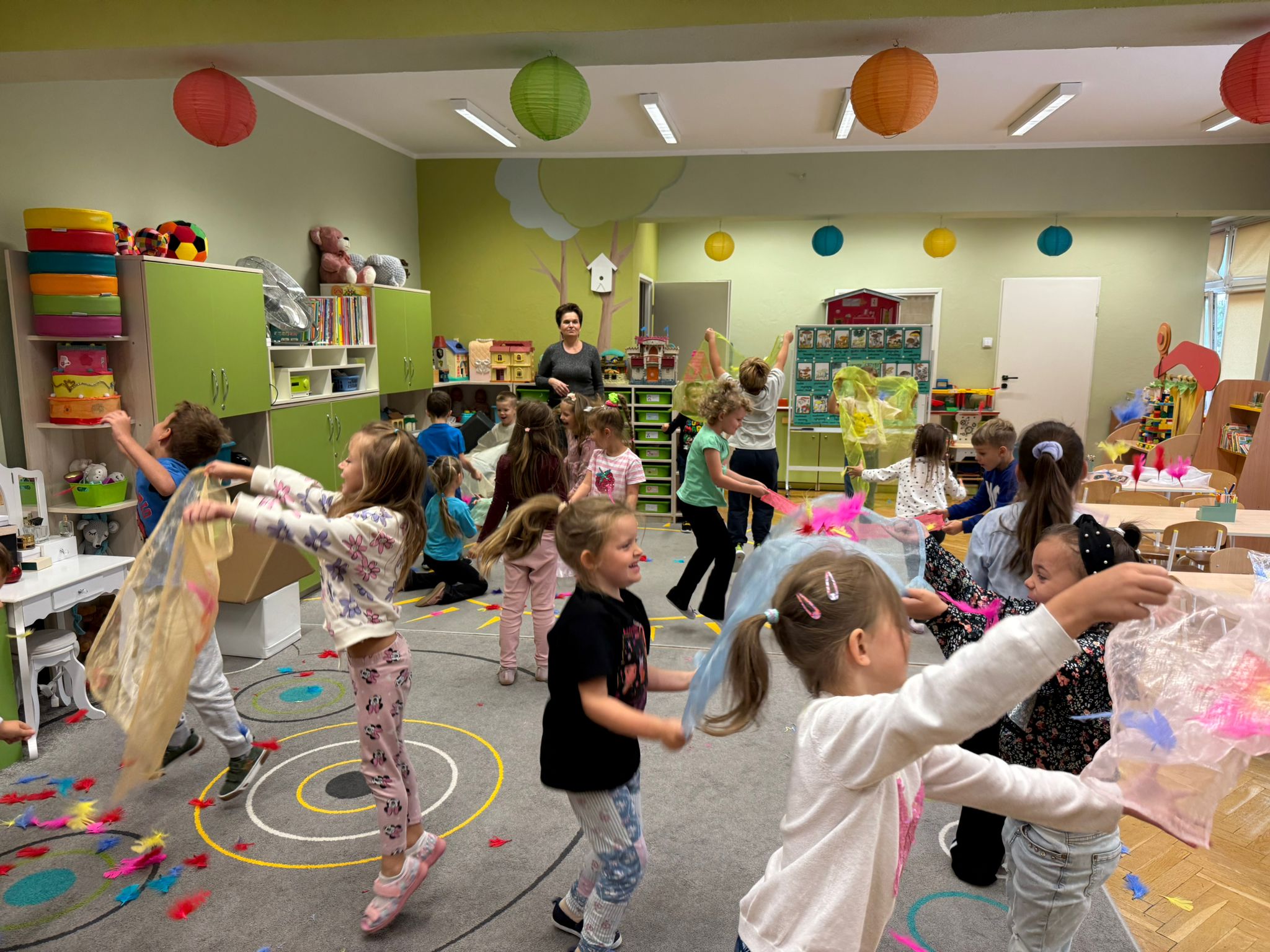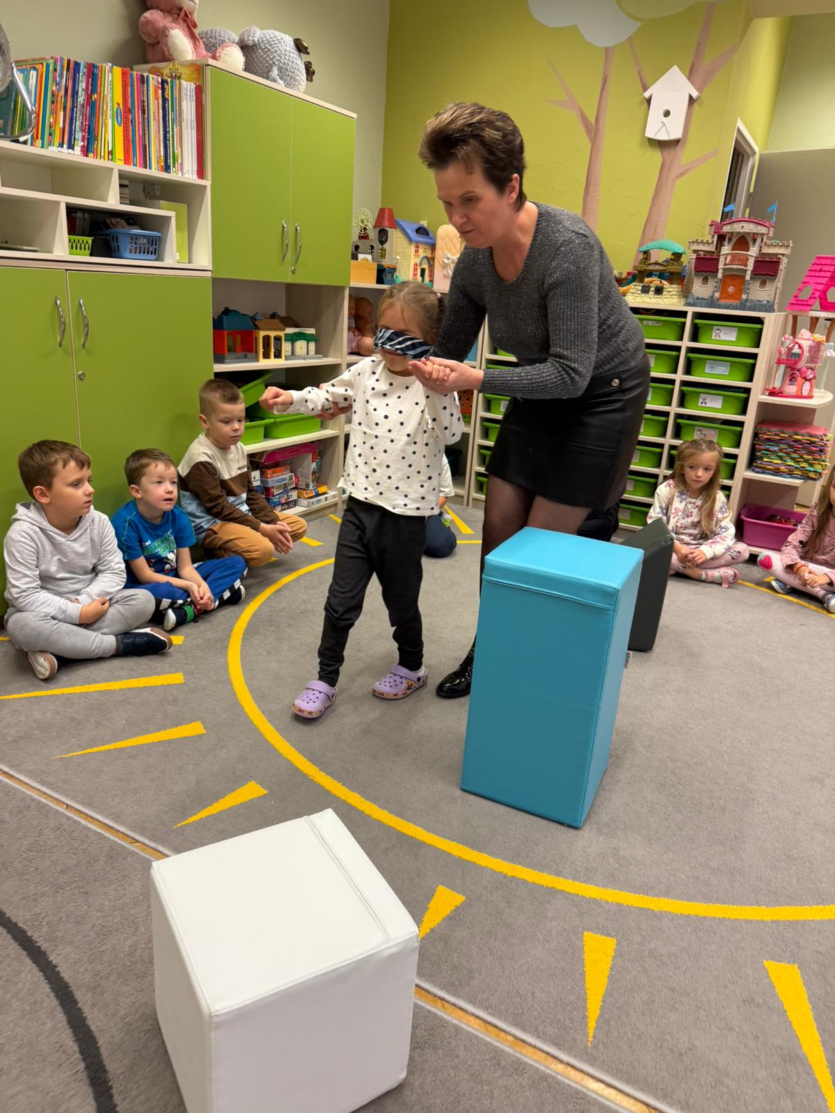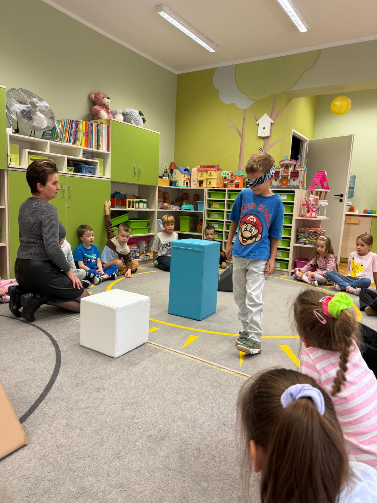 Relacja była słowem kluczem naszych zajęć. Celem spotkania było rozwijanie empatii wśród dzieci, umiejętności rozumienia i nazywania emocji oraz budowanie pozytywnych więzi w grupie. Na początku dzieci wysłuchały opowiadania pt. „Przygoda Małego Misia Empatka”, które pokazało, jak ważne jest dostrzeganie uczuć innych i reagowanie na nie wrażliwie. Następnie obejrzały film animowany – edukacyjny, który w przystępny sposób przybliżył temat emocji i ich roli w codziennym życiu. Kolejnym etapem były zabawy integracyjne. W ćwiczeniu „Kładka” dzieci uczyły się współpracy i zaufania, natomiast zabawa „Serce” pozwoliła im okazywać sobie nawzajem ciepło i troskę. Dużo radości przyniosła także zabawa w parach, podczas której dzieci podrzucały w rytm muzyki kolorowe piórka na zwiewnych chustach, ucząc się współdziałania i uważności na partnera. Nie zabrakło też ćwiczeń na rozpoznawanie i naśladowanie różnych emocji, takich jak radość, smutek, złość, zdziwienie, duma, zaskoczenie. Na zakończenie przedszkolaki wzięły udział w zabawie z zawiązanymi oczami, w której musiały zaufać kolegom i pozwolić się bezpiecznie poprowadzić pomiędzy przeszkodami. Dzieci aktywnie uczestniczyły w każdym etapie, z zaangażowaniem rozpoznawały emocje, uczyły się je nazywać i wyrażać, a także wspierały się nawzajem. Dzięki temu cała grupa mogła jeszcze lepiej zrozumieć, jak ważna jest empatia i jak buduje się dobre relacje.