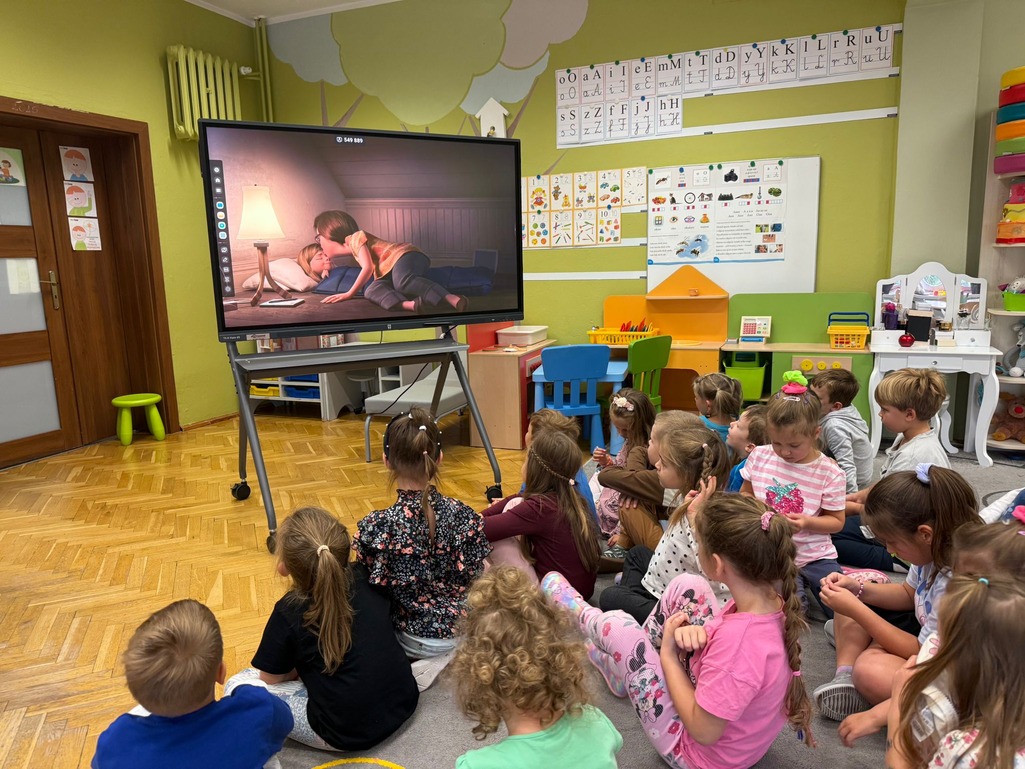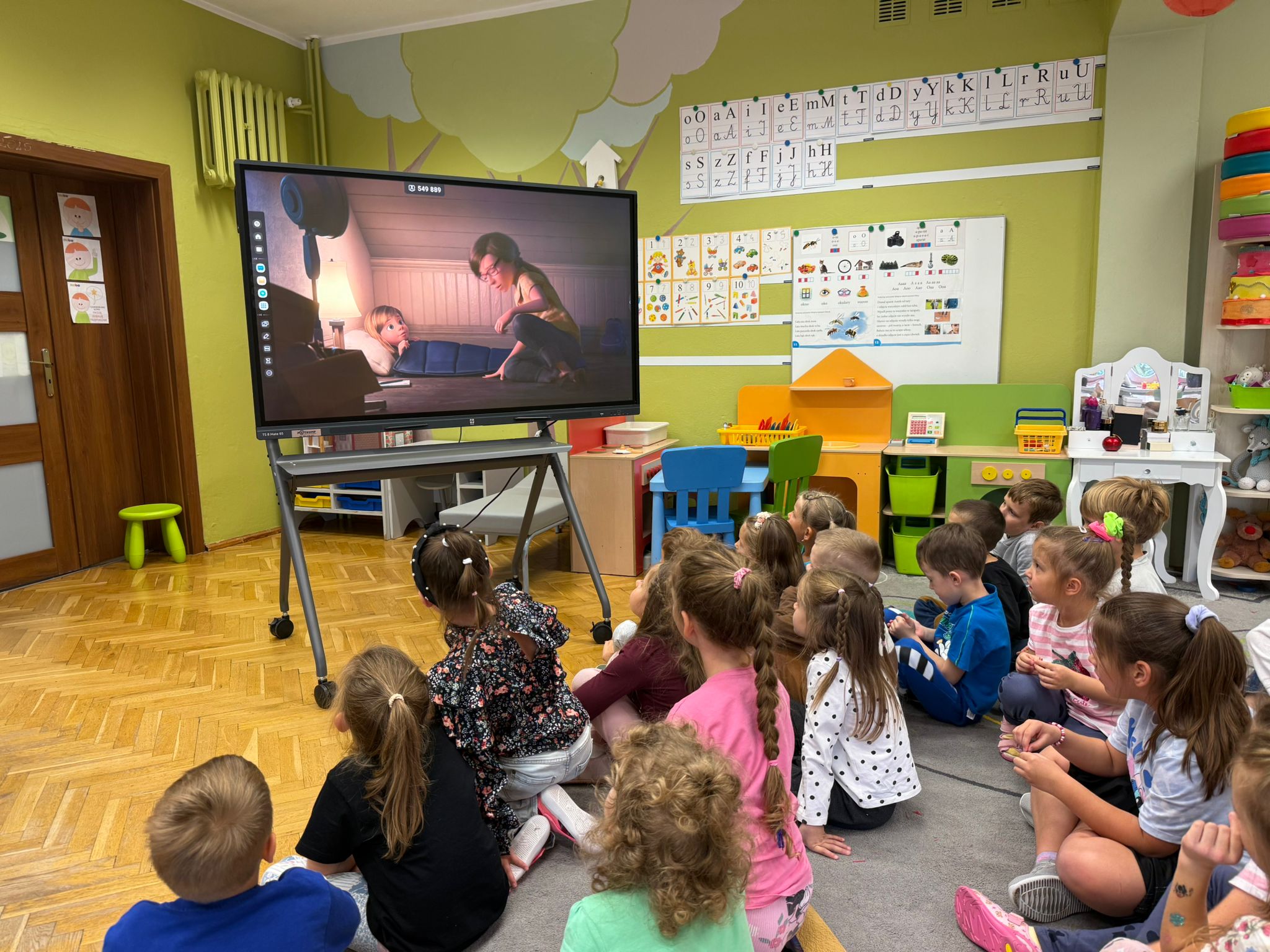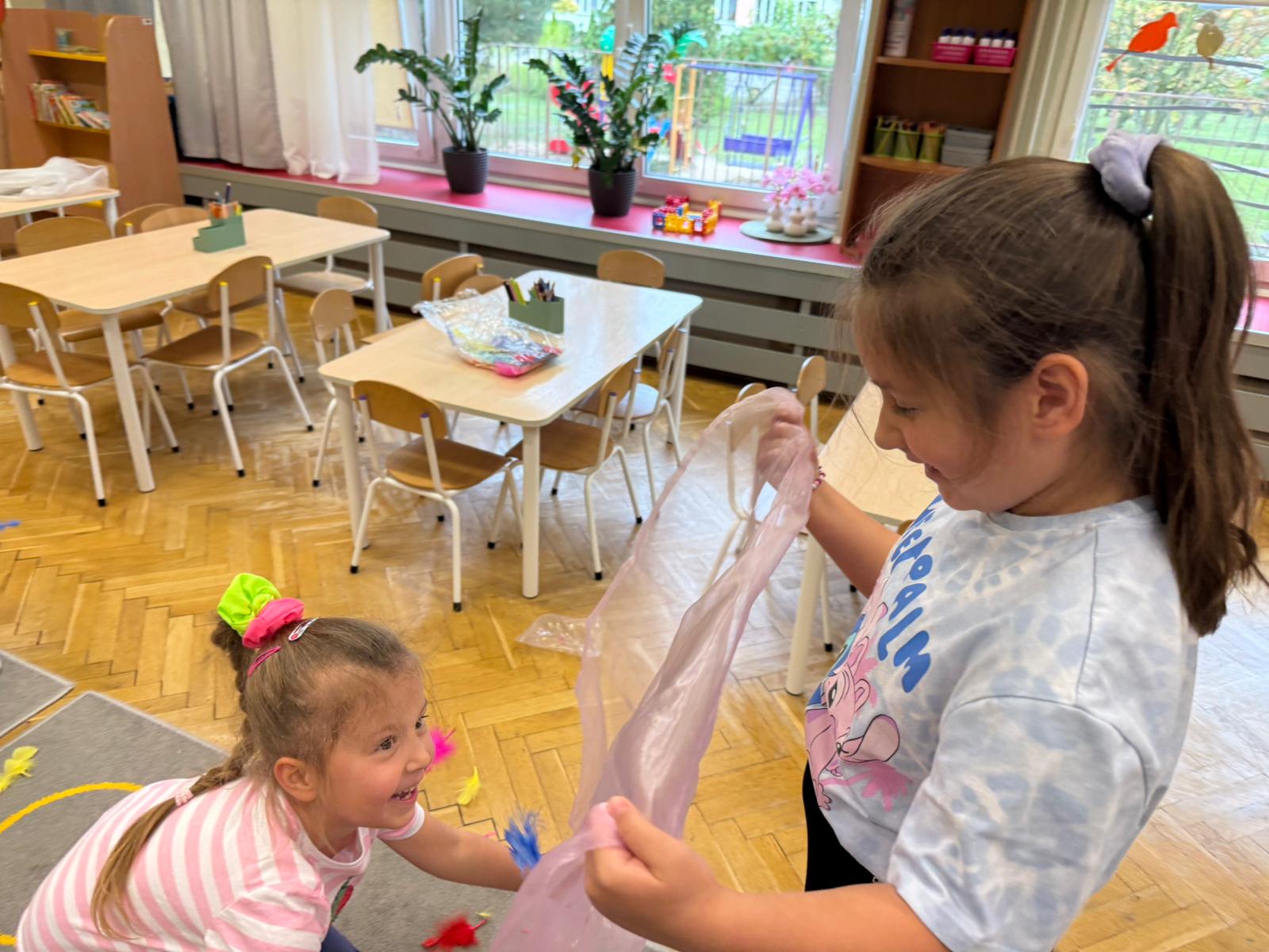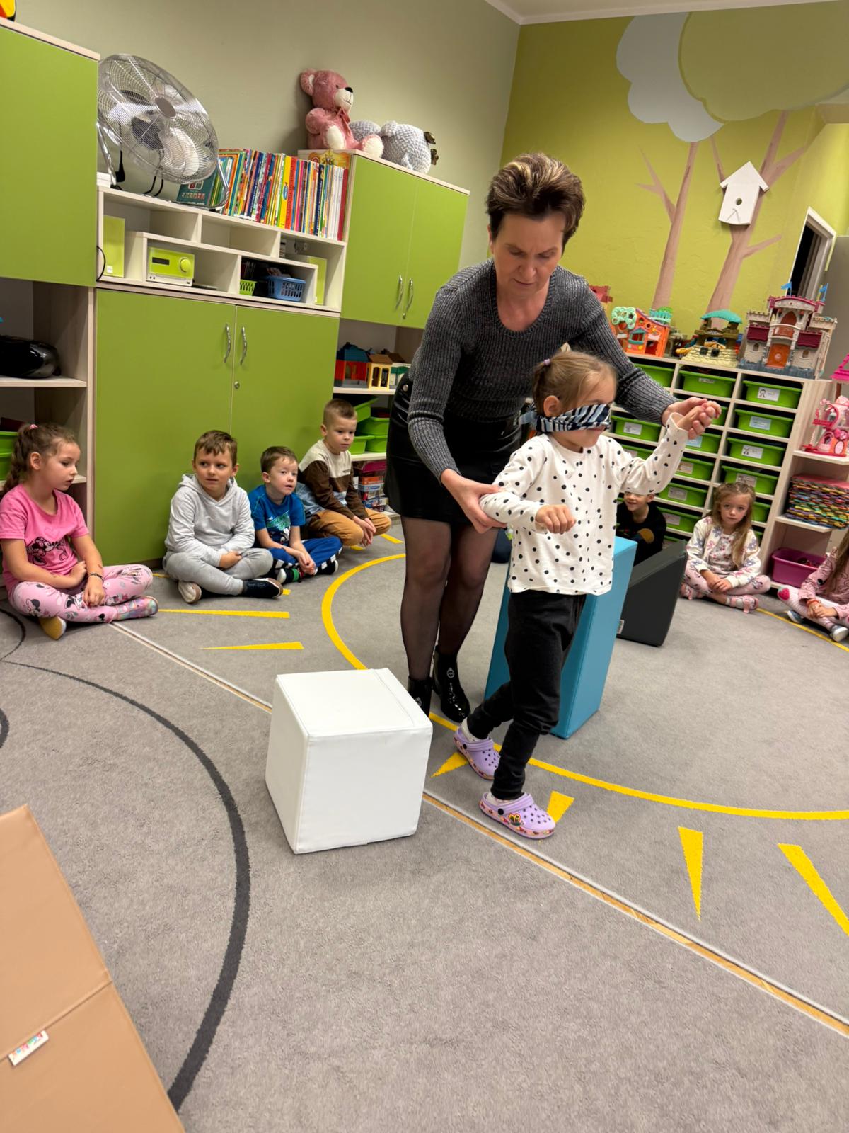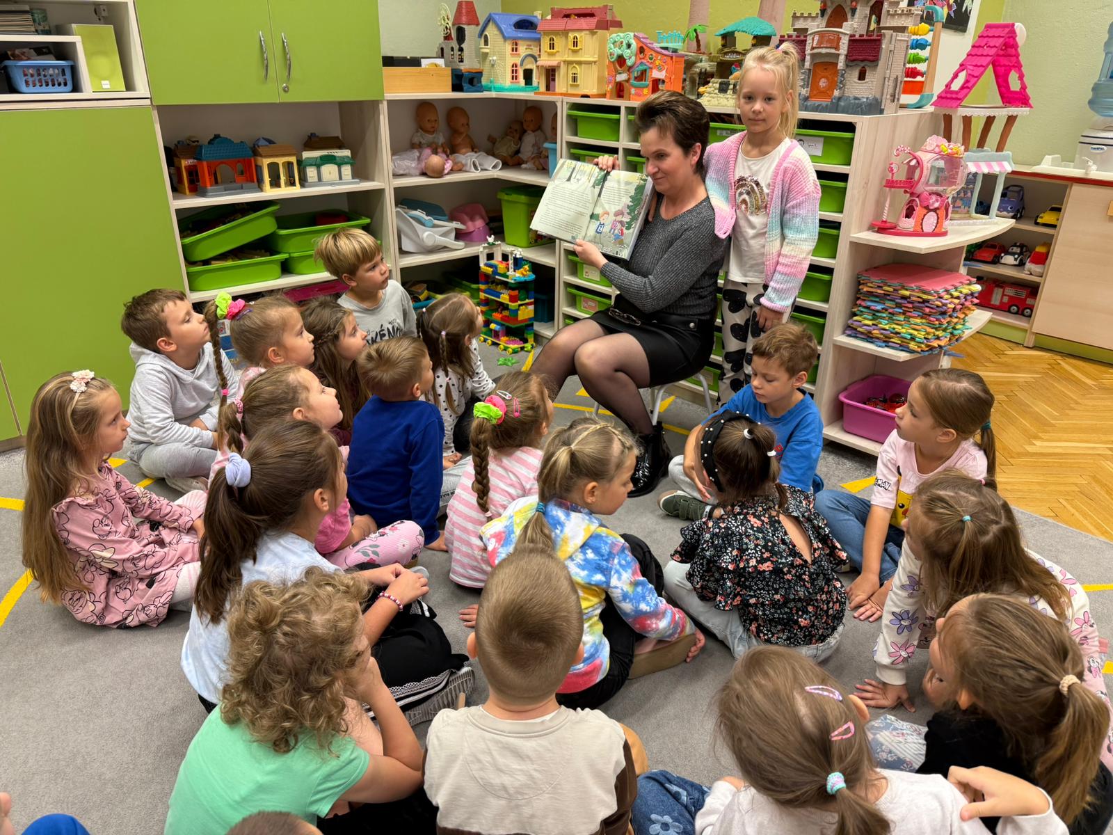 Relacja była słowem kluczem naszych zajęć. Celem spotkania było rozwijanie empatii wśród dzieci, umiejętności rozumienia i nazywania emocji oraz budowanie pozytywnych więzi w grupie. Na początku dzieci wysłuchały opowiadania pt. „Przygoda Małego Misia Empatka”, które pokazało, jak ważne jest dostrzeganie uczuć innych i reagowanie na nie wrażliwie. Następnie obejrzały film animowany – edukacyjny, który w przystępny sposób przybliżył temat emocji i ich roli w codziennym życiu. Kolejnym etapem były zabawy integracyjne. W ćwiczeniu „Kładka” dzieci uczyły się współpracy i zaufania, natomiast zabawa „Serce” pozwoliła im okazywać sobie nawzajem ciepło i troskę. Dużo radości przyniosła także zabawa w parach, podczas której dzieci podrzucały w rytm muzyki kolorowe piórka na zwiewnych chustach, ucząc się współdziałania i uważności na partnera. Nie zabrakło też ćwiczeń na rozpoznawanie i naśladowanie różnych emocji, takich jak radość, smutek, złość, zdziwienie, duma, zaskoczenie. Na zakończenie przedszkolaki wzięły udział w zabawie z zawiązanymi oczami, w której musiały zaufać kolegom i pozwolić się bezpiecznie poprowadzić pomiędzy przeszkodami. Dzieci aktywnie uczestniczyły w każdym etapie, z zaangażowaniem rozpoznawały emocje, uczyły się je nazywać i wyrażać, a także wspierały się nawzajem. Dzięki temu cała grupa mogła jeszcze lepiej zrozumieć, jak ważna jest empatia i jak buduje się dobre relacje.