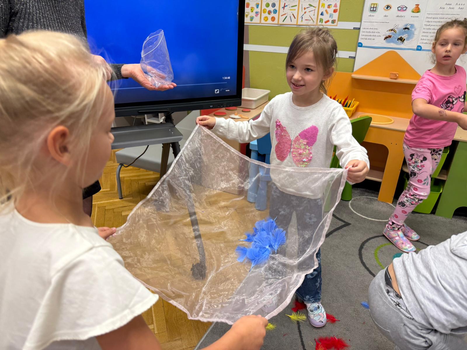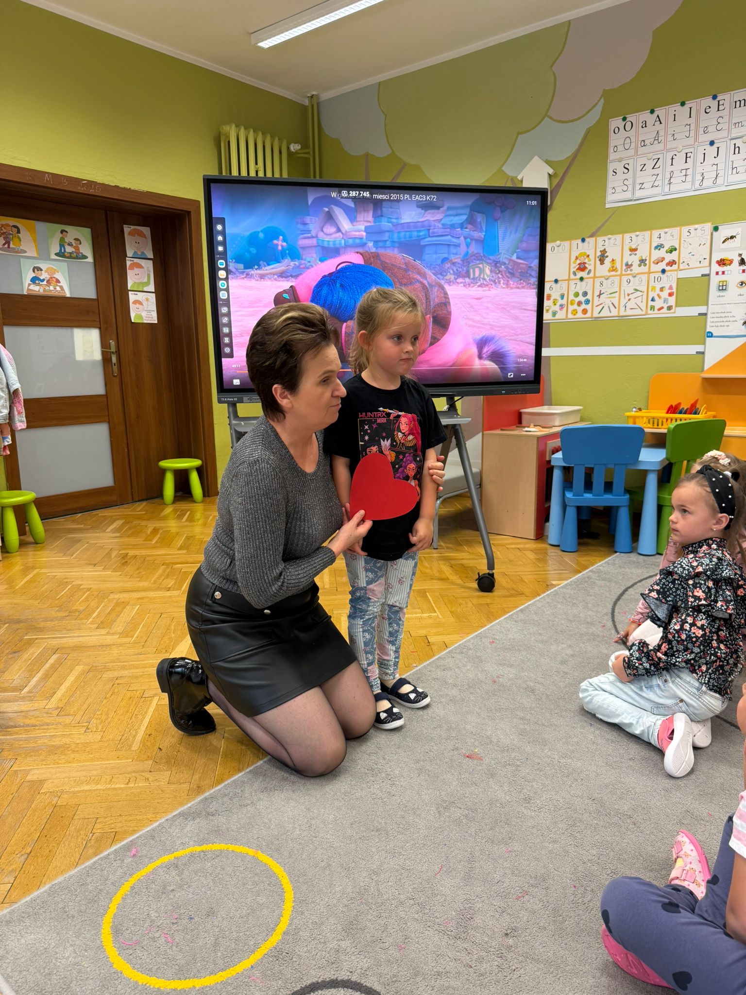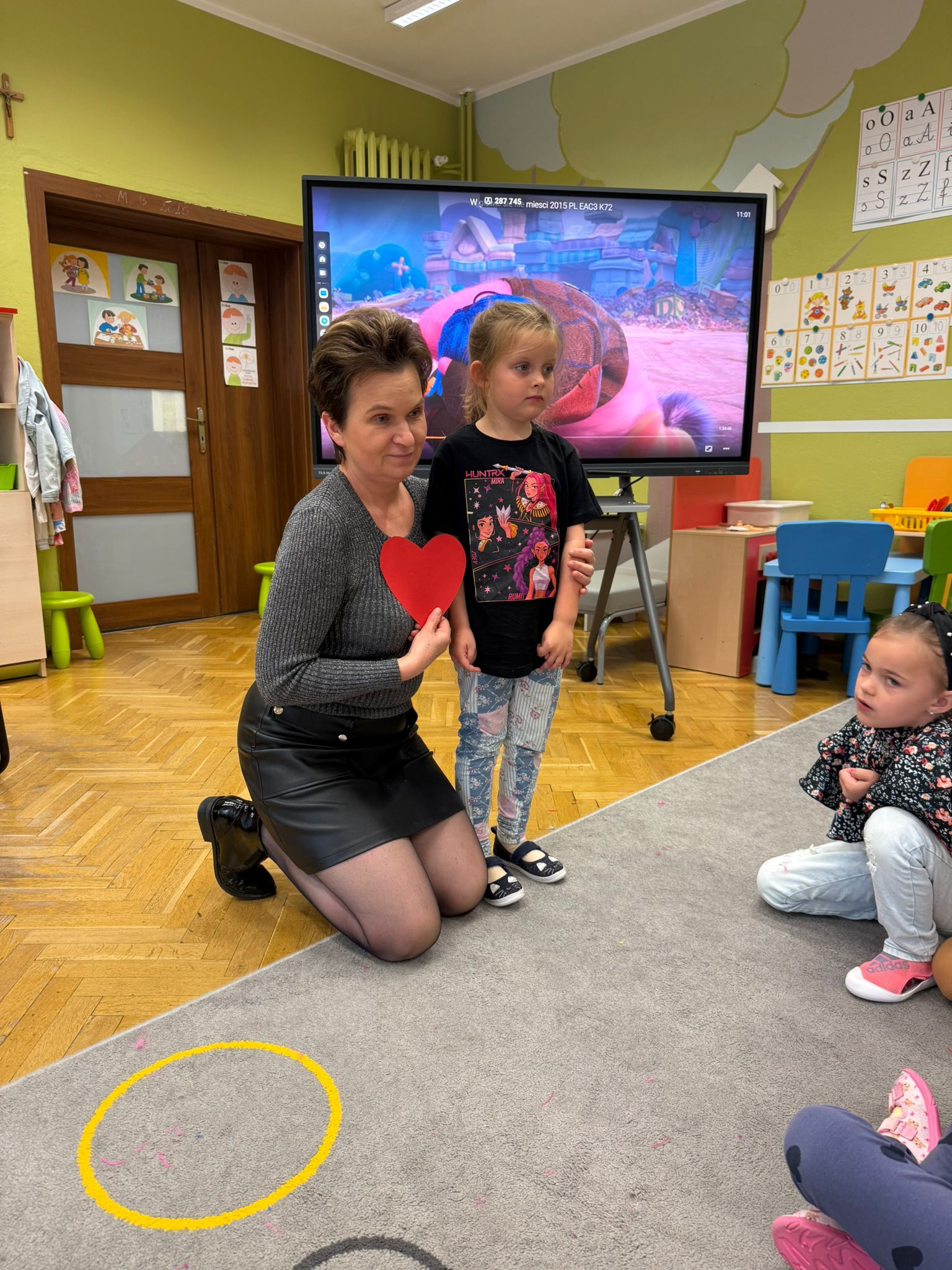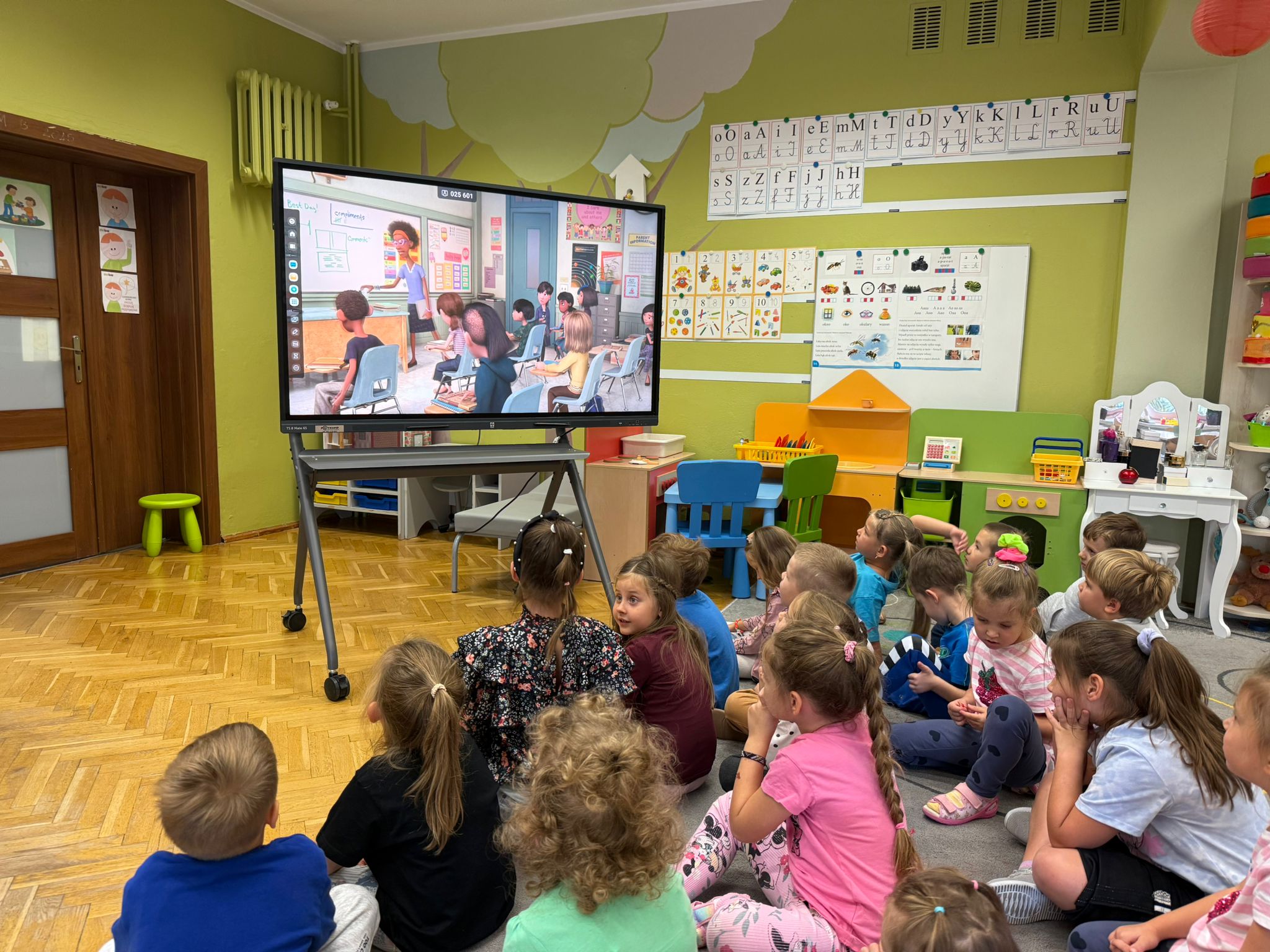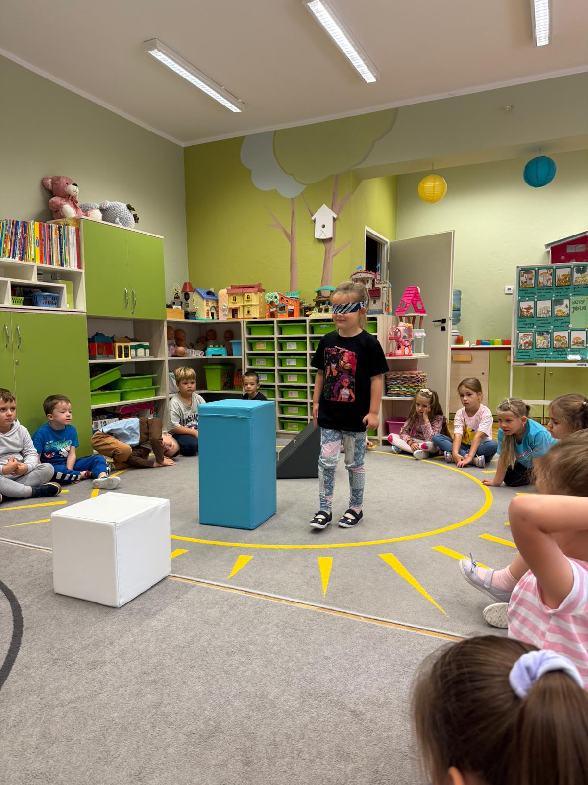 Relacja była słowem kluczem naszych zajęć. Celem spotkania było rozwijanie empatii wśród dzieci, umiejętności rozumienia i nazywania emocji oraz budowanie pozytywnych więzi w grupie. Na początku dzieci wysłuchały opowiadania pt. „Przygoda Małego Misia Empatka”, które pokazało, jak ważne jest dostrzeganie uczuć innych i reagowanie na nie wrażliwie. Następnie obejrzały film animowany – edukacyjny, który w przystępny sposób przybliżył temat emocji i ich roli w codziennym życiu. Kolejnym etapem były zabawy integracyjne. W ćwiczeniu „Kładka” dzieci uczyły się współpracy i zaufania, natomiast zabawa „Serce” pozwoliła im okazywać sobie nawzajem ciepło i troskę. Dużo radości przyniosła także zabawa w parach, podczas której dzieci podrzucały w rytm muzyki kolorowe piórka na zwiewnych chustach, ucząc się współdziałania i uważności na partnera. Nie zabrakło też ćwiczeń na rozpoznawanie i naśladowanie różnych emocji, takich jak radość, smutek, złość, zdziwienie, duma, zaskoczenie. Na zakończenie przedszkolaki wzięły udział w zabawie z zawiązanymi oczami, w której musiały zaufać kolegom i pozwolić się bezpiecznie poprowadzić pomiędzy przeszkodami. Dzieci aktywnie uczestniczyły w każdym etapie, z zaangażowaniem rozpoznawały emocje, uczyły się je nazywać i wyrażać, a także wspierały się nawzajem. Dzięki temu cała grupa mogła jeszcze lepiej zrozumieć, jak ważna jest empatia i jak buduje się dobre relacje.