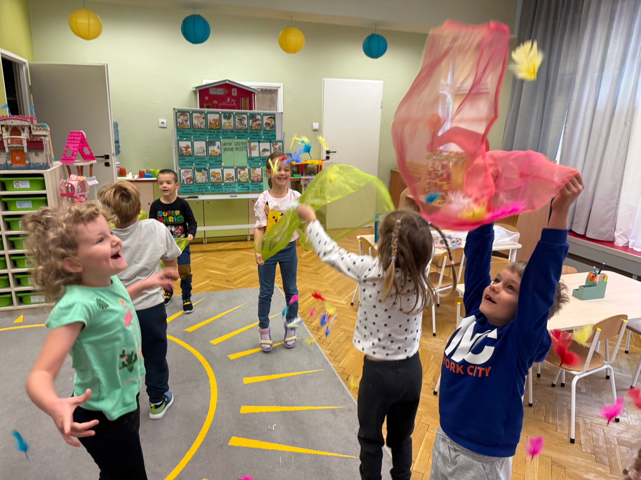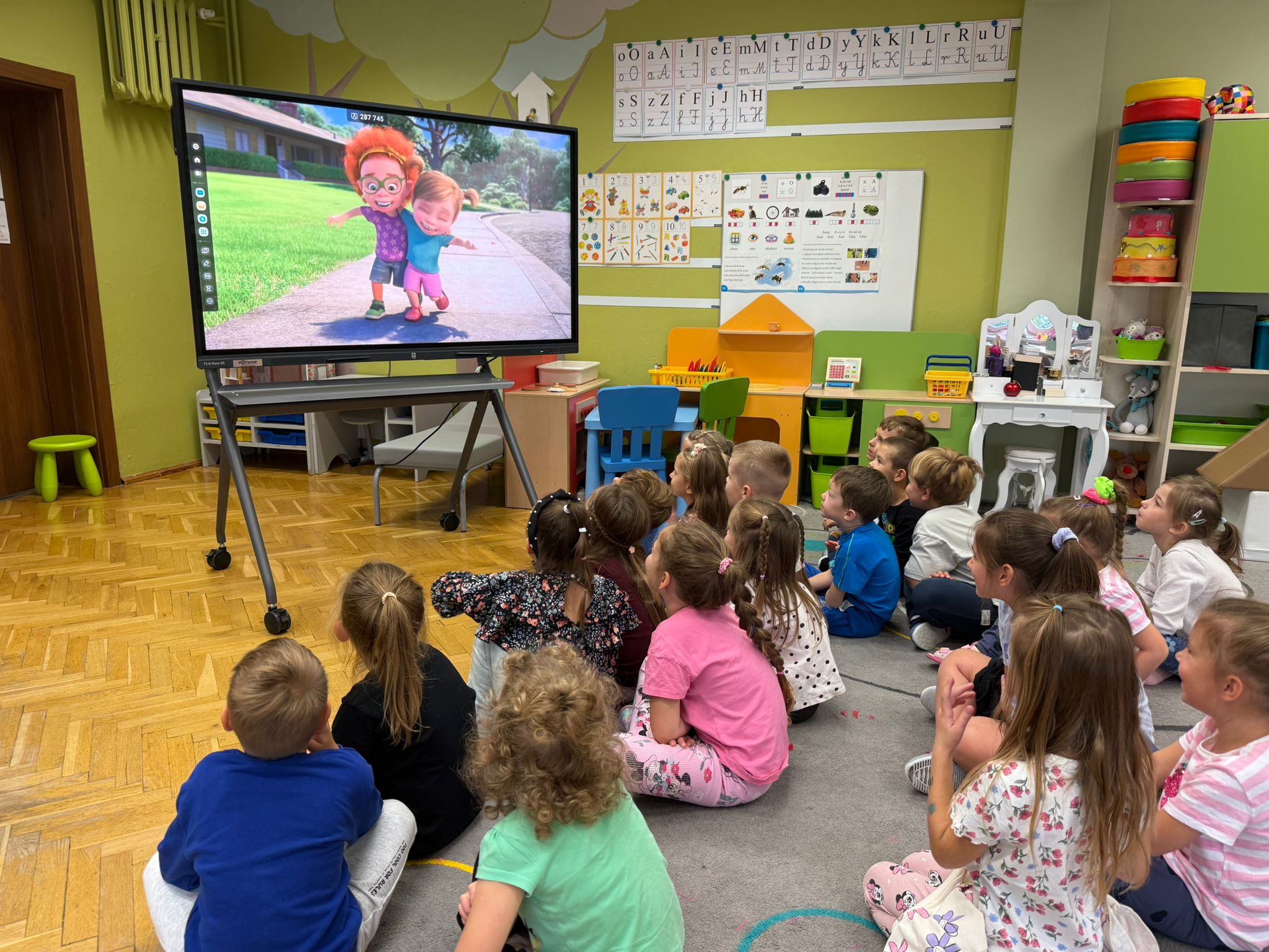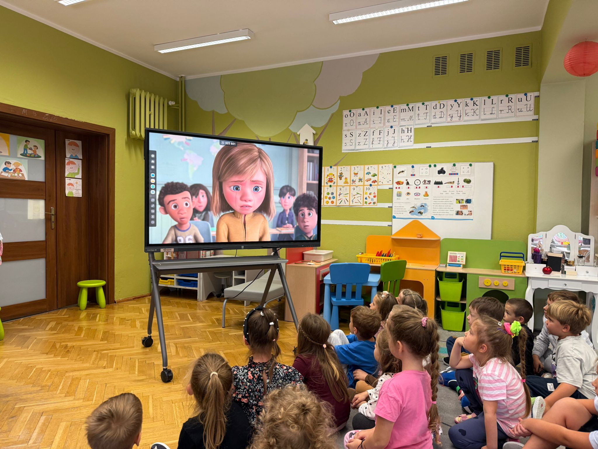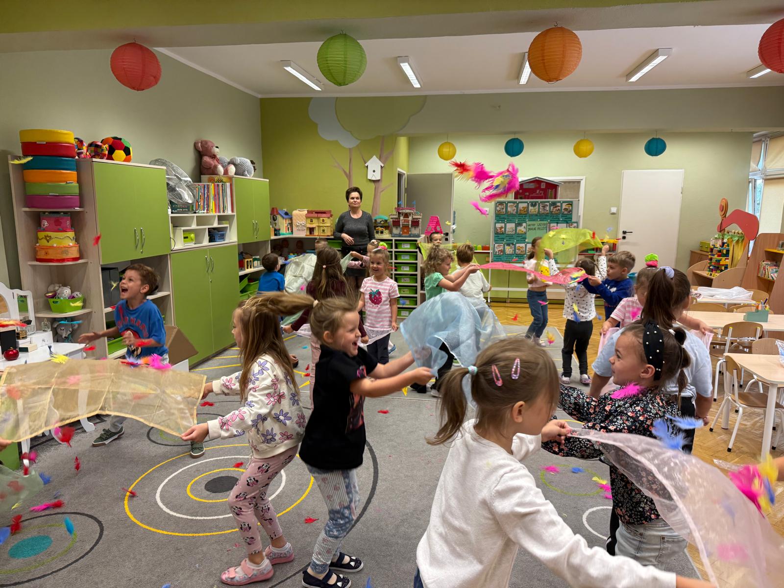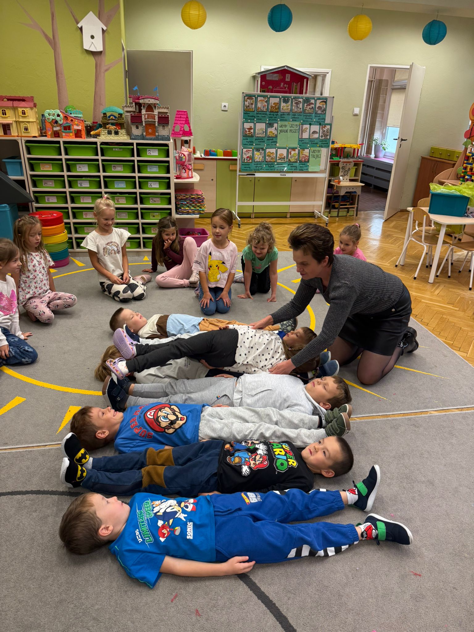 Relacja była słowem kluczem naszych zajęć. Celem spotkania było rozwijanie empatii wśród dzieci, umiejętności rozumienia i nazywania emocji oraz budowanie pozytywnych więzi w grupie. Na początku dzieci wysłuchały opowiadania pt. „Przygoda Małego Misia Empatka”, które pokazało, jak ważne jest dostrzeganie uczuć innych i reagowanie na nie wrażliwie. Następnie obejrzały film animowany – edukacyjny, który w przystępny sposób przybliżył temat emocji i ich roli w codziennym życiu. Kolejnym etapem były zabawy integracyjne. W ćwiczeniu „Kładka” dzieci uczyły się współpracy i zaufania, natomiast zabawa „Serce” pozwoliła im okazywać sobie nawzajem ciepło i troskę. Dużo radości przyniosła także zabawa w parach, podczas której dzieci podrzucały w rytm muzyki kolorowe piórka na zwiewnych chustach, ucząc się współdziałania i uważności na partnera. Nie zabrakło też ćwiczeń na rozpoznawanie i naśladowanie różnych emocji, takich jak radość, smutek, złość, zdziwienie, duma, zaskoczenie. Na zakończenie przedszkolaki wzięły udział w zabawie z zawiązanymi oczami, w której musiały zaufać kolegom i pozwolić się bezpiecznie poprowadzić pomiędzy przeszkodami. Dzieci aktywnie uczestniczyły w każdym etapie, z zaangażowaniem rozpoznawały emocje, uczyły się je nazywać i wyrażać, a także wspierały się nawzajem. Dzięki temu cała grupa mogła jeszcze lepiej zrozumieć, jak ważna jest empatia i jak buduje się dobre relacje.