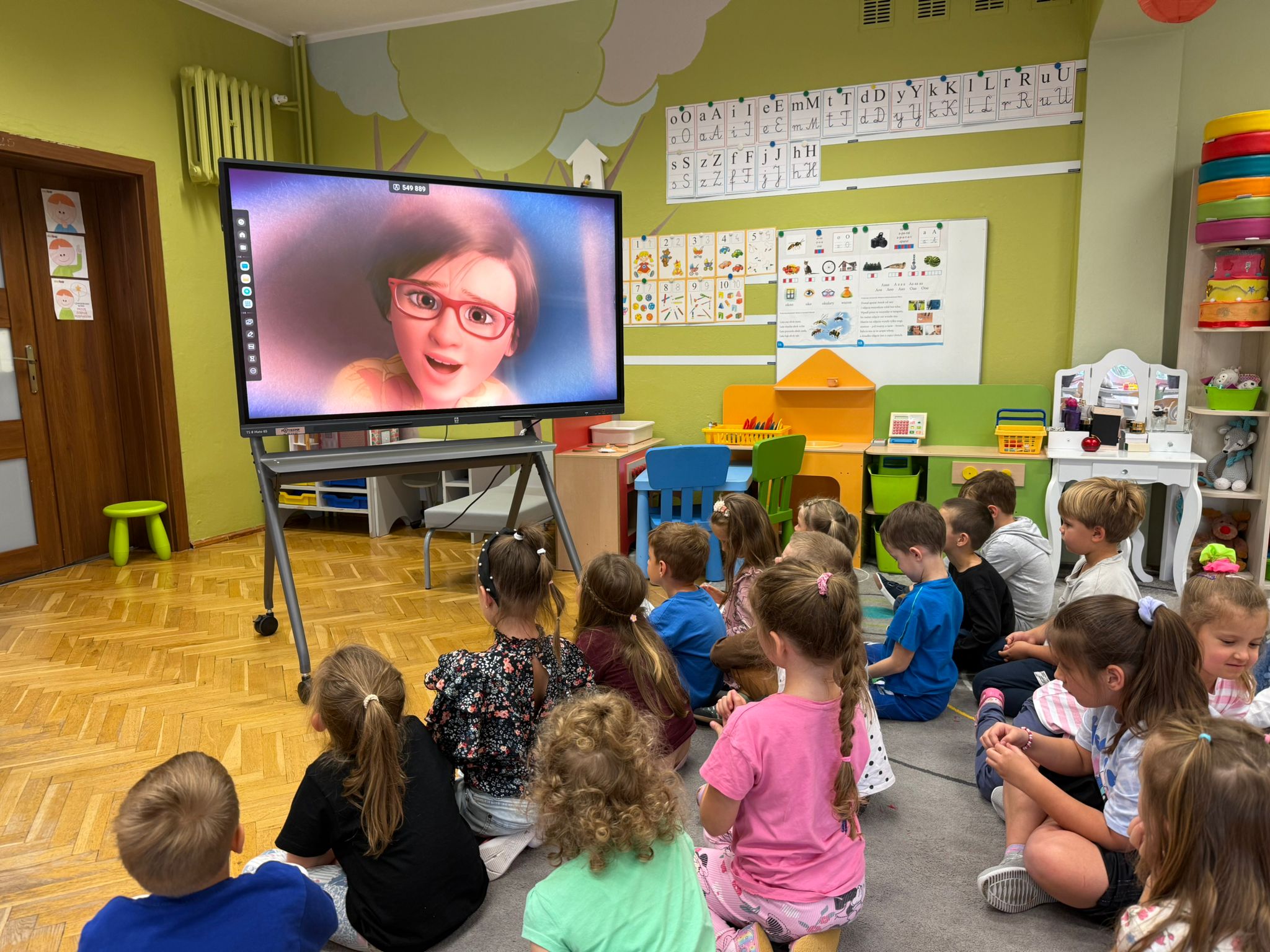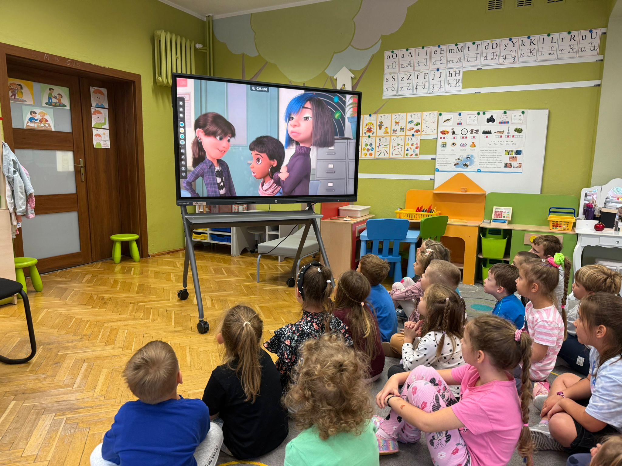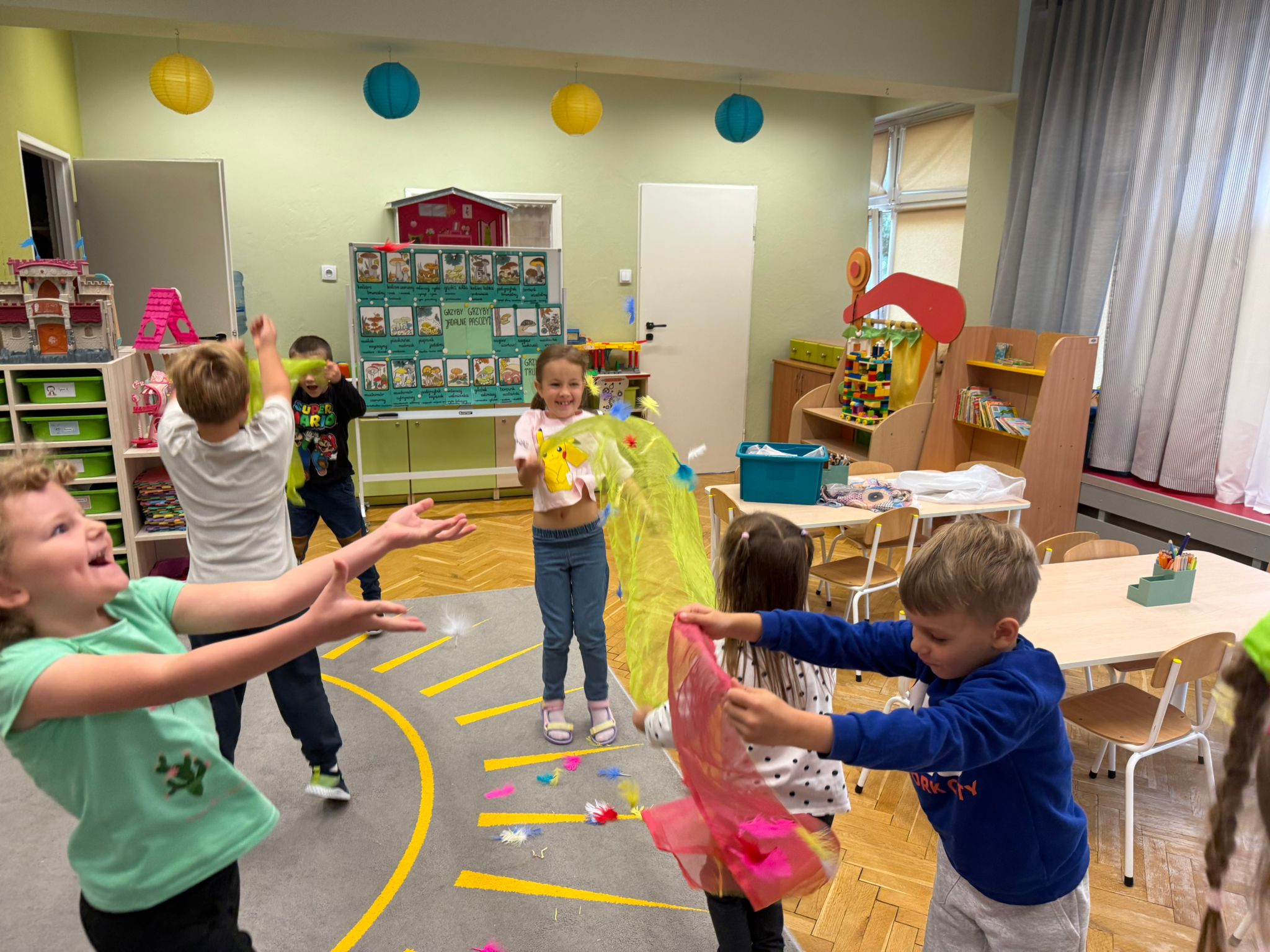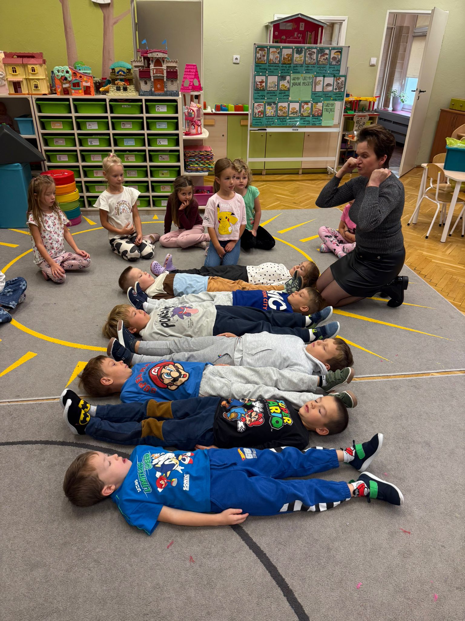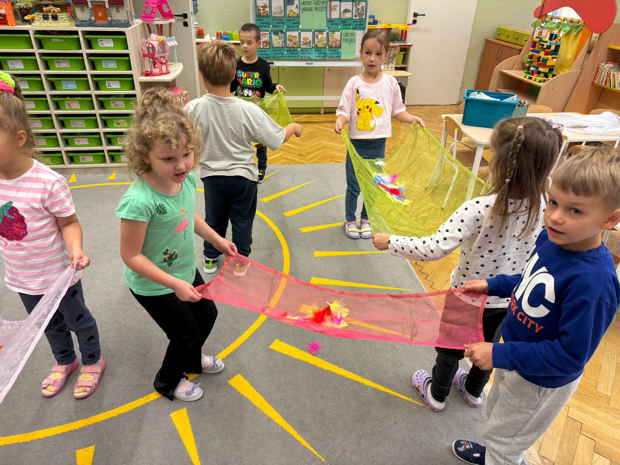 Relacja była słowem kluczem naszych zajęć. Celem spotkania było rozwijanie empatii wśród dzieci, umiejętności rozumienia i nazywania emocji oraz budowanie pozytywnych więzi w grupie. Na początku dzieci wysłuchały opowiadania pt. „Przygoda Małego Misia Empatka”, które pokazało, jak ważne jest dostrzeganie uczuć innych i reagowanie na nie wrażliwie. Następnie obejrzały film animowany – edukacyjny, który w przystępny sposób przybliżył temat emocji i ich roli w codziennym życiu. Kolejnym etapem były zabawy integracyjne. W ćwiczeniu „Kładka” dzieci uczyły się współpracy i zaufania, natomiast zabawa „Serce” pozwoliła im okazywać sobie nawzajem ciepło i troskę. Dużo radości przyniosła także zabawa w parach, podczas której dzieci podrzucały w rytm muzyki kolorowe piórka na zwiewnych chustach, ucząc się współdziałania i uważności na partnera. Nie zabrakło też ćwiczeń na rozpoznawanie i naśladowanie różnych emocji, takich jak radość, smutek, złość, zdziwienie, duma, zaskoczenie. Na zakończenie przedszkolaki wzięły udział w zabawie z zawiązanymi oczami, w której musiały zaufać kolegom i pozwolić się bezpiecznie poprowadzić pomiędzy przeszkodami. Dzieci aktywnie uczestniczyły w każdym etapie, z zaangażowaniem rozpoznawały emocje, uczyły się je nazywać i wyrażać, a także wspierały się nawzajem. Dzięki temu cała grupa mogła jeszcze lepiej zrozumieć, jak ważna jest empatia i jak buduje się dobre relacje.