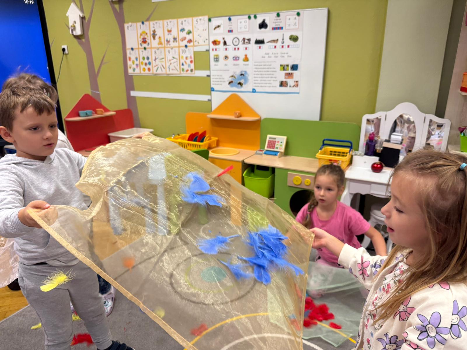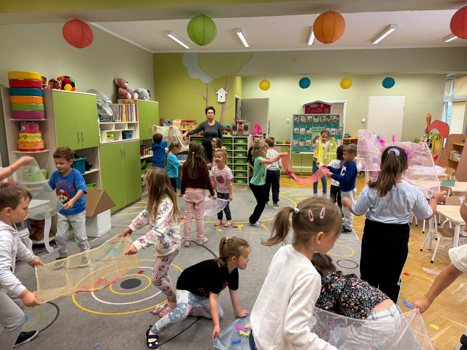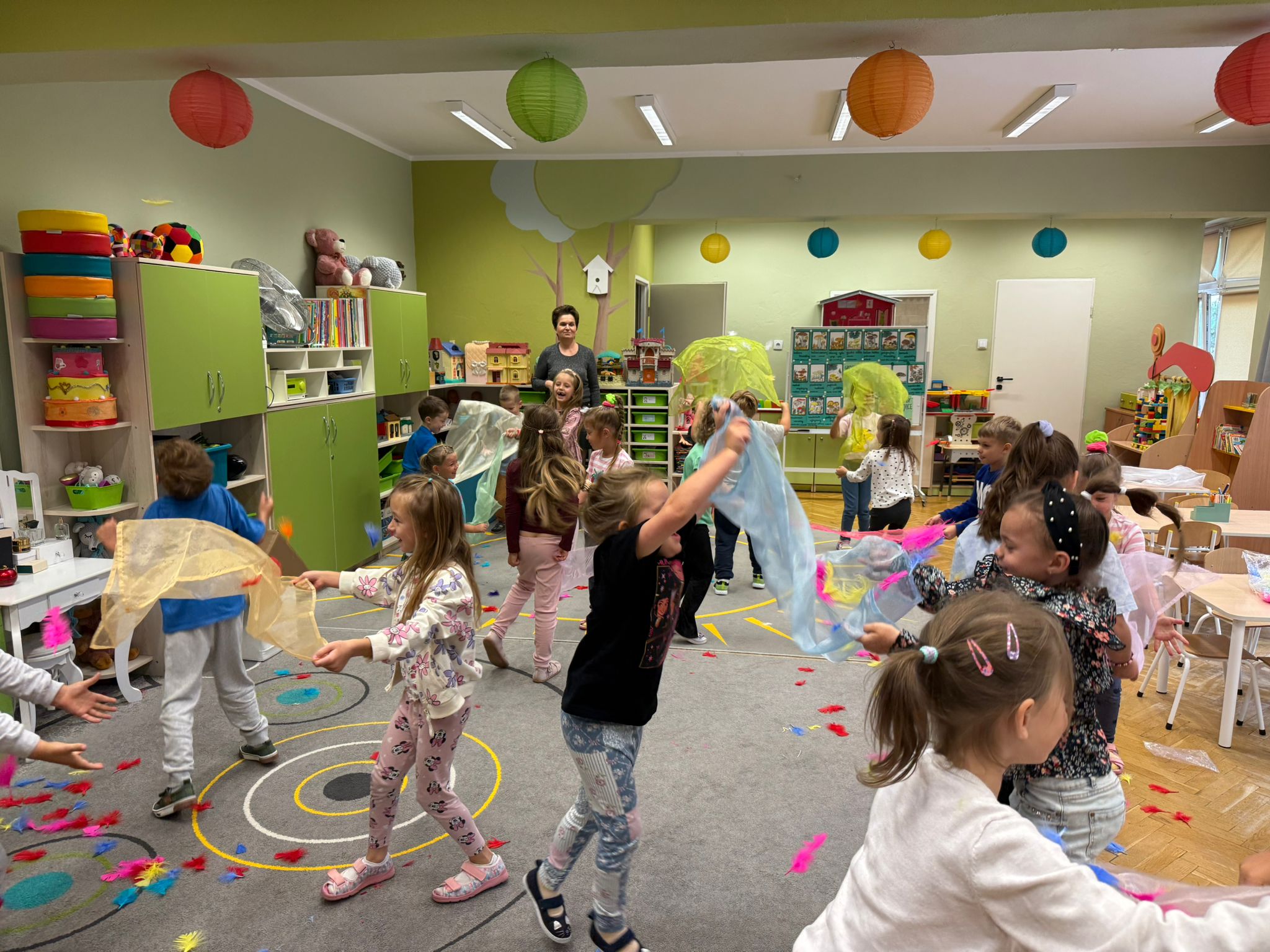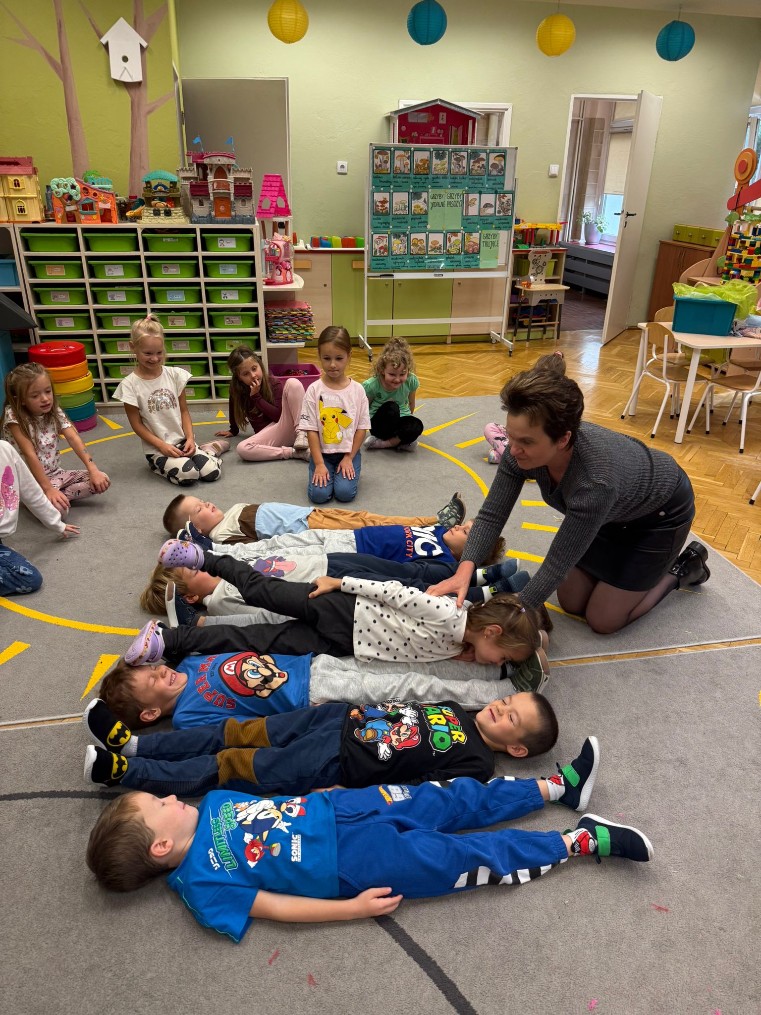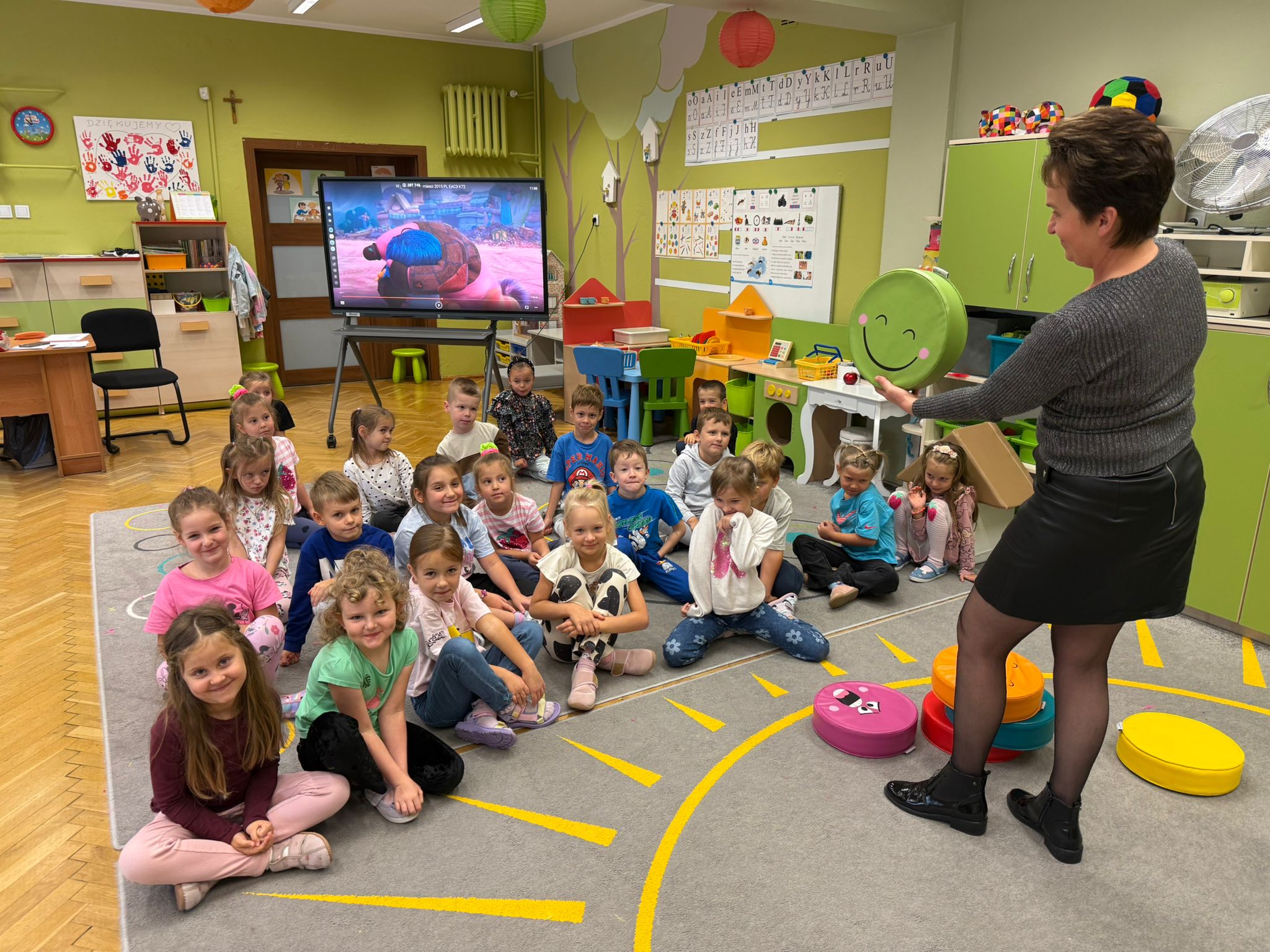 Relacja była słowem kluczem naszych zajęć. Celem spotkania było rozwijanie empatii wśród dzieci, umiejętności rozumienia i nazywania emocji oraz budowanie pozytywnych więzi w grupie. Na początku dzieci wysłuchały opowiadania pt. „Przygoda Małego Misia Empatka”, które pokazało, jak ważne jest dostrzeganie uczuć innych i reagowanie na nie wrażliwie. Następnie obejrzały film animowany – edukacyjny, który w przystępny sposób przybliżył temat emocji i ich roli w codziennym życiu. Kolejnym etapem były zabawy integracyjne. W ćwiczeniu „Kładka” dzieci uczyły się współpracy i zaufania, natomiast zabawa „Serce” pozwoliła im okazywać sobie nawzajem ciepło i troskę. Dużo radości przyniosła także zabawa w parach, podczas której dzieci podrzucały w rytm muzyki kolorowe piórka na zwiewnych chustach, ucząc się współdziałania i uważności na partnera. Nie zabrakło też ćwiczeń na rozpoznawanie i naśladowanie różnych emocji, takich jak radość, smutek, złość, zdziwienie, duma, zaskoczenie. Na zakończenie przedszkolaki wzięły udział w zabawie z zawiązanymi oczami, w której musiały zaufać kolegom i pozwolić się bezpiecznie poprowadzić pomiędzy przeszkodami. Dzieci aktywnie uczestniczyły w każdym etapie, z zaangażowaniem rozpoznawały emocje, uczyły się je nazywać i wyrażać, a także wspierały się nawzajem. Dzięki temu cała grupa mogła jeszcze lepiej zrozumieć, jak ważna jest empatia i jak buduje się dobre relacje.
