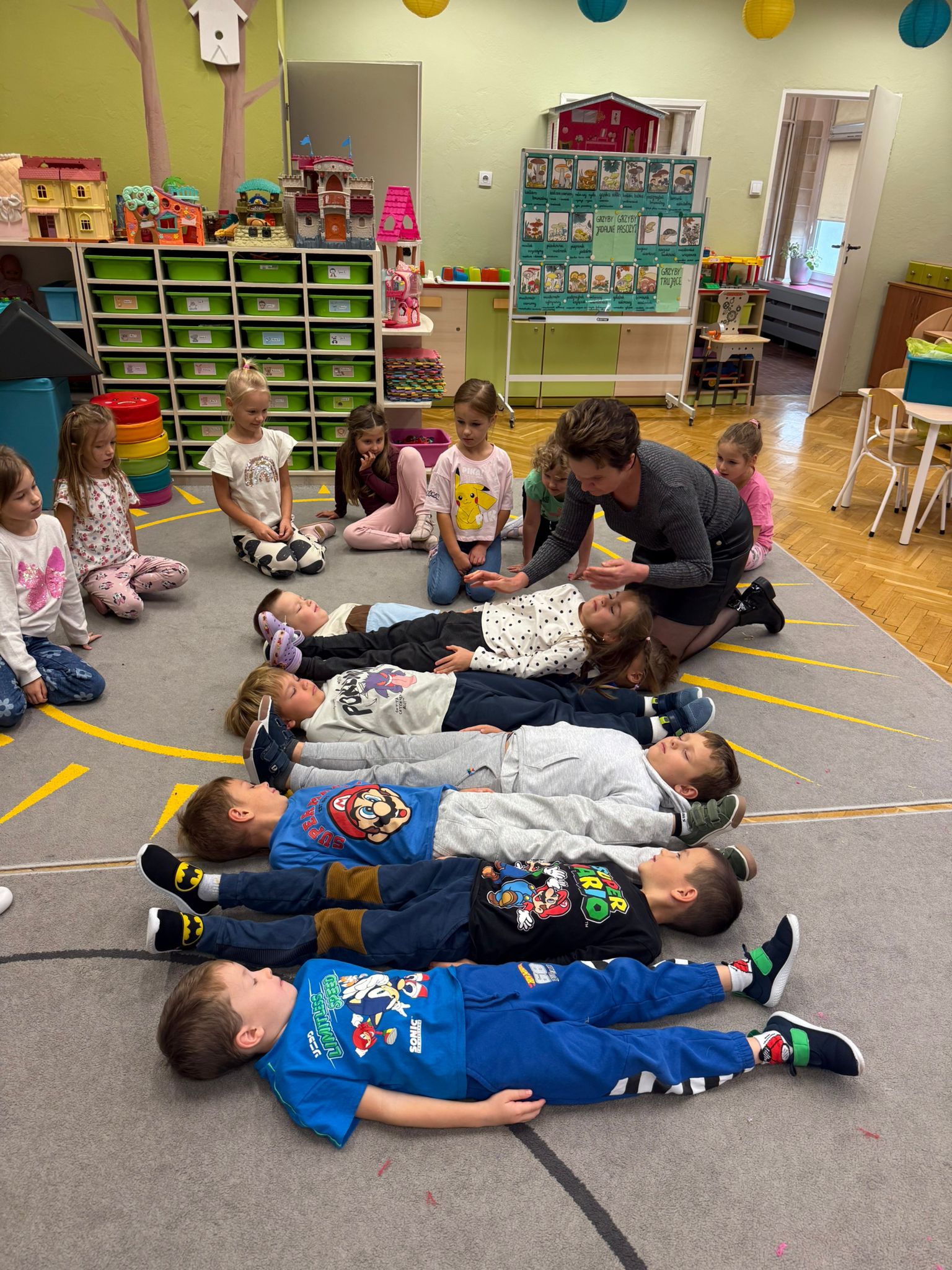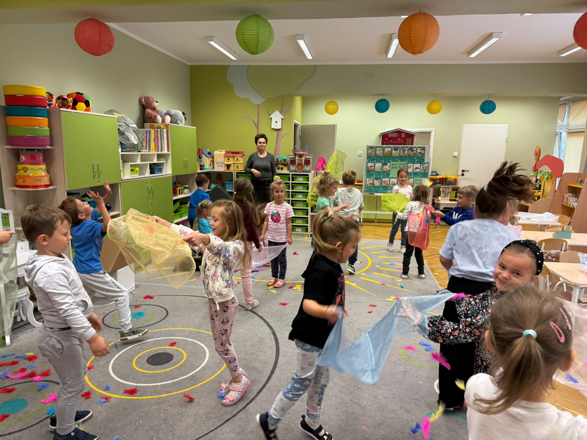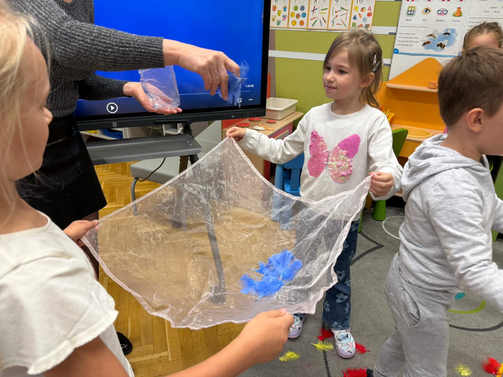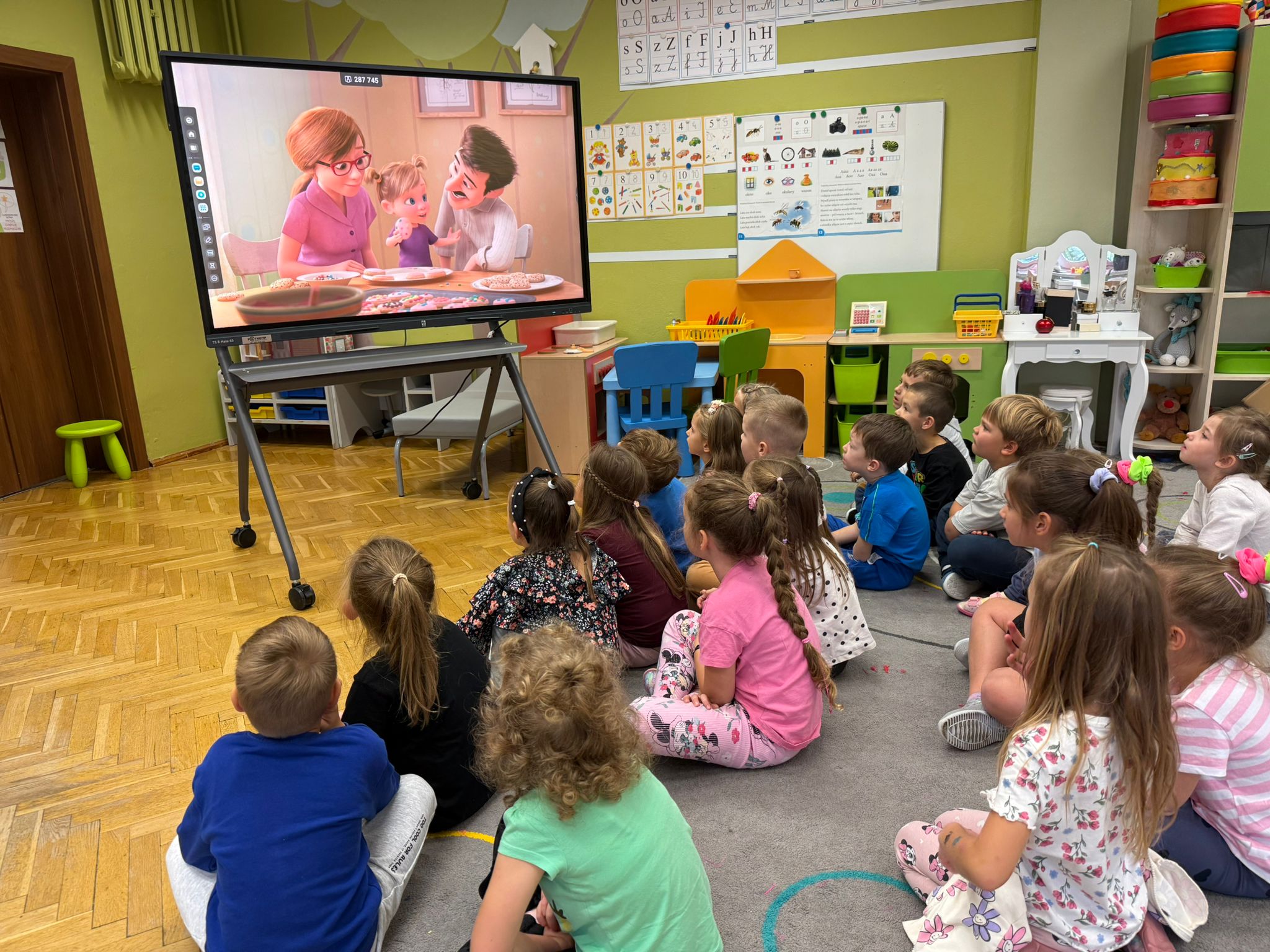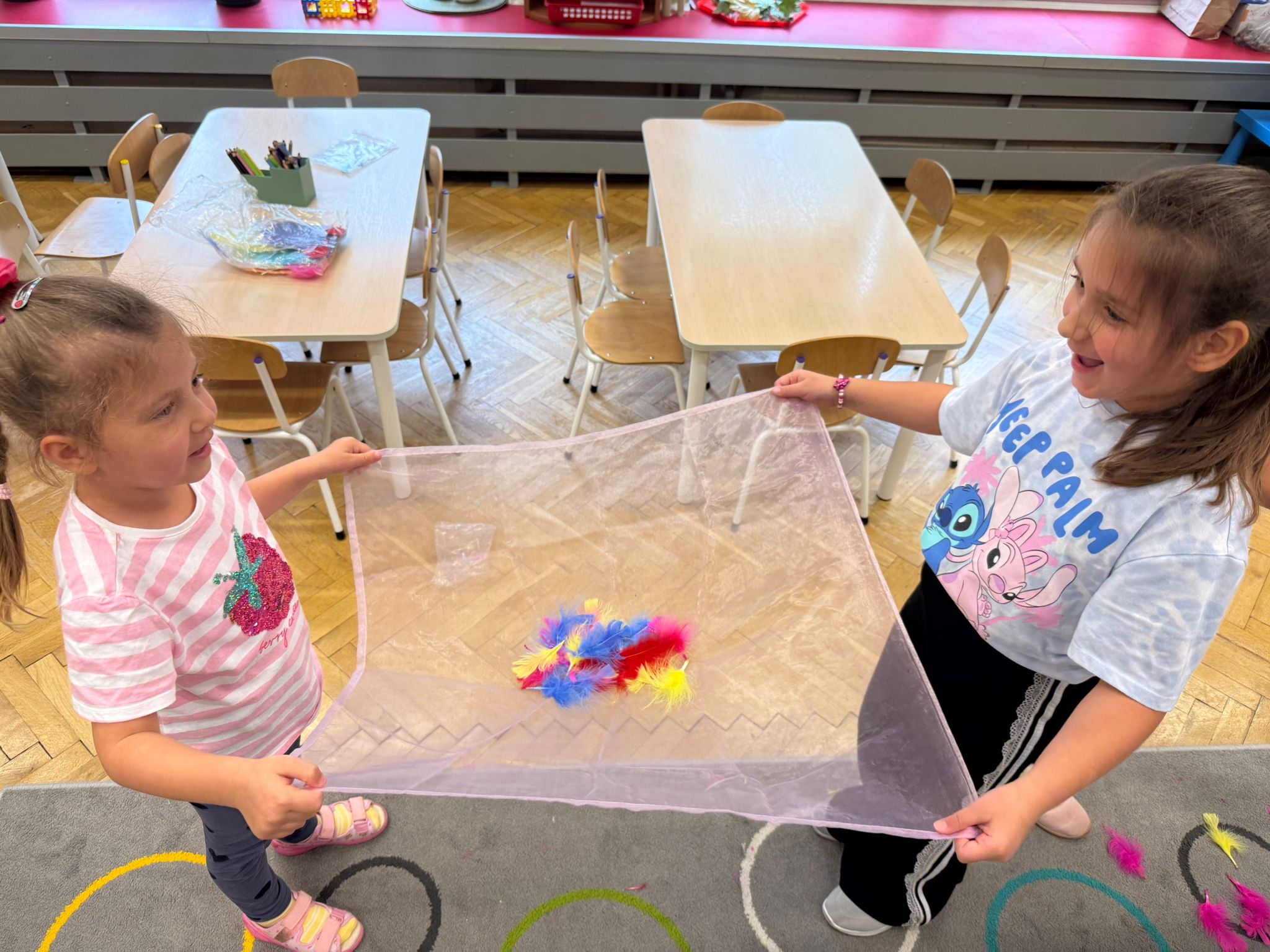 Relacja była słowem kluczem naszych zajęć. Celem spotkania było rozwijanie empatii wśród dzieci, umiejętności rozumienia i nazywania emocji oraz budowanie pozytywnych więzi w grupie. Na początku dzieci wysłuchały opowiadania pt. „Przygoda Małego Misia Empatka”, które pokazało, jak ważne jest dostrzeganie uczuć innych i reagowanie na nie wrażliwie. Następnie obejrzały film animowany – edukacyjny, który w przystępny sposób przybliżył temat emocji i ich roli w codziennym życiu. Kolejnym etapem były zabawy integracyjne. W ćwiczeniu „Kładka” dzieci uczyły się współpracy i zaufania, natomiast zabawa „Serce” pozwoliła im okazywać sobie nawzajem ciepło i troskę. Dużo radości przyniosła także zabawa w parach, podczas której dzieci podrzucały w rytm muzyki kolorowe piórka na zwiewnych chustach, ucząc się współdziałania i uważności na partnera. Nie zabrakło też ćwiczeń na rozpoznawanie i naśladowanie różnych emocji, takich jak radość, smutek, złość, zdziwienie, duma, zaskoczenie. Na zakończenie przedszkolaki wzięły udział w zabawie z zawiązanymi oczami, w której musiały zaufać kolegom i pozwolić się bezpiecznie poprowadzić pomiędzy przeszkodami. Dzieci aktywnie uczestniczyły w każdym etapie, z zaangażowaniem rozpoznawały emocje, uczyły się je nazywać i wyrażać, a także wspierały się nawzajem. Dzięki temu cała grupa mogła jeszcze lepiej zrozumieć, jak ważna jest empatia i jak buduje się dobre relacje.
