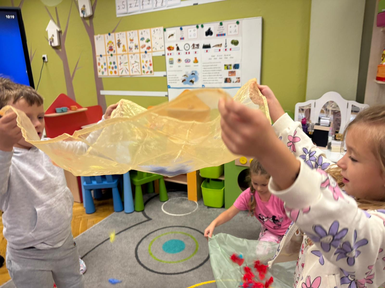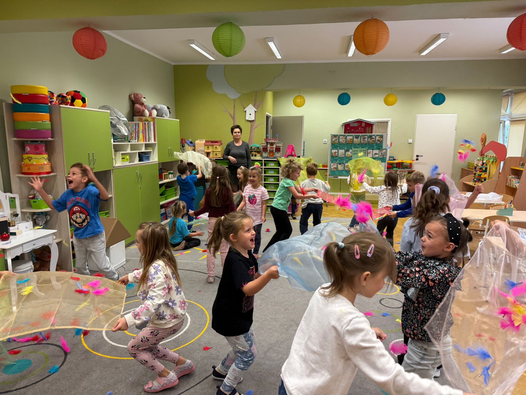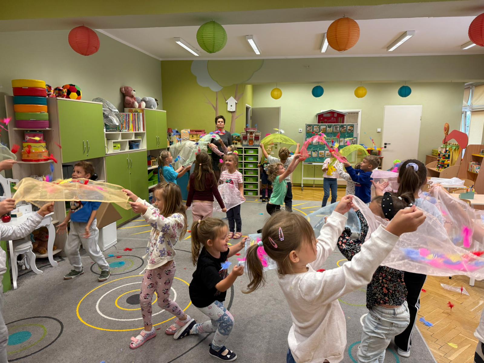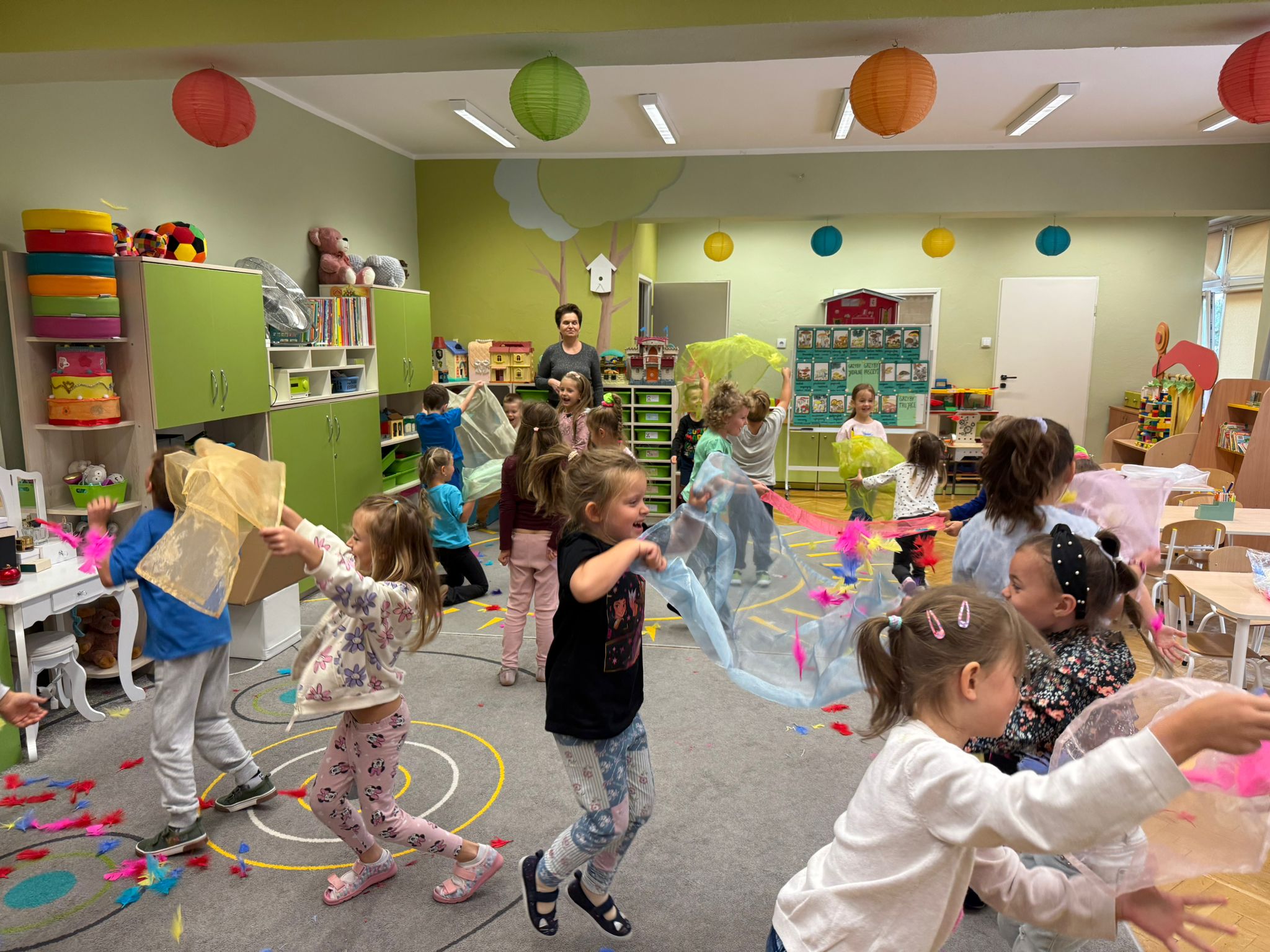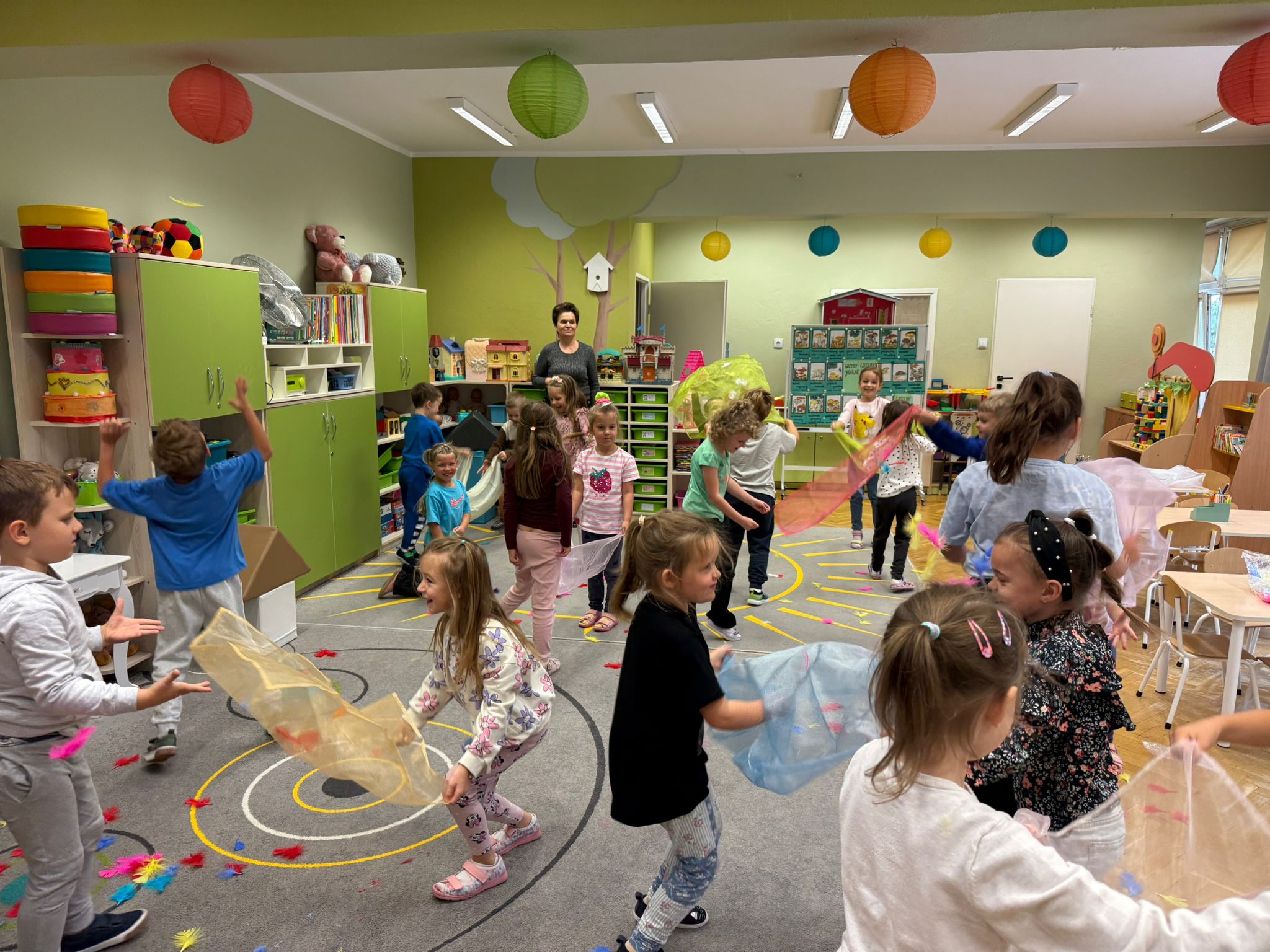 Relacja była słowem kluczem naszych zajęć. Celem spotkania było rozwijanie empatii wśród dzieci, umiejętności rozumienia i nazywania emocji oraz budowanie pozytywnych więzi w grupie. Na początku dzieci wysłuchały opowiadania pt. „Przygoda Małego Misia Empatka”, które pokazało, jak ważne jest dostrzeganie uczuć innych i reagowanie na nie wrażliwie. Następnie obejrzały film animowany – edukacyjny, który w przystępny sposób przybliżył temat emocji i ich roli w codziennym życiu. Kolejnym etapem były zabawy integracyjne. W ćwiczeniu „Kładka” dzieci uczyły się współpracy i zaufania, natomiast zabawa „Serce” pozwoliła im okazywać sobie nawzajem ciepło i troskę. Dużo radości przyniosła także zabawa w parach, podczas której dzieci podrzucały w rytm muzyki kolorowe piórka na zwiewnych chustach, ucząc się współdziałania i uważności na partnera. Nie zabrakło też ćwiczeń na rozpoznawanie i naśladowanie różnych emocji, takich jak radość, smutek, złość, zdziwienie, duma, zaskoczenie. Na zakończenie przedszkolaki wzięły udział w zabawie z zawiązanymi oczami, w której musiały zaufać kolegom i pozwolić się bezpiecznie poprowadzić pomiędzy przeszkodami. Dzieci aktywnie uczestniczyły w każdym etapie, z zaangażowaniem rozpoznawały emocje, uczyły się je nazywać i wyrażać, a także wspierały się nawzajem. Dzięki temu cała grupa mogła jeszcze lepiej zrozumieć, jak ważna jest empatia i jak buduje się dobre relacje.