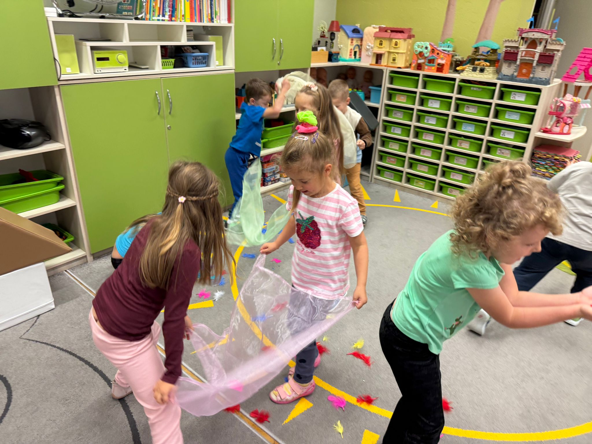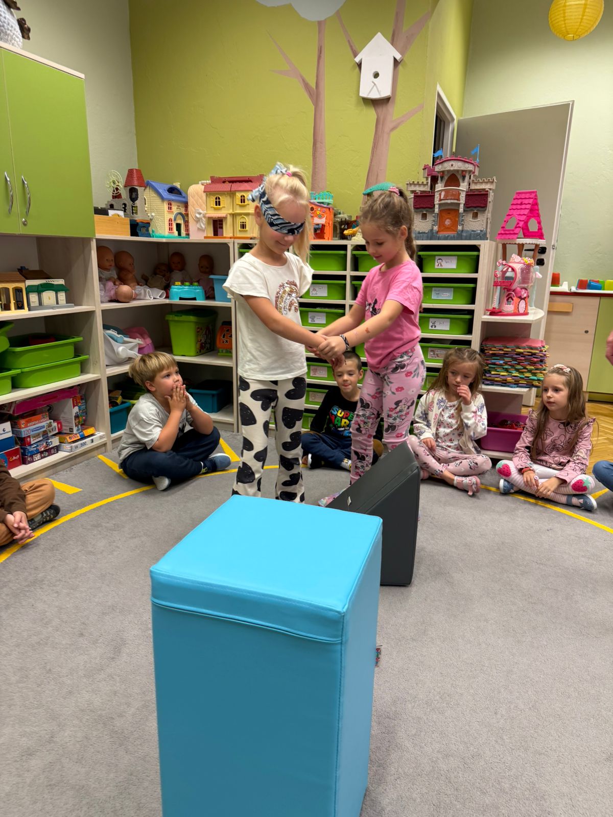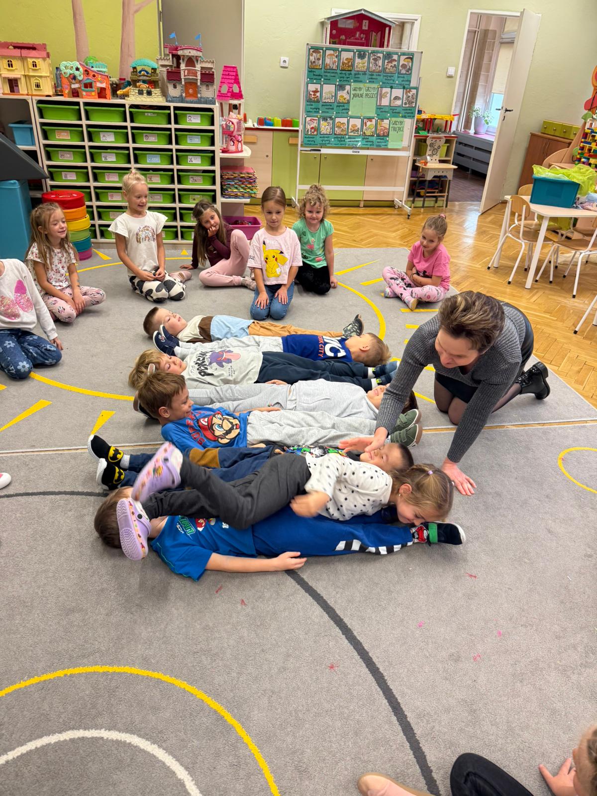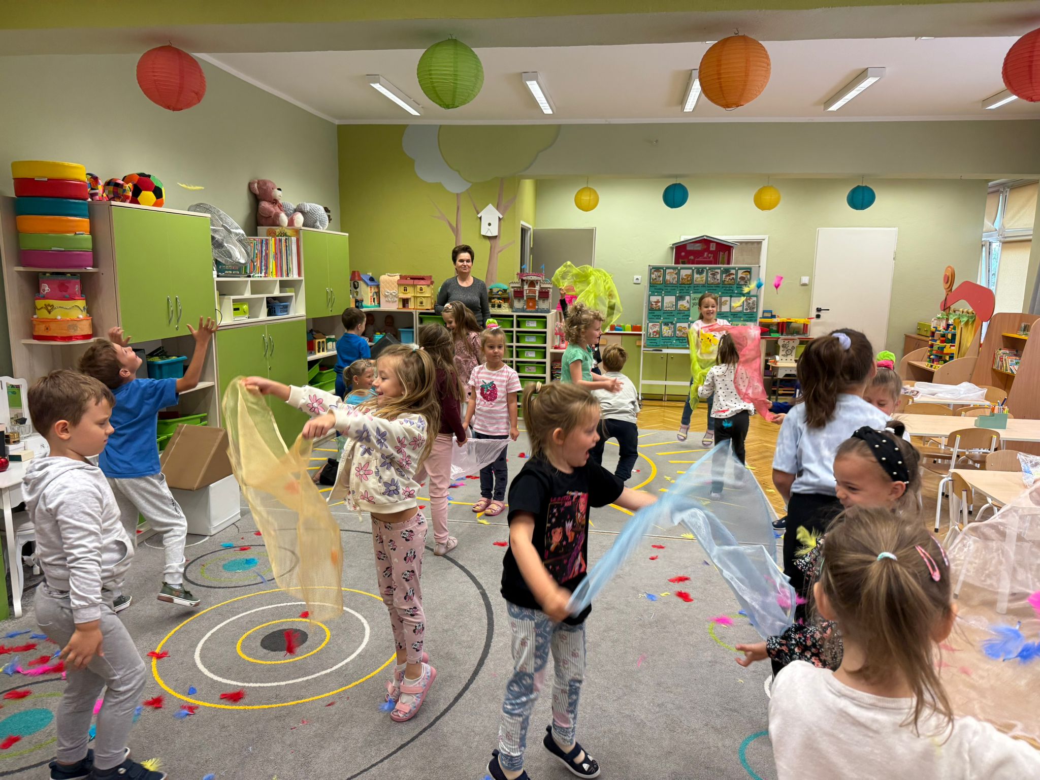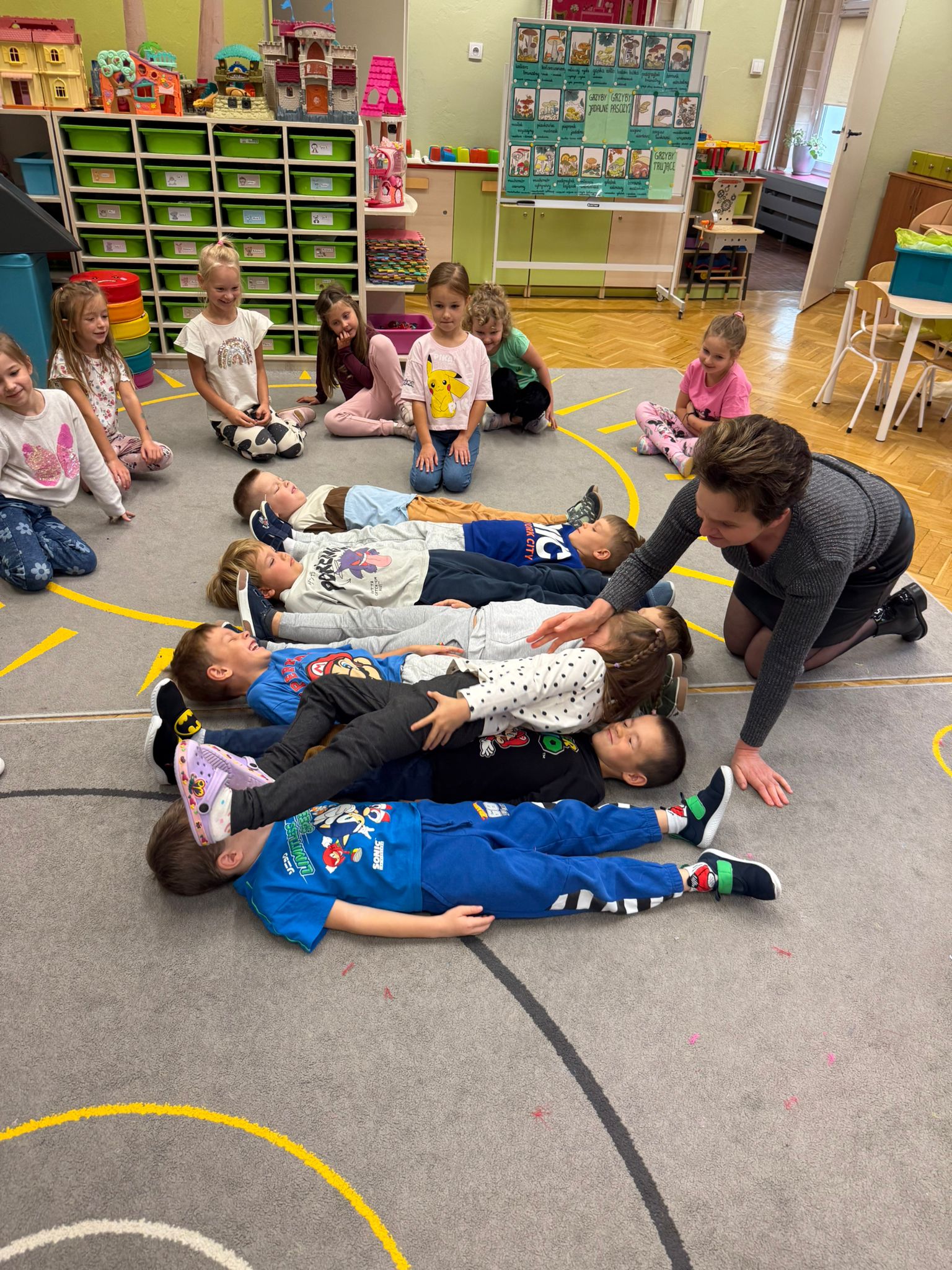 Relacja była słowem kluczem naszych zajęć. Celem spotkania było rozwijanie empatii wśród dzieci, umiejętności rozumienia i nazywania emocji oraz budowanie pozytywnych więzi w grupie. Na początku dzieci wysłuchały opowiadania pt. „Przygoda Małego Misia Empatka”, które pokazało, jak ważne jest dostrzeganie uczuć innych i reagowanie na nie wrażliwie. Następnie obejrzały film animowany – edukacyjny, który w przystępny sposób przybliżył temat emocji i ich roli w codziennym życiu. Kolejnym etapem były zabawy integracyjne. W ćwiczeniu „Kładka” dzieci uczyły się współpracy i zaufania, natomiast zabawa „Serce” pozwoliła im okazywać sobie nawzajem ciepło i troskę. Dużo radości przyniosła także zabawa w parach, podczas której dzieci podrzucały w rytm muzyki kolorowe piórka na zwiewnych chustach, ucząc się współdziałania i uważności na partnera. Nie zabrakło też ćwiczeń na rozpoznawanie i naśladowanie różnych emocji, takich jak radość, smutek, złość, zdziwienie, duma, zaskoczenie. Na zakończenie przedszkolaki wzięły udział w zabawie z zawiązanymi oczami, w której musiały zaufać kolegom i pozwolić się bezpiecznie poprowadzić pomiędzy przeszkodami. Dzieci aktywnie uczestniczyły w każdym etapie, z zaangażowaniem rozpoznawały emocje, uczyły się je nazywać i wyrażać, a także wspierały się nawzajem. Dzięki temu cała grupa mogła jeszcze lepiej zrozumieć, jak ważna jest empatia i jak buduje się dobre relacje.