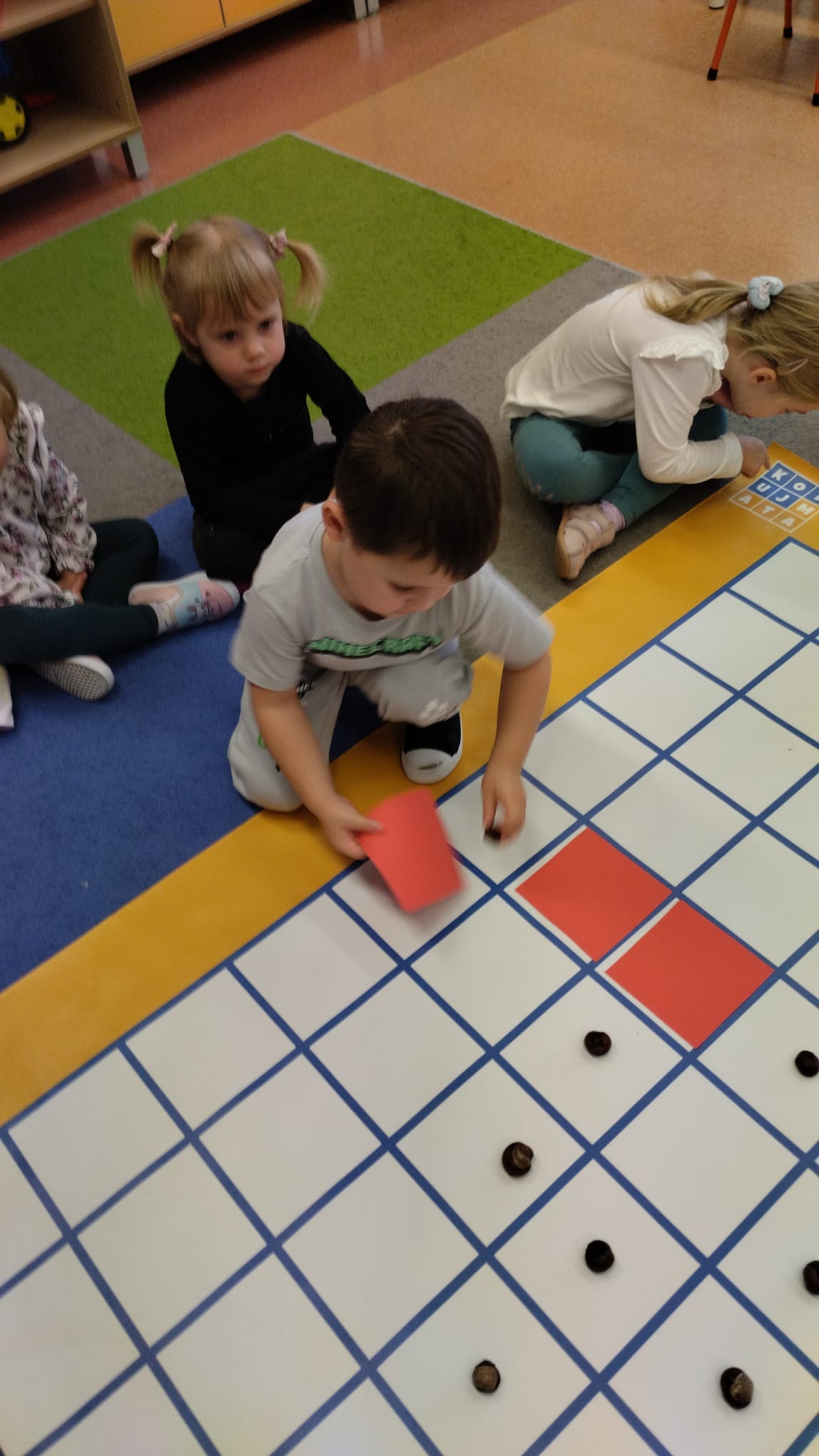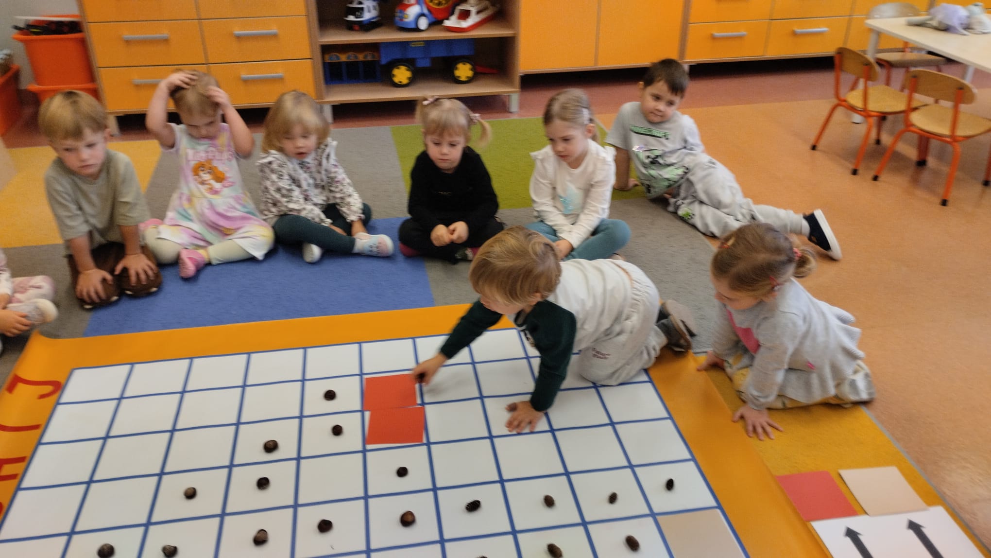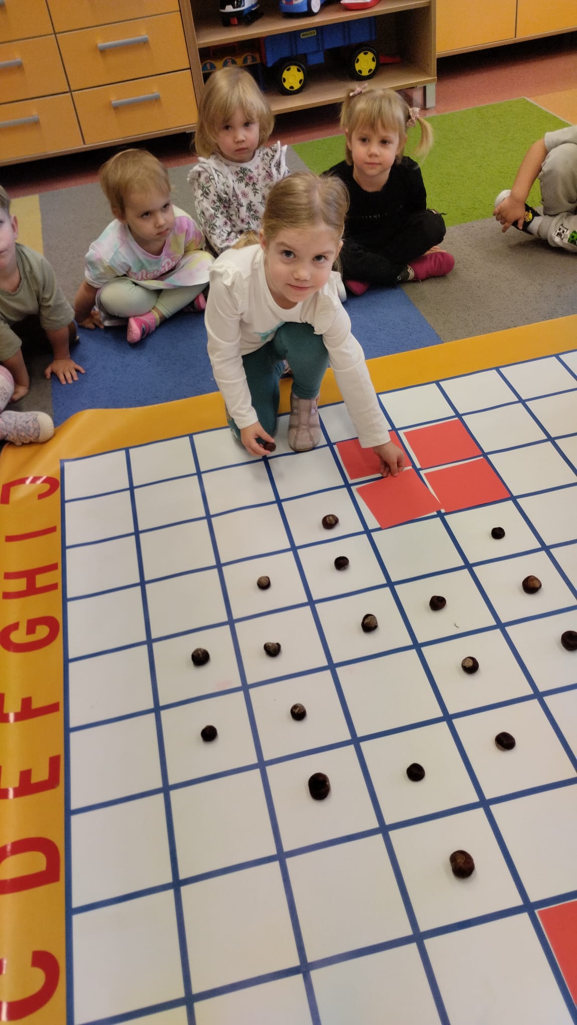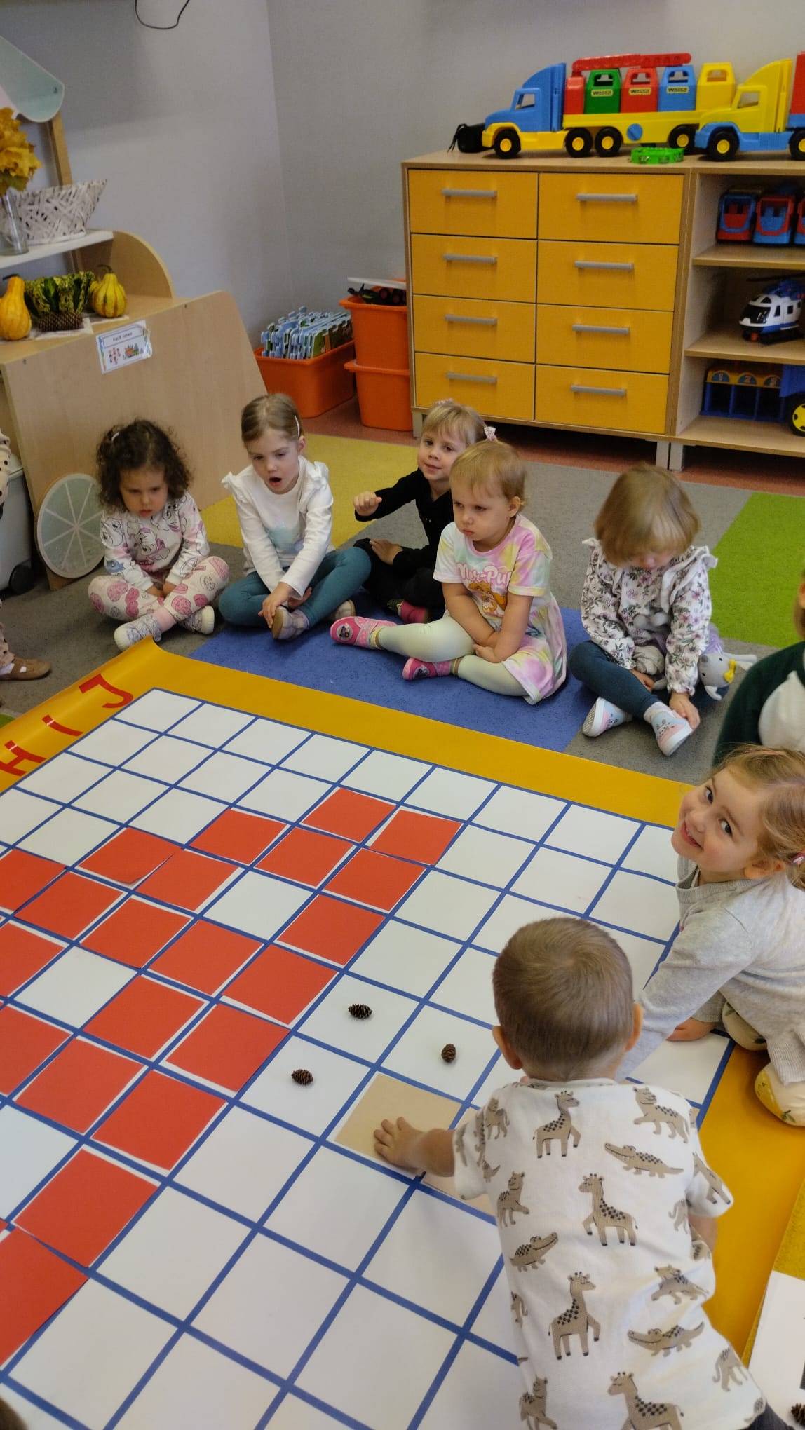 Maluszki z grupy IX z dużą przyjemnością wzięły po raz pierwszy udział w kodowaniu na dywanie. Wykorzystując specjalną matę ruszyły na kodowane „grzybobranie”… Ćwiczyły spostrzegawczość zastępując materiał przyrodniczy kartonikiem w odpowiednim kolorze.