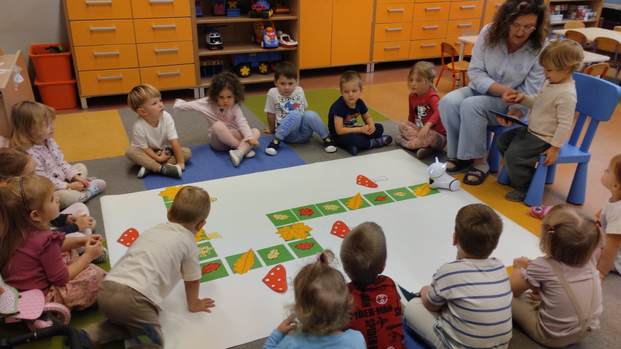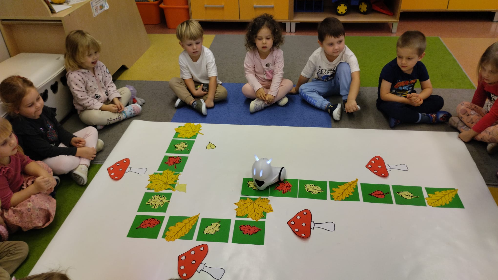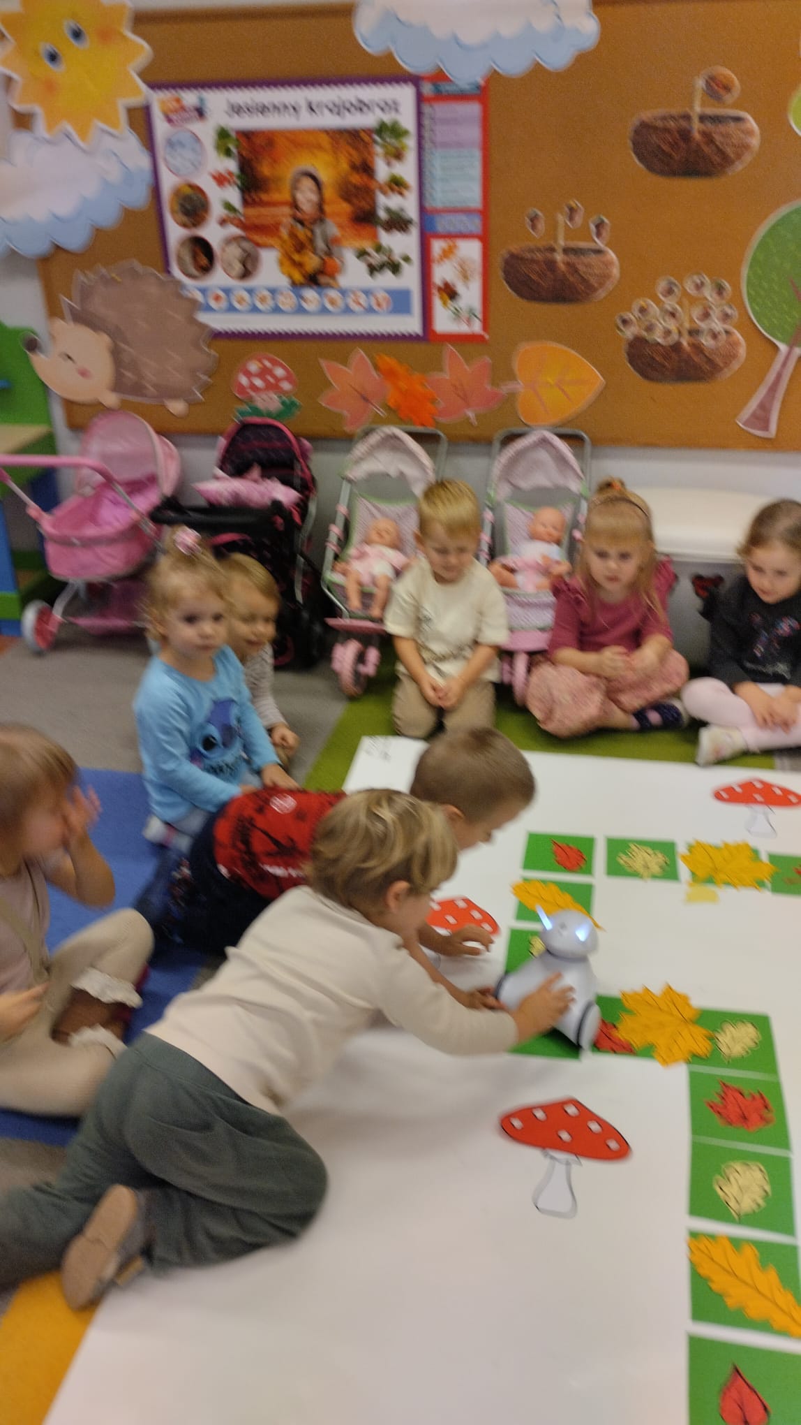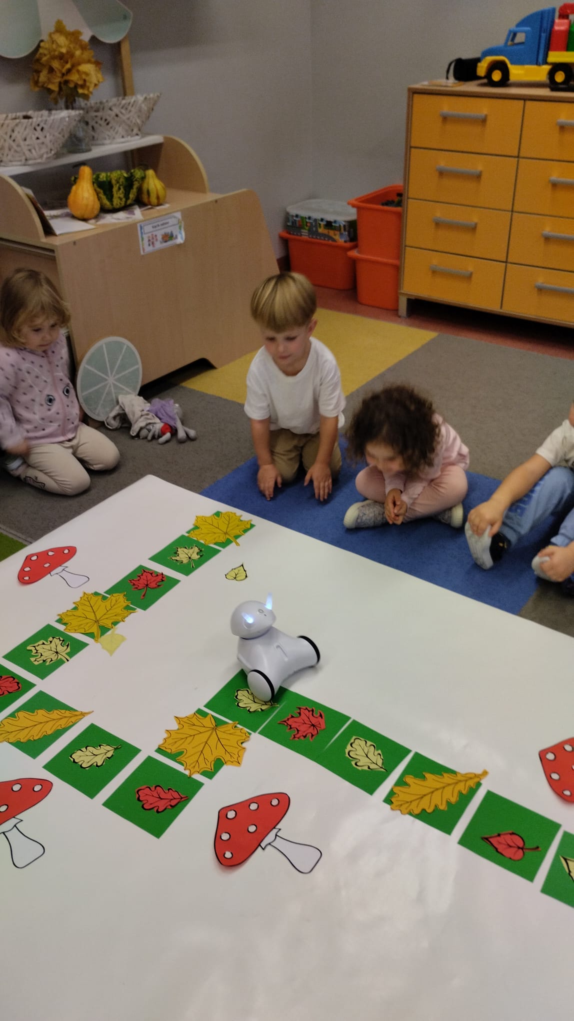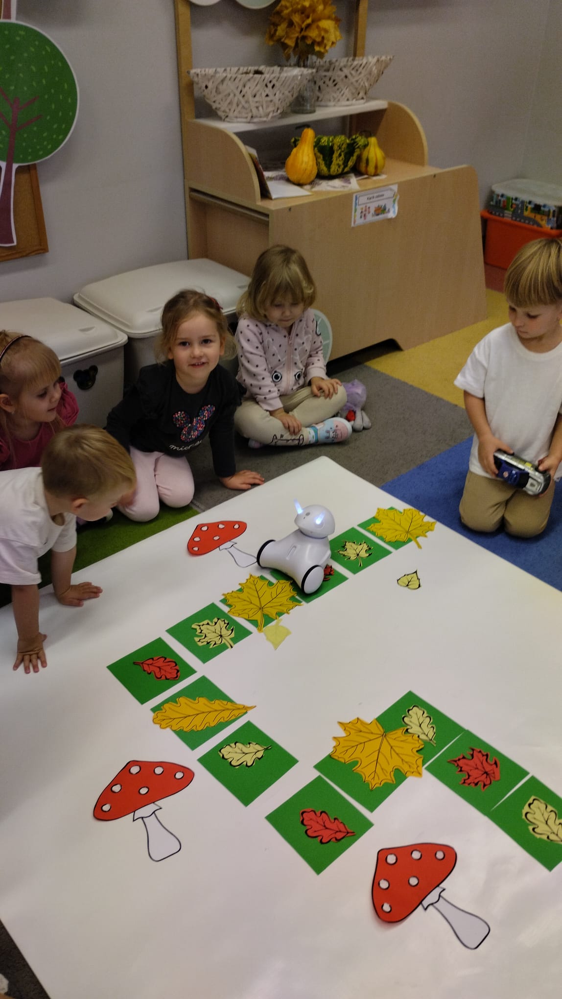 Niewątpliwą atrakcją było pierwsze spotkanie z Photonem - interaktywnym robotem edukacyjnym. Dzieci uczyły go poruszania się w określonych kierunkach, ćwicząc orientację w przestrzeni. Zabawy w kodowanie były doskonałą okazją do wzbogacenia wiedzy o jesieni i jej darach. Sprawiły też dzieciom dużą frajdę, dlatego z pewnością będziemy kontynuować przygodę z kodowaniem przez kolejne miesiące.
