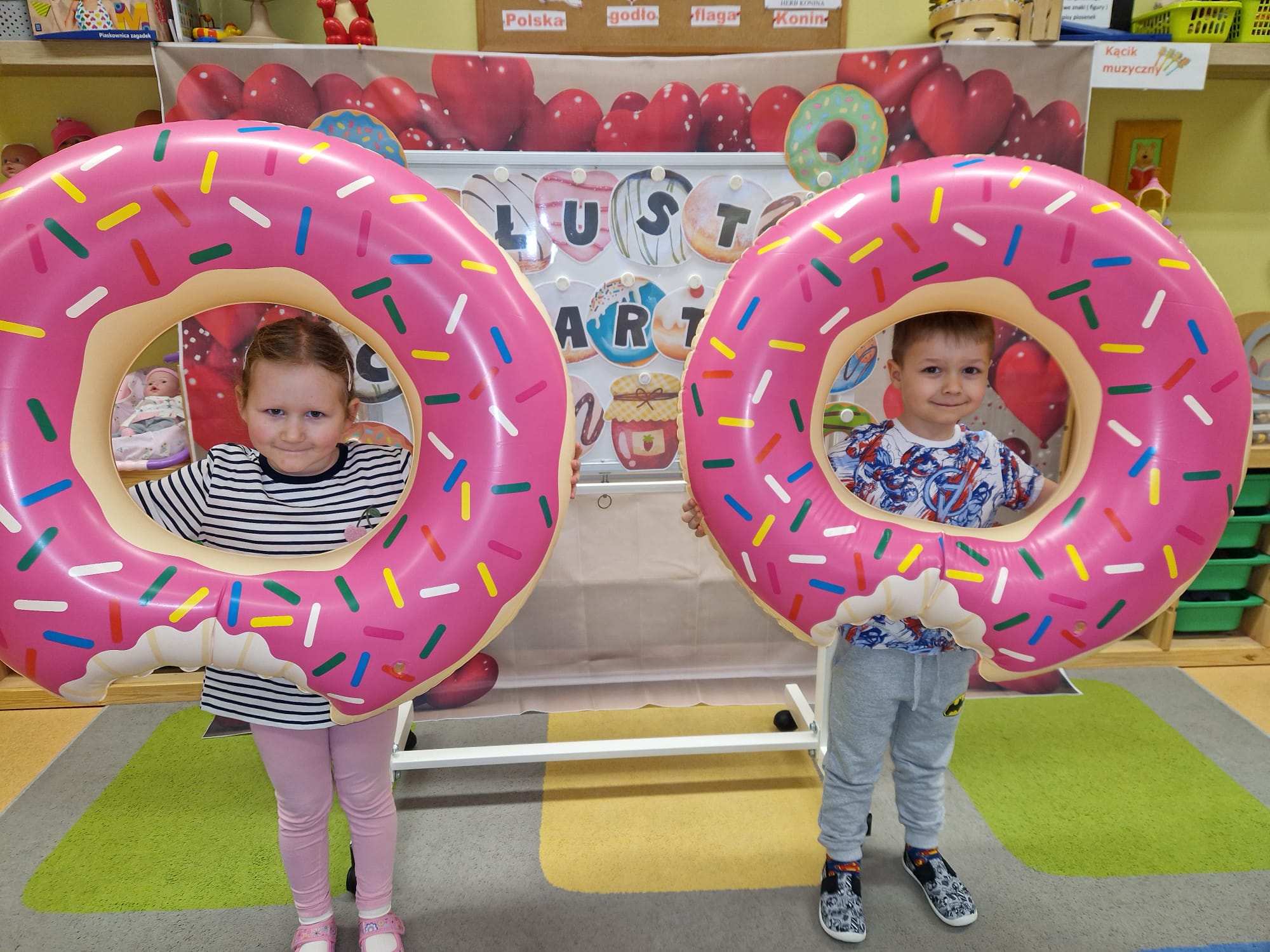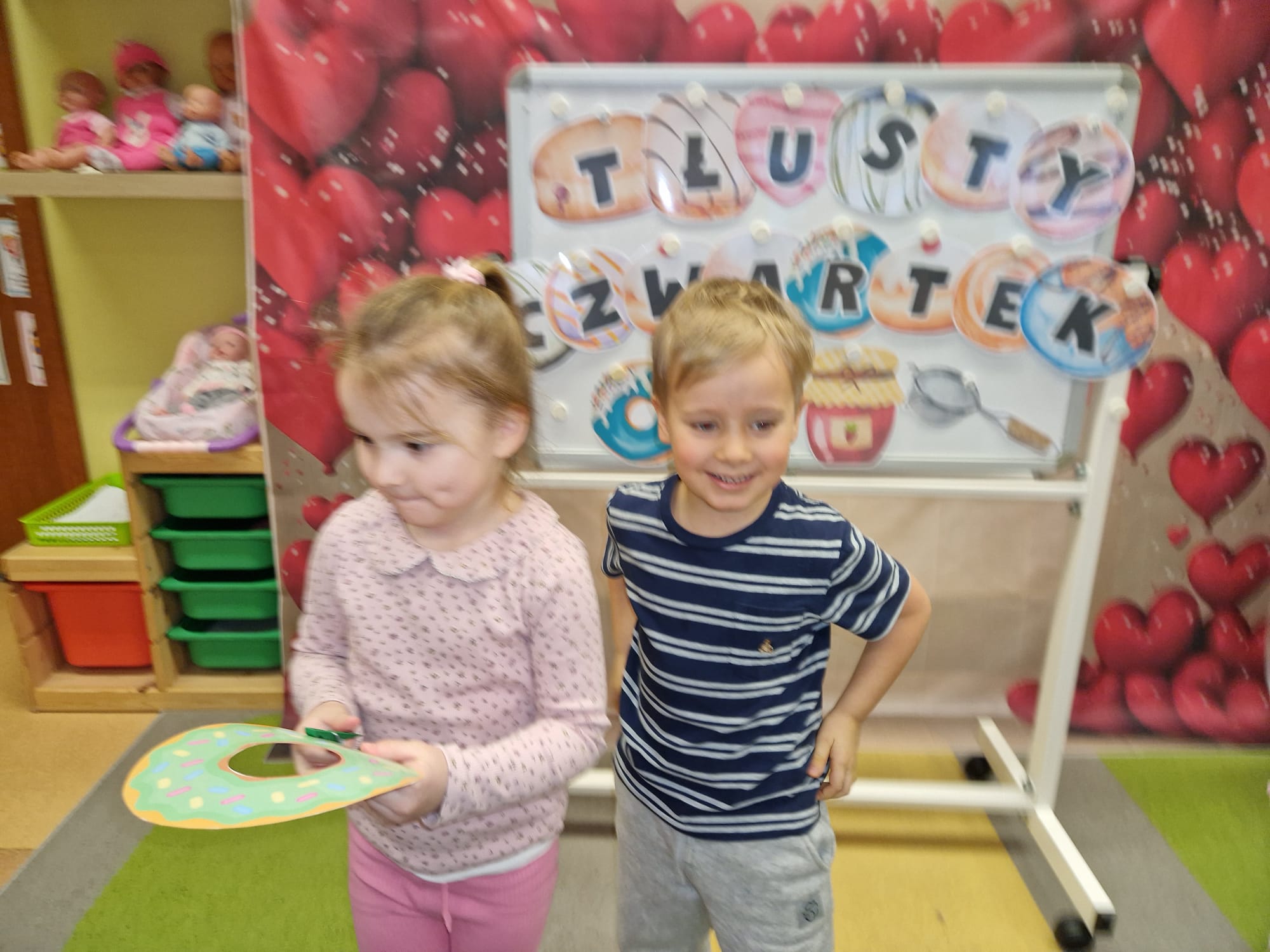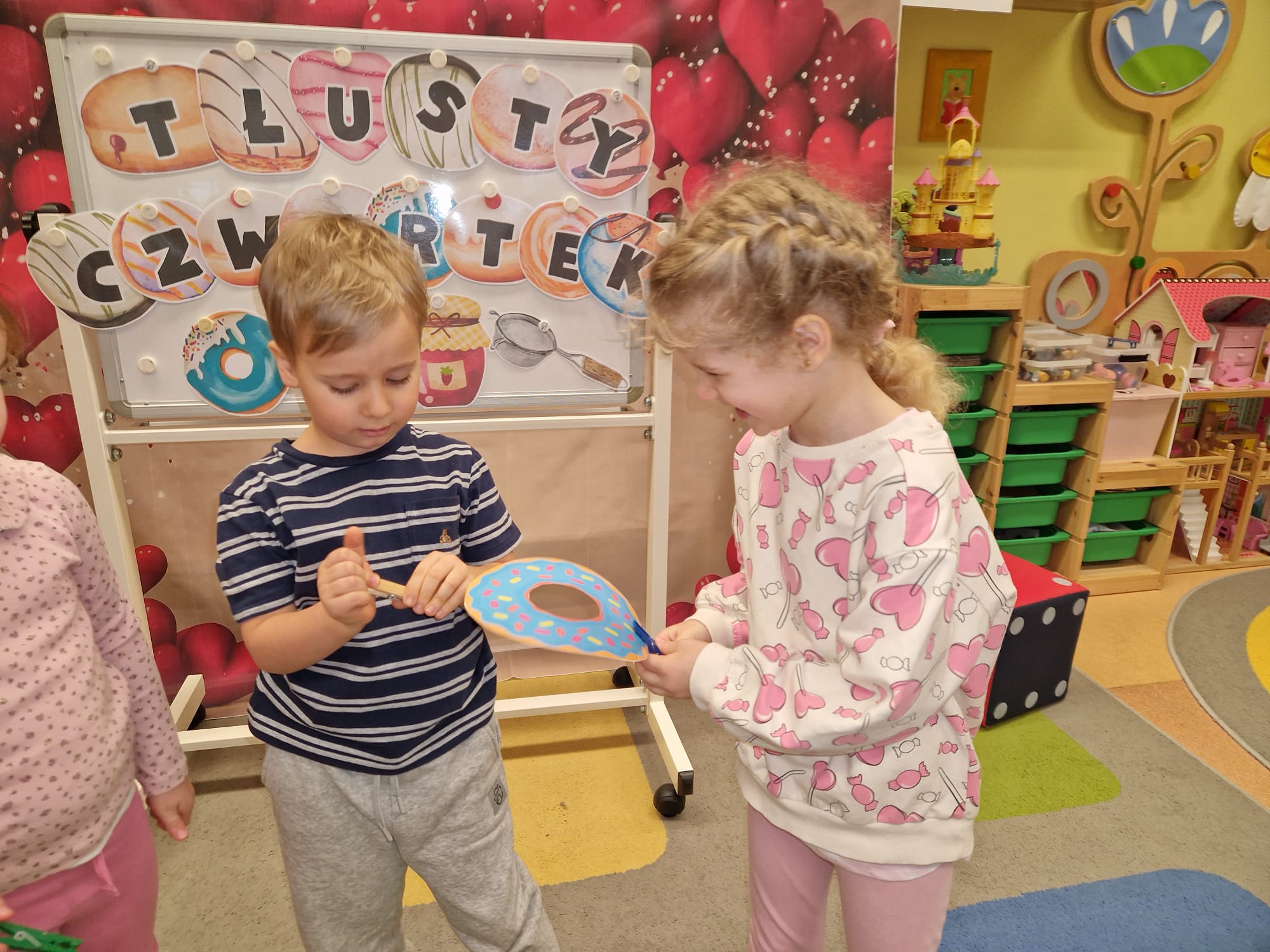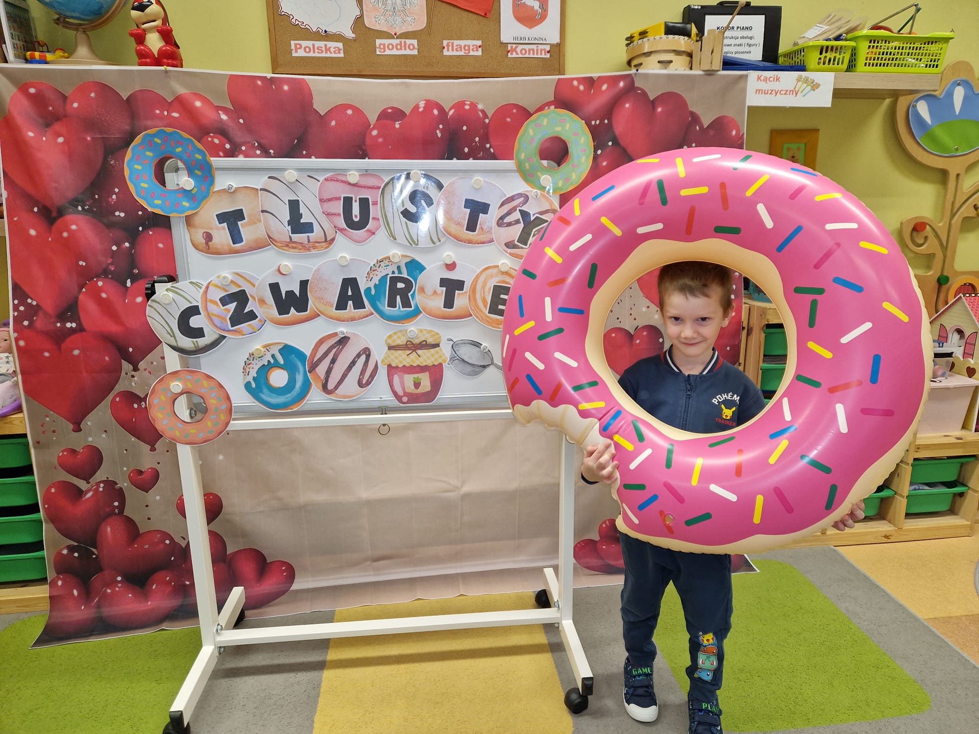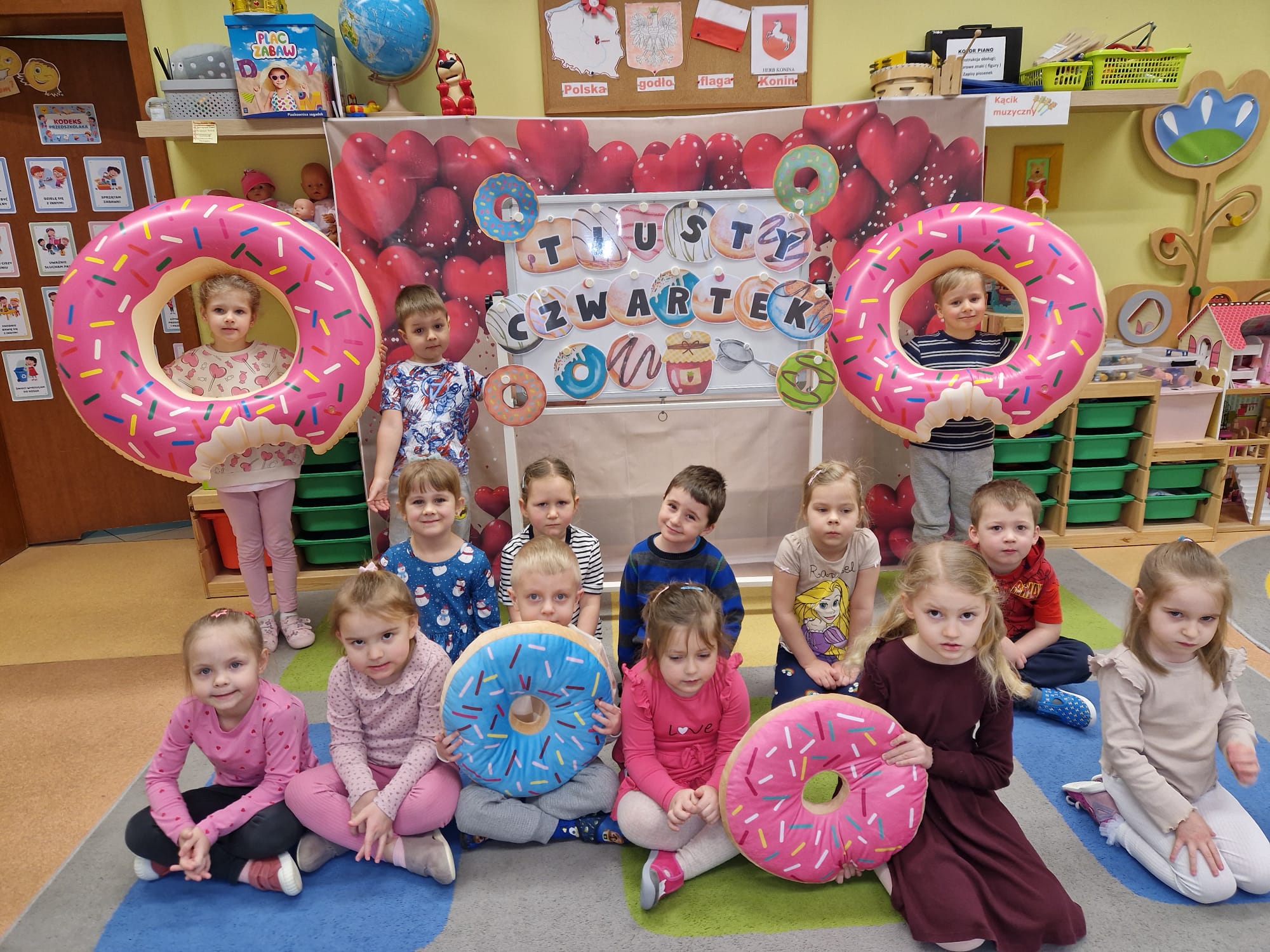 „ Pączki i pączusie swe brzuszki wypinają, przymilając się – o Tłustym Czwartku nam przypominają!” … taką oto rymowanką, 12. 02. 2026 średniaki z grupy X rozpoczęły celebrowania najsłodszego dnia w roku - Tłustego Czwartku. Tego dnia wszystkim naszym działaniom patronował KRÓL PĄCZEK w wielu swoich odmianach, a wszystko po to, aby poprzez zabawę przybliżyć dzieciom staropolską tradycję Tłustego Czwartku. Nie zabrakło zatem pączkowych zajęć takich jak; słodka zgaduj- zgadula, zabawa matematyczna, sprawnościowa i taneczna. Zwieńczeniem zaaranżowanych aktywności edukacyjnych była zabawy sensoryczna, podczas której dzieci z masy solnej wykonały swojego wymarzonego pączka … w polewie malinowej lub czekoladowej - do wyboru. Na koniec przedszkolaki ozdobiły swego pączka kolorową, cukierkową posypką, Pączusie wyglądały baaardzo realistycznie, aż szkoda, że były tylko dziełem plastycznym. A prawdziwego, słodziutkiego pączusia średniaki degustowały podczas podwieczorku.... To był naprawdę słodki dzień.