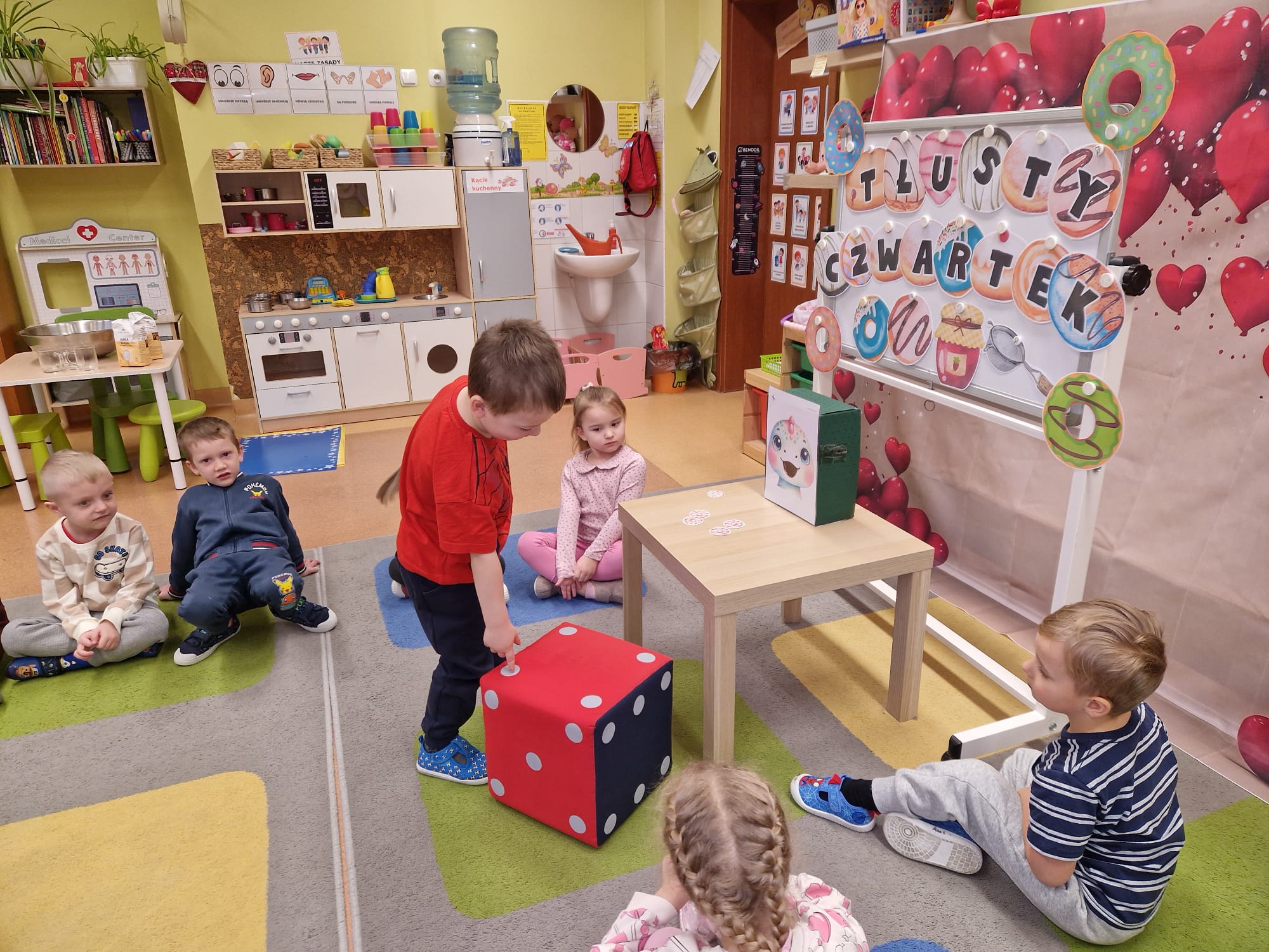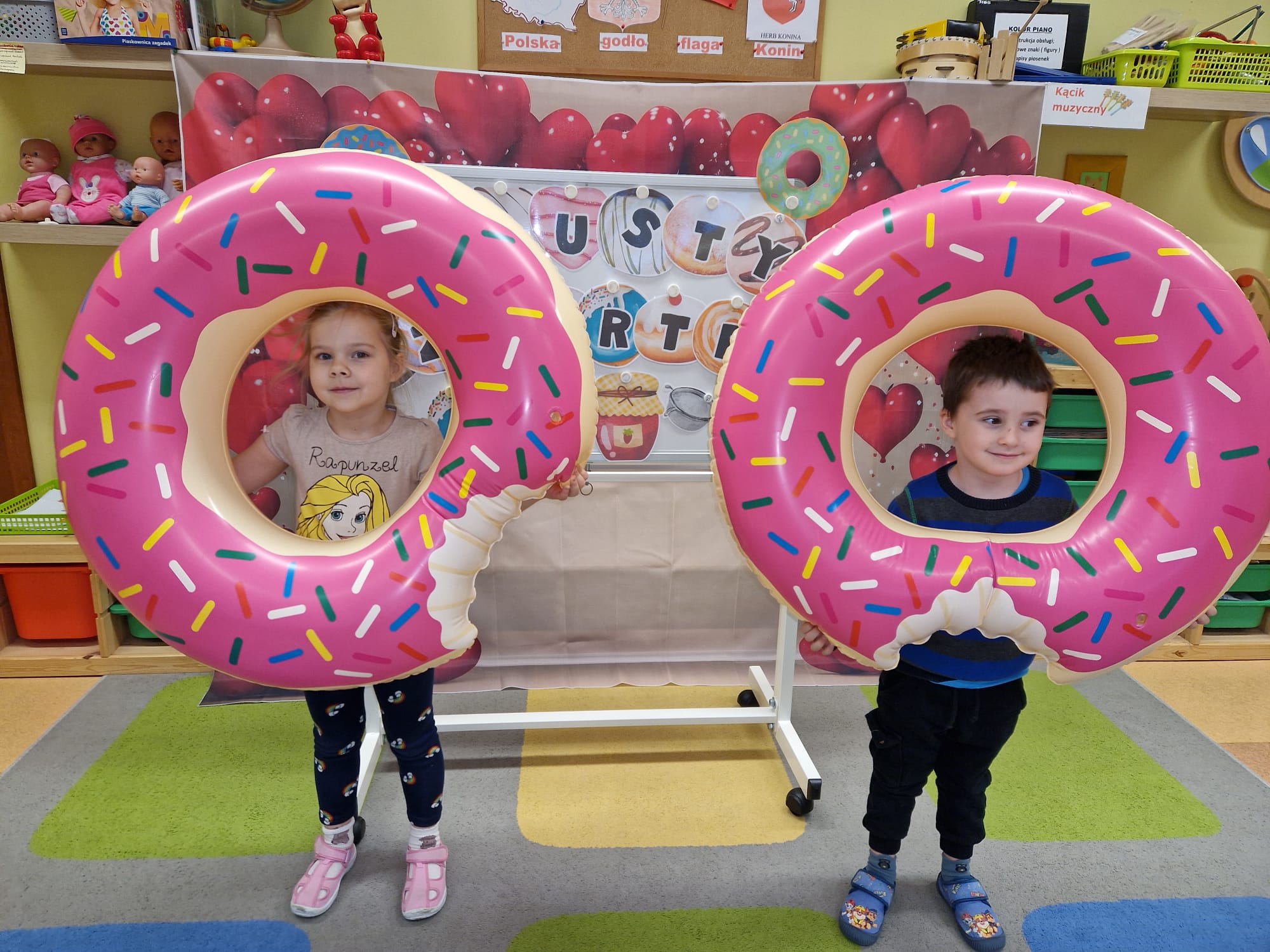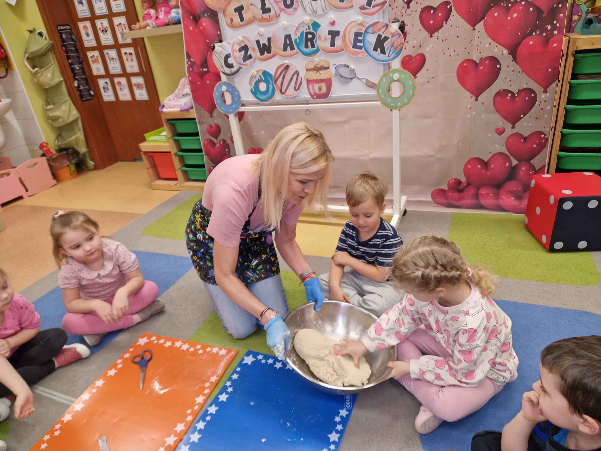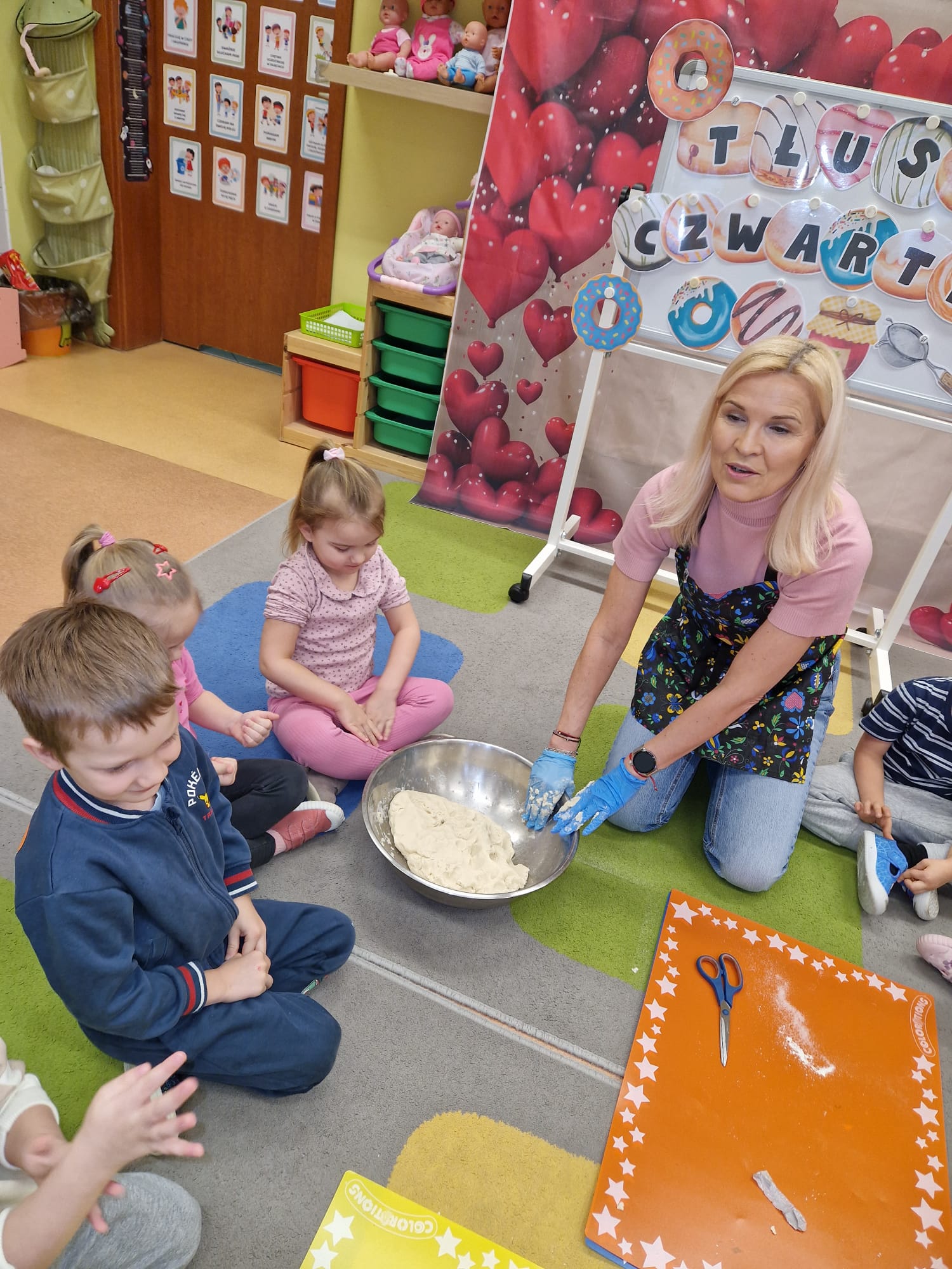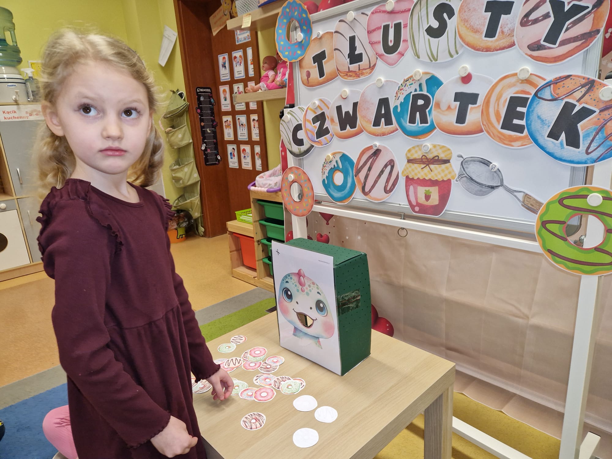 „ Pączki i pączusie swe brzuszki wypinają, przymilając się – o Tłustym Czwartku nam przypominają!” … taką oto rymowanką, 12. 02. 2026 średniaki z grupy X rozpoczęły celebrowania najsłodszego dnia w roku - Tłustego Czwartku. Tego dnia wszystkim naszym działaniom patronował KRÓL PĄCZEK w wielu swoich odmianach, a wszystko po to, aby poprzez zabawę przybliżyć dzieciom staropolską tradycję Tłustego Czwartku. Nie zabrakło zatem pączkowych zajęć takich jak; słodka zgaduj- zgadula, zabawa matematyczna, sprawnościowa i taneczna. Zwieńczeniem zaaranżowanych aktywności edukacyjnych była zabawy sensoryczna, podczas której dzieci z masy solnej wykonały swojego wymarzonego pączka … w polewie malinowej lub czekoladowej - do wyboru. Na koniec przedszkolaki ozdobiły swego pączka kolorową, cukierkową posypką, Pączusie wyglądały baaardzo realistycznie, aż szkoda, że były tylko dziełem plastycznym. A prawdziwego, słodziutkiego pączusia średniaki degustowały podczas podwieczorku.... To był naprawdę słodki dzień.