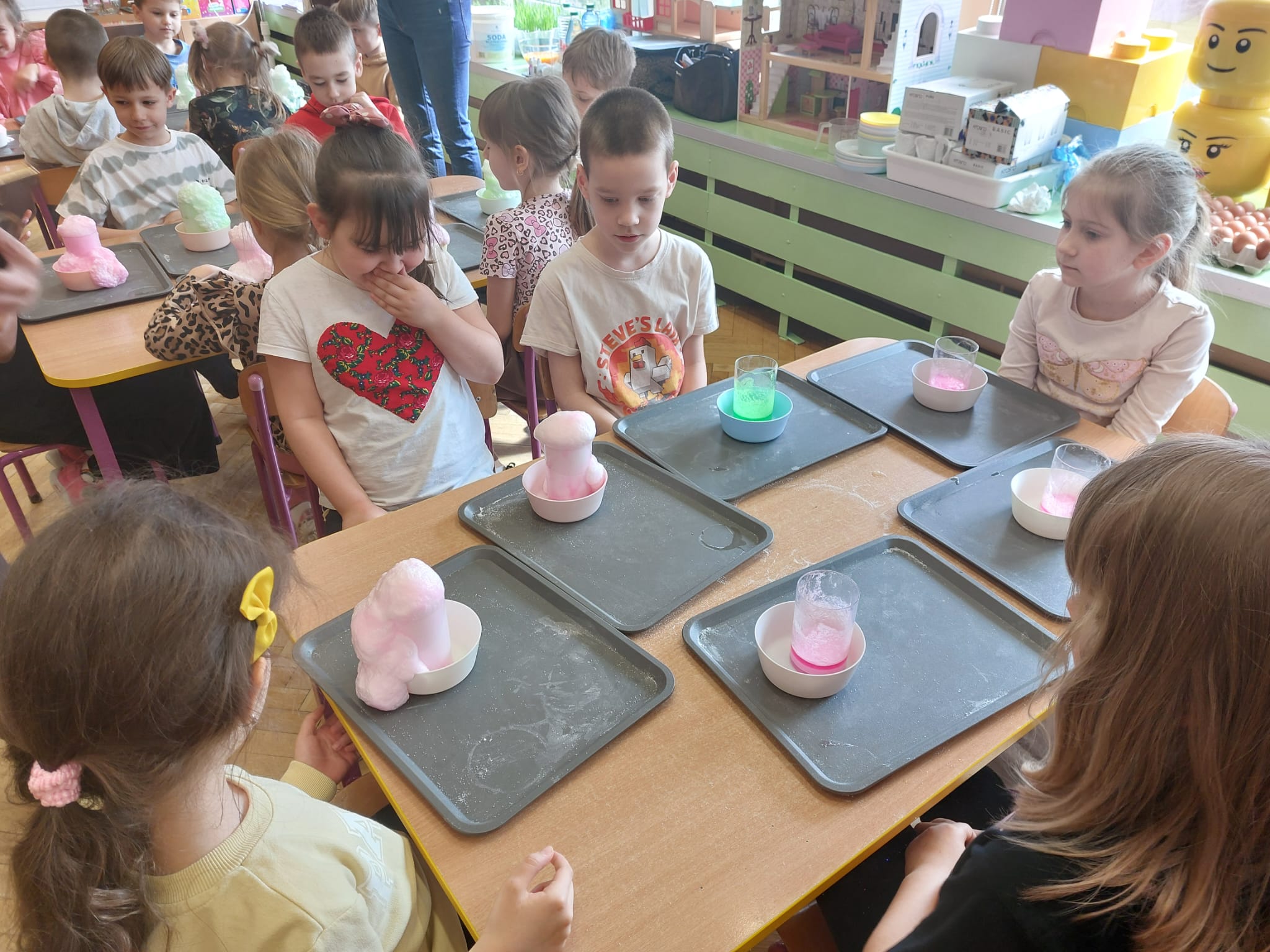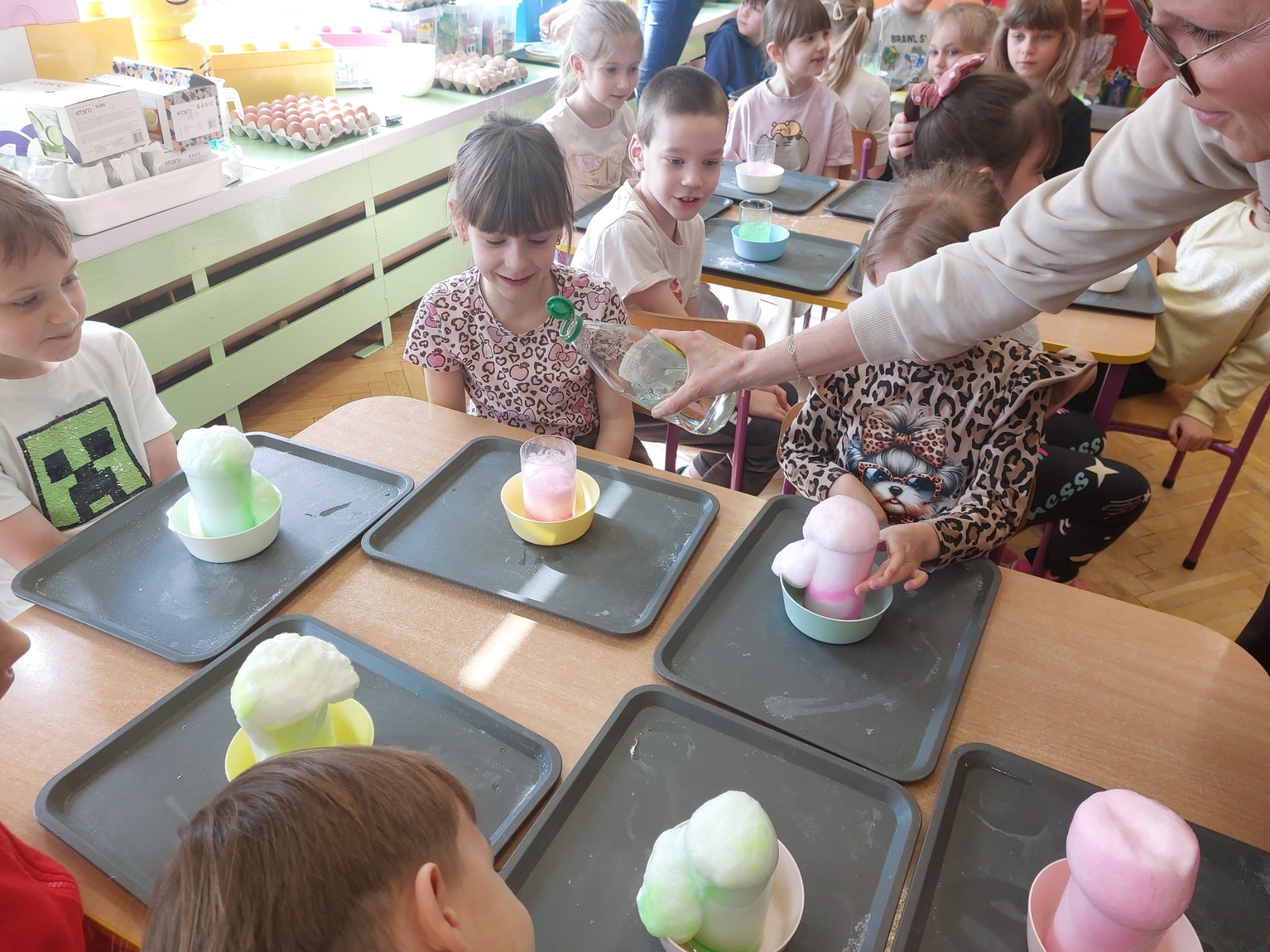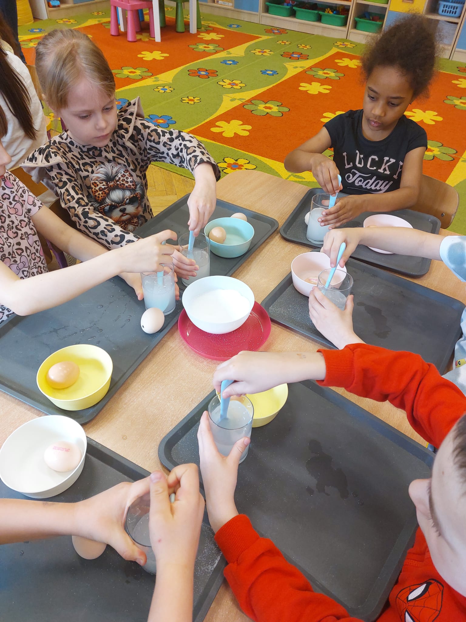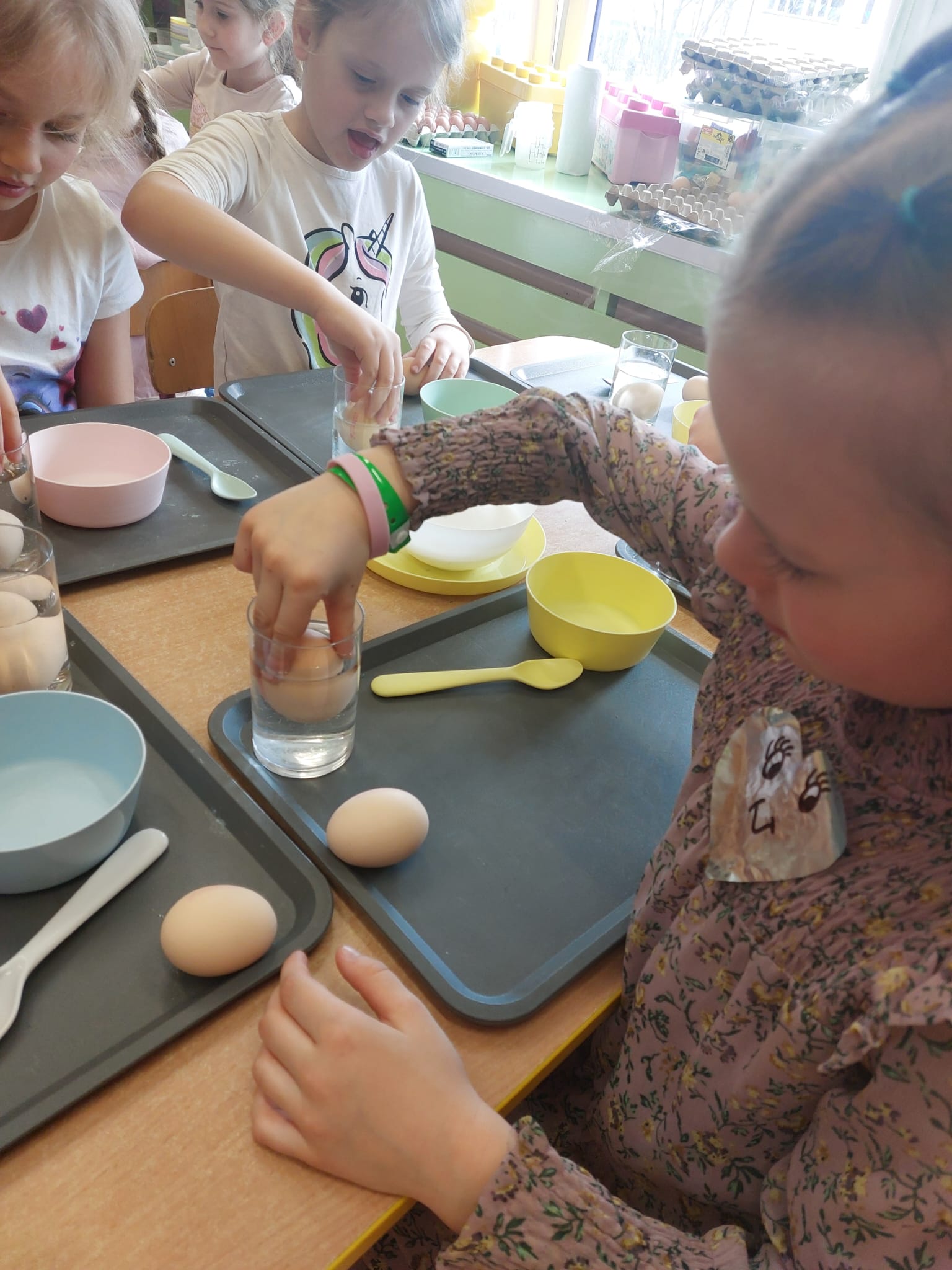 W grupie starszaków zapachniało nauką… i jajkiem!...Podczas warsztatów pt. „Eksperymenty z jajem” mali odkrywcy zamienili się w prawdziwych naukowców. Na pierwszy ogień poszło wielkie wyzwanie: czy jajko da się postawić na stole? Okazało się, że z odrobiną cierpliwości i sprytu – jak najbardziej! Radości było co niemiara, gdy pierwszym śmiałkom się udało. Potem zajrzeliśmy do wnętrza jajka… no, prawie! Zastanawialiśmy się, czy w środku jest powietrze – i szybko odkryliśmy, że tak! Mała komora powietrzna stała się wielką tajemnicą, którą dzieci rozwikłały z błyskiem w oku. Kolejna zagadka: jak odróżnić jajko surowe od ugotowanego? Kręciliśmy, obserwowaliśmy, testowaliśmy – i już każdy wiedział, że jajko potrafi zdradzić swoją tajemnicę… wystarczy je dobrze „rozkręcić”! A potem magia! Zwykła woda zamieniła się w… trampolinę dla jajka! Dzięki soli jajko zaczęło unosić się jak prawdziwy pływak. Dzieci patrzyły z zachwytem, jak nauka potrafi czarować. Na wielki finał – wulkan z białka jajka! Było pianowo, było efektownie i było… trochę śmiesznie. Eksperyment wywołał prawdziwą erupcję śmiechu! I nie mogło zabraknąć najważniejszego pytania: Co było pierwsze – jajko czy kura? Odpowiedzi było tyle, ile dzieci – a każda równie genialna. Bo w końcu w nauce nie chodzi tylko o odpowiedzi, ale o ciekawość, odwagę i radość odkrywania. To był dzień pełen eksperymentów, zdziwień i małych wielkich odkryć. A jedno wiemy na pewno – jajko to nie tylko śniadanie… to prawdziwa kopalnia naukowych przygód!. Po naukowych warsztatach dzieci zabrały się za dekorowanie „wielkanocnego zajączka” z wysianego wcześniej owsa do którego włożyły czekoladowe kolorowe jajeczka… WESOŁYCH ŚWIĄT !!!