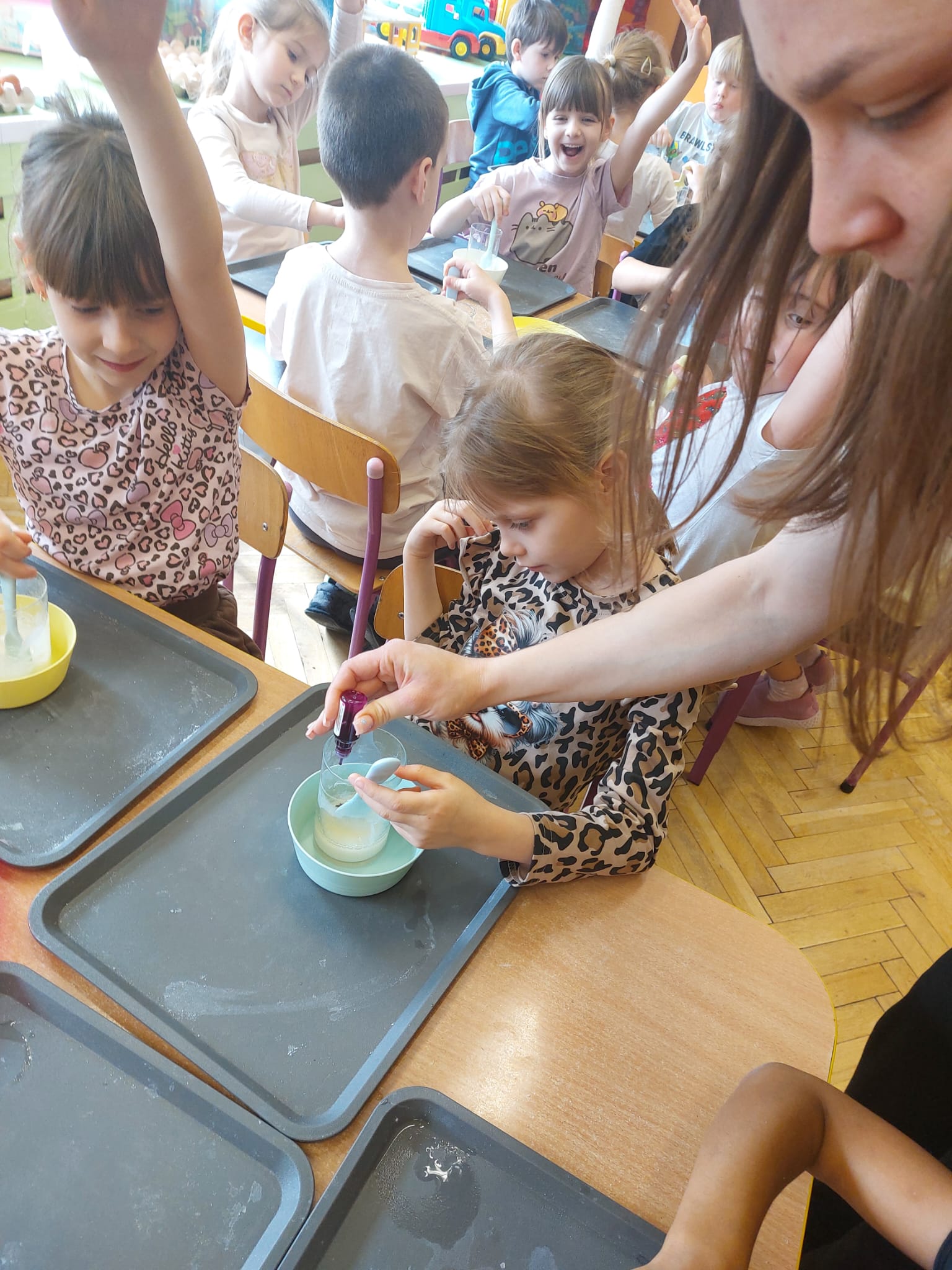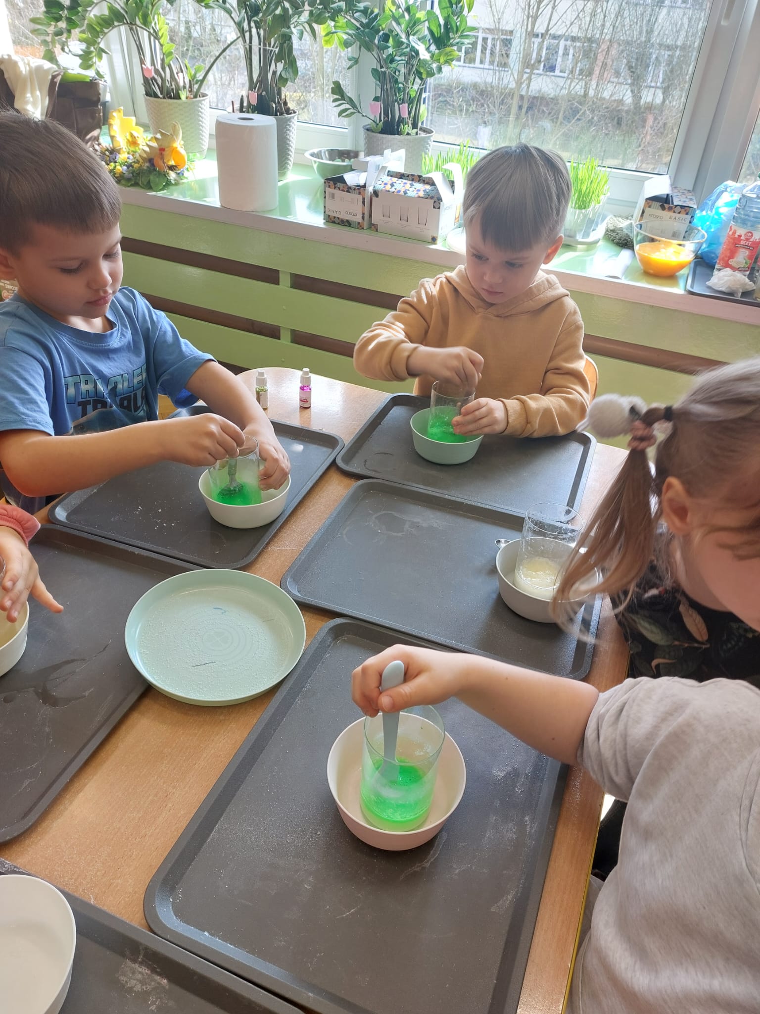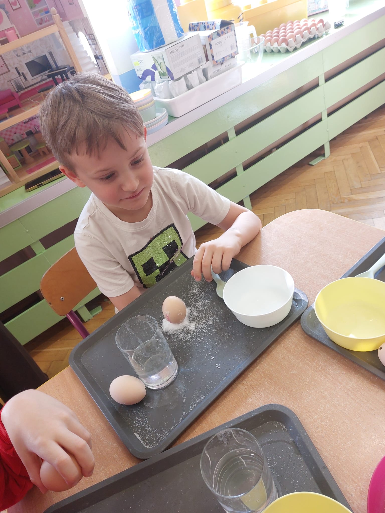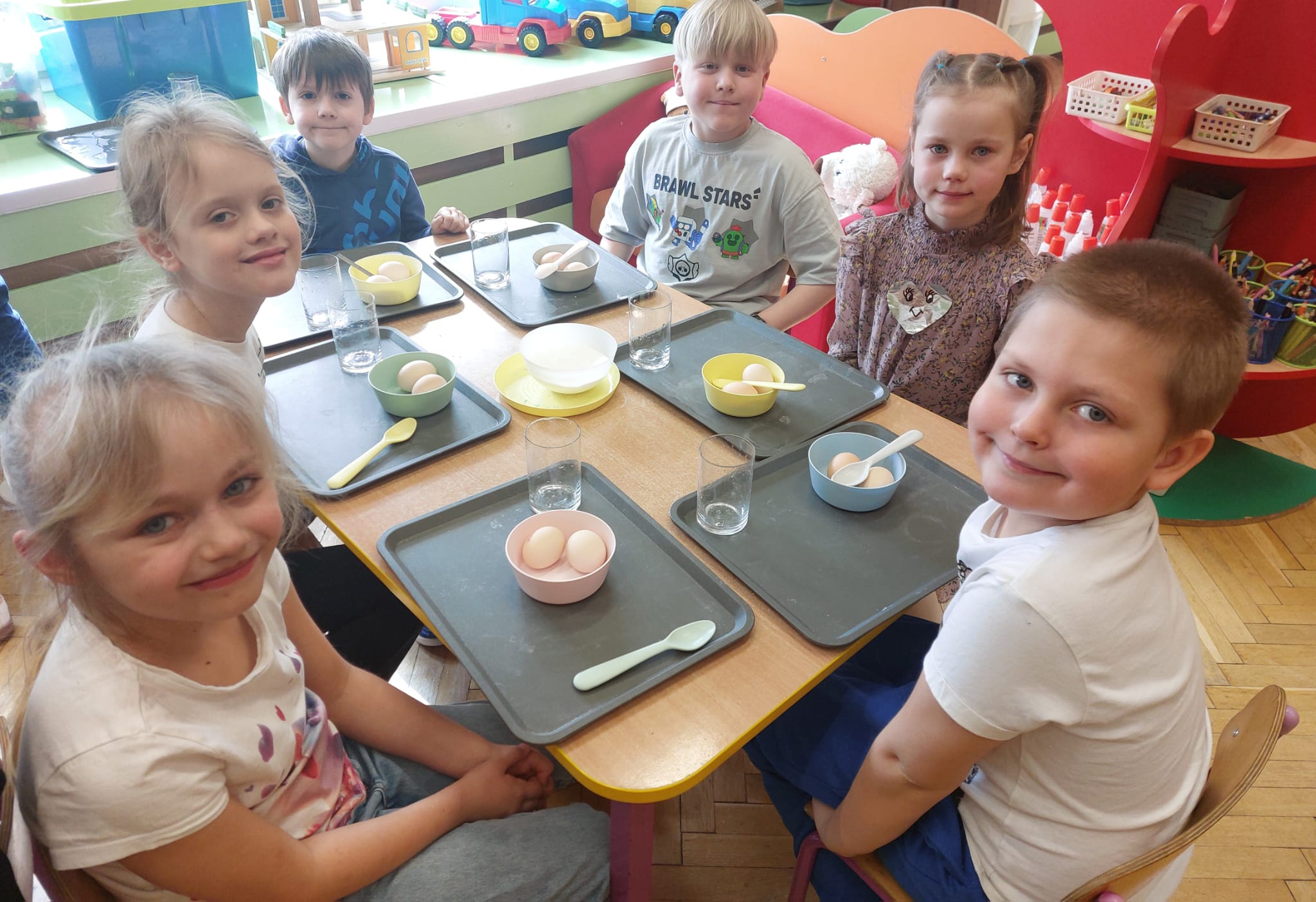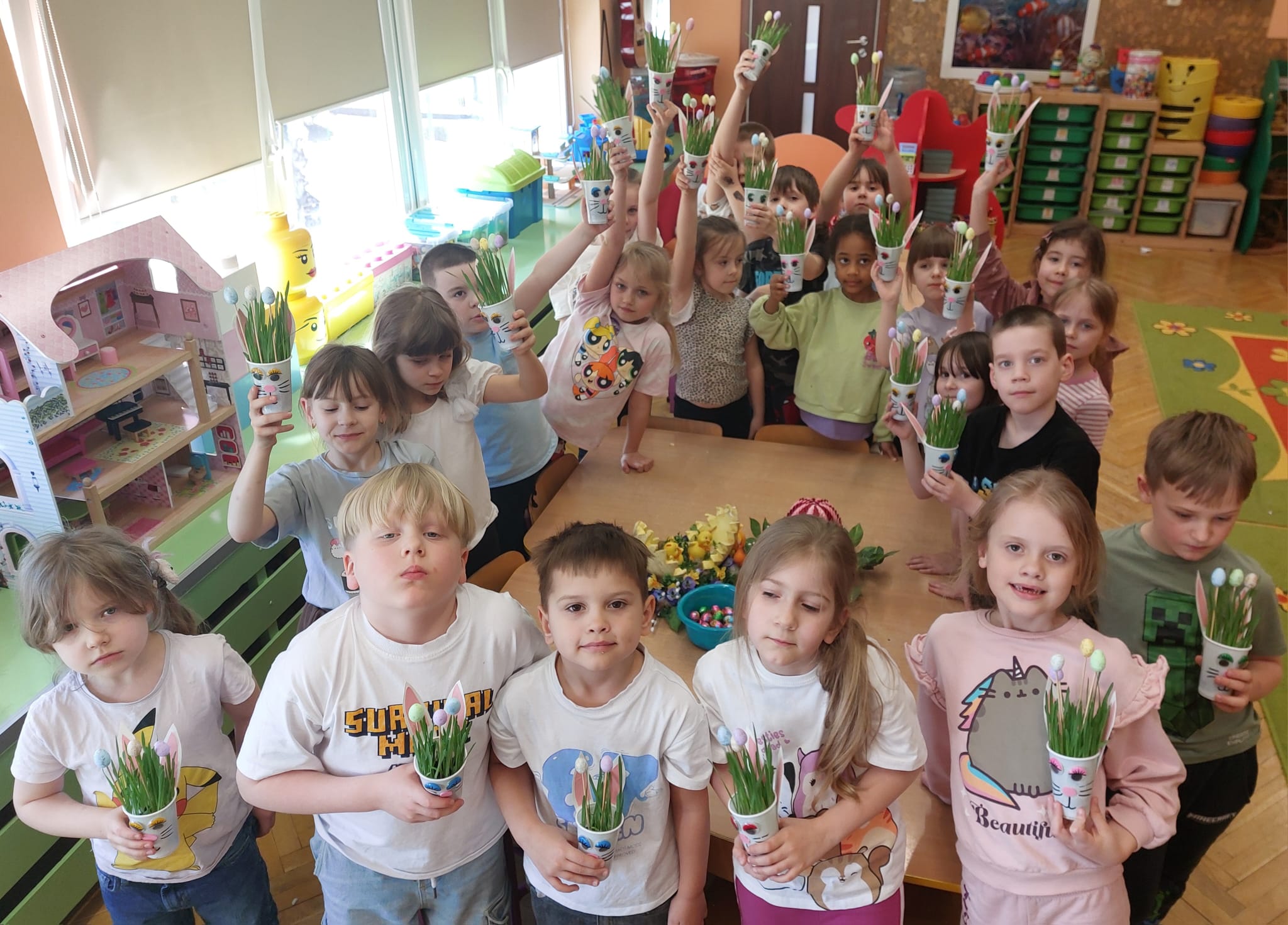 W grupie starszaków zapachniało nauką… i jajkiem!...Podczas warsztatów pt. „Eksperymenty z jajem” mali odkrywcy zamienili się w prawdziwych naukowców. Na pierwszy ogień poszło wielkie wyzwanie: czy jajko da się postawić na stole? Okazało się, że z odrobiną cierpliwości i sprytu – jak najbardziej! Radości było co niemiara, gdy pierwszym śmiałkom się udało. Potem zajrzeliśmy do wnętrza jajka… no, prawie! Zastanawialiśmy się, czy w środku jest powietrze – i szybko odkryliśmy, że tak! Mała komora powietrzna stała się wielką tajemnicą, którą dzieci rozwikłały z błyskiem w oku. Kolejna zagadka: jak odróżnić jajko surowe od ugotowanego? Kręciliśmy, obserwowaliśmy, testowaliśmy – i już każdy wiedział, że jajko potrafi zdradzić swoją tajemnicę… wystarczy je dobrze „rozkręcić”! A potem magia! Zwykła woda zamieniła się w… trampolinę dla jajka! Dzięki soli jajko zaczęło unosić się jak prawdziwy pływak. Dzieci patrzyły z zachwytem, jak nauka potrafi czarować. Na wielki finał – wulkan z białka jajka! Było pianowo, było efektownie i było… trochę śmiesznie. Eksperyment wywołał prawdziwą erupcję śmiechu! I nie mogło zabraknąć najważniejszego pytania: Co było pierwsze – jajko czy kura? Odpowiedzi było tyle, ile dzieci – a każda równie genialna. Bo w końcu w nauce nie chodzi tylko o odpowiedzi, ale o ciekawość, odwagę i radość odkrywania. To był dzień pełen eksperymentów, zdziwień i małych wielkich odkryć. A jedno wiemy na pewno – jajko to nie tylko śniadanie… to prawdziwa kopalnia naukowych przygód!. Po naukowych warsztatach dzieci zabrały się za dekorowanie „wielkanocnego zajączka” z wysianego wcześniej owsa do którego włożyły czekoladowe kolorowe jajeczka… WESOŁYCH ŚWIĄT !!!
