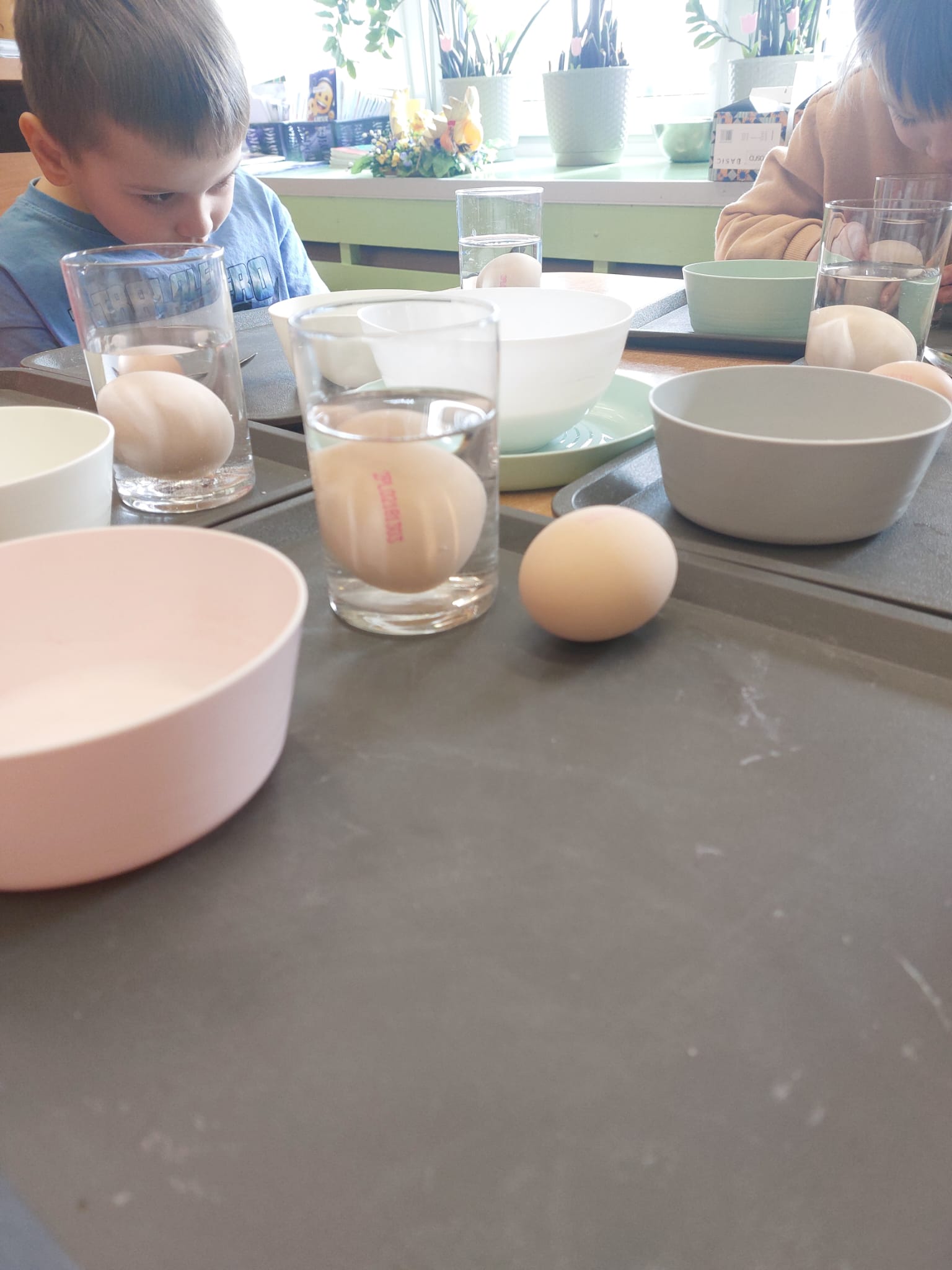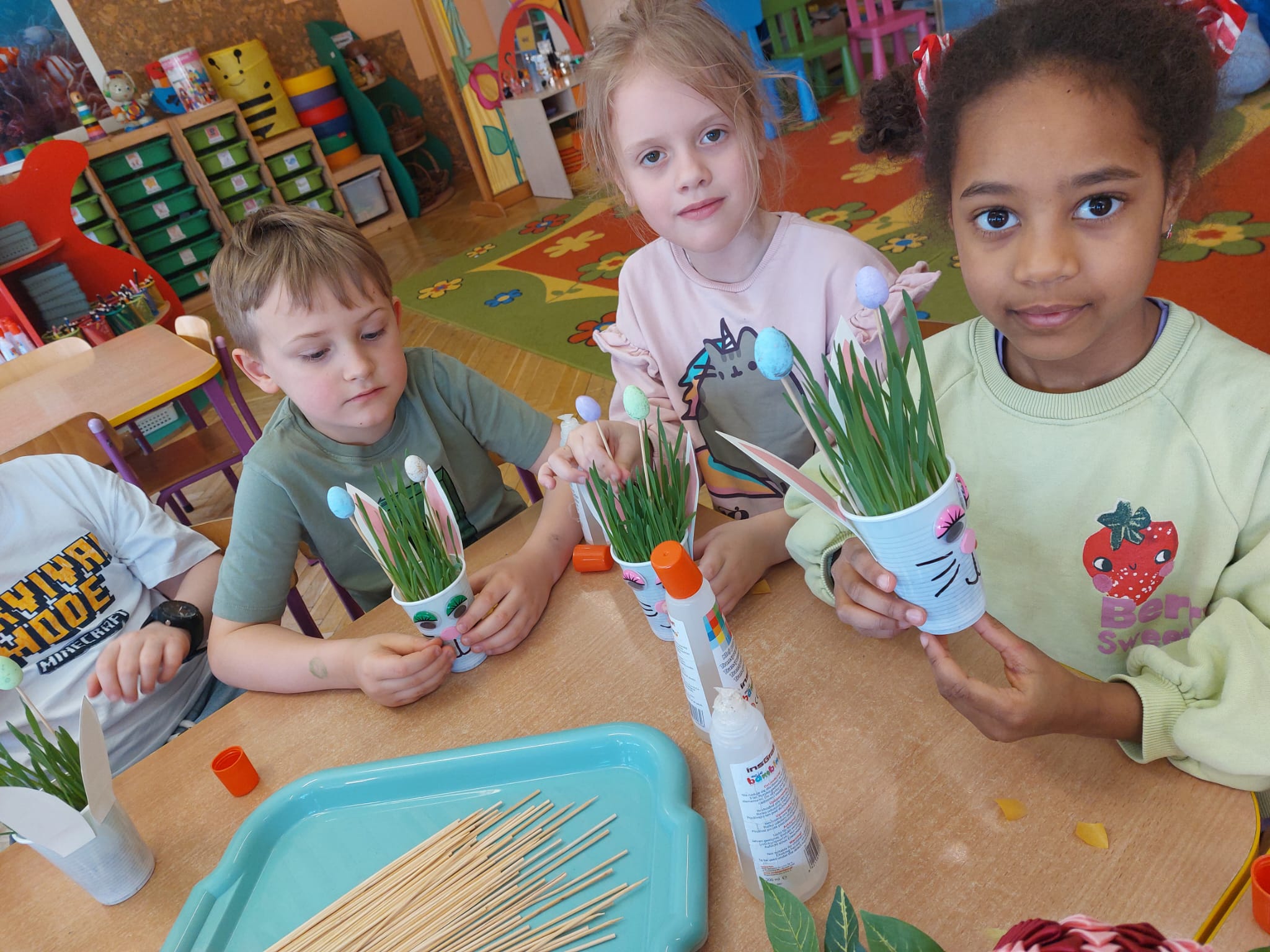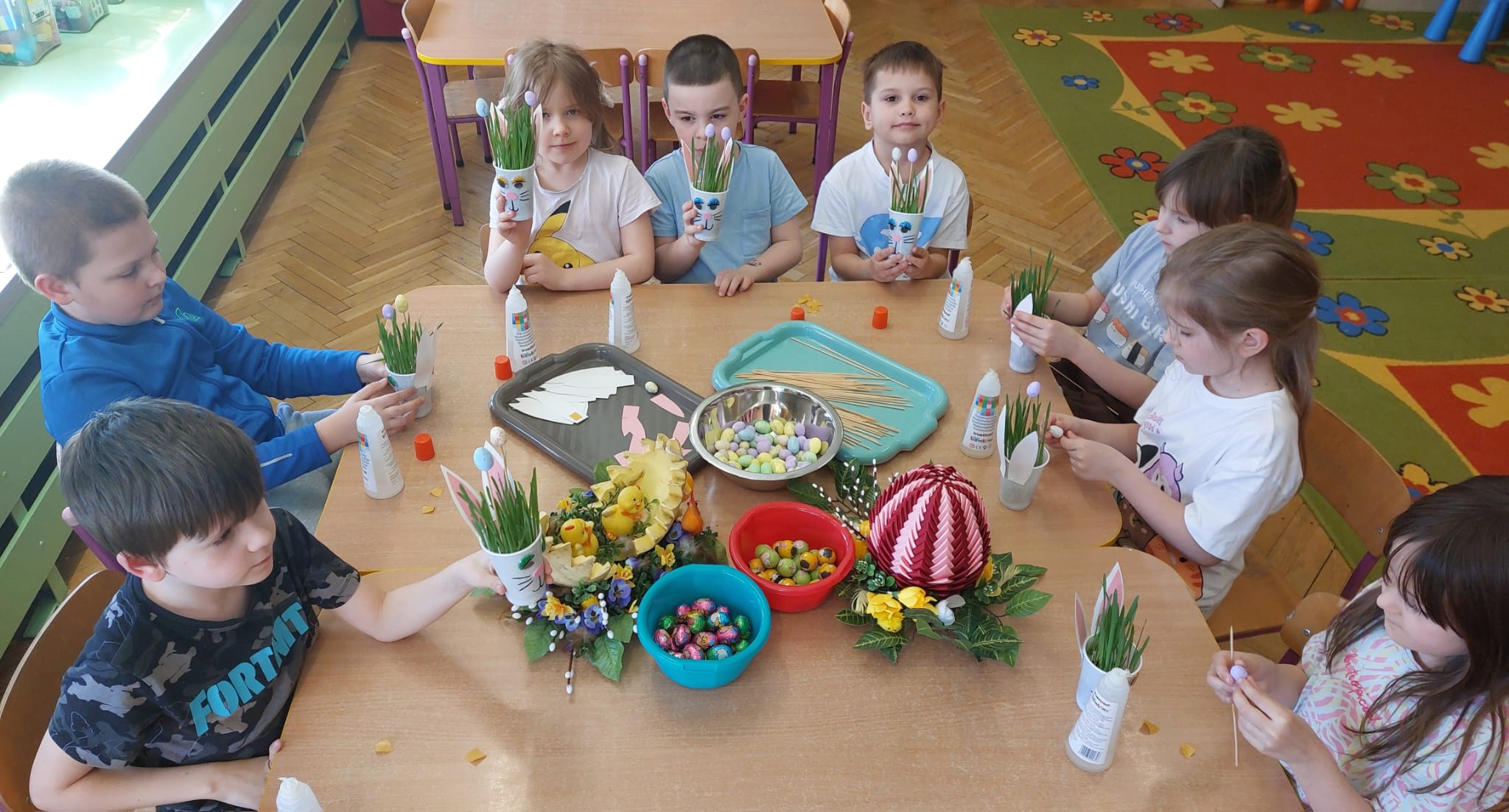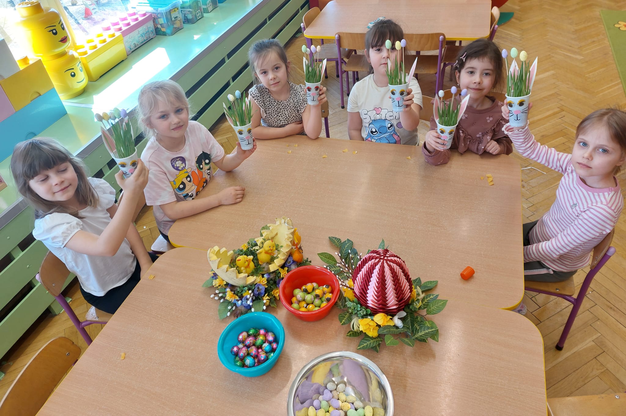 W grupie starszaków zapachniało nauką… i jajkiem!...Podczas warsztatów pt. „Eksperymenty z jajem” mali odkrywcy zamienili się w prawdziwych naukowców. Na pierwszy ogień poszło wielkie wyzwanie: czy jajko da się postawić na stole? Okazało się, że z odrobiną cierpliwości i sprytu – jak najbardziej! Radości było co niemiara, gdy pierwszym śmiałkom się udało. Potem zajrzeliśmy do wnętrza jajka… no, prawie! Zastanawialiśmy się, czy w środku jest powietrze – i szybko odkryliśmy, że tak! Mała komora powietrzna stała się wielką tajemnicą, którą dzieci rozwikłały z błyskiem w oku. Kolejna zagadka: jak odróżnić jajko surowe od ugotowanego? Kręciliśmy, obserwowaliśmy, testowaliśmy – i już każdy wiedział, że jajko potrafi zdradzić swoją tajemnicę… wystarczy je dobrze „rozkręcić”! A potem magia! Zwykła woda zamieniła się w… trampolinę dla jajka! Dzięki soli jajko zaczęło unosić się jak prawdziwy pływak. Dzieci patrzyły z zachwytem, jak nauka potrafi czarować. Na wielki finał – wulkan z białka jajka! Było pianowo, było efektownie i było… trochę śmiesznie. Eksperyment wywołał prawdziwą erupcję śmiechu! I nie mogło zabraknąć najważniejszego pytania: Co było pierwsze – jajko czy kura? Odpowiedzi było tyle, ile dzieci – a każda równie genialna. Bo w końcu w nauce nie chodzi tylko o odpowiedzi, ale o ciekawość, odwagę i radość odkrywania. To był dzień pełen eksperymentów, zdziwień i małych wielkich odkryć. A jedno wiemy na pewno – jajko to nie tylko śniadanie… to prawdziwa kopalnia naukowych przygód!. Po naukowych warsztatach dzieci zabrały się za dekorowanie „wielkanocnego zajączka” z wysianego wcześniej owsa do którego włożyły czekoladowe kolorowe jajeczka… WESOŁYCH ŚWIĄT !!!