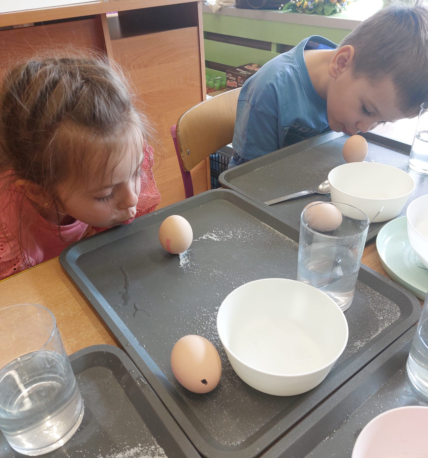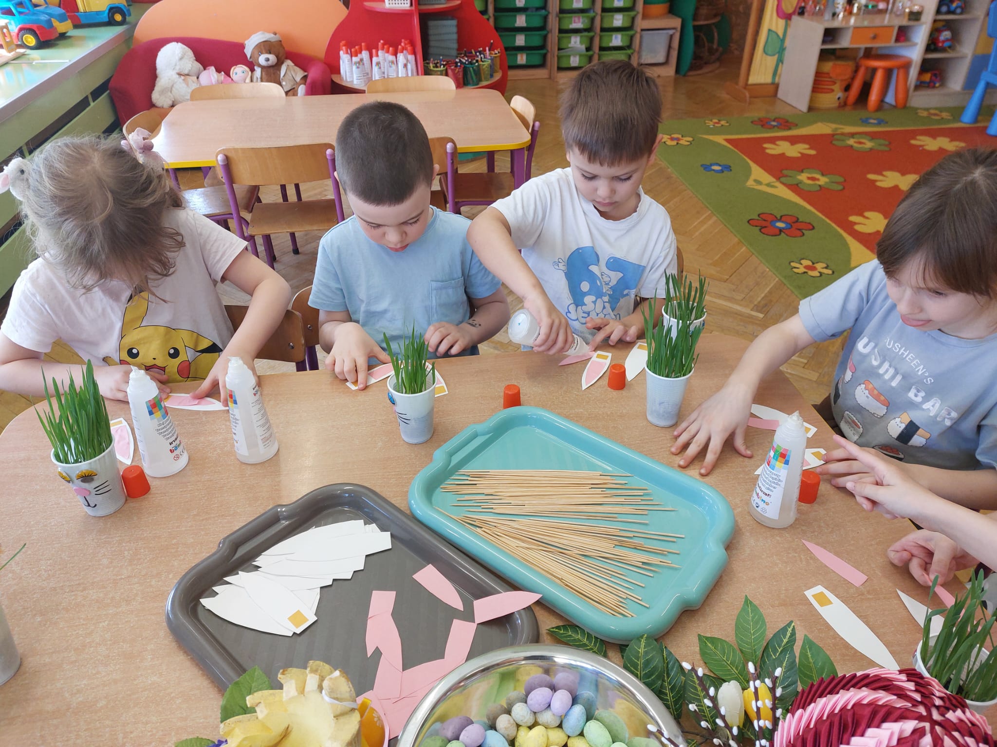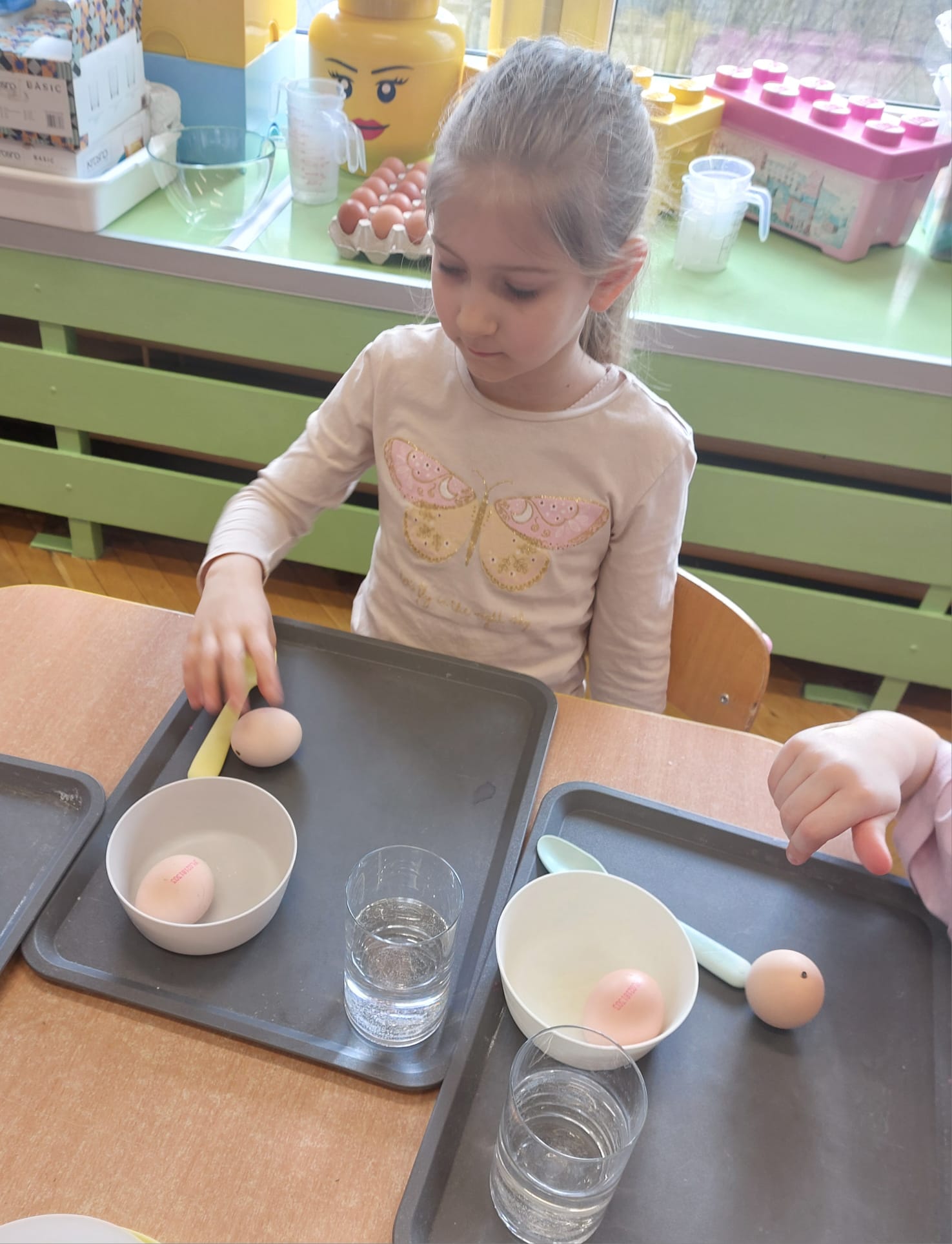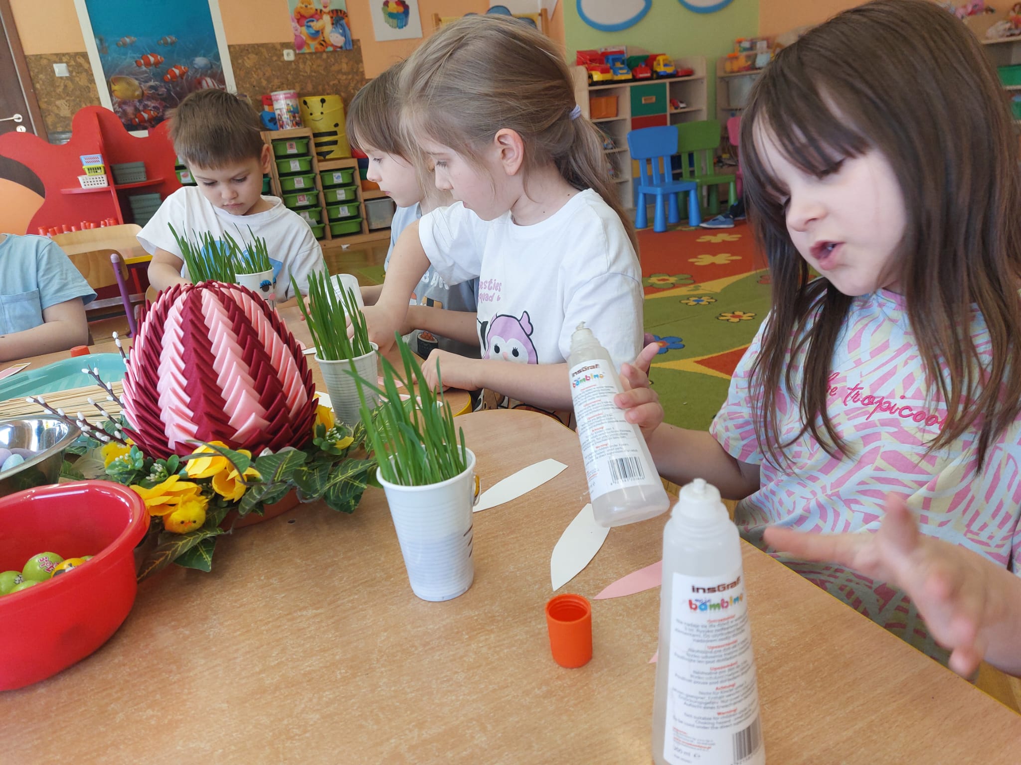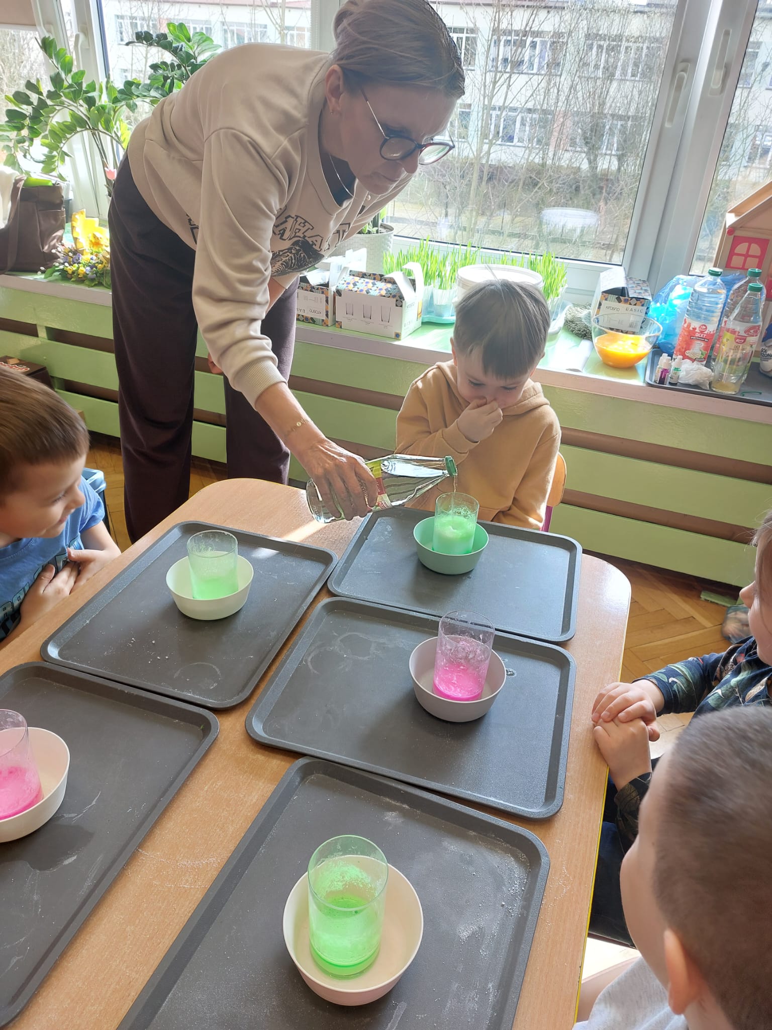 W grupie starszaków zapachniało nauką… i jajkiem!...Podczas warsztatów pt. „Eksperymenty z jajem” mali odkrywcy zamienili się w prawdziwych naukowców. Na pierwszy ogień poszło wielkie wyzwanie: czy jajko da się postawić na stole? Okazało się, że z odrobiną cierpliwości i sprytu – jak najbardziej! Radości było co niemiara, gdy pierwszym śmiałkom się udało. Potem zajrzeliśmy do wnętrza jajka… no, prawie! Zastanawialiśmy się, czy w środku jest powietrze – i szybko odkryliśmy, że tak! Mała komora powietrzna stała się wielką tajemnicą, którą dzieci rozwikłały z błyskiem w oku. Kolejna zagadka: jak odróżnić jajko surowe od ugotowanego? Kręciliśmy, obserwowaliśmy, testowaliśmy – i już każdy wiedział, że jajko potrafi zdradzić swoją tajemnicę… wystarczy je dobrze „rozkręcić”! A potem magia! Zwykła woda zamieniła się w… trampolinę dla jajka! Dzięki soli jajko zaczęło unosić się jak prawdziwy pływak. Dzieci patrzyły z zachwytem, jak nauka potrafi czarować. Na wielki finał – wulkan z białka jajka! Było pianowo, było efektownie i było… trochę śmiesznie. Eksperyment wywołał prawdziwą erupcję śmiechu! I nie mogło zabraknąć najważniejszego pytania: Co było pierwsze – jajko czy kura? Odpowiedzi było tyle, ile dzieci – a każda równie genialna. Bo w końcu w nauce nie chodzi tylko o odpowiedzi, ale o ciekawość, odwagę i radość odkrywania. To był dzień pełen eksperymentów, zdziwień i małych wielkich odkryć. A jedno wiemy na pewno – jajko to nie tylko śniadanie… to prawdziwa kopalnia naukowych przygód!. Po naukowych warsztatach dzieci zabrały się za dekorowanie „wielkanocnego zajączka” z wysianego wcześniej owsa do którego włożyły czekoladowe kolorowe jajeczka… WESOŁYCH ŚWIĄT !!!