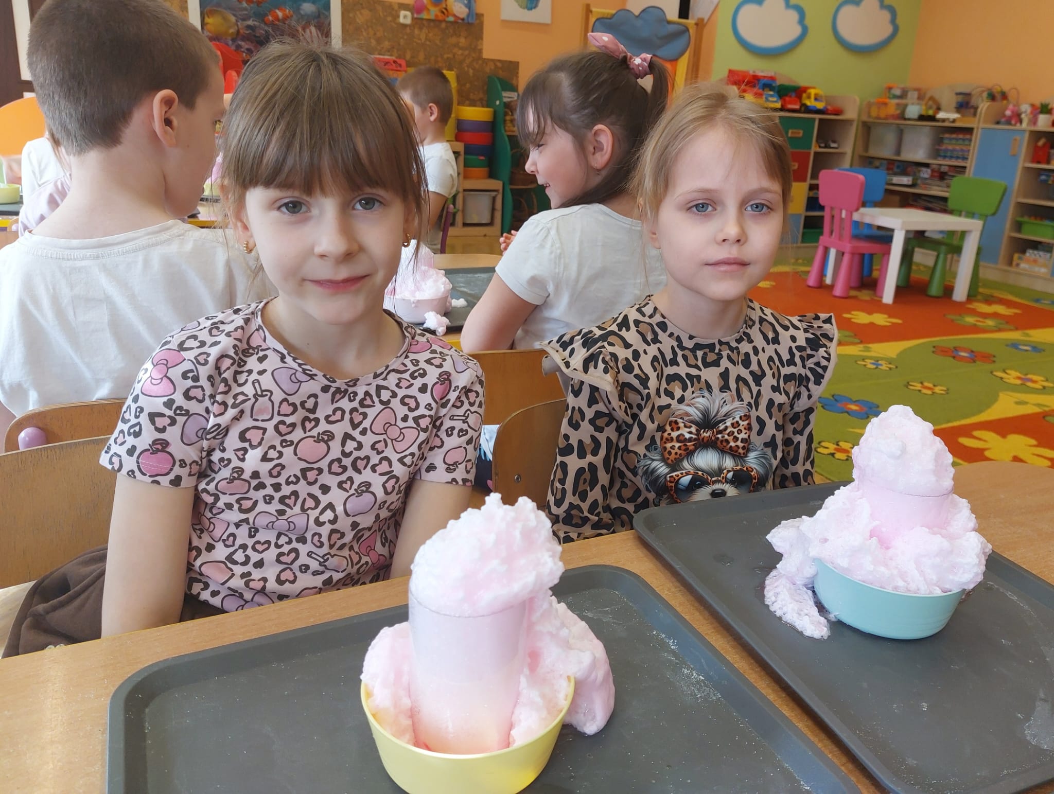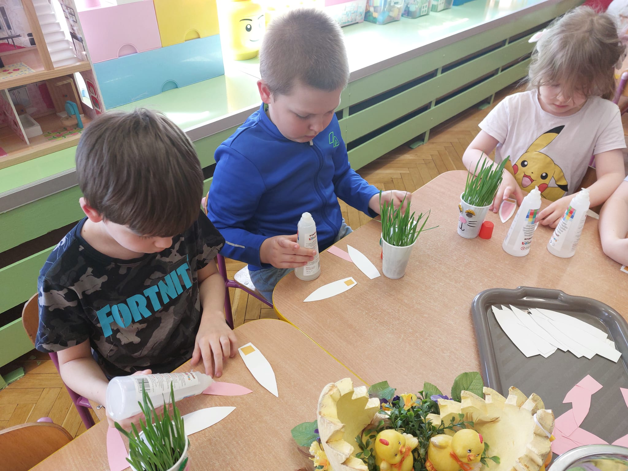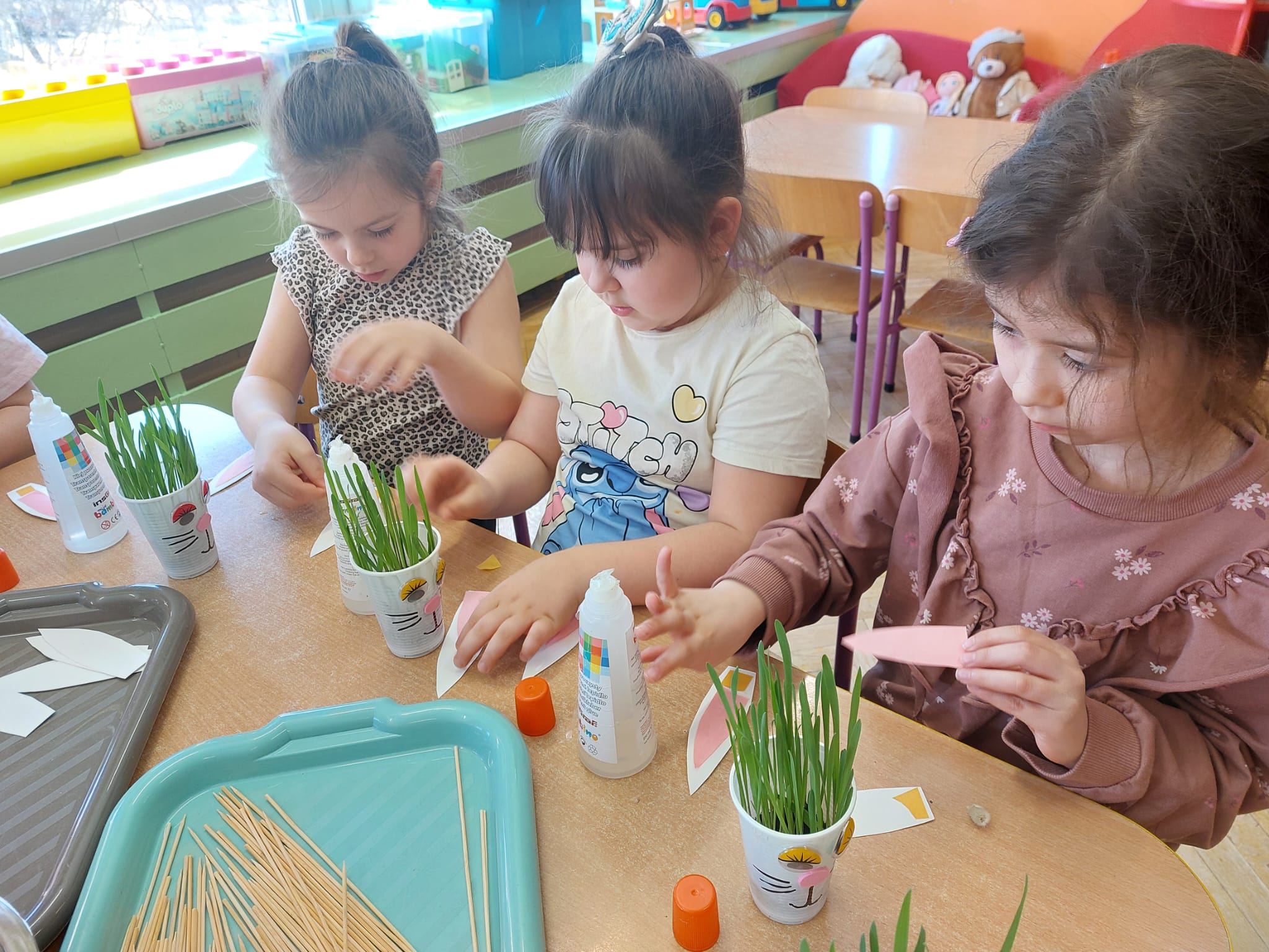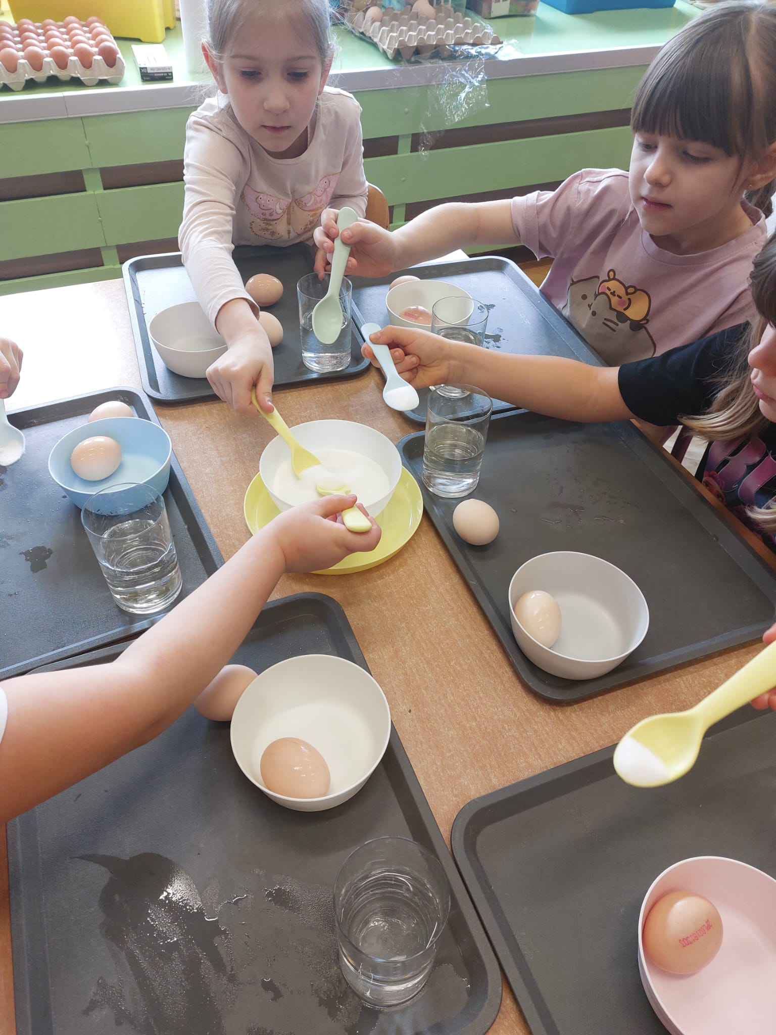 W grupie starszaków zapachniało nauką… i jajkiem!...Podczas warsztatów pt. „Eksperymenty z jajem” mali odkrywcy zamienili się w prawdziwych naukowców. Na pierwszy ogień poszło wielkie wyzwanie: czy jajko da się postawić na stole? Okazało się, że z odrobiną cierpliwości i sprytu – jak najbardziej! Radości było co niemiara, gdy pierwszym śmiałkom się udało. Potem zajrzeliśmy do wnętrza jajka… no, prawie! Zastanawialiśmy się, czy w środku jest powietrze – i szybko odkryliśmy, że tak! Mała komora powietrzna stała się wielką tajemnicą, którą dzieci rozwikłały z błyskiem w oku. Kolejna zagadka: jak odróżnić jajko surowe od ugotowanego? Kręciliśmy, obserwowaliśmy, testowaliśmy – i już każdy wiedział, że jajko potrafi zdradzić swoją tajemnicę… wystarczy je dobrze „rozkręcić”! A potem magia! Zwykła woda zamieniła się w… trampolinę dla jajka! Dzięki soli jajko zaczęło unosić się jak prawdziwy pływak. Dzieci patrzyły z zachwytem, jak nauka potrafi czarować. Na wielki finał – wulkan z białka jajka! Było pianowo, było efektownie i było… trochę śmiesznie. Eksperyment wywołał prawdziwą erupcję śmiechu! I nie mogło zabraknąć najważniejszego pytania: Co było pierwsze – jajko czy kura? Odpowiedzi było tyle, ile dzieci – a każda równie genialna. Bo w końcu w nauce nie chodzi tylko o odpowiedzi, ale o ciekawość, odwagę i radość odkrywania. To był dzień pełen eksperymentów, zdziwień i małych wielkich odkryć. A jedno wiemy na pewno – jajko to nie tylko śniadanie… to prawdziwa kopalnia naukowych przygód!. Po naukowych warsztatach dzieci zabrały się za dekorowanie „wielkanocnego zajączka” z wysianego wcześniej owsa do którego włożyły czekoladowe kolorowe jajeczka… WESOŁYCH ŚWIĄT !!!