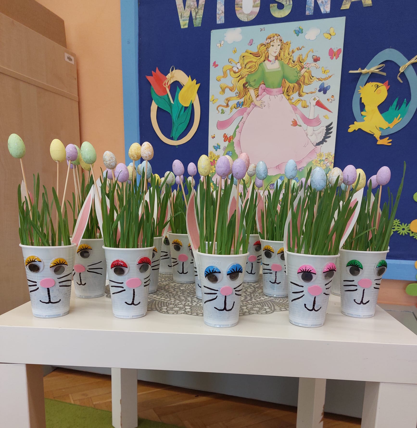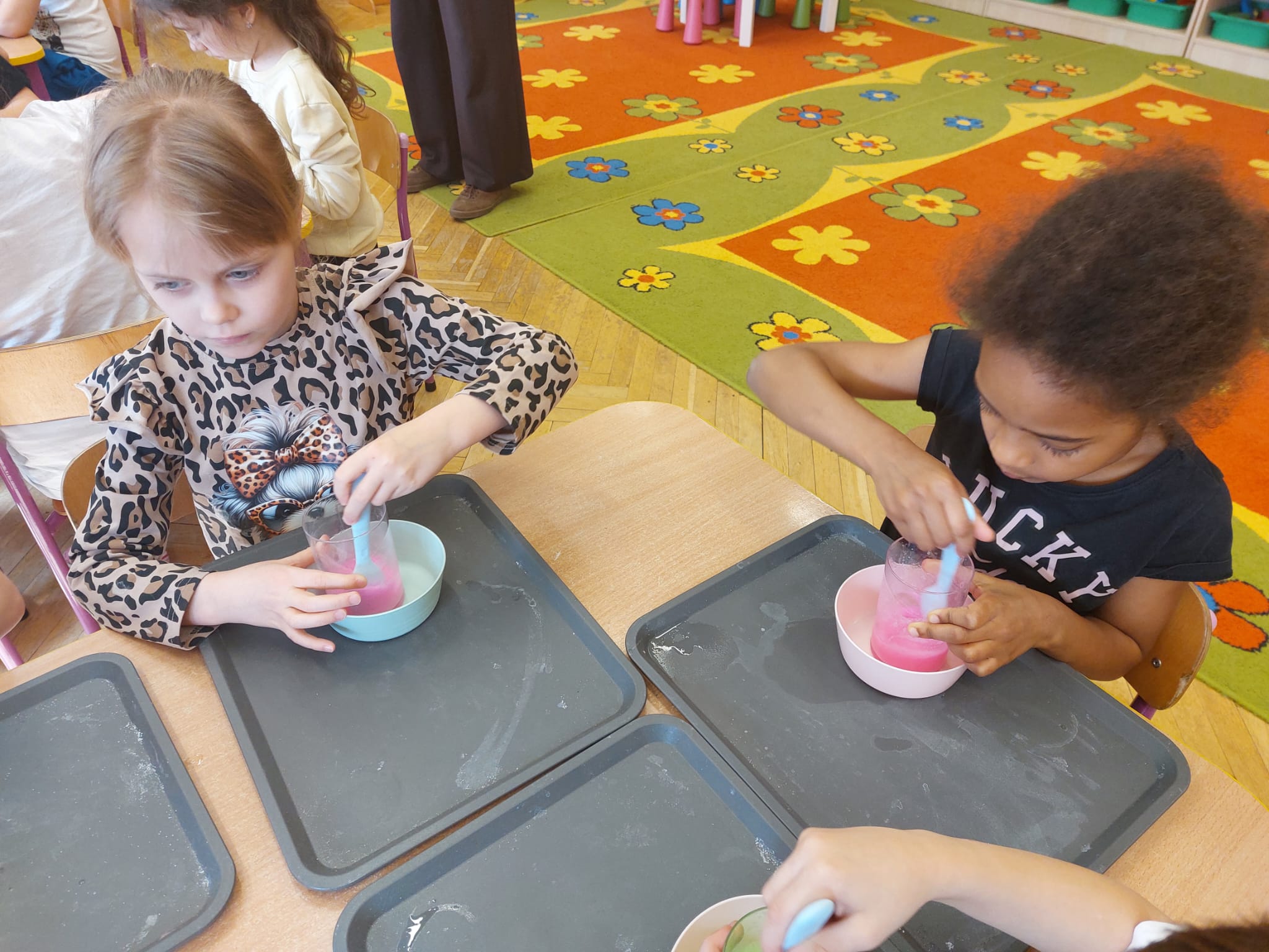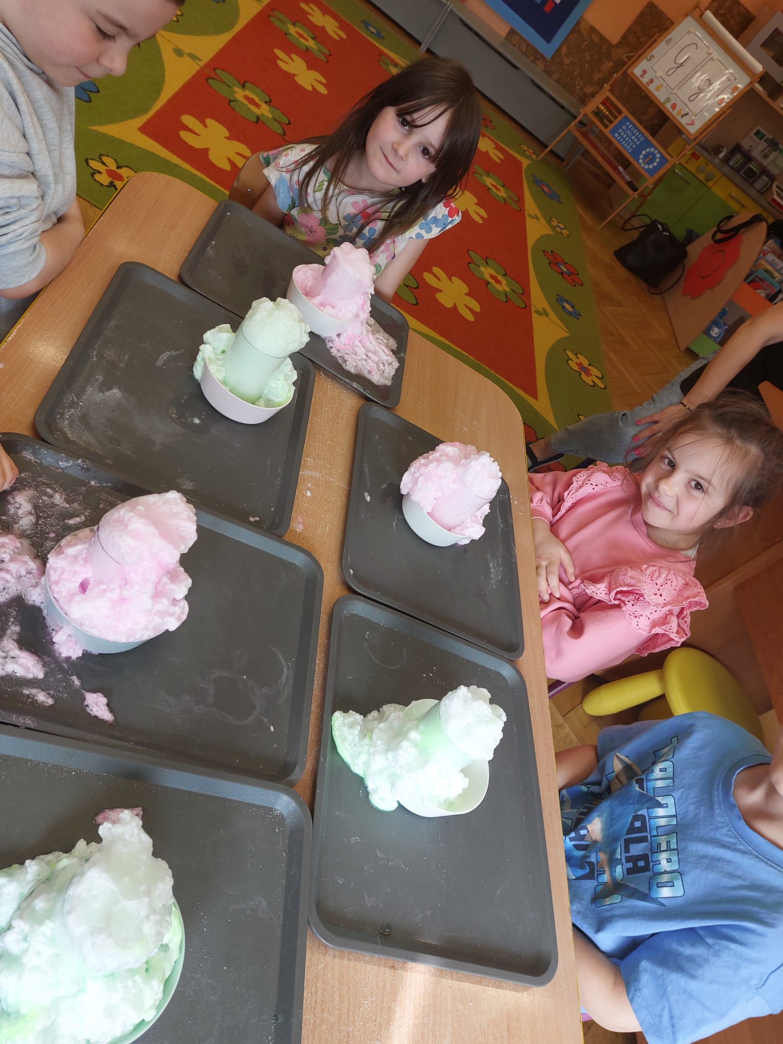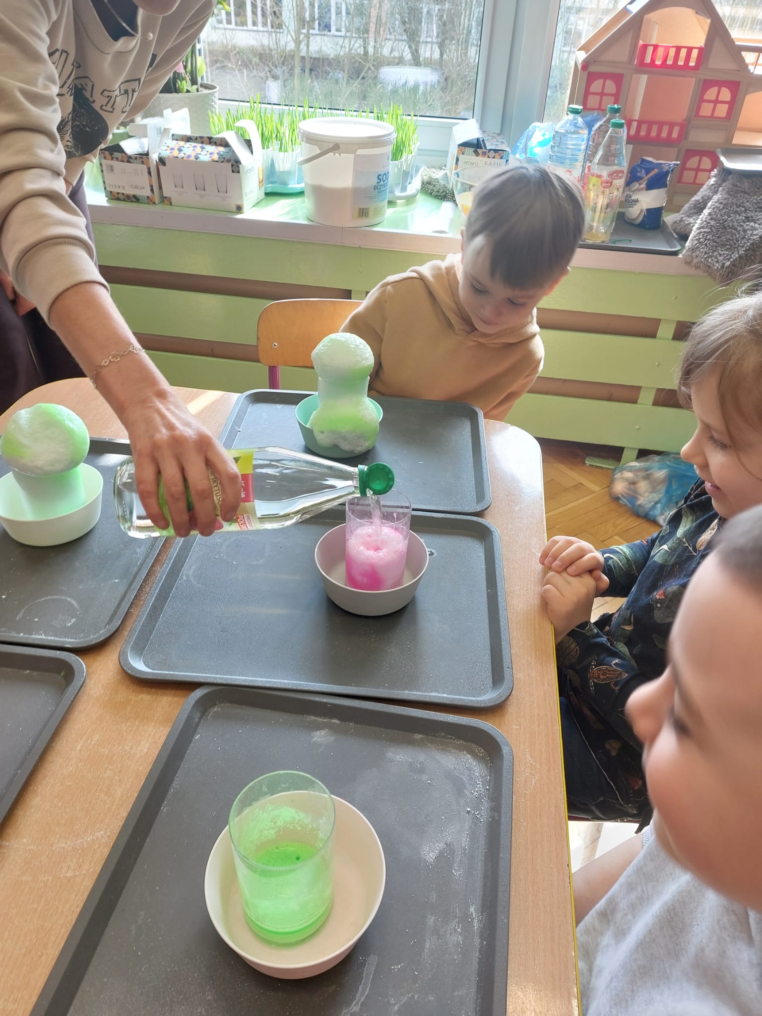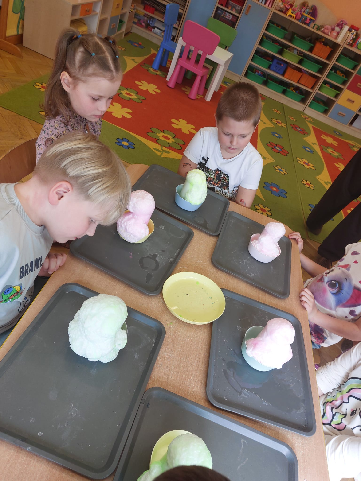 W grupie starszaków zapachniało nauką… i jajkiem!...Podczas warsztatów pt. „Eksperymenty z jajem” mali odkrywcy zamienili się w prawdziwych naukowców. Na pierwszy ogień poszło wielkie wyzwanie: czy jajko da się postawić na stole? Okazało się, że z odrobiną cierpliwości i sprytu – jak najbardziej! Radości było co niemiara, gdy pierwszym śmiałkom się udało. Potem zajrzeliśmy do wnętrza jajka… no, prawie! Zastanawialiśmy się, czy w środku jest powietrze – i szybko odkryliśmy, że tak! Mała komora powietrzna stała się wielką tajemnicą, którą dzieci rozwikłały z błyskiem w oku. Kolejna zagadka: jak odróżnić jajko surowe od ugotowanego? Kręciliśmy, obserwowaliśmy, testowaliśmy – i już każdy wiedział, że jajko potrafi zdradzić swoją tajemnicę… wystarczy je dobrze „rozkręcić”! A potem magia! Zwykła woda zamieniła się w… trampolinę dla jajka! Dzięki soli jajko zaczęło unosić się jak prawdziwy pływak. Dzieci patrzyły z zachwytem, jak nauka potrafi czarować. Na wielki finał – wulkan z białka jajka! Było pianowo, było efektownie i było… trochę śmiesznie. Eksperyment wywołał prawdziwą erupcję śmiechu! I nie mogło zabraknąć najważniejszego pytania: Co było pierwsze – jajko czy kura? Odpowiedzi było tyle, ile dzieci – a każda równie genialna. Bo w końcu w nauce nie chodzi tylko o odpowiedzi, ale o ciekawość, odwagę i radość odkrywania. To był dzień pełen eksperymentów, zdziwień i małych wielkich odkryć. A jedno wiemy na pewno – jajko to nie tylko śniadanie… to prawdziwa kopalnia naukowych przygód!. Po naukowych warsztatach dzieci zabrały się za dekorowanie „wielkanocnego zajączka” z wysianego wcześniej owsa do którego włożyły czekoladowe kolorowe jajeczka… WESOŁYCH ŚWIĄT !!!