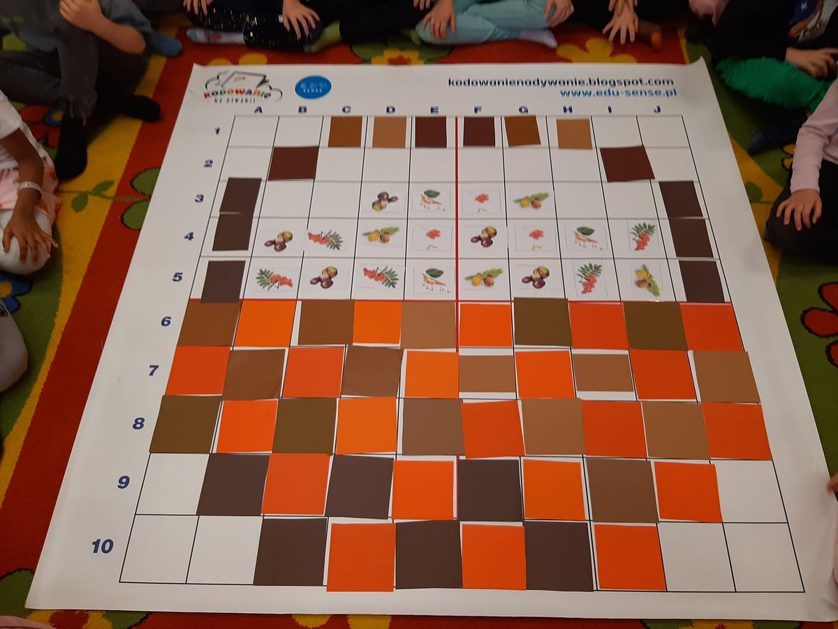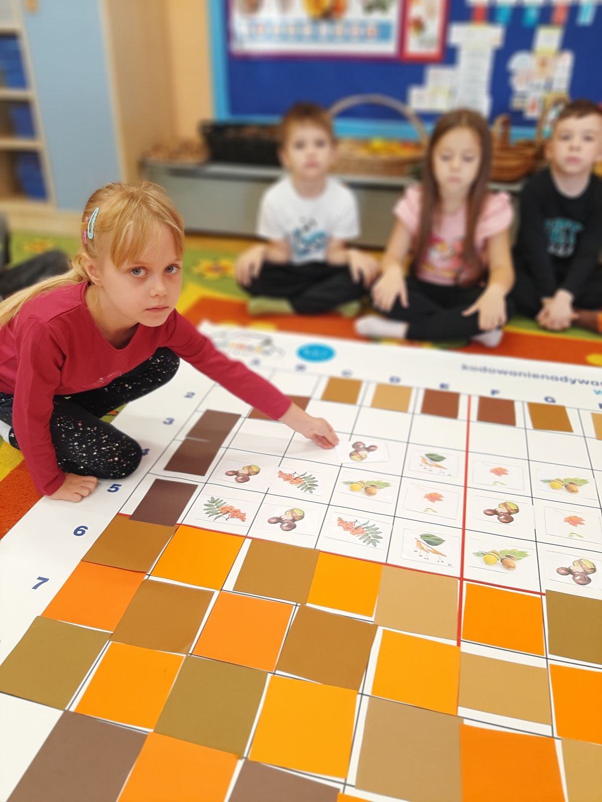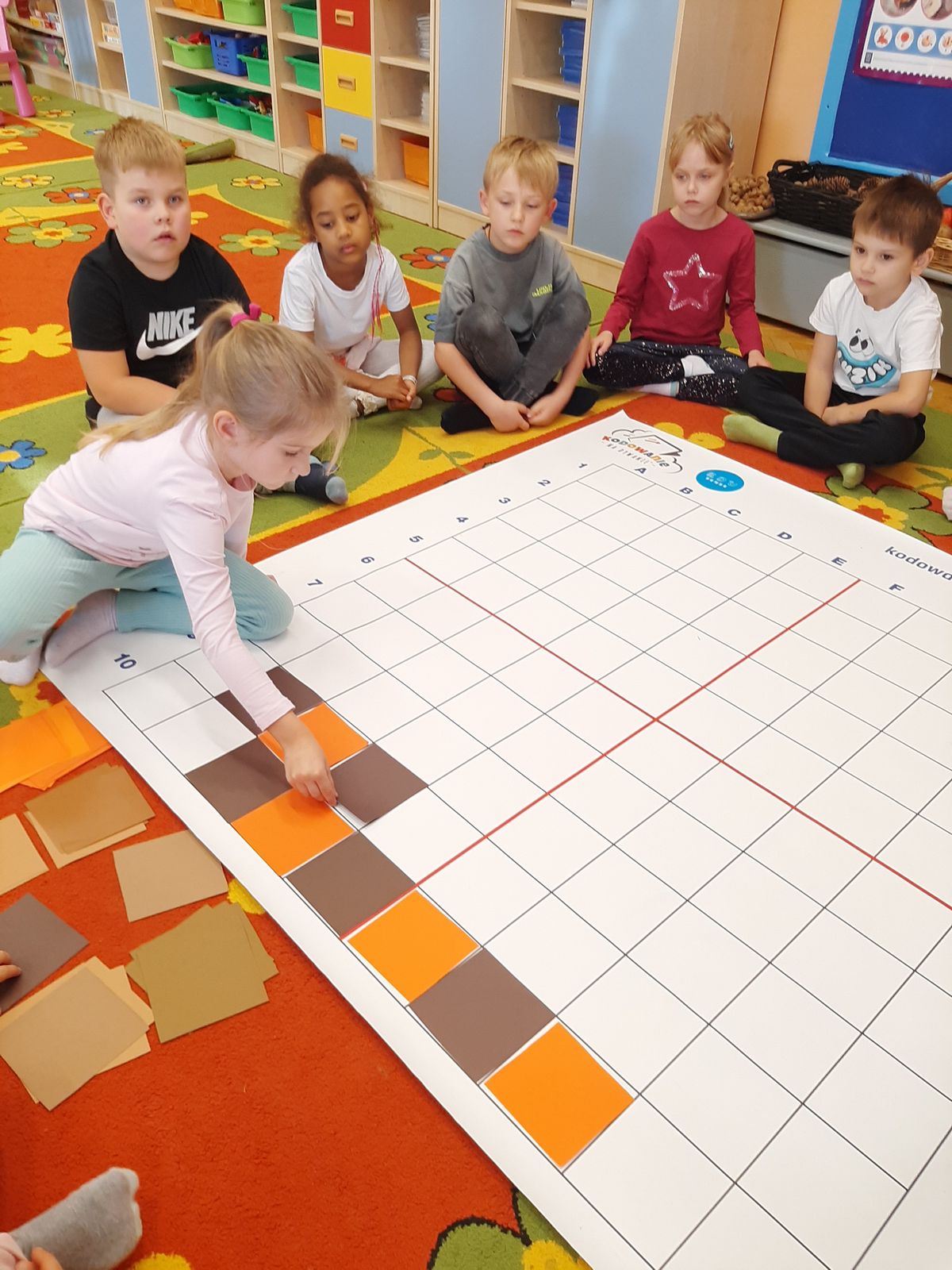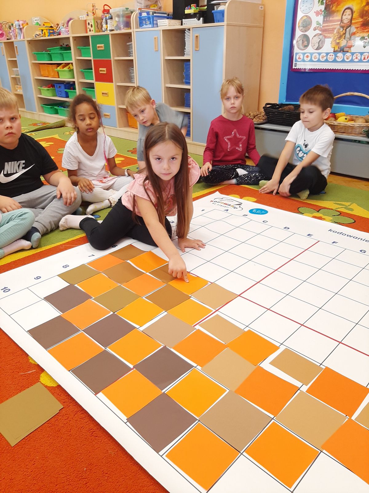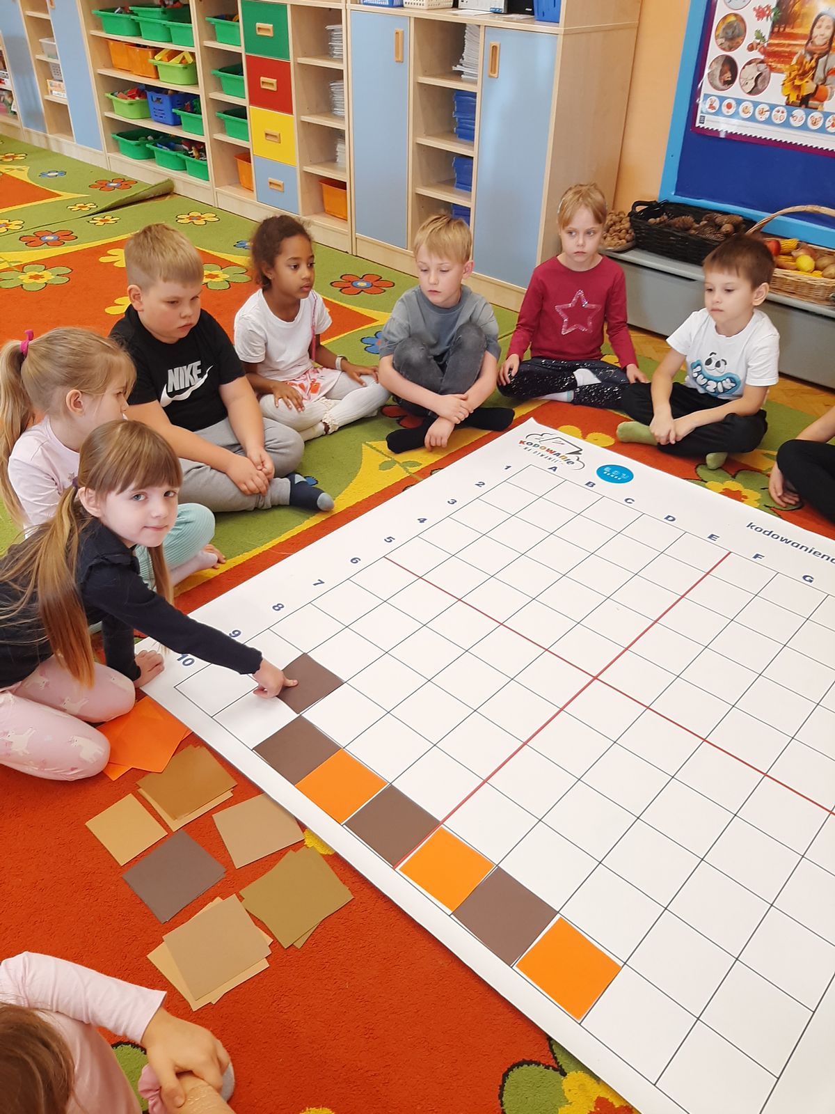 W tym tygodniu dzieci z grupy V uczestniczyły w europejskiej inicjatywie promującej programowanie „Code Week”. Tematem przewodnim zajęć z kodowania była Jesień. Dzieci bawiły się w kodowanie poprzez odczytywanie współrzędnych poszczególnych pól i układanie kartoników w odpowiednich kolorach. Efektem końcowym było ułożenie kosza na jesienne dary. Zabawy z wykorzystaniem maty, kolorowych obrazków , świetnie sprawdzają się przy wszelkiego rodzaju zabawach rozwijających logiczne myślenie.