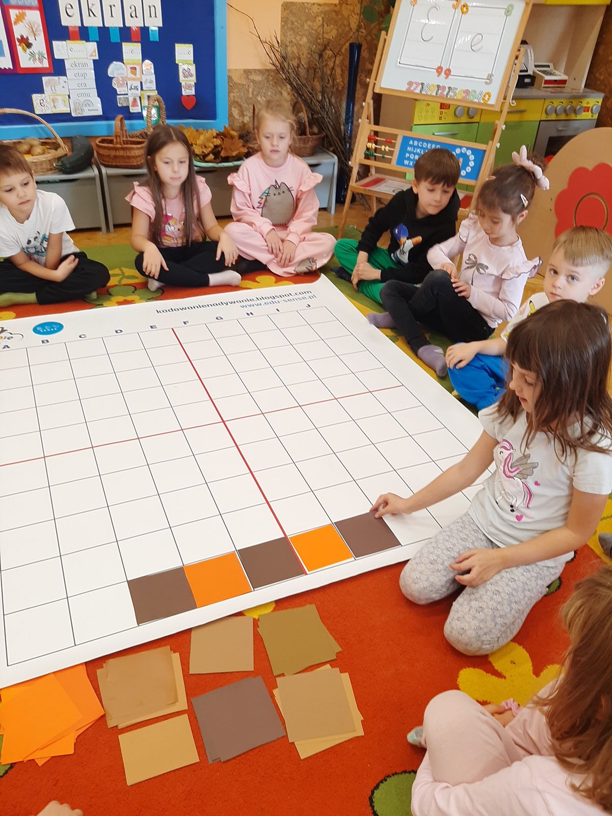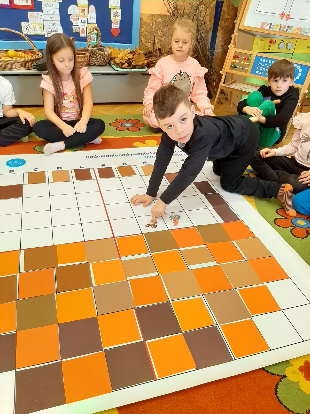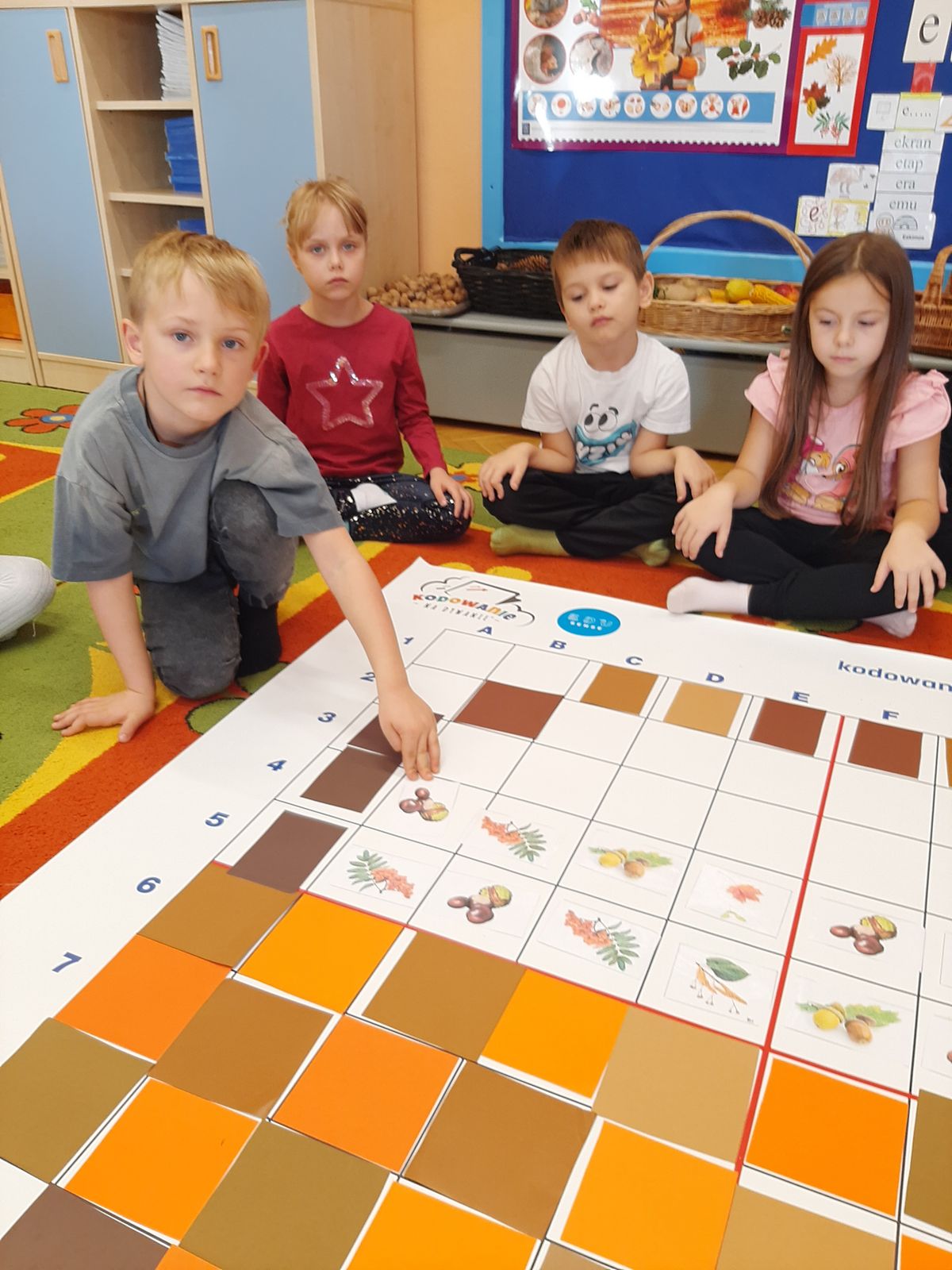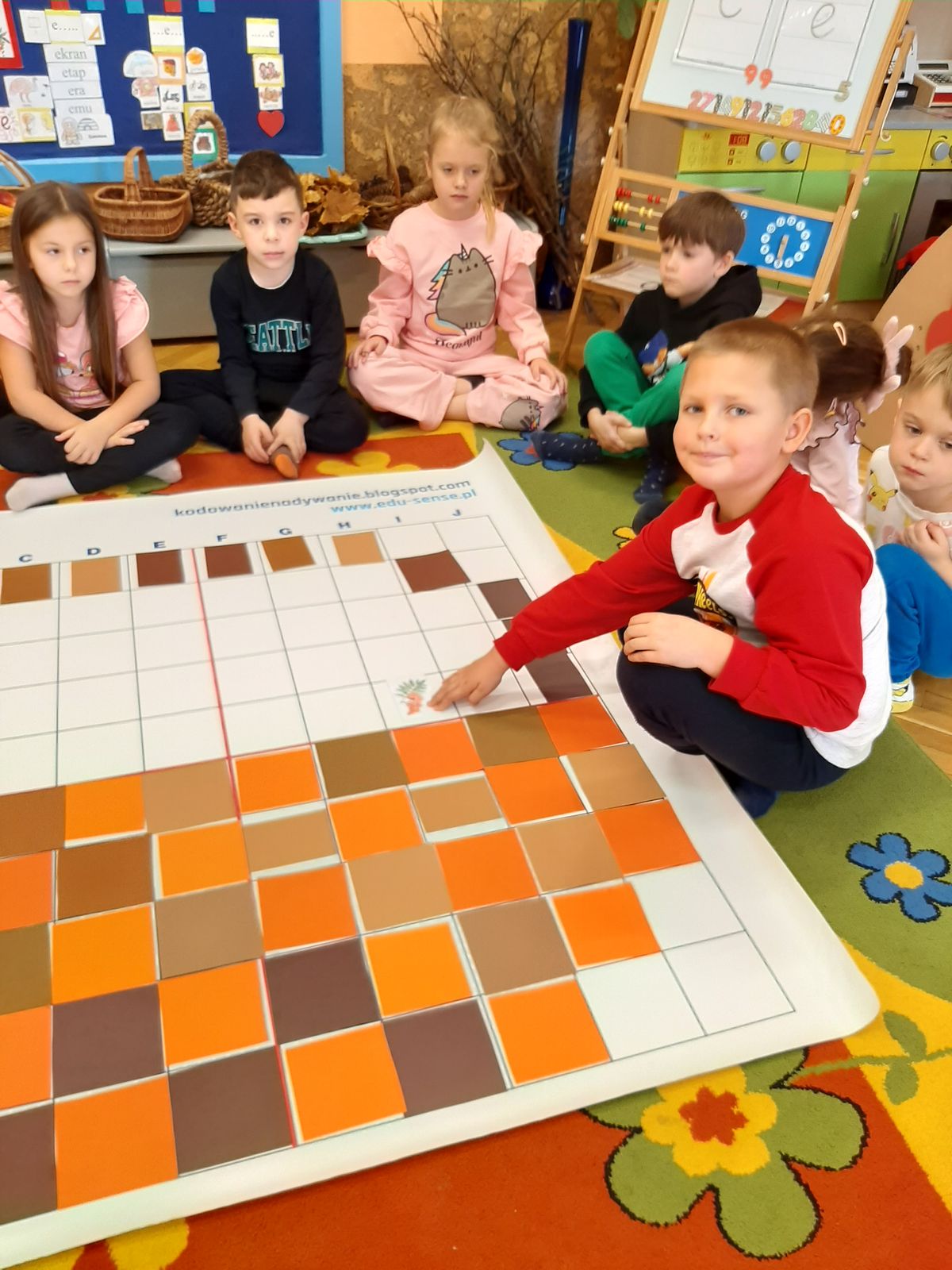 W tym tygodniu dzieci z grupy V uczestniczyły w europejskiej inicjatywie promującej programowanie „Code Week”. Tematem przewodnim zajęć z kodowania była Jesień. Dzieci bawiły się w kodowanie poprzez odczytywanie współrzędnych poszczególnych pól i układanie kartoników w odpowiednich kolorach. Efektem końcowym było ułożenie kosza na jesienne dary. Zabawy z wykorzystaniem maty, kolorowych obrazków , świetnie sprawdzają się przy wszelkiego rodzaju zabawach rozwijających logiczne myślenie.