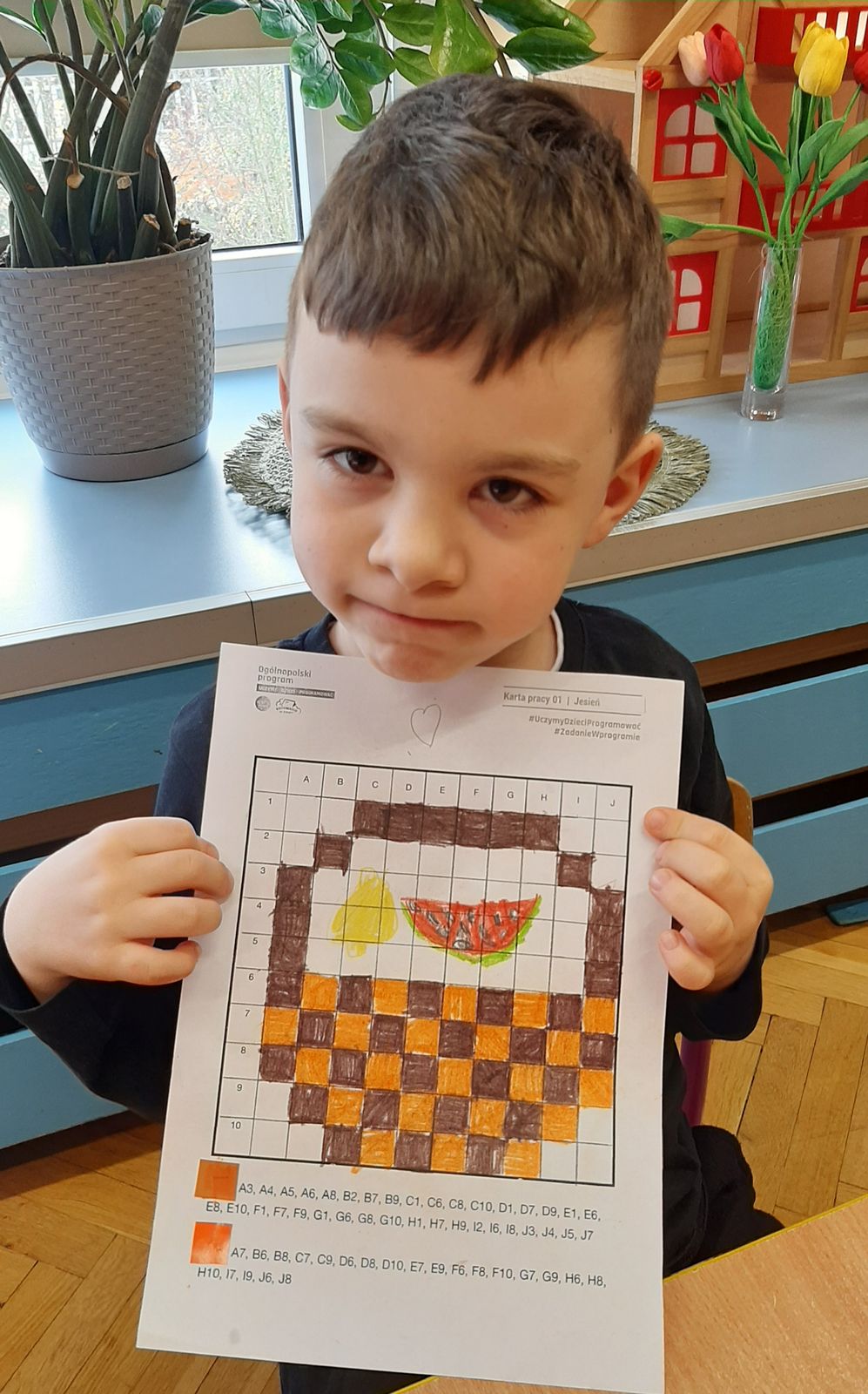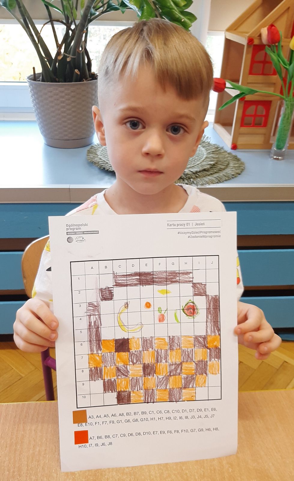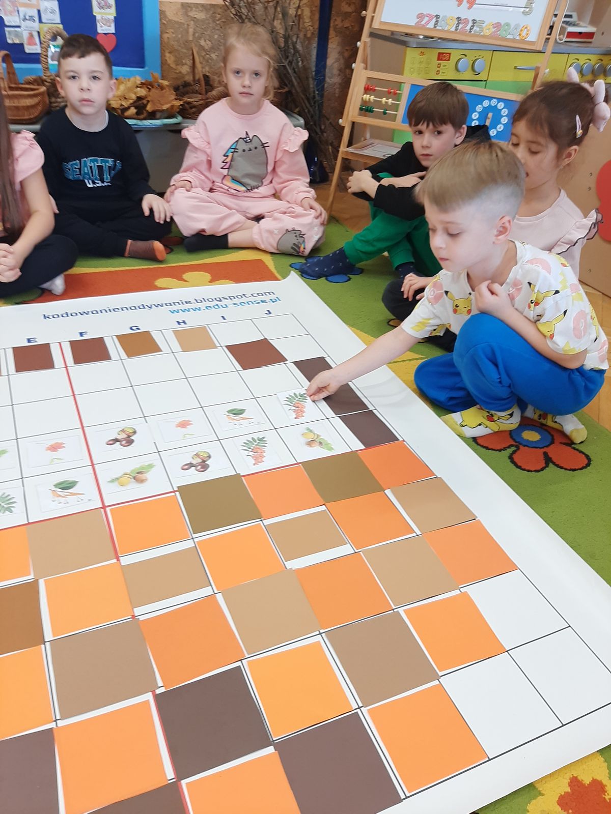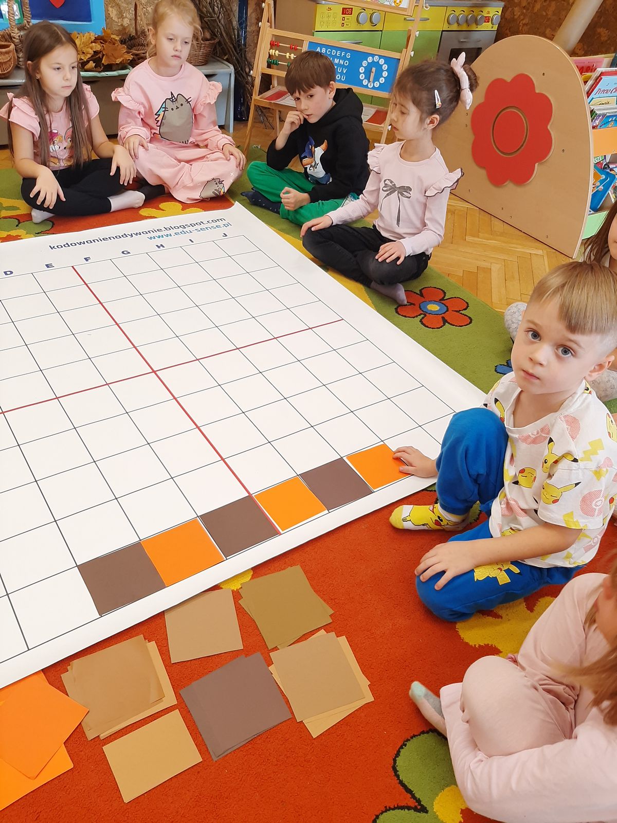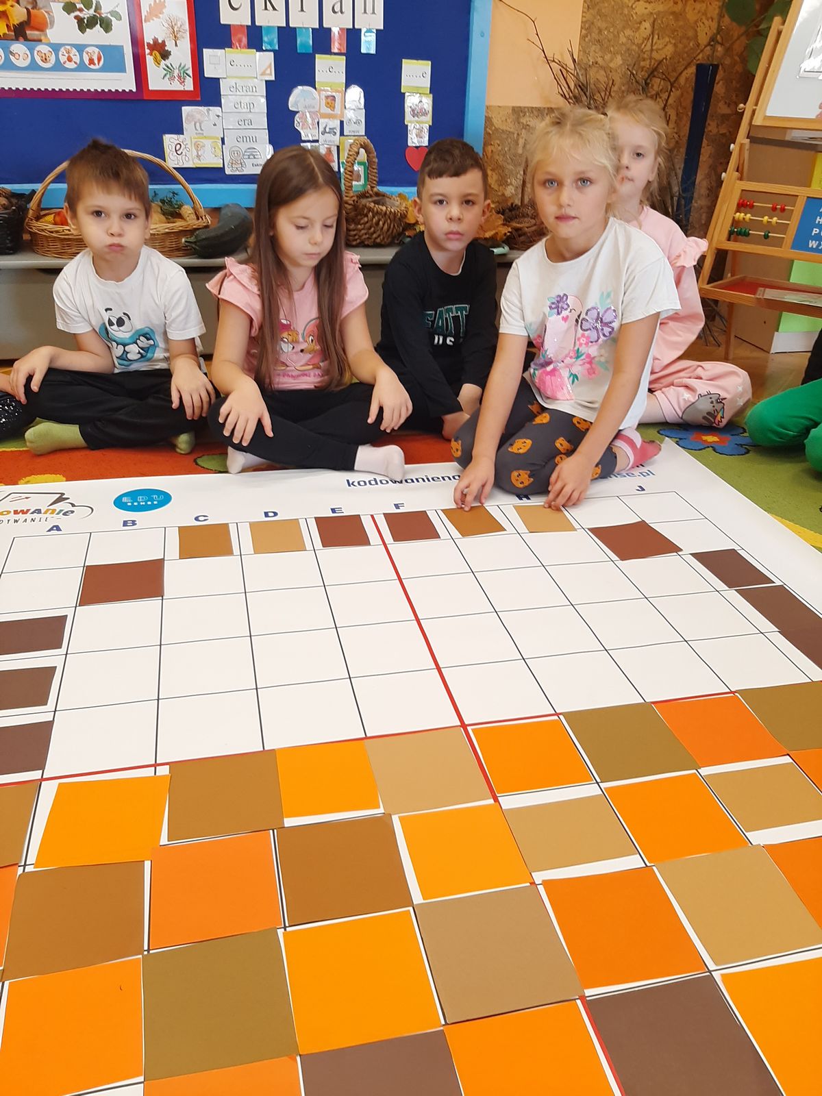 W tym tygodniu dzieci z grupy V uczestniczyły w europejskiej inicjatywie promującej programowanie „Code Week”. Tematem przewodnim zajęć z kodowania była Jesień. Dzieci bawiły się w kodowanie poprzez odczytywanie współrzędnych poszczególnych pól i układanie kartoników w odpowiednich kolorach. Efektem końcowym było ułożenie kosza na jesienne dary. Zabawy z wykorzystaniem maty, kolorowych obrazków , świetnie sprawdzają się przy wszelkiego rodzaju zabawach rozwijających logiczne myślenie.