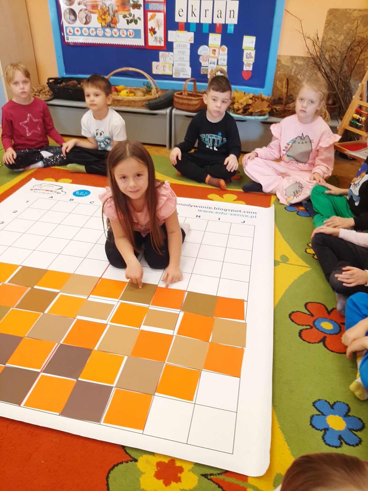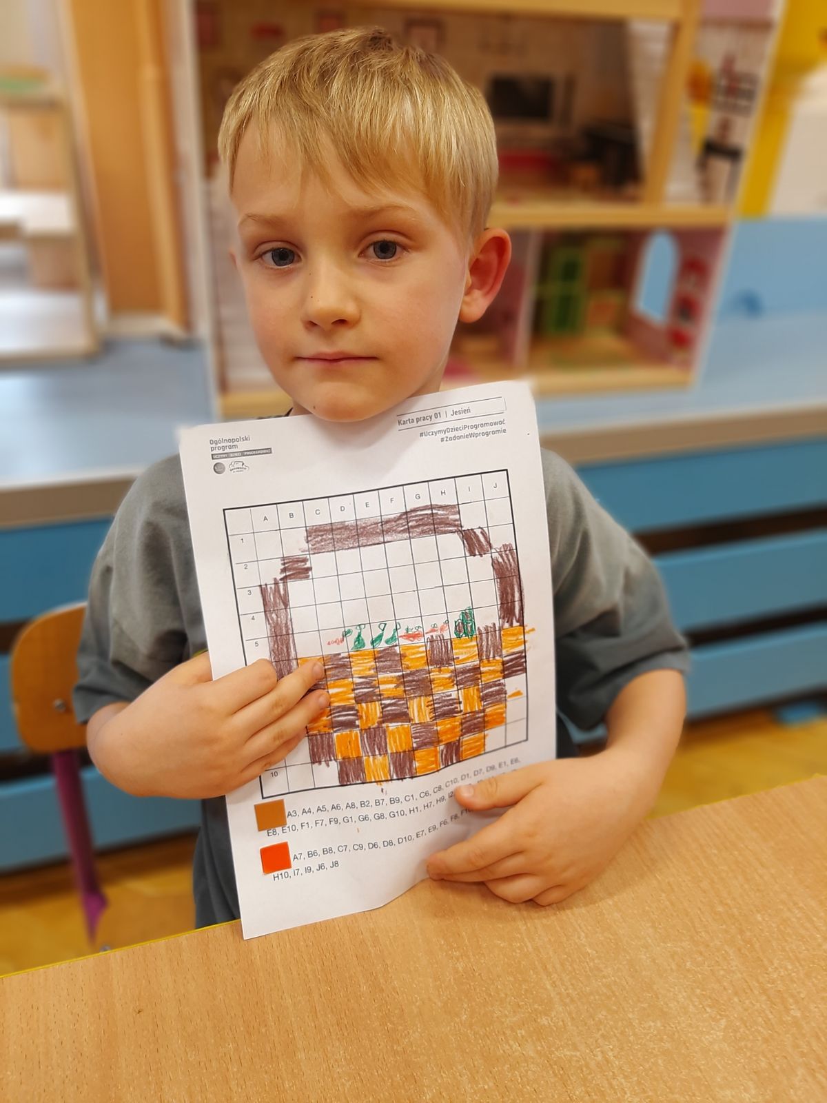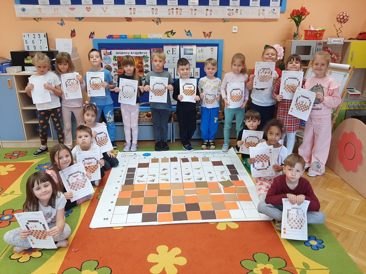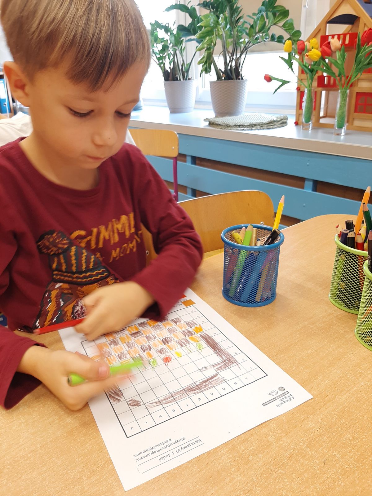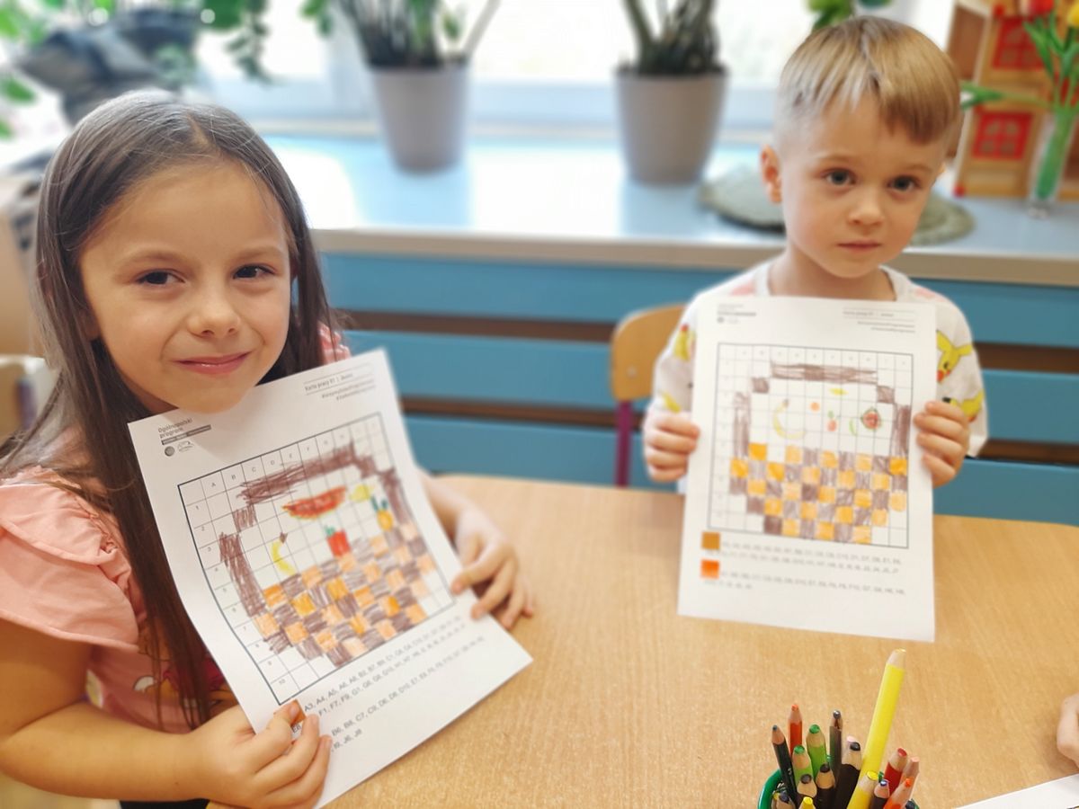 W tym tygodniu dzieci z grupy V uczestniczyły w europejskiej inicjatywie promującej programowanie „Code Week”. Tematem przewodnim zajęć z kodowania była Jesień. Dzieci bawiły się w kodowanie poprzez odczytywanie współrzędnych poszczególnych pól i układanie kartoników w odpowiednich kolorach. Efektem końcowym było ułożenie kosza na jesienne dary. Zabawy z wykorzystaniem maty, kolorowych obrazków , świetnie sprawdzają się przy wszelkiego rodzaju zabawach rozwijających logiczne myślenie.