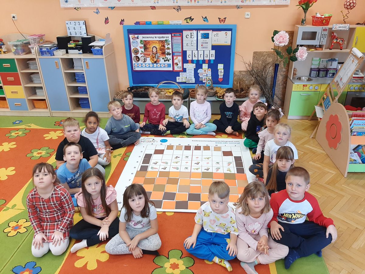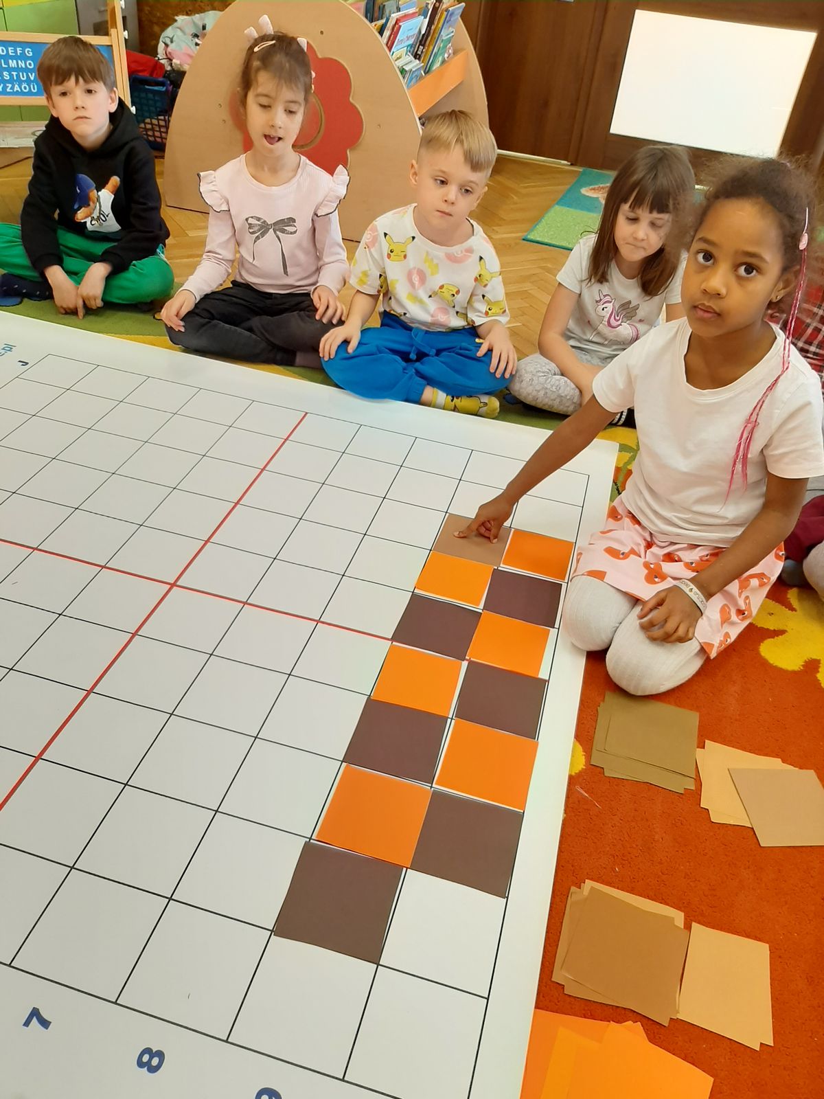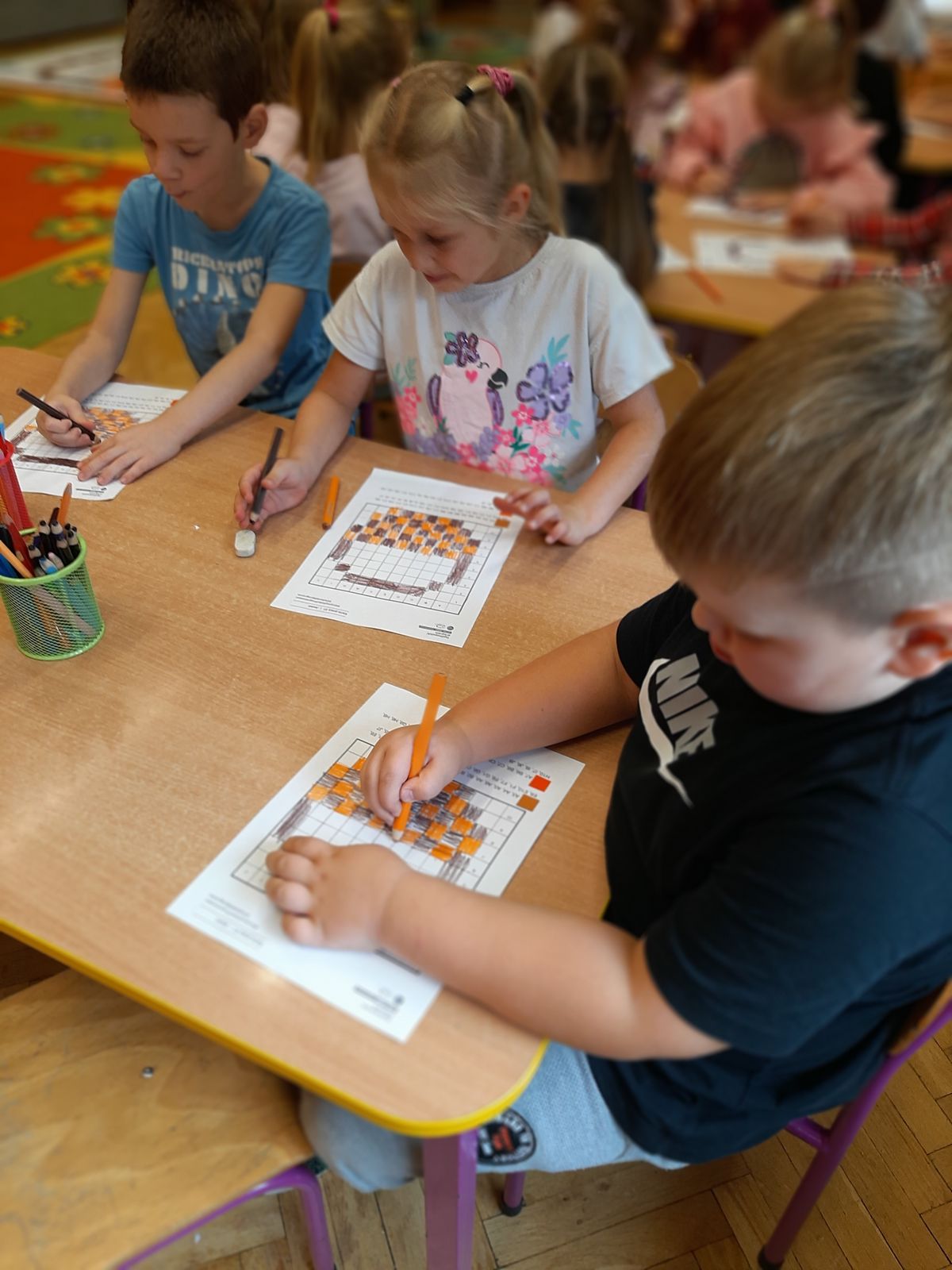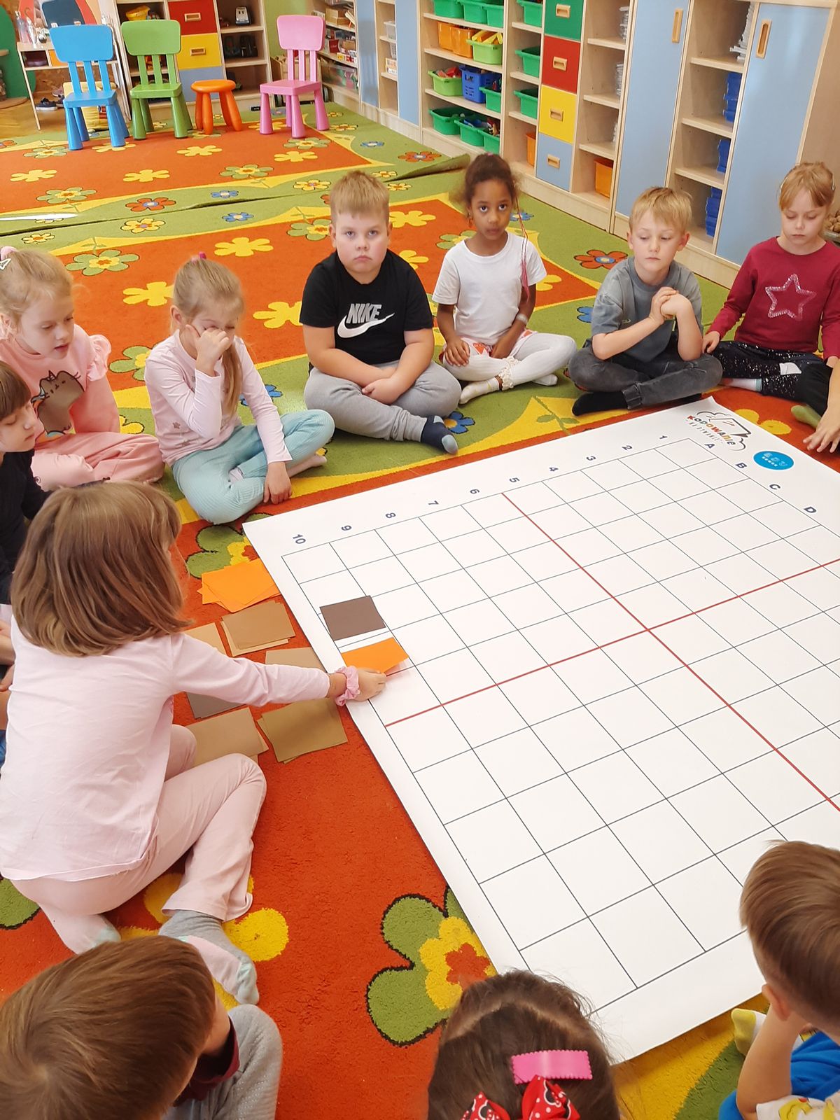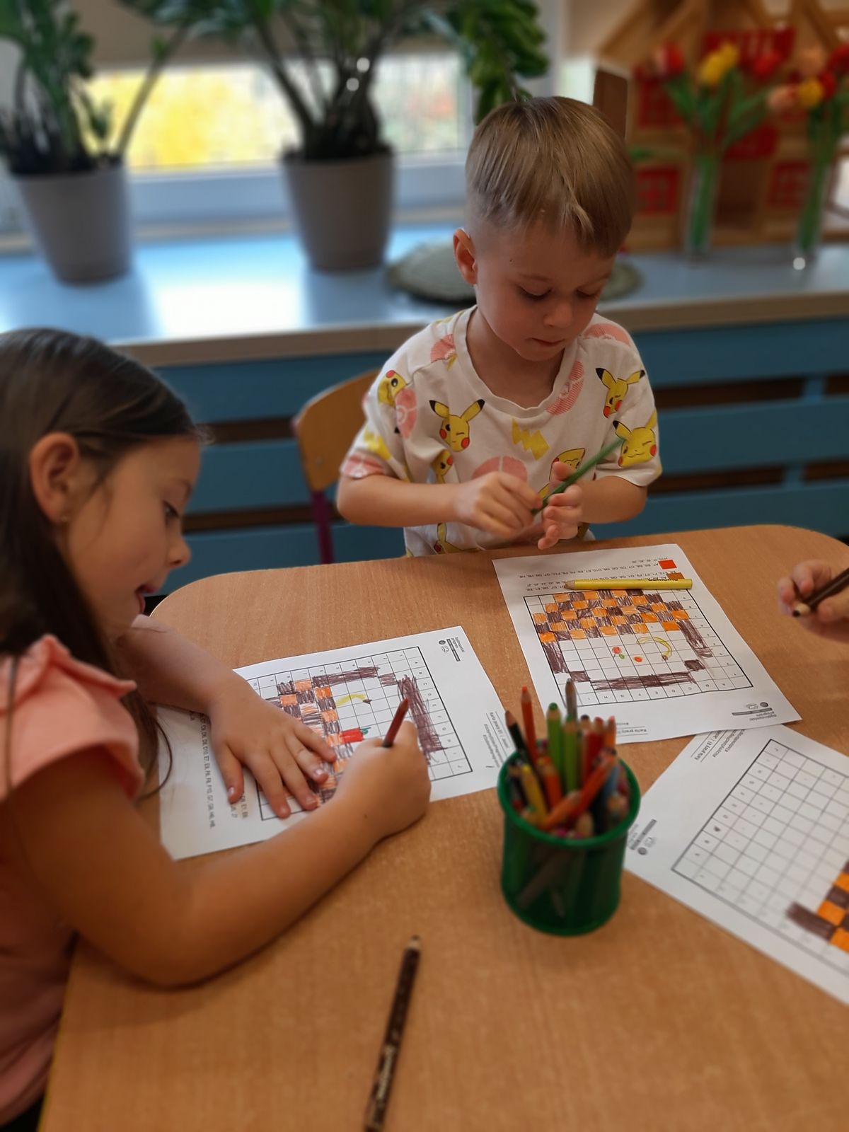 W tym tygodniu dzieci z grupy V uczestniczyły w europejskiej inicjatywie promującej programowanie „Code Week”. Tematem przewodnim zajęć z kodowania była Jesień. Dzieci bawiły się w kodowanie poprzez odczytywanie współrzędnych poszczególnych pól i układanie kartoników w odpowiednich kolorach. Efektem końcowym było ułożenie kosza na jesienne dary. Zabawy z wykorzystaniem maty, kolorowych obrazków , świetnie sprawdzają się przy wszelkiego rodzaju zabawach rozwijających logiczne myślenie.