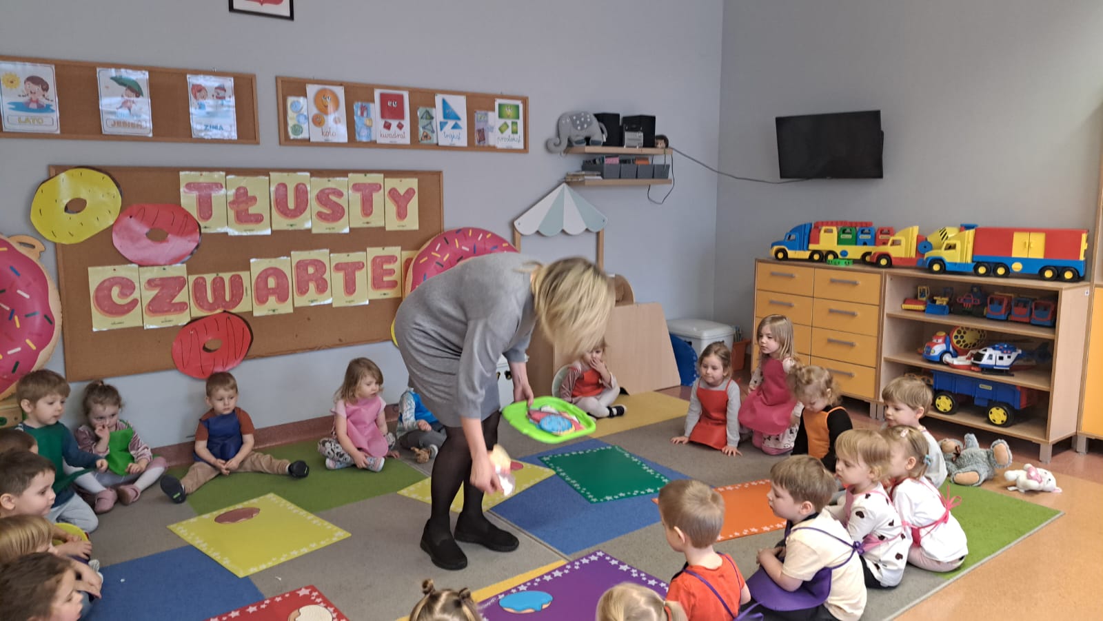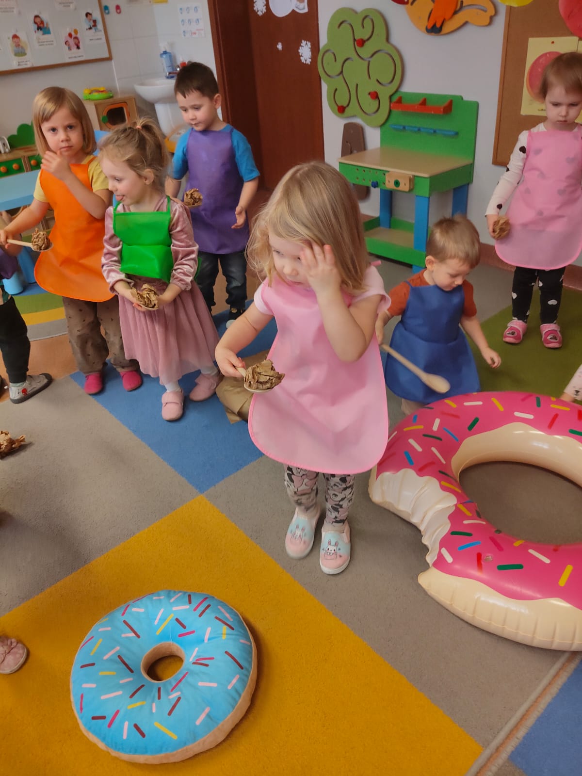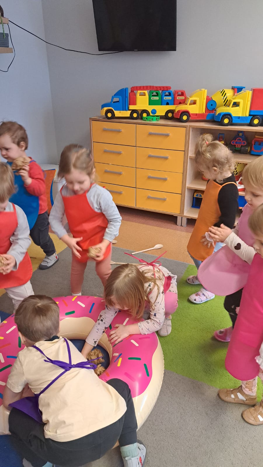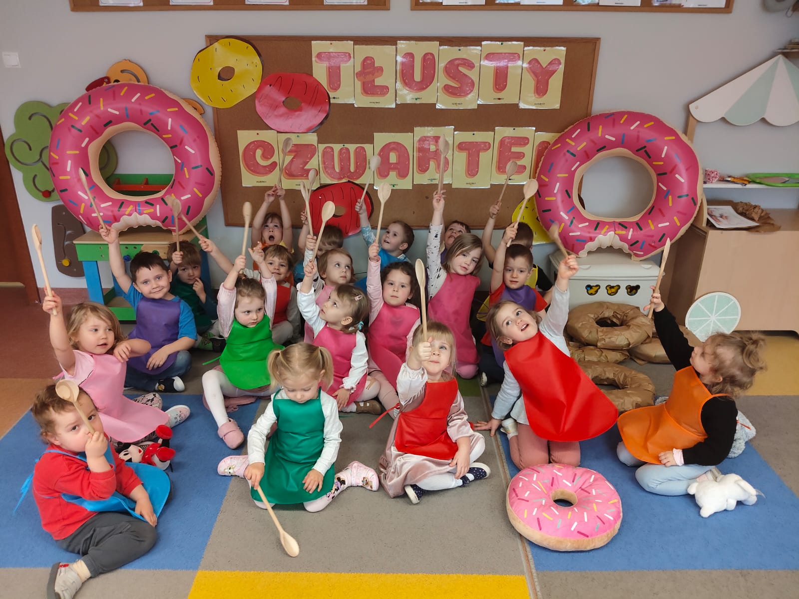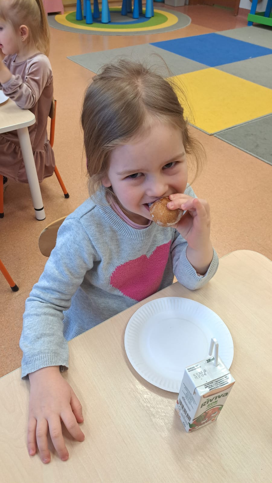 Maluszki z grupy IX zgodnie z tradycją, świętowały dziś TŁUSTY CZWARTEK przy słodkościach, muzyczce i wesołych zabawach z pączkiem w roli głównej :)