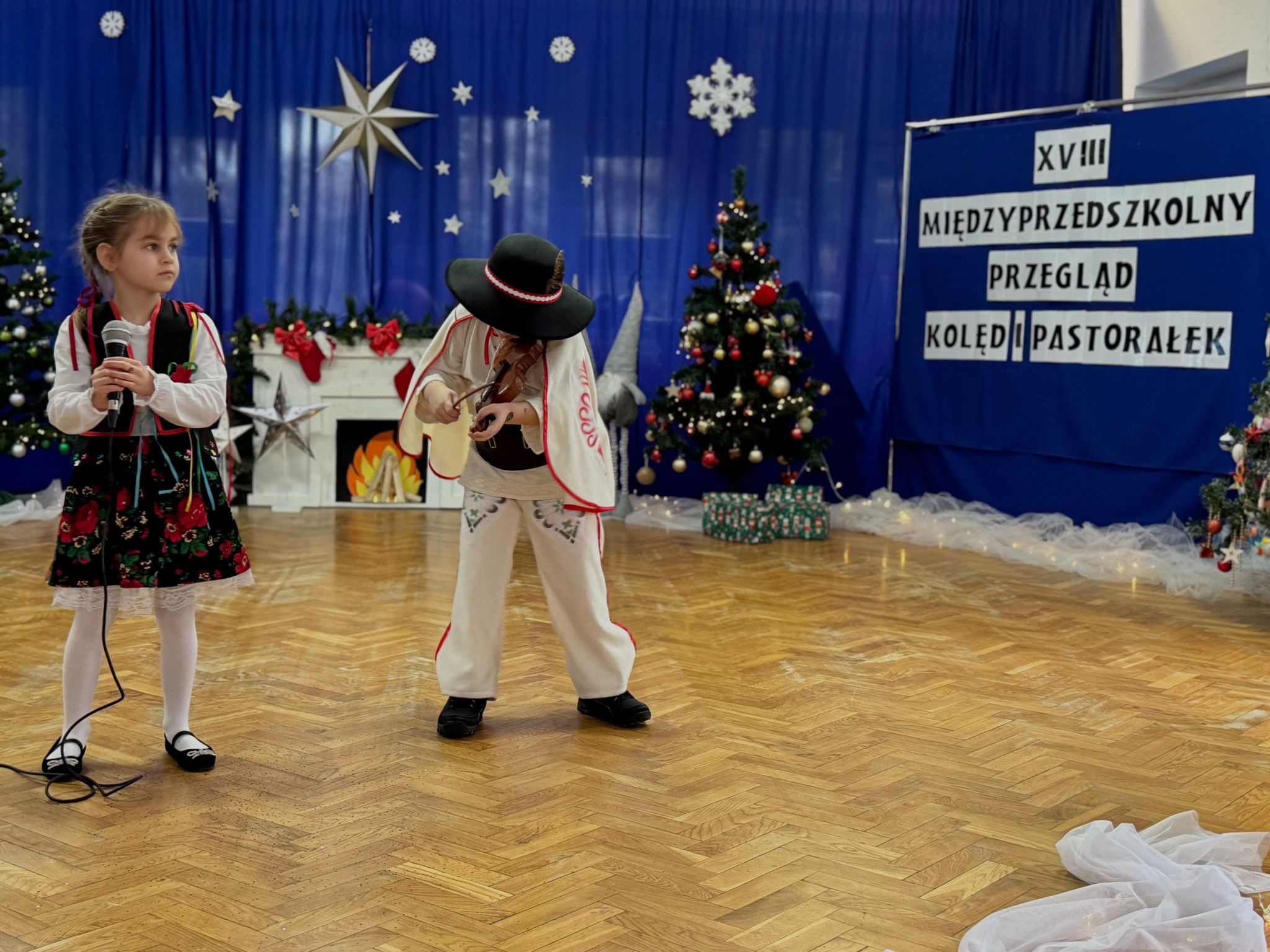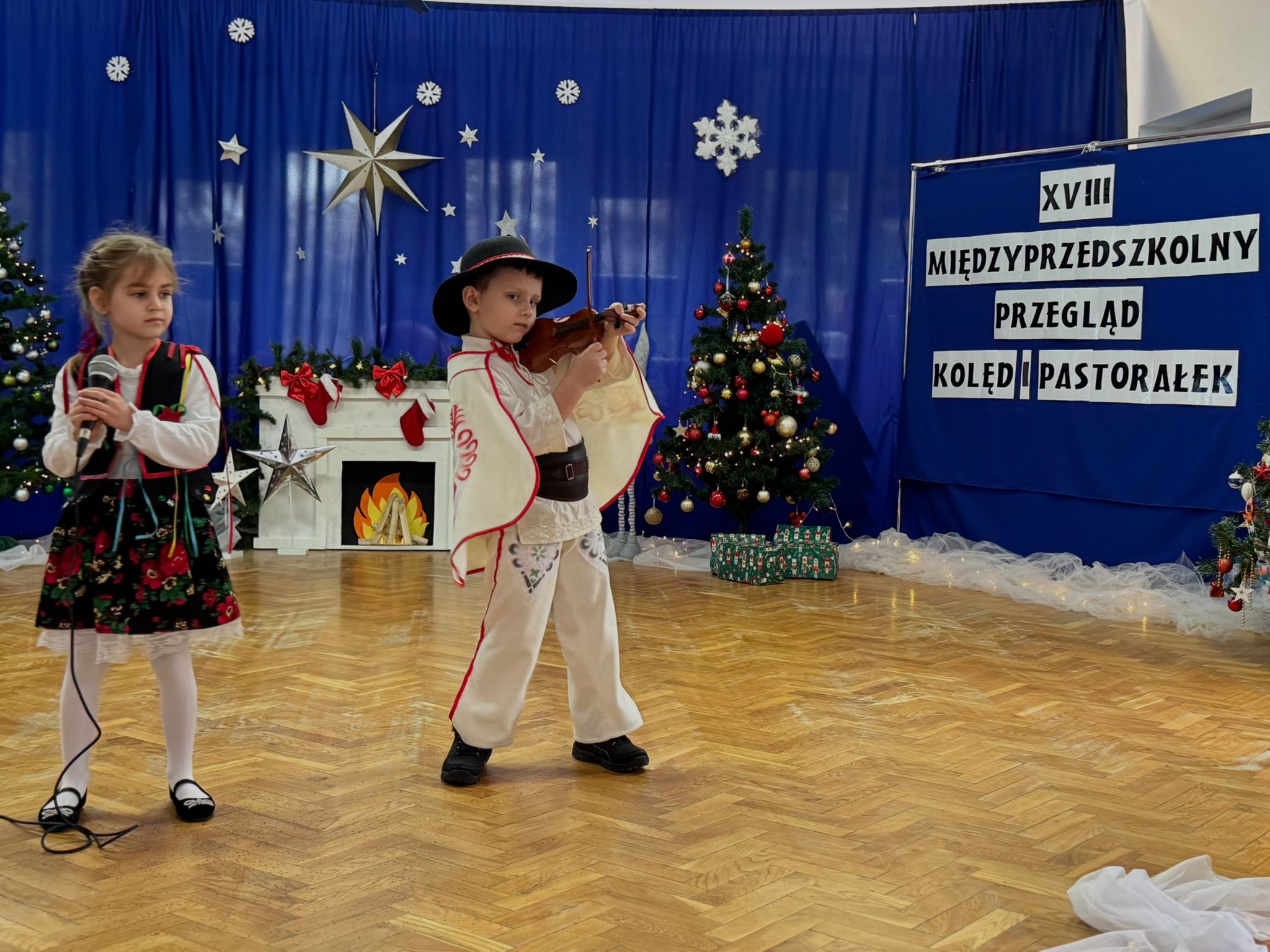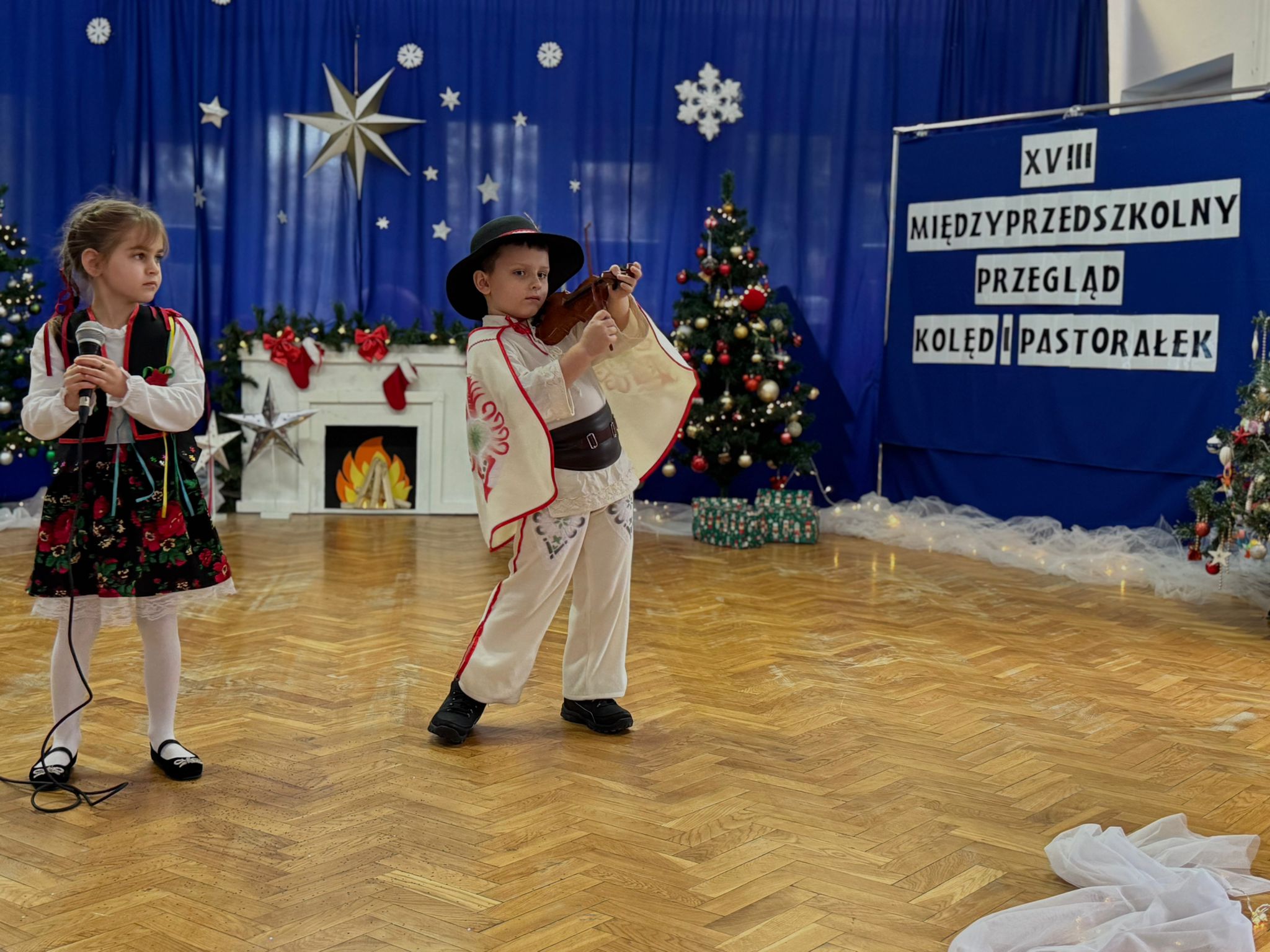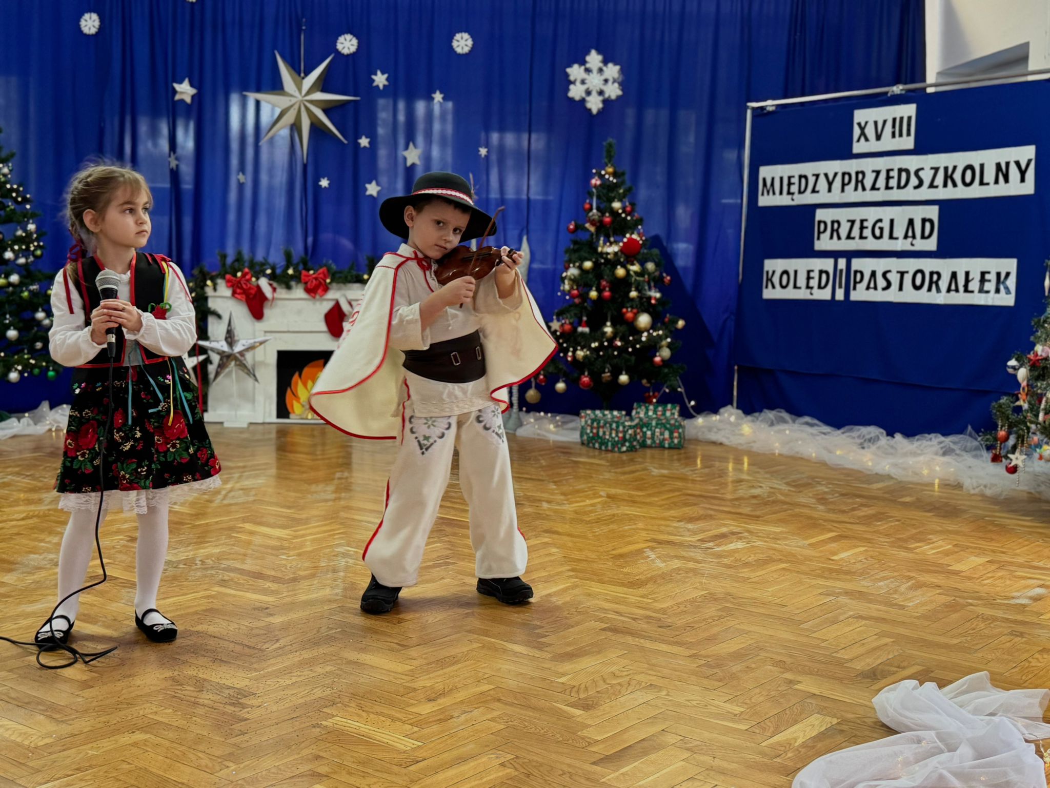 W dniu dzisiejszym dzieci z grupy IV wzięły udział w XVIII Międzyprzedszkolnym Przeglądzie Kolęd i Pastorałek, który odbył się w Przedszkolu nr 8 w Koninie. Celem przeglądu była m.in. prezentacja umiejętności wokalnych dzieci w wieku przedszkolnym, promowanie aktywności twórczej wśród dzieci, promocja nowych talentów, podtrzymanie w młodym pokoleniu tradycji śpiewania kolęd i pastorałek, poszerzenie wiedzy na temat tradycji bożonarodzeniowych, popularyzacja śpiewu wśród dzieci jako jednej z przyjemniejszych form spędzania wolnego czasu. Podczas przeglądu Antosia S. zachwyciła publiczność kolędą „Tylko jedna jest taka noc”, a Marcelek B. „grą” na skrzypcach niczym prawdziwy wirtuoz. Dzieci wystąpiły w pięknych strojach góralskich, co dodatkowo podkreśliło wyjątkowy charakter występu. Wykonanie naszych przedszkolaków spotkało się z ogromnym uznaniem i aplauzem. Dzieci nie tylko zaprezentowały swoje umiejętności, ale również wniosły do wspólnego świętowania prawdziwy, świąteczny klimat.
