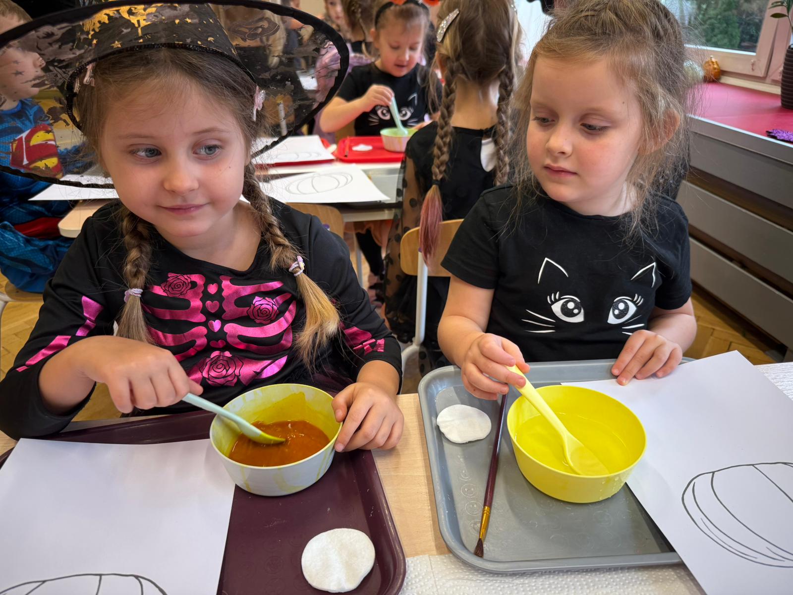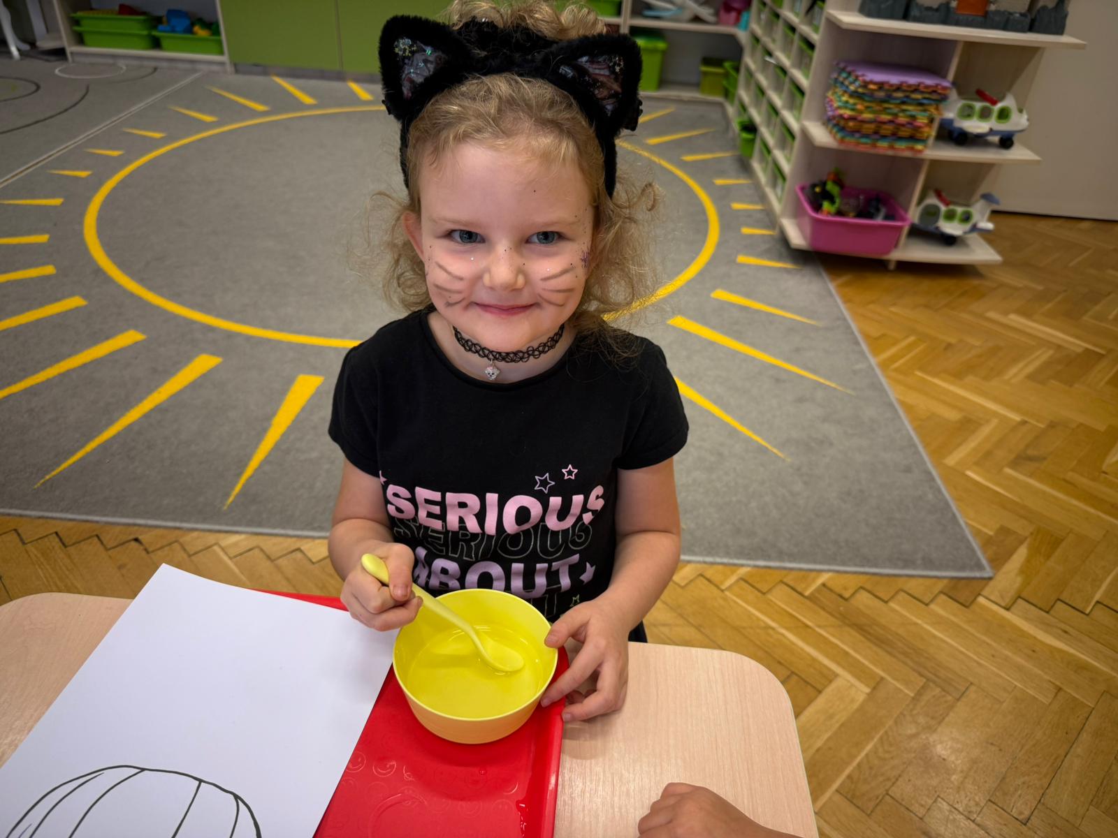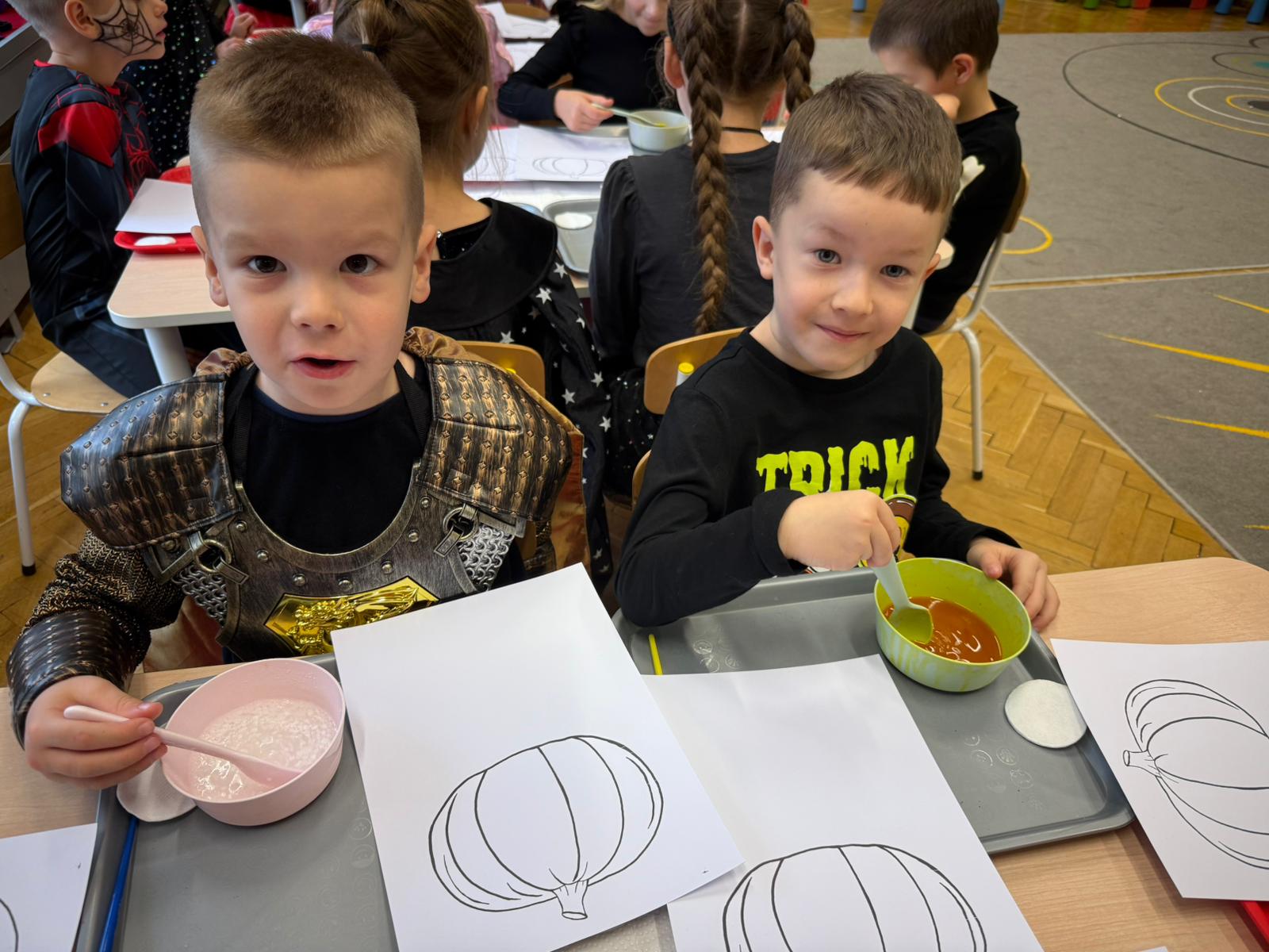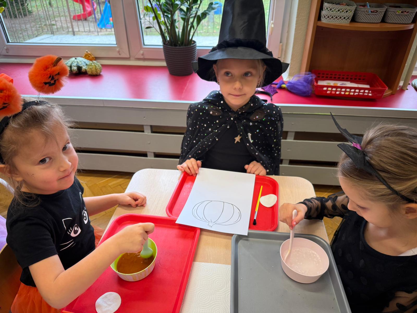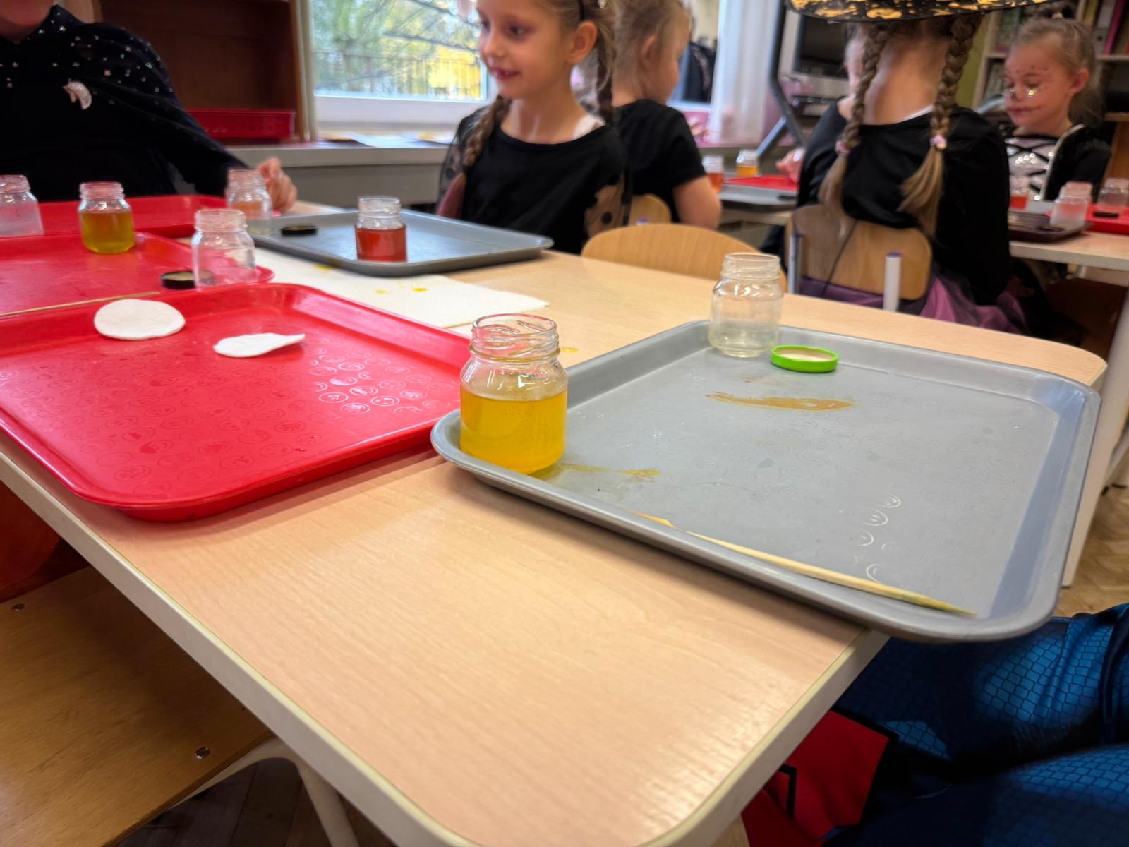 Dziś w naszej grupie odbyły się niesamowite „czary – mary” w świecie nauki! Dzieci miały okazję wziąć udział w różnych eksperymentach, które zachwyciły małych badaczy. Pierwszym z eksperymentów było połączenie nadtlenku wodoru z nadmanganianem potasu, co spowodowało efekt cieplny i powstanie dymu, przywodzącego na myśl duchowe postaci Halloween. Kolejne doświadczenie to eksperyment z sodą i wodą, podczas którego dzieci najpierw oczyszczały narysowane już dynie na białej kartce papieru za pomocą wacika nasączonego roztworem sody. Następnie, używając pędzelków zanurzonych w kurkumie i alkoholu, mali laboranci malowali oczyszczone dynie, które zmieniały kolory na czerwień i żółć, w zależności od ilości sody. W dalszej kolejności dodanie roztworu kwasku cytrynowego połączonego z sodą pozwoliło na ozdabianie dyni w różnorodne wzory. Ostatnim eksperymentem, nazwanym „światła drogowe”, było mieszanie różnych substancji w słoiczkach (woda, wodorotlenek sodu, indygo karmin oraz glukoza), co skutkowało spektakularną zmianą kolorów na czerwony, zielony i żółty. Przedszkolaki były zachwycone rezultatami, które nie tylko rozwijały ich ciekawość i kreatywność, ale również uczyły podstaw chemii w zabawny i interaktywny sposób.