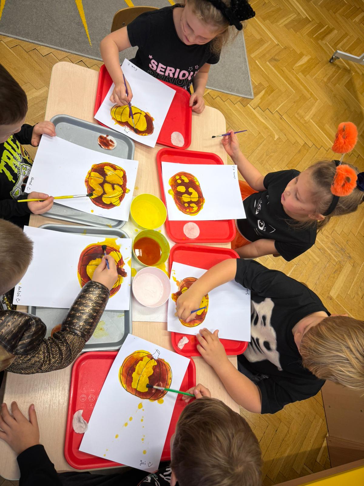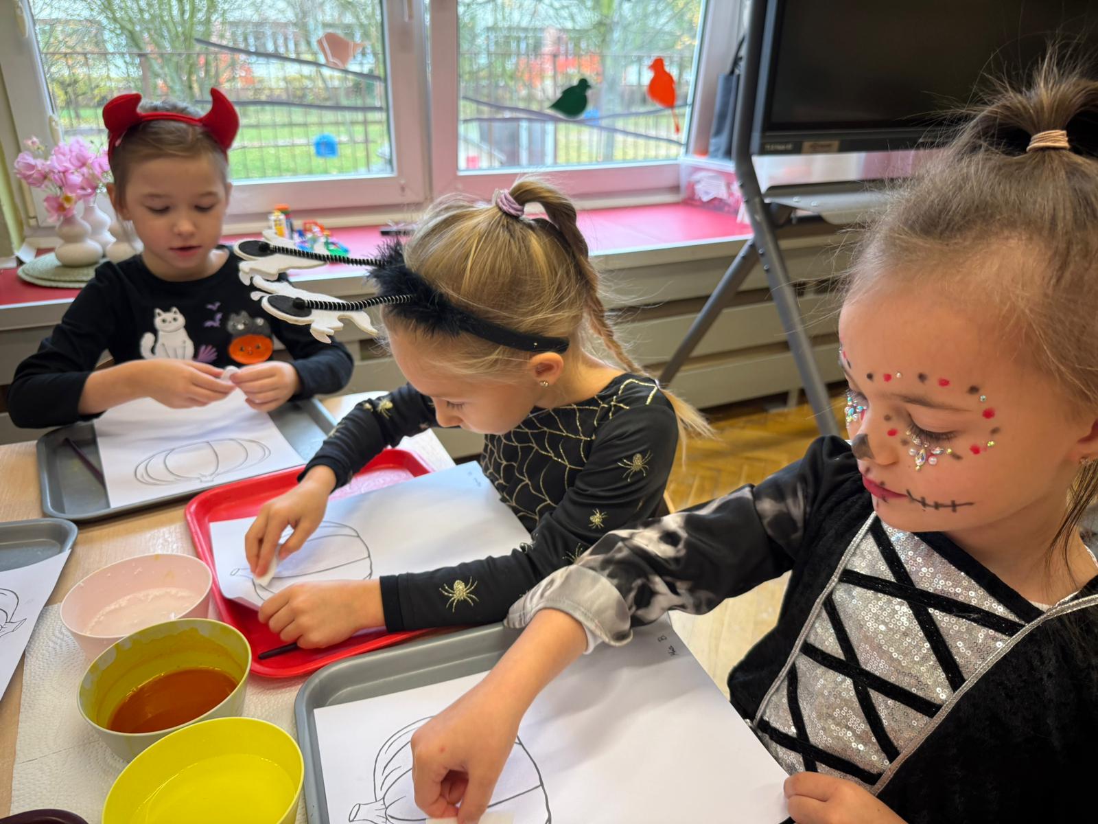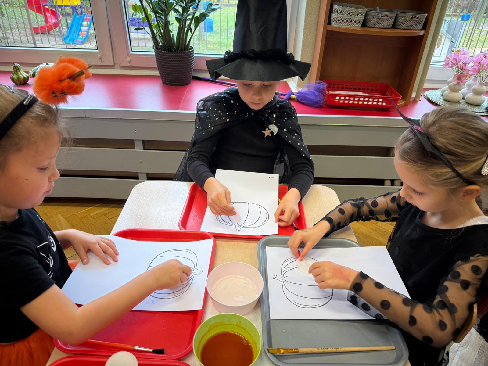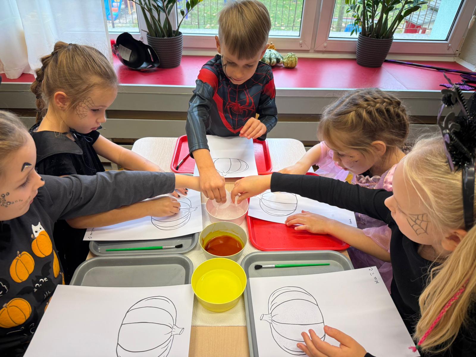 Dziś w naszej grupie odbyły się niesamowite „czary – mary” w świecie nauki! Dzieci miały okazję wziąć udział w różnych eksperymentach, które zachwyciły małych badaczy. Pierwszym z eksperymentów było połączenie nadtlenku wodoru z nadmanganianem potasu, co spowodowało efekt cieplny i powstanie dymu, przywodzącego na myśl duchowe postaci Halloween. Kolejne doświadczenie to eksperyment z sodą i wodą, podczas którego dzieci najpierw oczyszczały narysowane już dynie na białej kartce papieru za pomocą wacika nasączonego roztworem sody. Następnie, używając pędzelków zanurzonych w kurkumie i alkoholu, mali laboranci malowali oczyszczone dynie, które zmieniały kolory na czerwień i żółć, w zależności od ilości sody. W dalszej kolejności dodanie roztworu kwasku cytrynowego połączonego z sodą pozwoliło na ozdabianie dyni w różnorodne wzory. Ostatnim eksperymentem, nazwanym „światła drogowe”, było mieszanie różnych substancji w słoiczkach (woda, wodorotlenek sodu, indygo karmin oraz glukoza), co skutkowało spektakularną zmianą kolorów na czerwony, zielony i żółty. Przedszkolaki były zachwycone rezultatami, które nie tylko rozwijały ich ciekawość i kreatywność, ale również uczyły podstaw chemii w zabawny i interaktywny sposób.