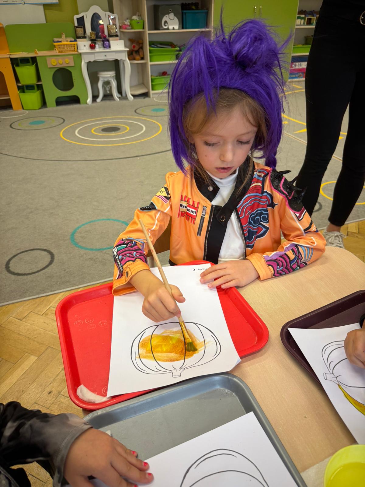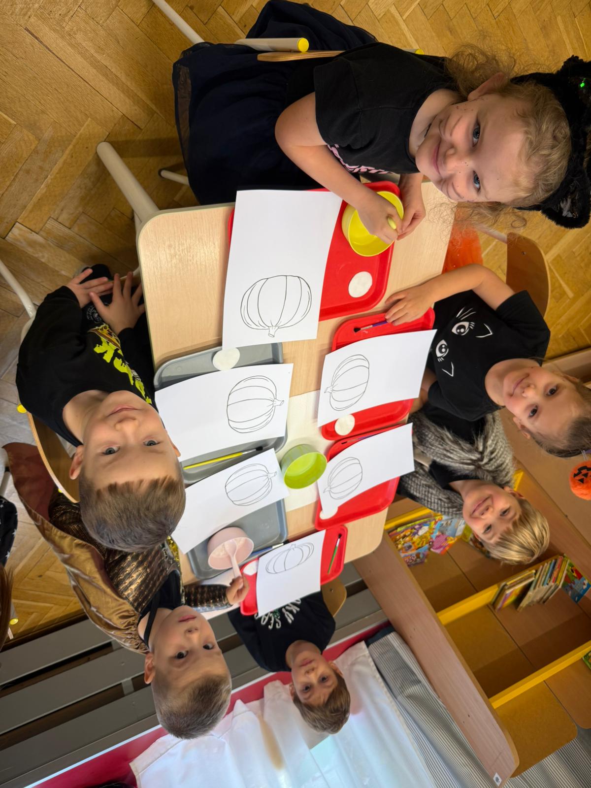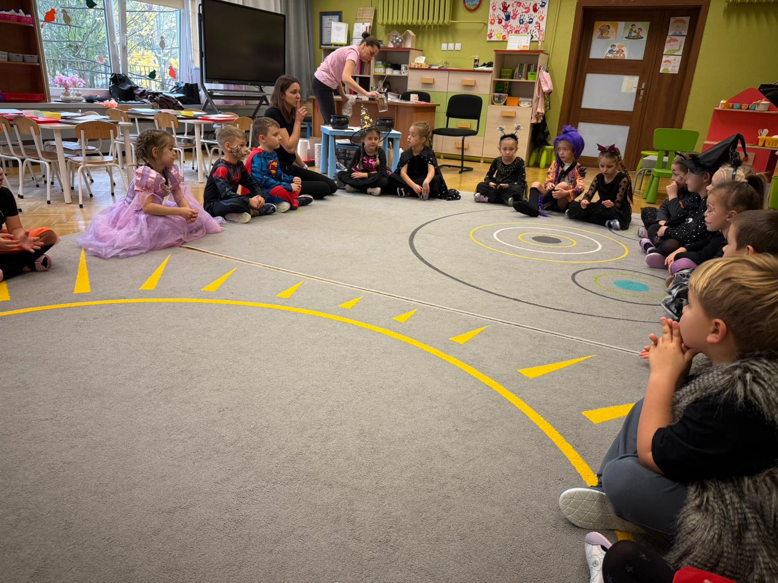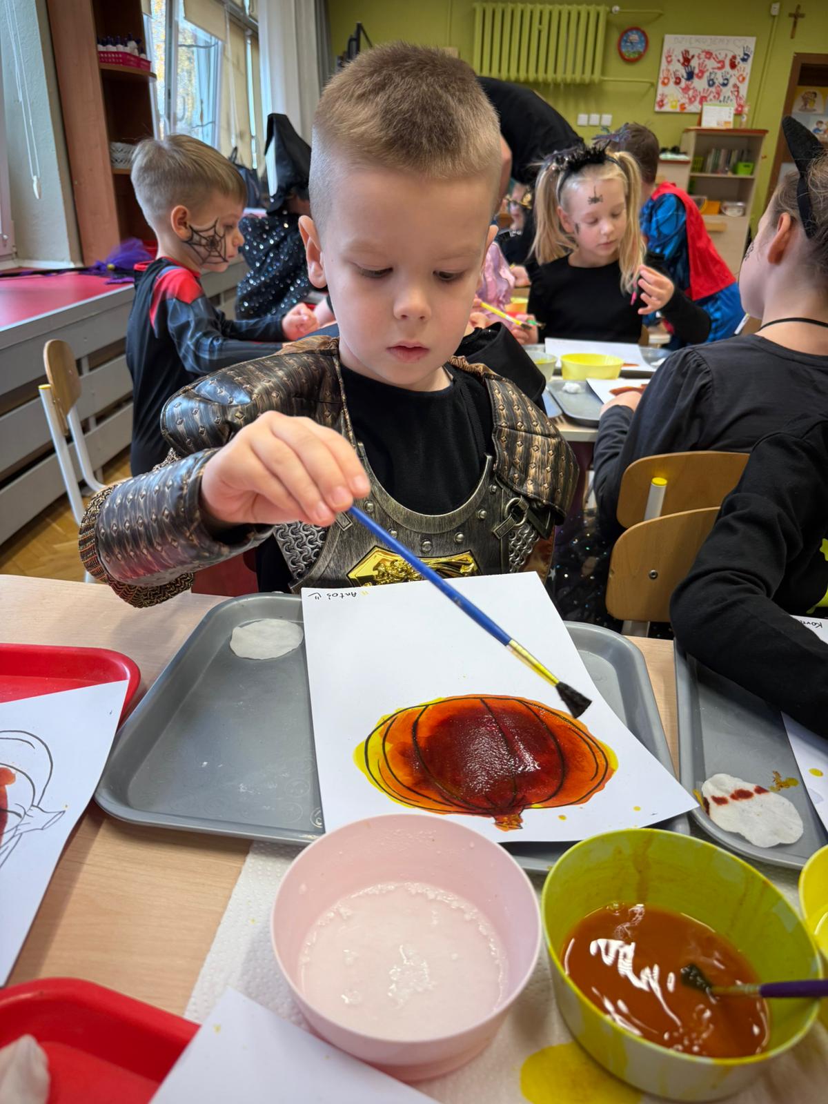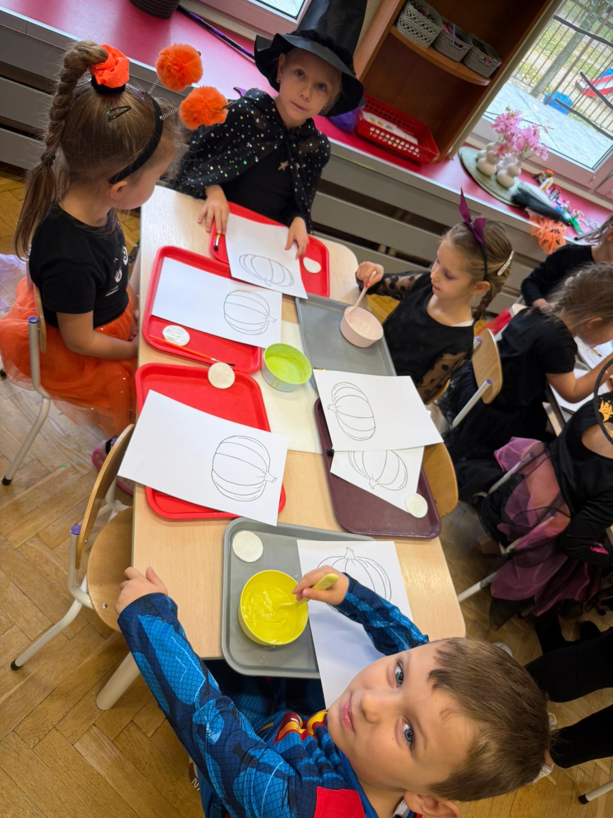 Dziś w naszej grupie odbyły się niesamowite „czary – mary” w świecie nauki! Dzieci miały okazję wziąć udział w różnych eksperymentach, które zachwyciły małych badaczy. Pierwszym z eksperymentów było połączenie nadtlenku wodoru z nadmanganianem potasu, co spowodowało efekt cieplny i powstanie dymu, przywodzącego na myśl duchowe postaci Halloween. Kolejne doświadczenie to eksperyment z sodą i wodą, podczas którego dzieci najpierw oczyszczały narysowane już dynie na białej kartce papieru za pomocą wacika nasączonego roztworem sody. Następnie, używając pędzelków zanurzonych w kurkumie i alkoholu, mali laboranci malowali oczyszczone dynie, które zmieniały kolory na czerwień i żółć, w zależności od ilości sody. W dalszej kolejności dodanie roztworu kwasku cytrynowego połączonego z sodą pozwoliło na ozdabianie dyni w różnorodne wzory. Ostatnim eksperymentem, nazwanym „światła drogowe”, było mieszanie różnych substancji w słoiczkach (woda, wodorotlenek sodu, indygo karmin oraz glukoza), co skutkowało spektakularną zmianą kolorów na czerwony, zielony i żółty. Przedszkolaki były zachwycone rezultatami, które nie tylko rozwijały ich ciekawość i kreatywność, ale również uczyły podstaw chemii w zabawny i interaktywny sposób.