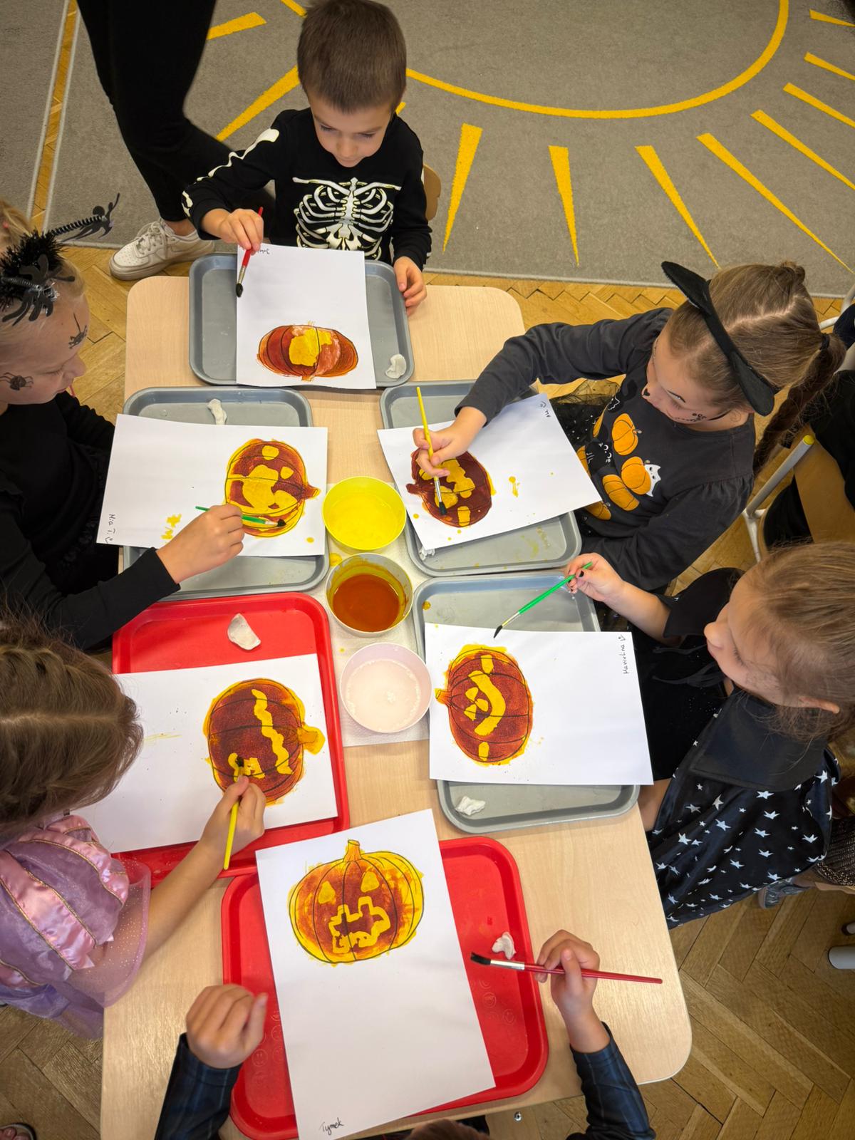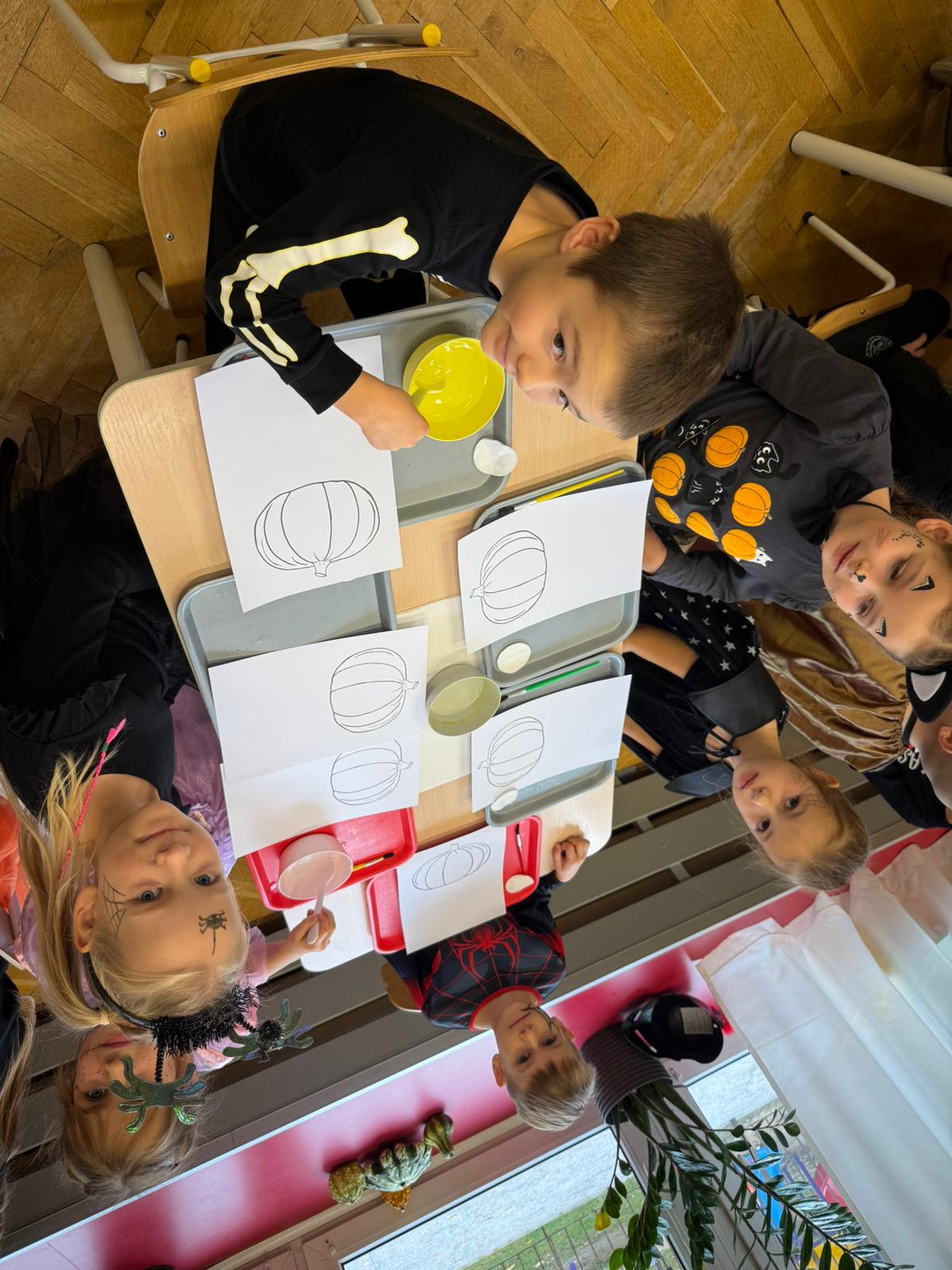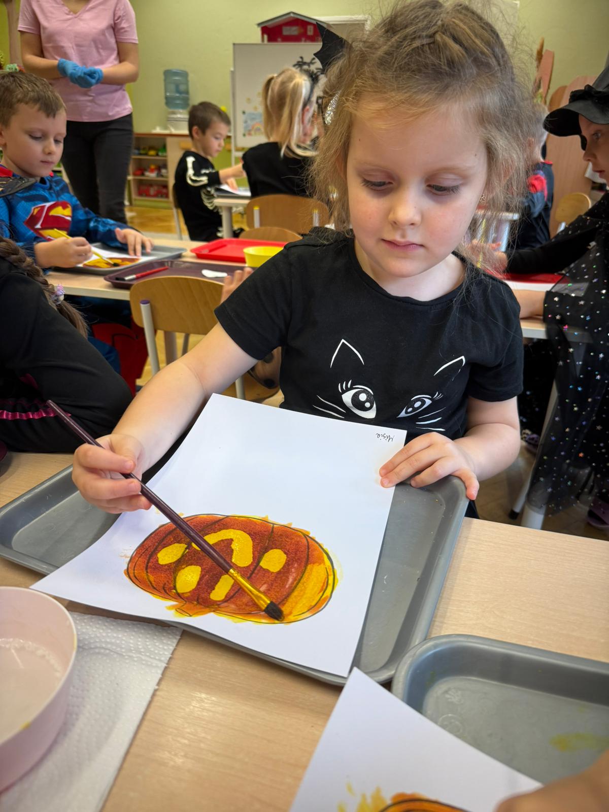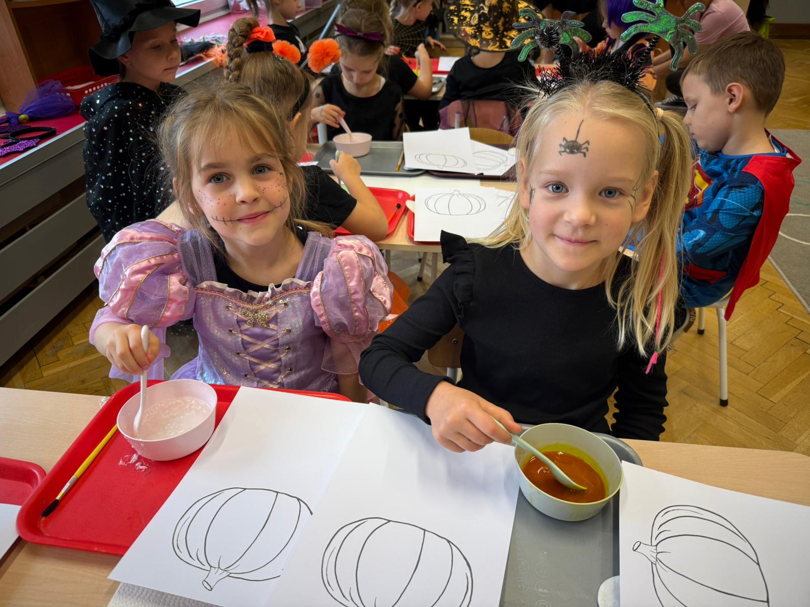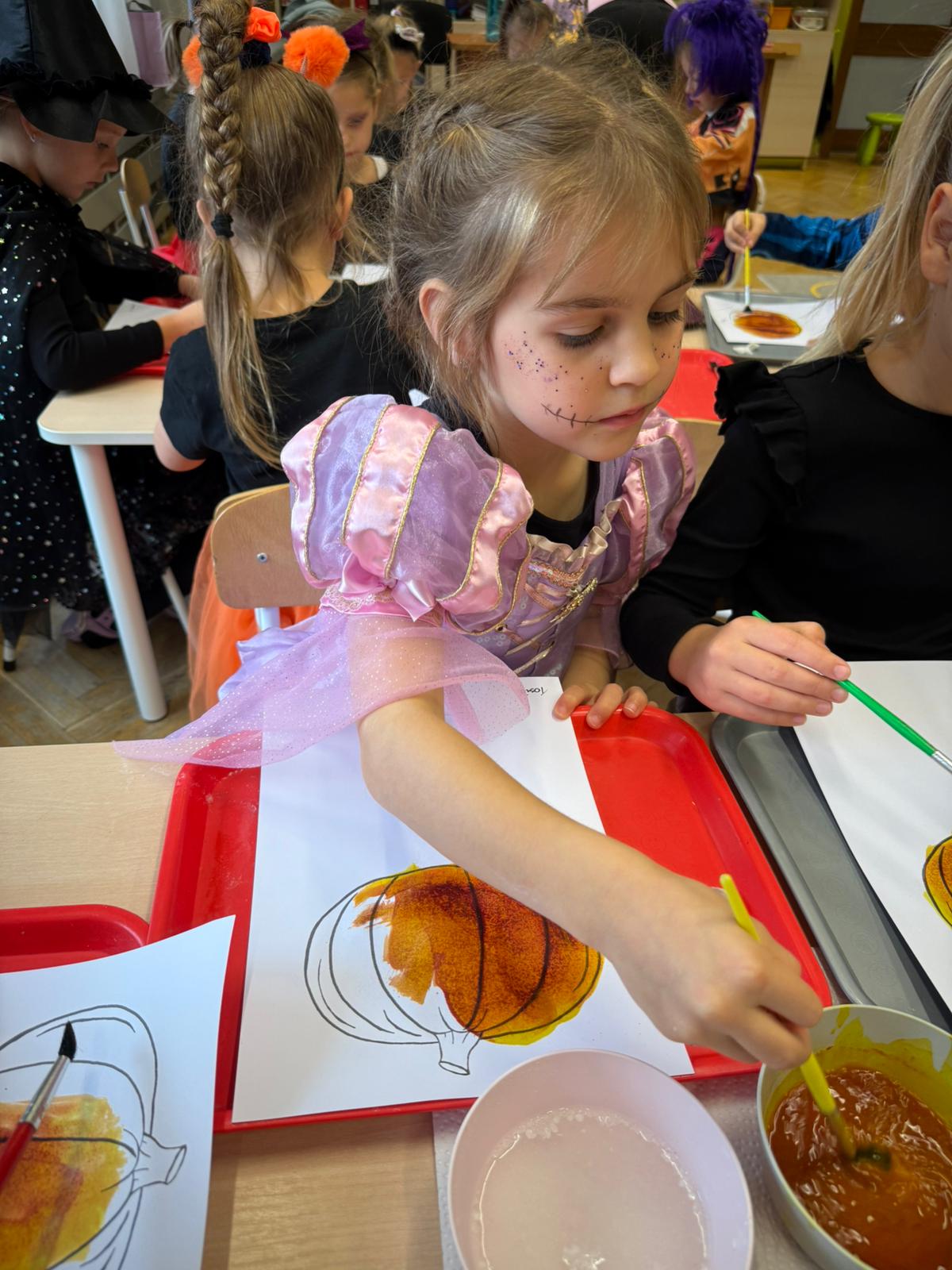 Dziś w naszej grupie odbyły się niesamowite „czary – mary” w świecie nauki! Dzieci miały okazję wziąć udział w różnych eksperymentach, które zachwyciły małych badaczy. Pierwszym z eksperymentów było połączenie nadtlenku wodoru z nadmanganianem potasu, co spowodowało efekt cieplny i powstanie dymu, przywodzącego na myśl duchowe postaci Halloween. Kolejne doświadczenie to eksperyment z sodą i wodą, podczas którego dzieci najpierw oczyszczały narysowane już dynie na białej kartce papieru za pomocą wacika nasączonego roztworem sody. Następnie, używając pędzelków zanurzonych w kurkumie i alkoholu, mali laboranci malowali oczyszczone dynie, które zmieniały kolory na czerwień i żółć, w zależności od ilości sody. W dalszej kolejności dodanie roztworu kwasku cytrynowego połączonego z sodą pozwoliło na ozdabianie dyni w różnorodne wzory. Ostatnim eksperymentem, nazwanym „światła drogowe”, było mieszanie różnych substancji w słoiczkach (woda, wodorotlenek sodu, indygo karmin oraz glukoza), co skutkowało spektakularną zmianą kolorów na czerwony, zielony i żółty. Przedszkolaki były zachwycone rezultatami, które nie tylko rozwijały ich ciekawość i kreatywność, ale również uczyły podstaw chemii w zabawny i interaktywny sposób.