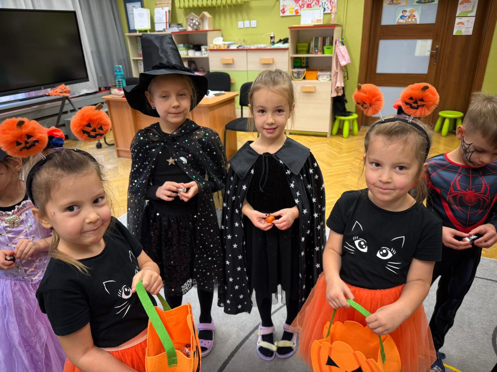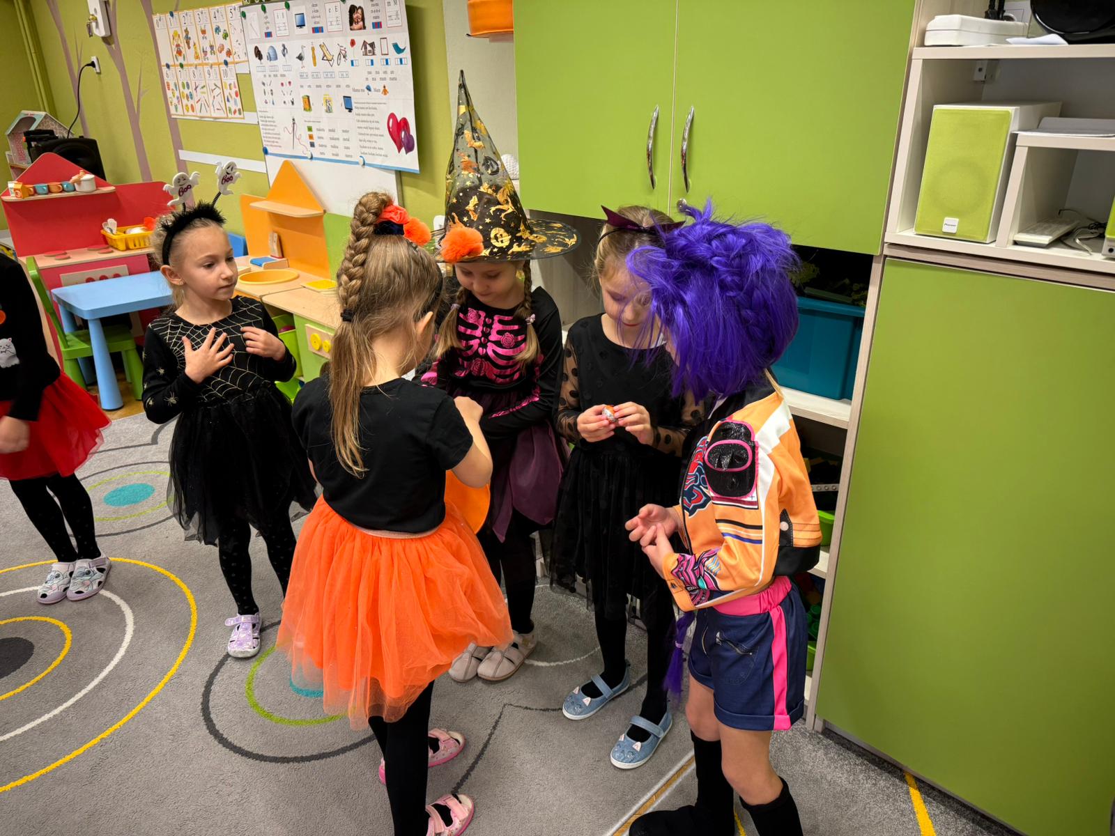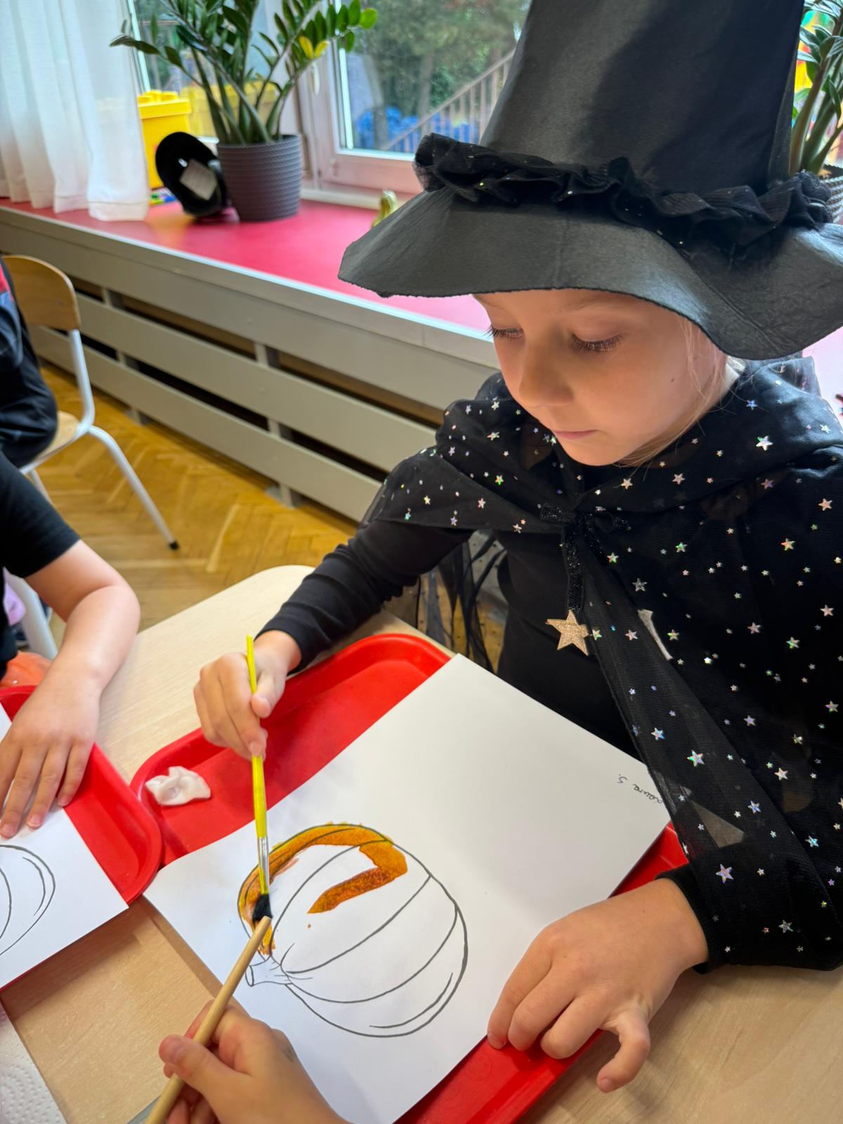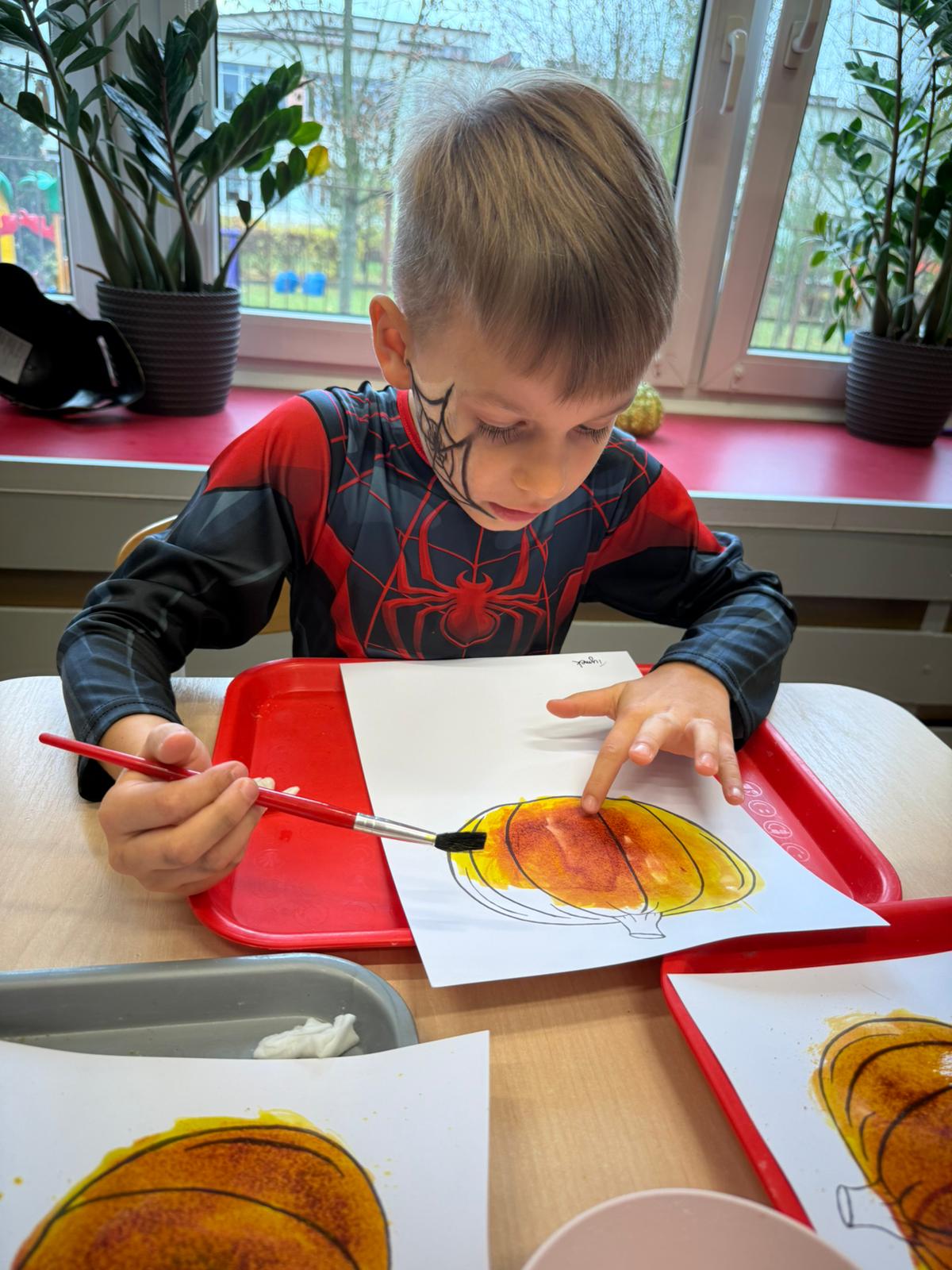 Dziś w naszej grupie odbyły się niesamowite „czary – mary” w świecie nauki! Dzieci miały okazję wziąć udział w różnych eksperymentach, które zachwyciły małych badaczy. Pierwszym z eksperymentów było połączenie nadtlenku wodoru z nadmanganianem potasu, co spowodowało efekt cieplny i powstanie dymu, przywodzącego na myśl duchowe postaci Halloween. Kolejne doświadczenie to eksperyment z sodą i wodą, podczas którego dzieci najpierw oczyszczały narysowane już dynie na białej kartce papieru za pomocą wacika nasączonego roztworem sody. Następnie, używając pędzelków zanurzonych w kurkumie i alkoholu, mali laboranci malowali oczyszczone dynie, które zmieniały kolory na czerwień i żółć, w zależności od ilości sody. W dalszej kolejności dodanie roztworu kwasku cytrynowego połączonego z sodą pozwoliło na ozdabianie dyni w różnorodne wzory. Ostatnim eksperymentem, nazwanym „światła drogowe”, było mieszanie różnych substancji w słoiczkach (woda, wodorotlenek sodu, indygo karmin oraz glukoza), co skutkowało spektakularną zmianą kolorów na czerwony, zielony i żółty. Przedszkolaki były zachwycone rezultatami, które nie tylko rozwijały ich ciekawość i kreatywność, ale również uczyły podstaw chemii w zabawny i interaktywny sposób.