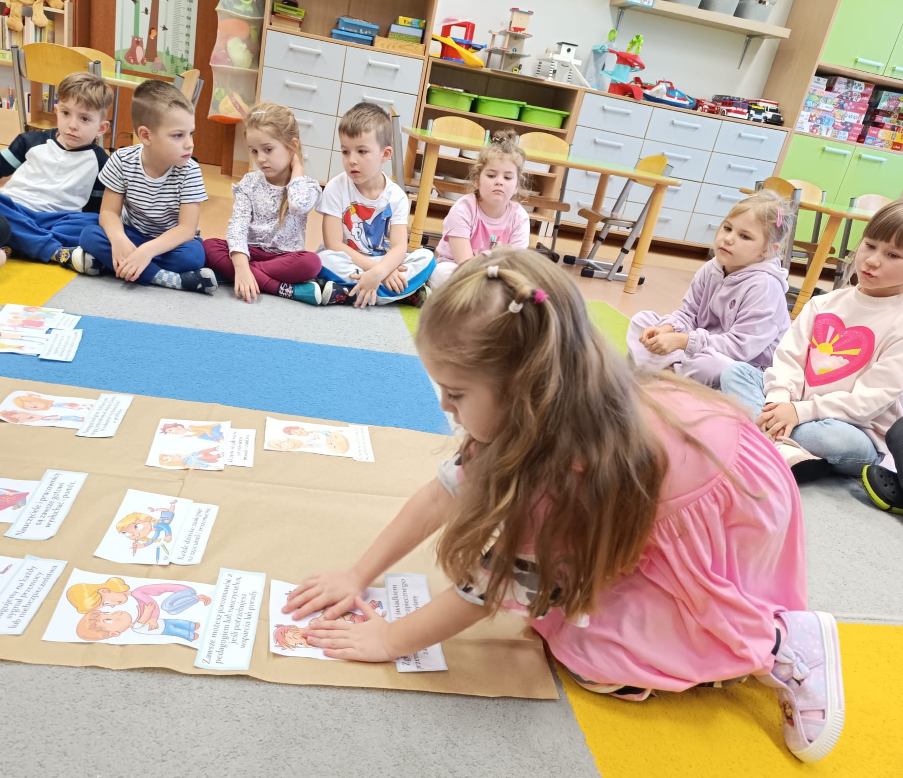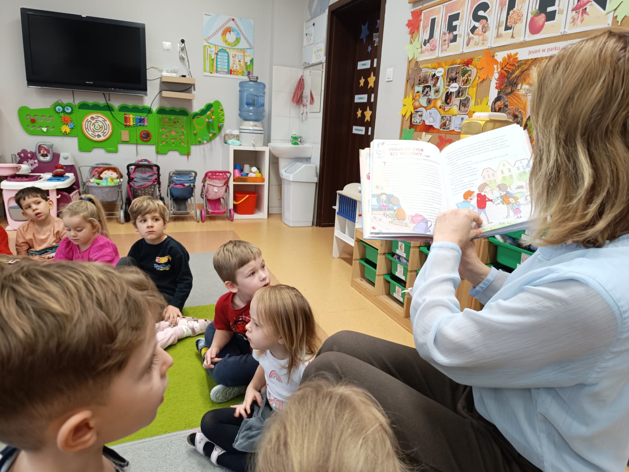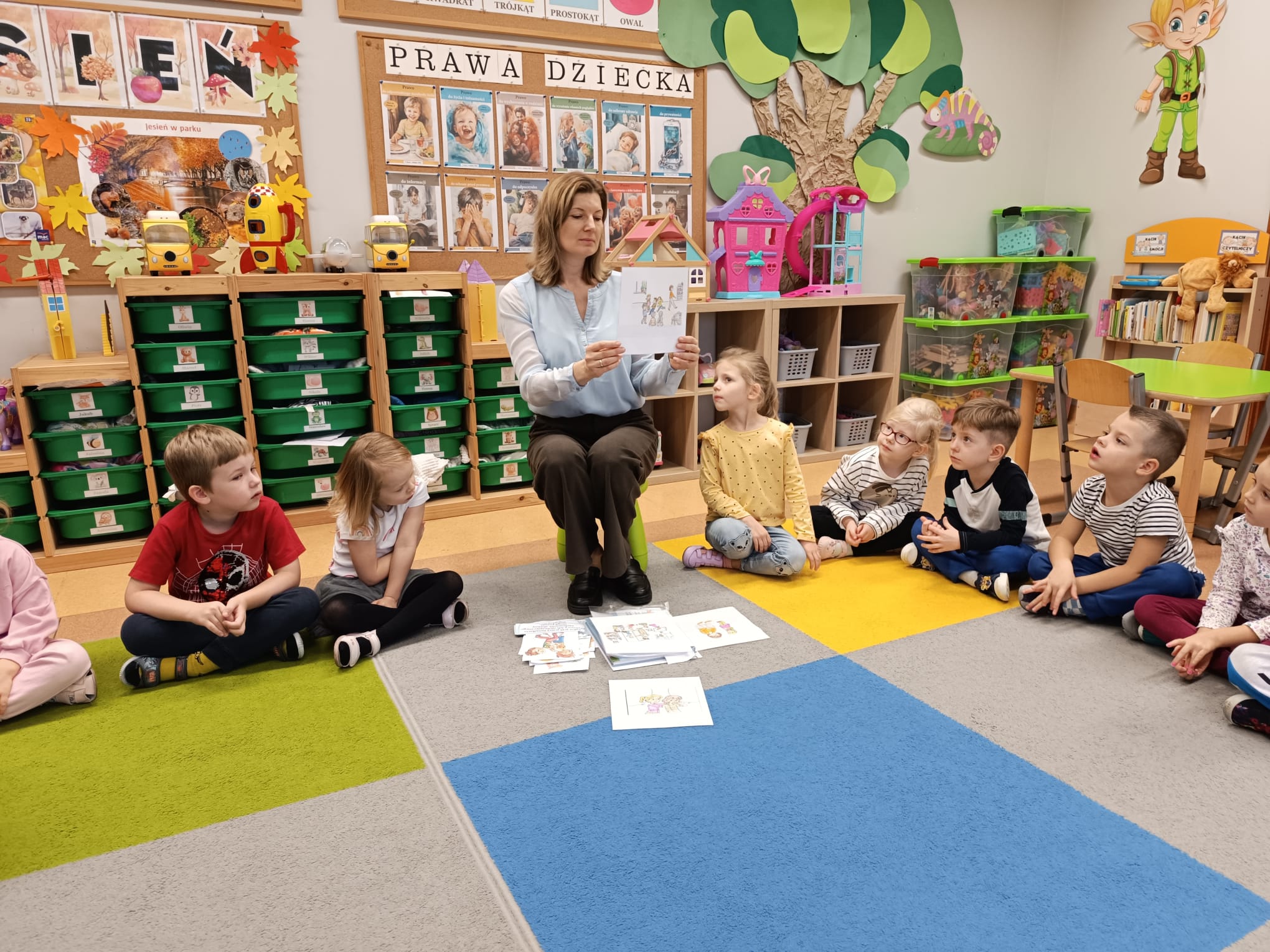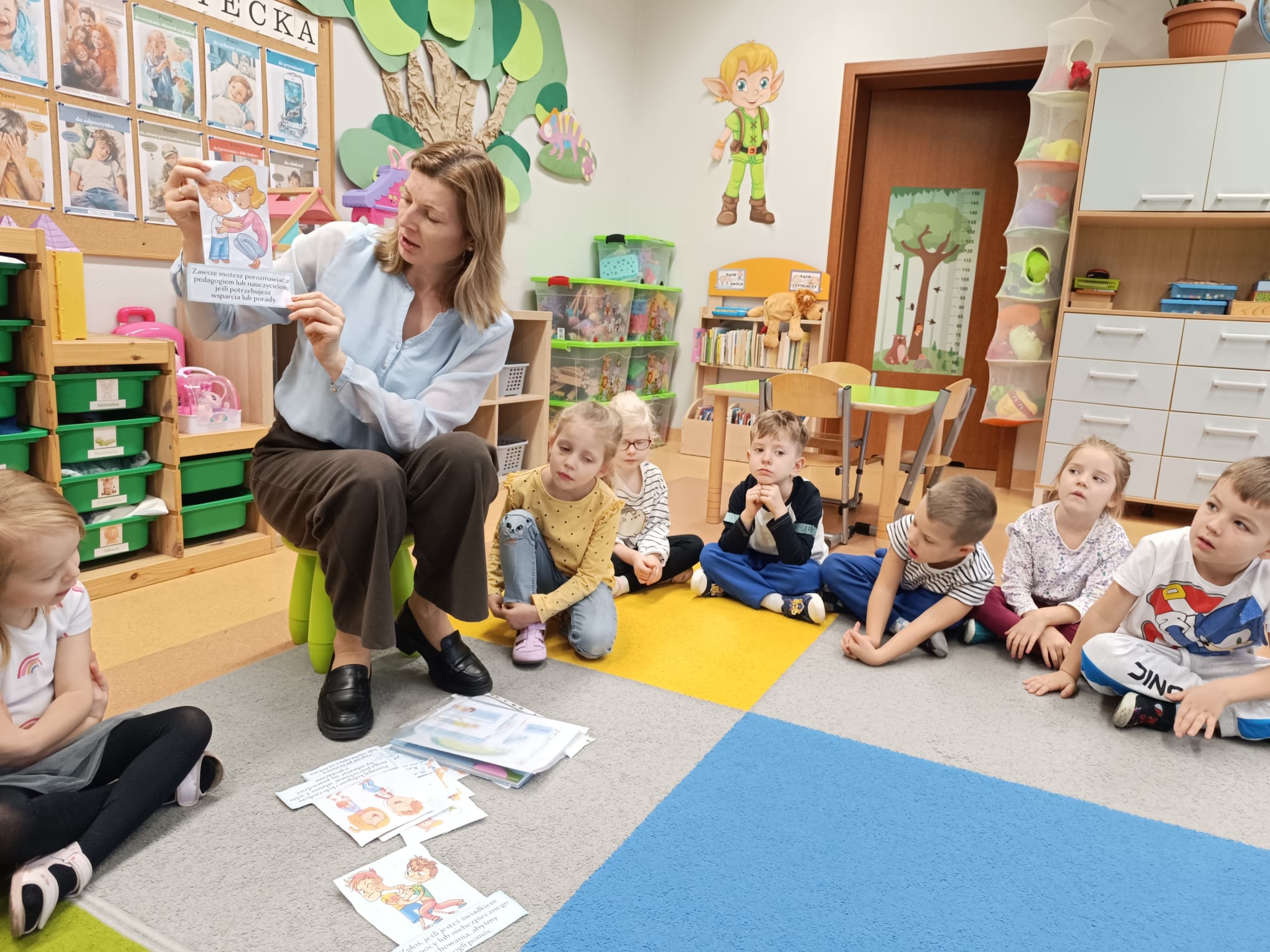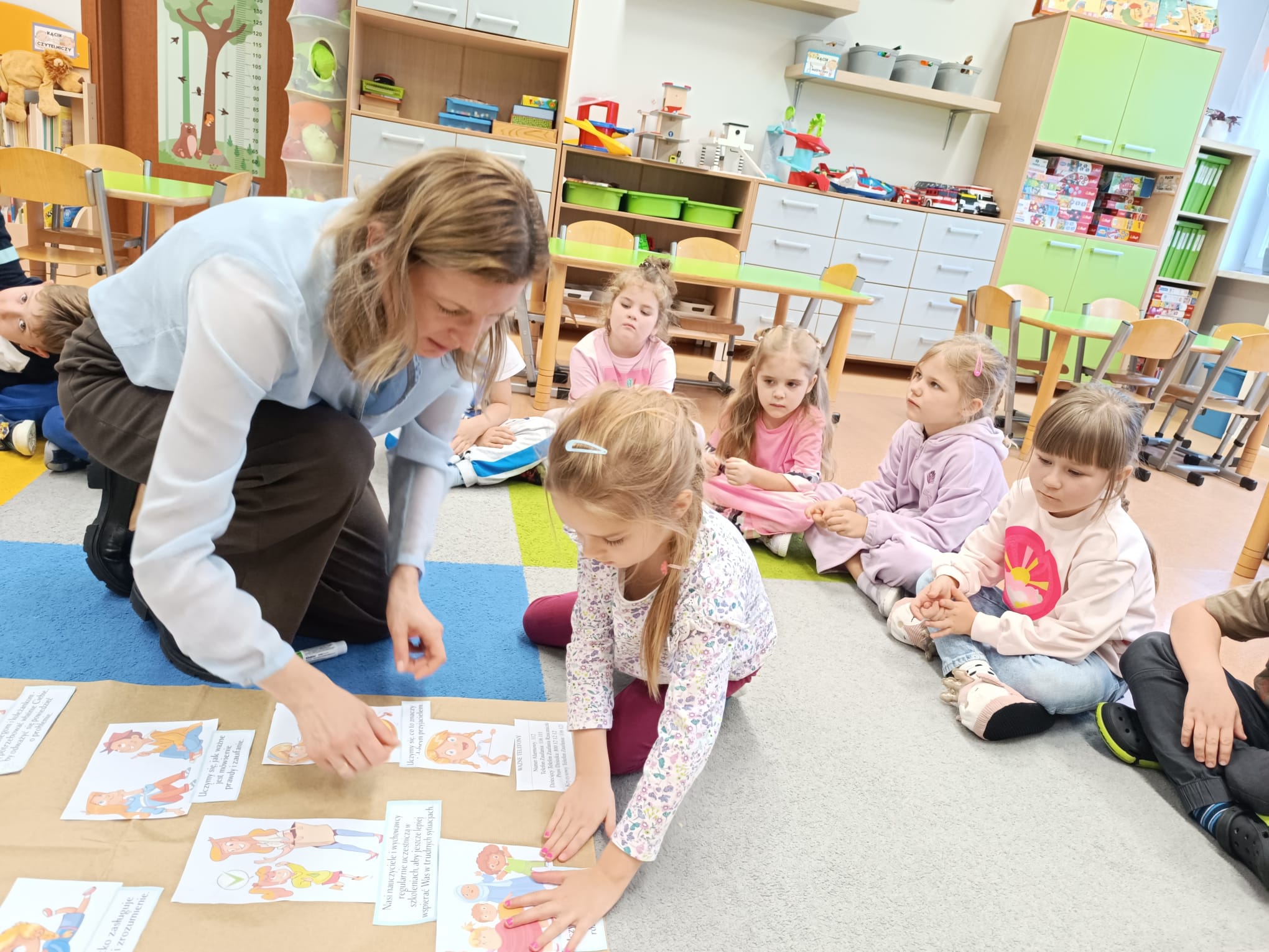 W dzisiejszym dniu dzieci z grupy XII uczestniczyły w zajęciach podczas których wysłuchały opowiadań z książki „12 ważnych praw – polscy autorzy o prawach dzieci” w ramach społecznej kampanii CPCD. Zajęcia, oparte na standardach ochrony małoletnich, pozwoliły dzieciom zrozumieć, jak reagować w sytuacjach niebezpiecznych oraz jak dbać o dobre relacje z rówieśnikami. Dzieci bardzo aktywnie uczestniczyły w zajęciach i chętnie dzieliły się swoimi doświadczeniami. Szczególnie dobrze zareagowały na historyjki, które pomogły im lepiej zrozumieć omawiane zasady. Na zakończenie zajęć dzieci wspólnie wykonały plakat, który zawierał najważniejsze zasady dotyczące ochrony małoletnich.