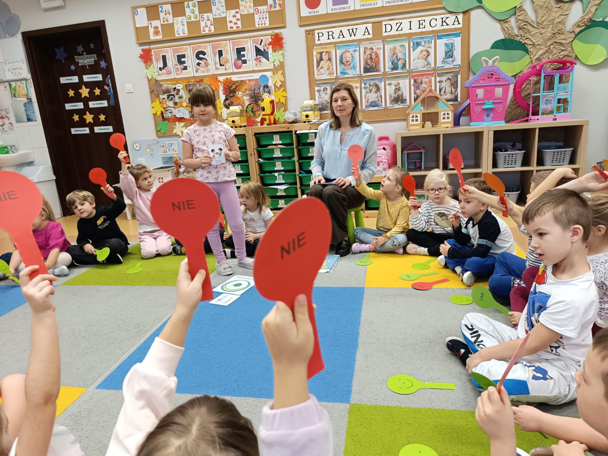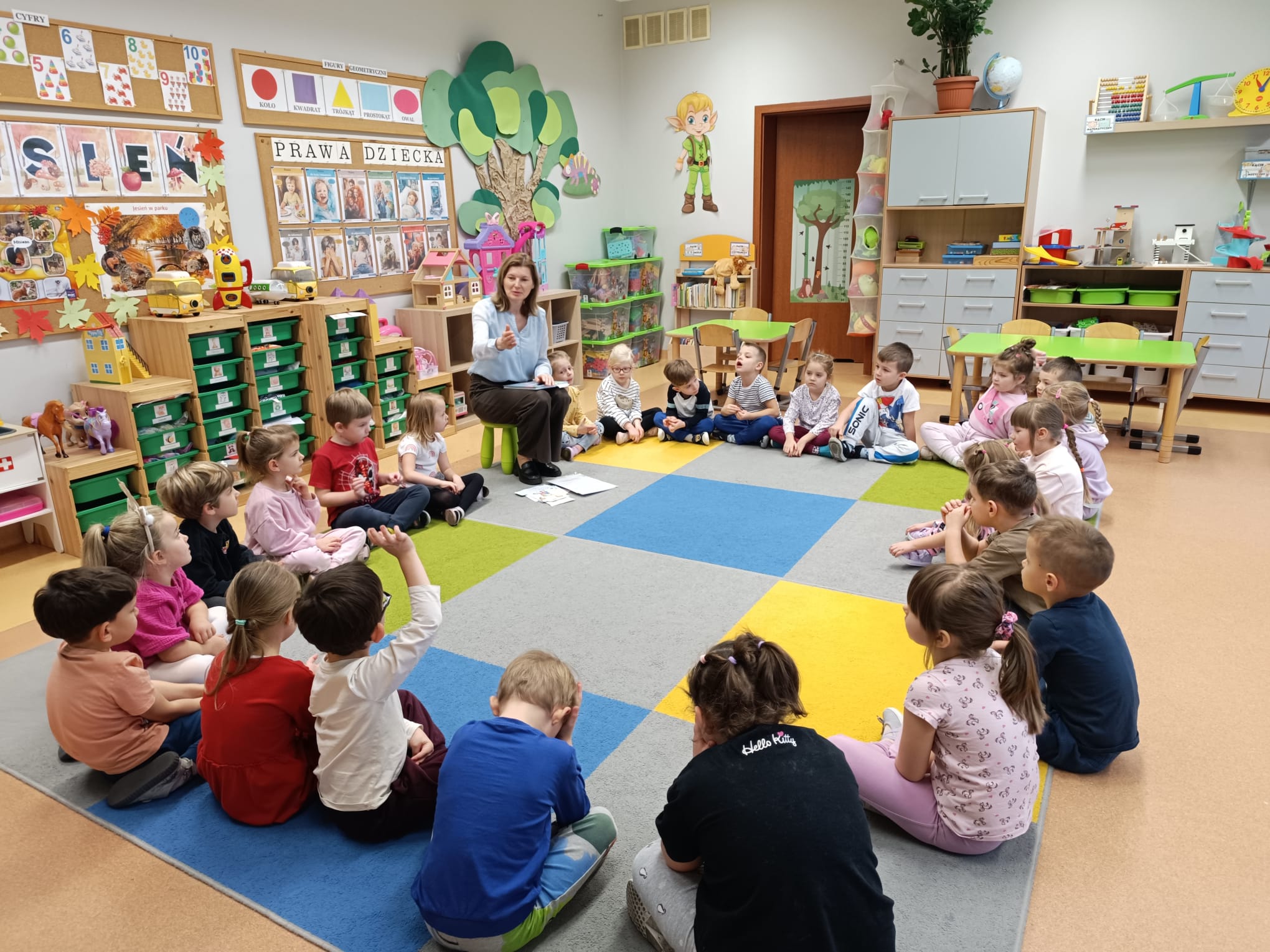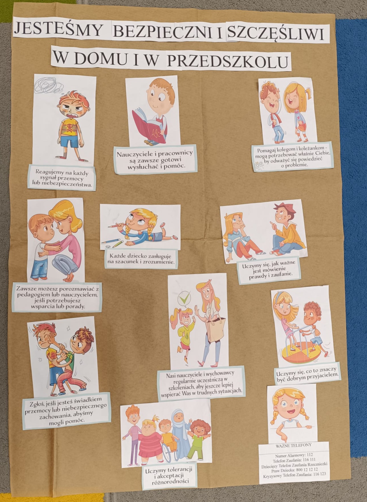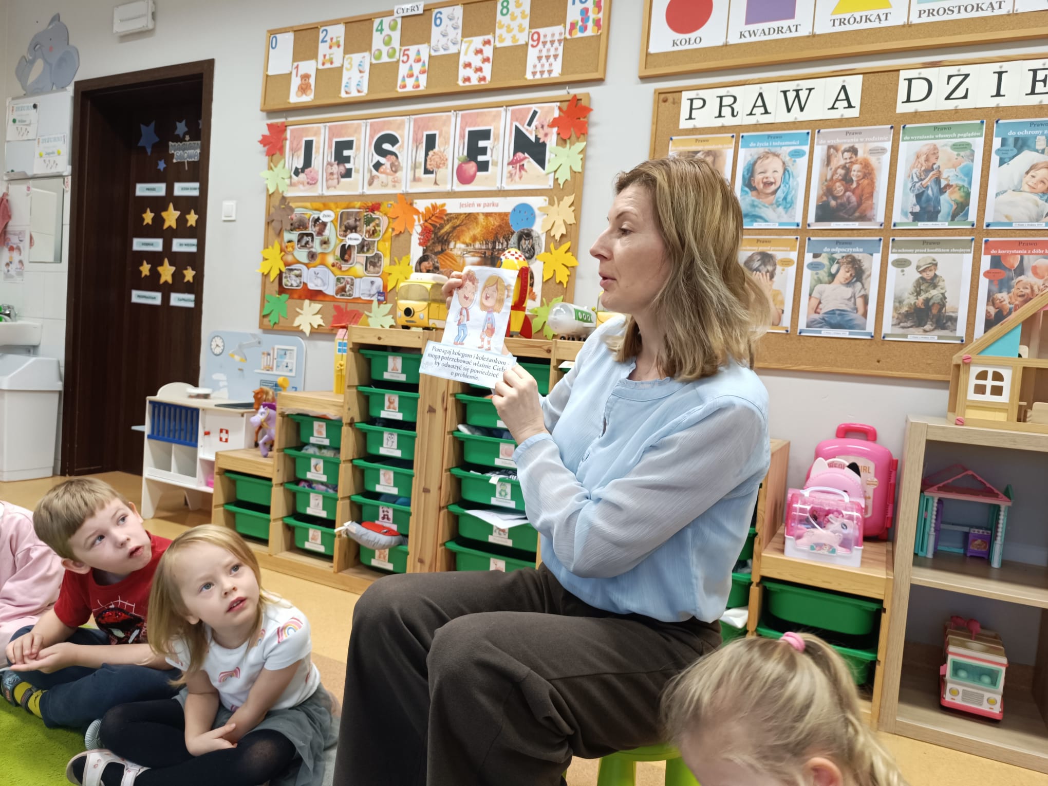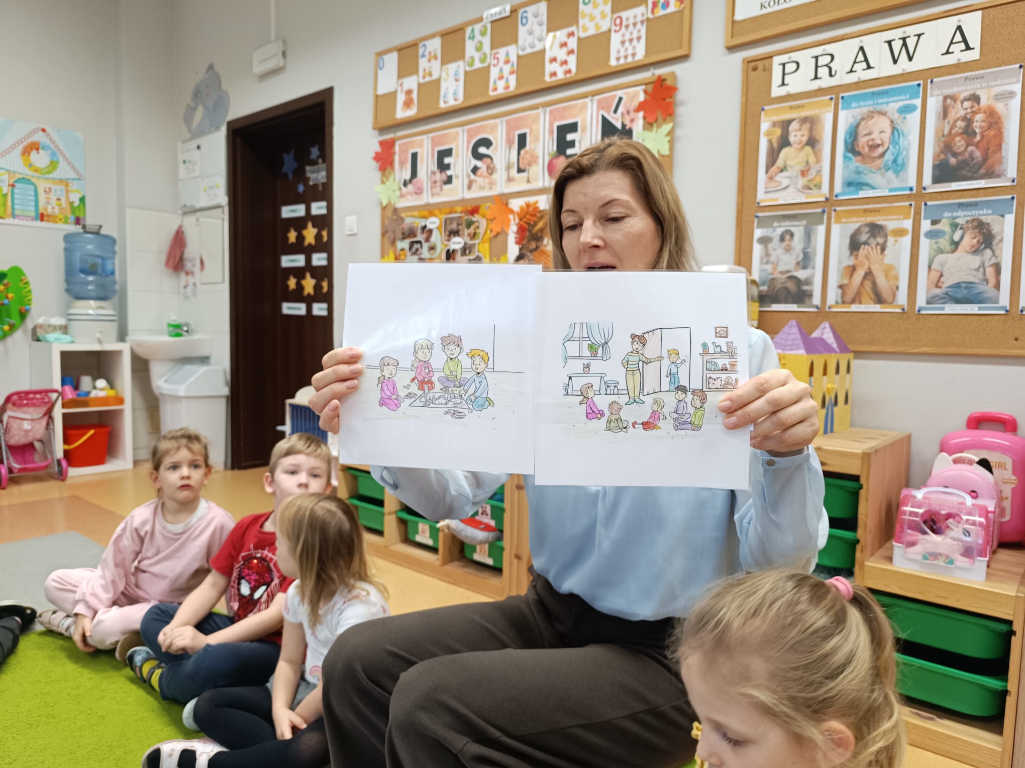W dzisiejszym dniu dzieci z grupy XII uczestniczyły w zajęciach podczas których wysłuchały opowiadań z książki „12 ważnych praw – polscy autorzy o prawach dzieci” w ramach społecznej kampanii CPCD. Zajęcia, oparte na standardach ochrony małoletnich, pozwoliły dzieciom zrozumieć, jak reagować w sytuacjach niebezpiecznych oraz jak dbać o dobre relacje z rówieśnikami. Dzieci bardzo aktywnie uczestniczyły w zajęciach i chętnie dzieliły się swoimi doświadczeniami. Szczególnie dobrze zareagowały na historyjki, które pomogły im lepiej zrozumieć omawiane zasady. Na zakończenie zajęć dzieci wspólnie wykonały plakat, który zawierał najważniejsze zasady dotyczące ochrony małoletnich.