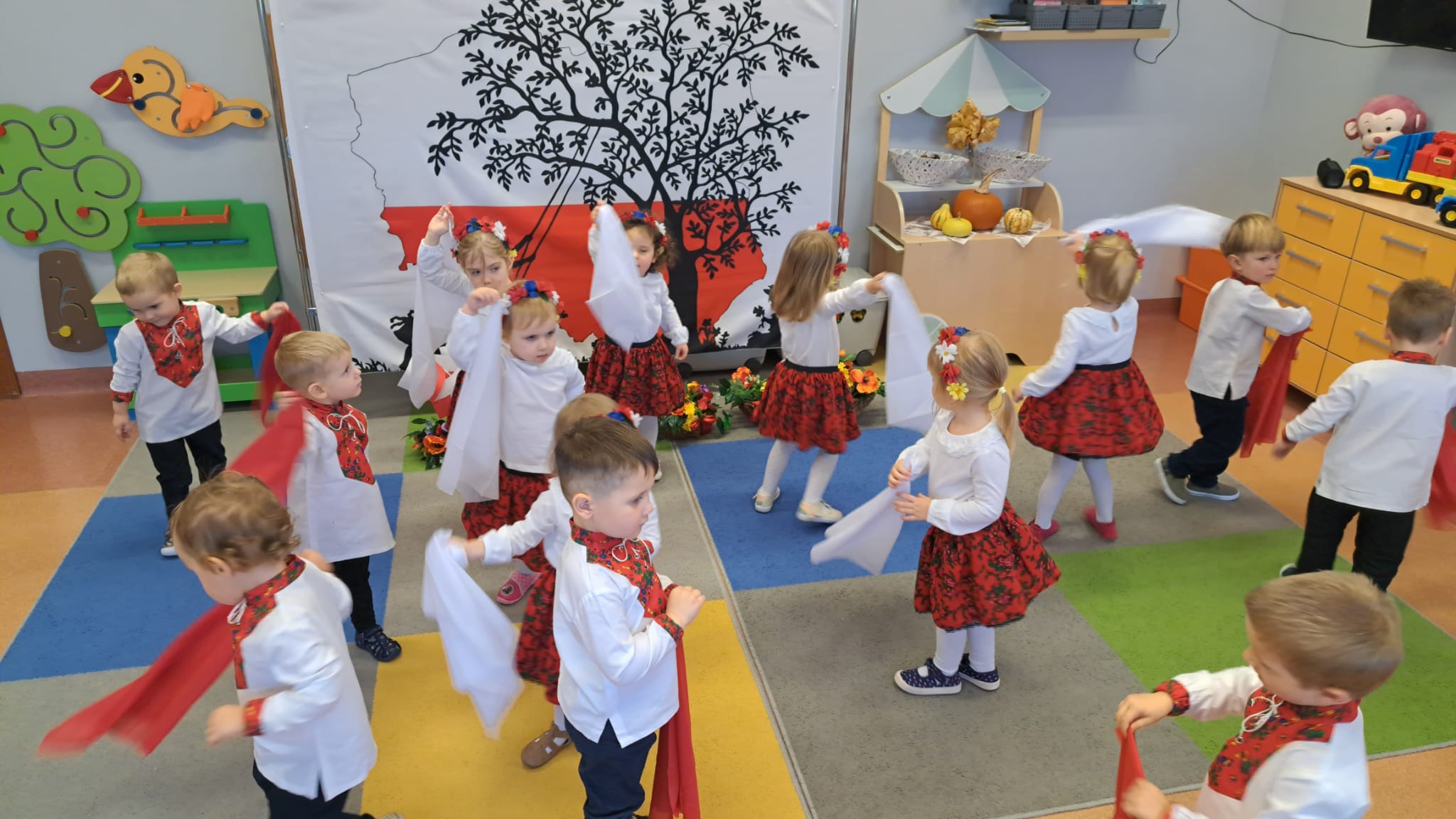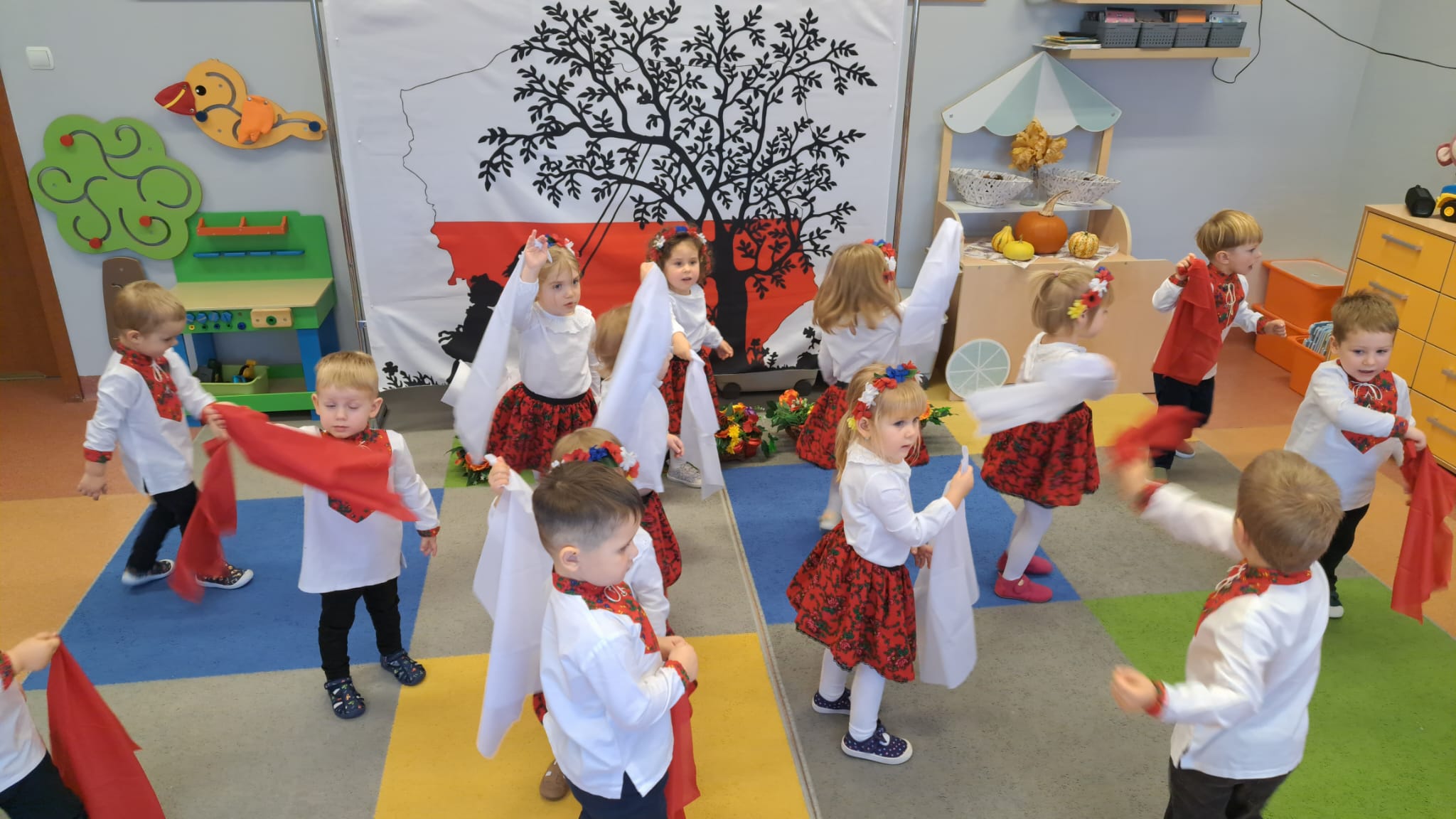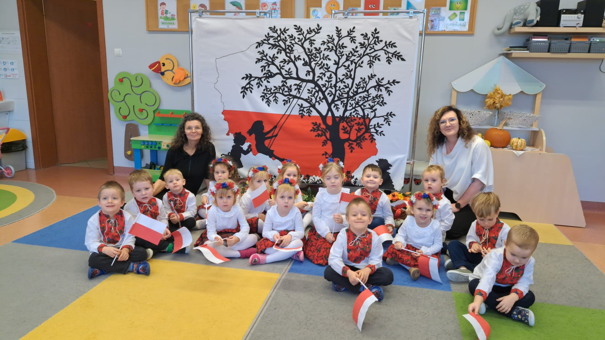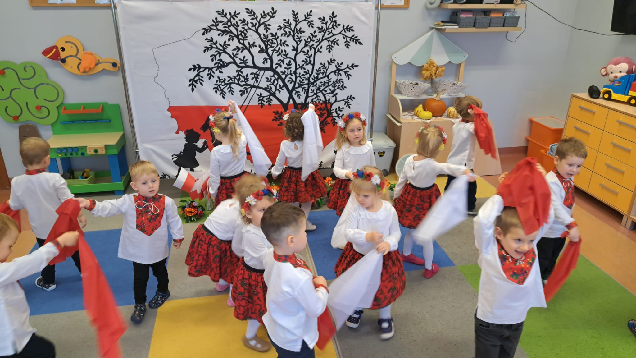 Listopad to jeden z tych miesięcy  w roku, kiedy częściej niż zwykle myślimy o patriotyzmie, Ojczyźnie, polskiej historii. A to za sprawą 11 listopada - Święta Niepodległości, które obchodzimy w przedszkolu co roku dla upamiętnienia rocznicy odzyskania przez Polskę niepodległości w 1918 roku po 123 latach rozbiorów. To nadchodzące święto stało się doskonałą okazją, aby już od najmłodszych lat uczyć nasze dzieci patriotyzmu, dumy z tego, że są Polakami, szacunku do własnej Ojczyzny, do symboli narodowych. Dziś  nasze maluszki przepięknie wystrojone z wielkim przejęciem i radością po raz pierwszy uroczyście świętowały ten wyjątkowy dla Nas – Polaków dzień…