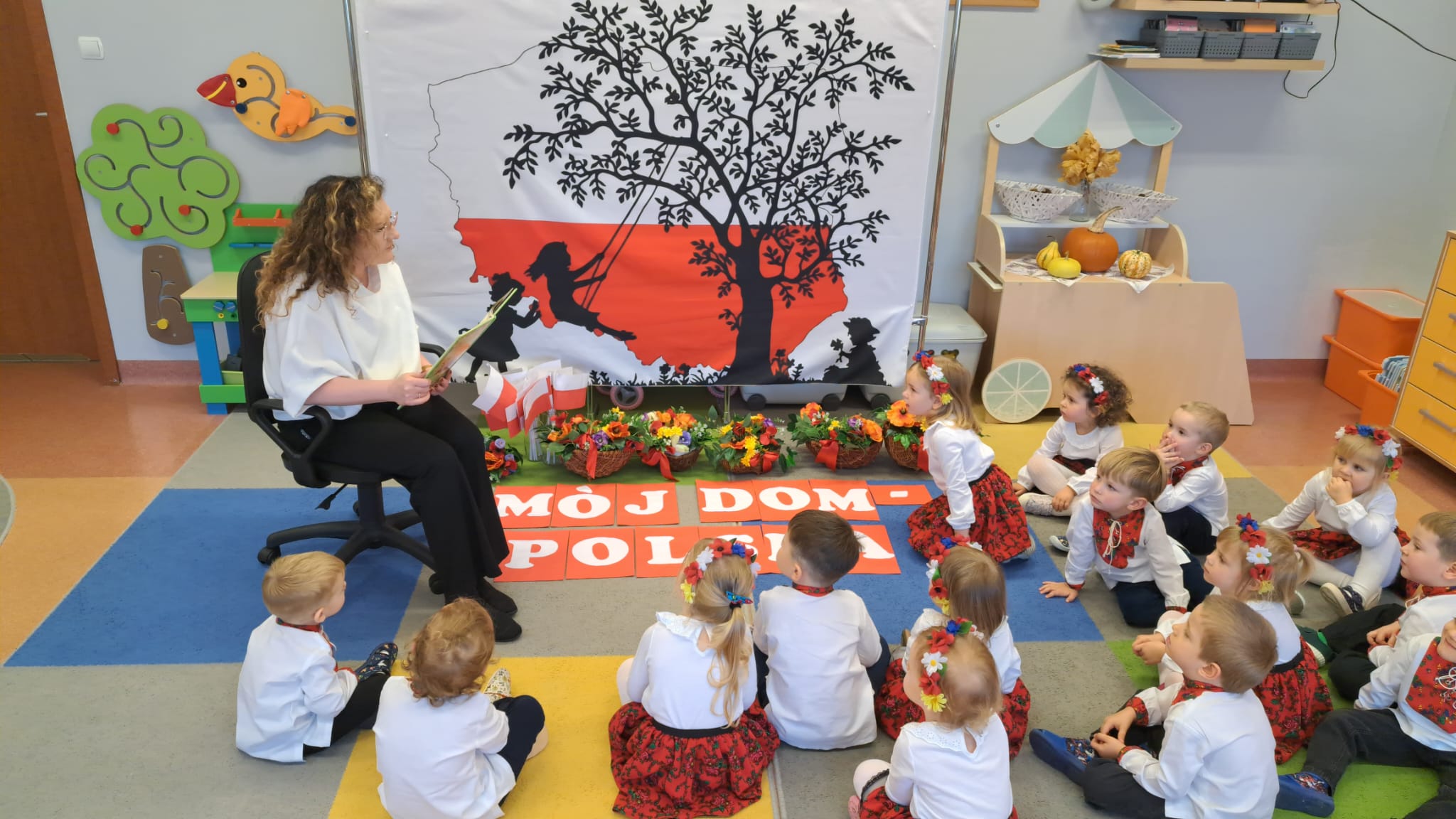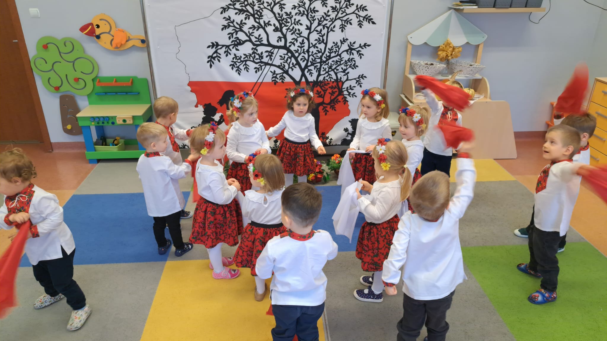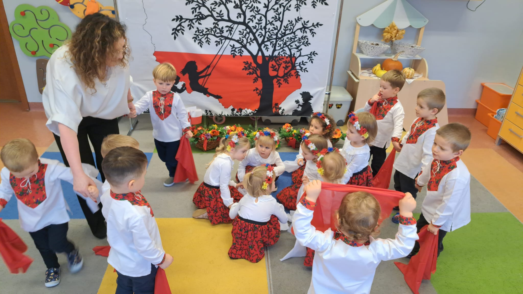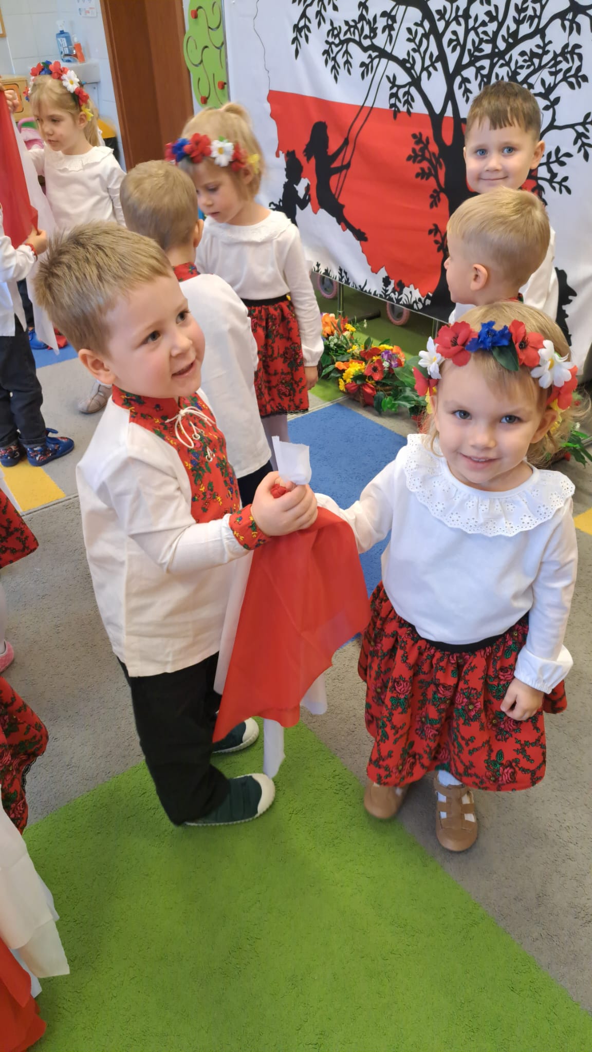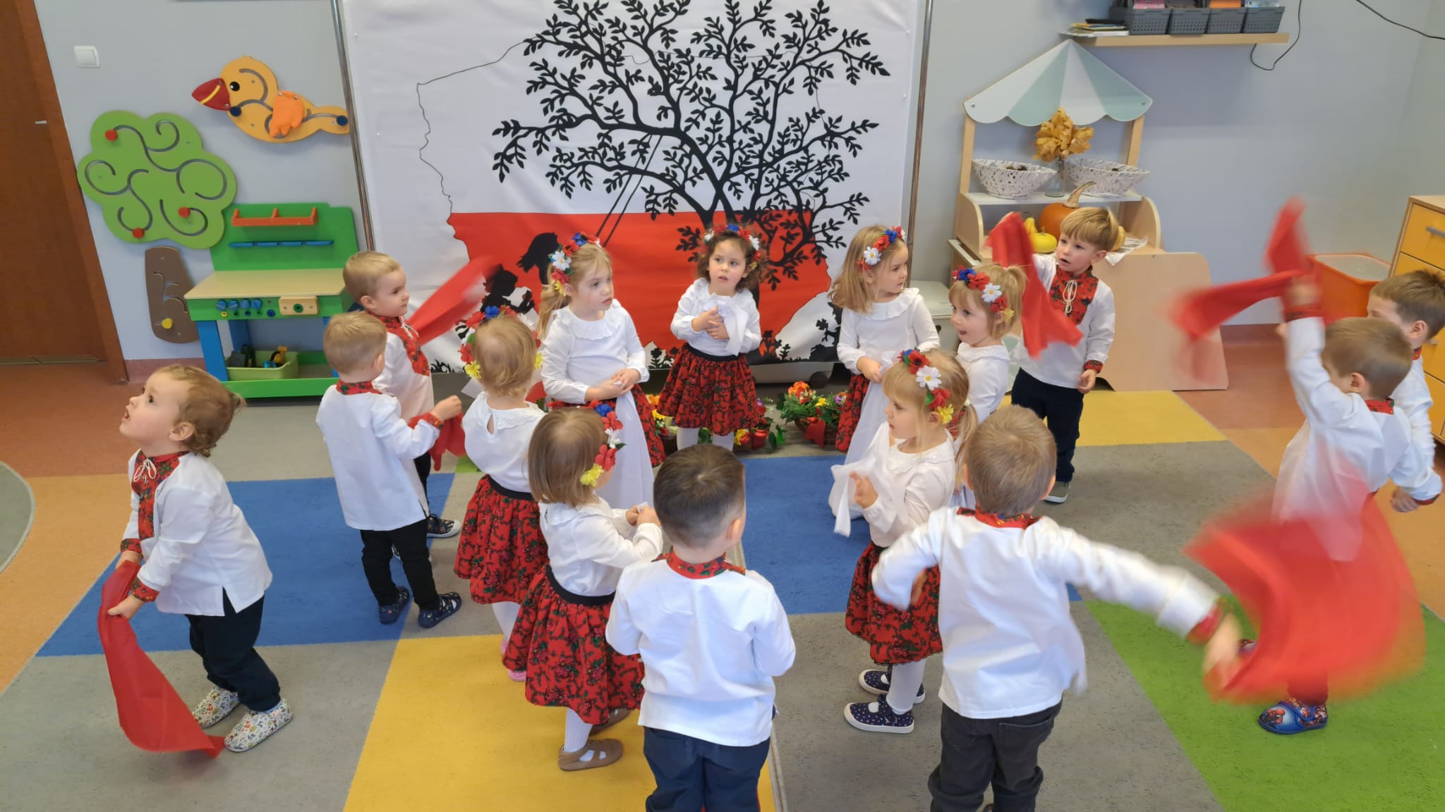 Listopad to jeden z tych miesięcy  w roku, kiedy częściej niż zwykle myślimy o patriotyzmie, Ojczyźnie, polskiej historii. A to za sprawą 11 listopada - Święta Niepodległości, które obchodzimy w przedszkolu co roku dla upamiętnienia rocznicy odzyskania przez Polskę niepodległości w 1918 roku po 123 latach rozbiorów. To nadchodzące święto stało się doskonałą okazją, aby już od najmłodszych lat uczyć nasze dzieci patriotyzmu, dumy z tego, że są Polakami, szacunku do własnej Ojczyzny, do symboli narodowych. Dziś  nasze maluszki przepięknie wystrojone z wielkim przejęciem i radością po raz pierwszy uroczyście świętowały ten wyjątkowy dla Nas – Polaków dzień…