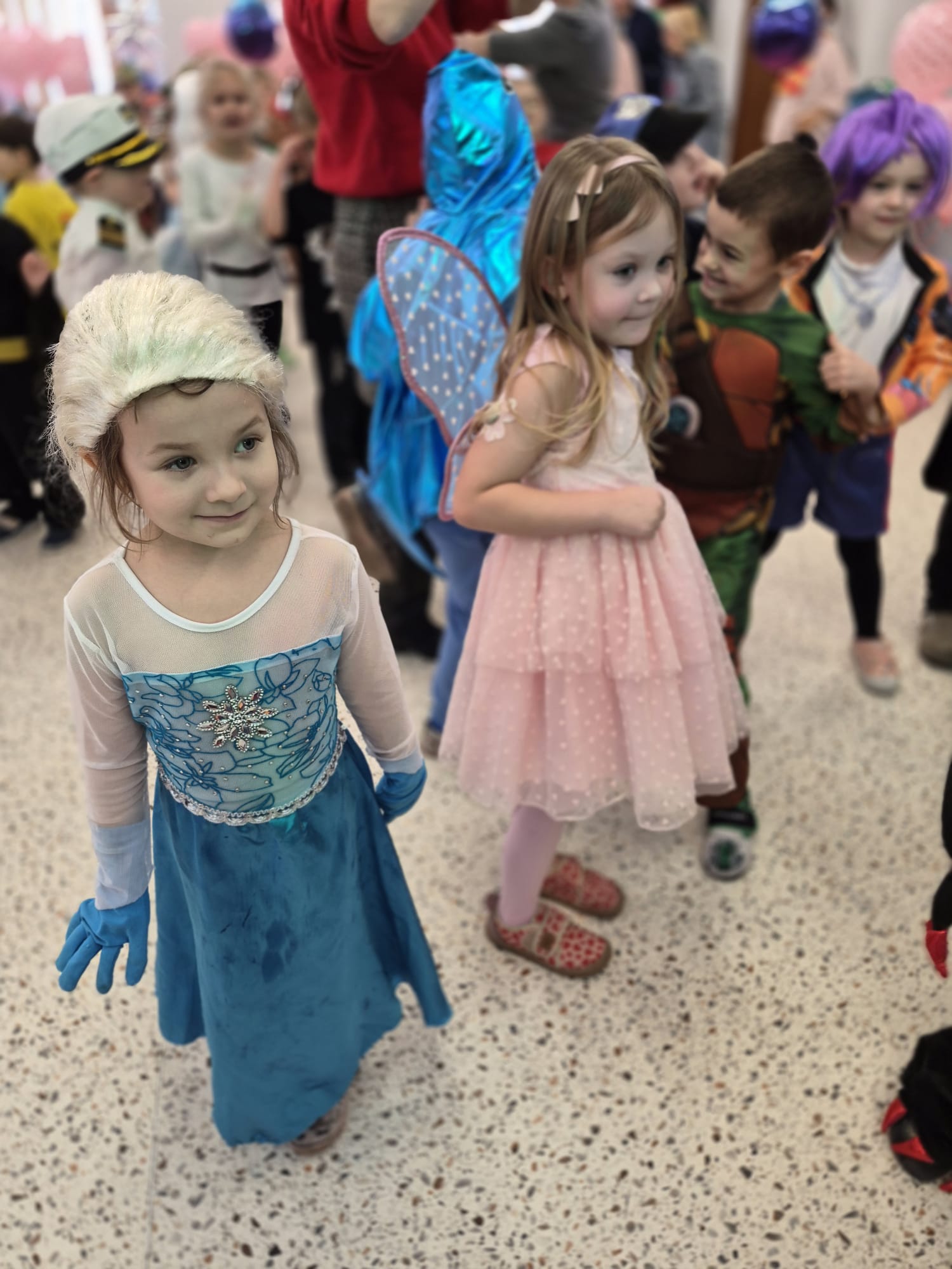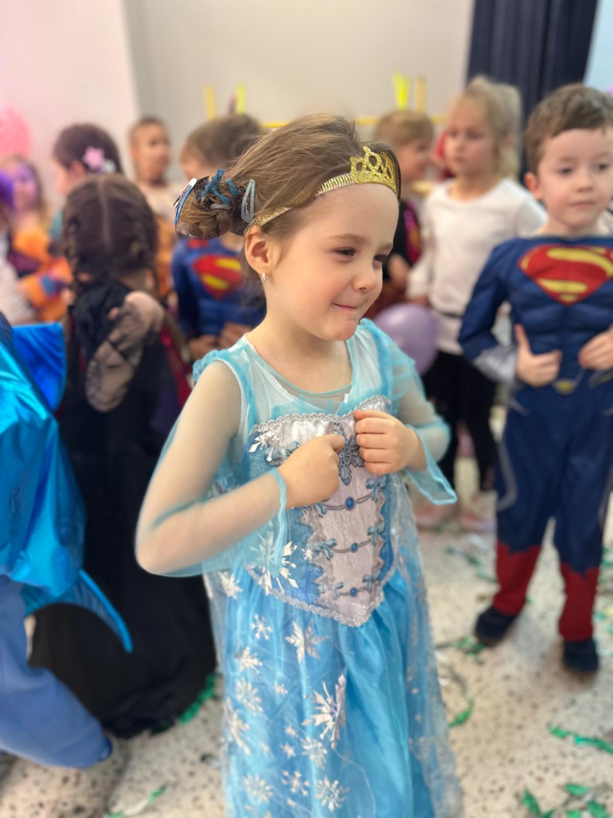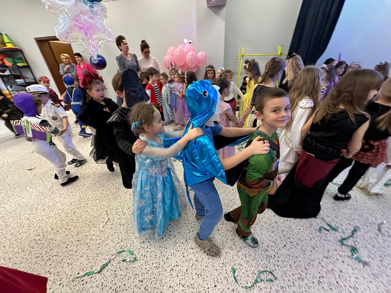 Tego dnia przedszkolna sala gimnastyczna zamieniła się w barwną, pełną karnawałowych dekoracji przestrzeń. Dzieci przyszły w przepięknych, pomysłowych strojach – można było spotkać księżniczki, policjantów, superbohaterów, zwierzątka oraz wiele bajkowych postaci. Wspólne tańce przy muzyce, zabawy integracyjne oraz konkursy sprawiły, że atmosfera była niezwykle radosna i pełna energii.