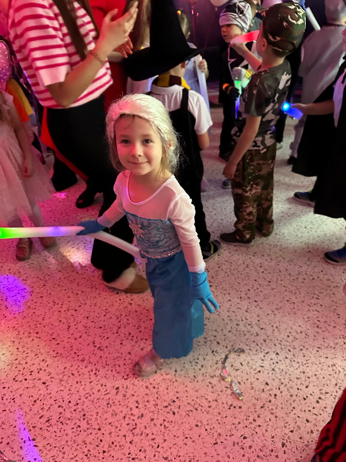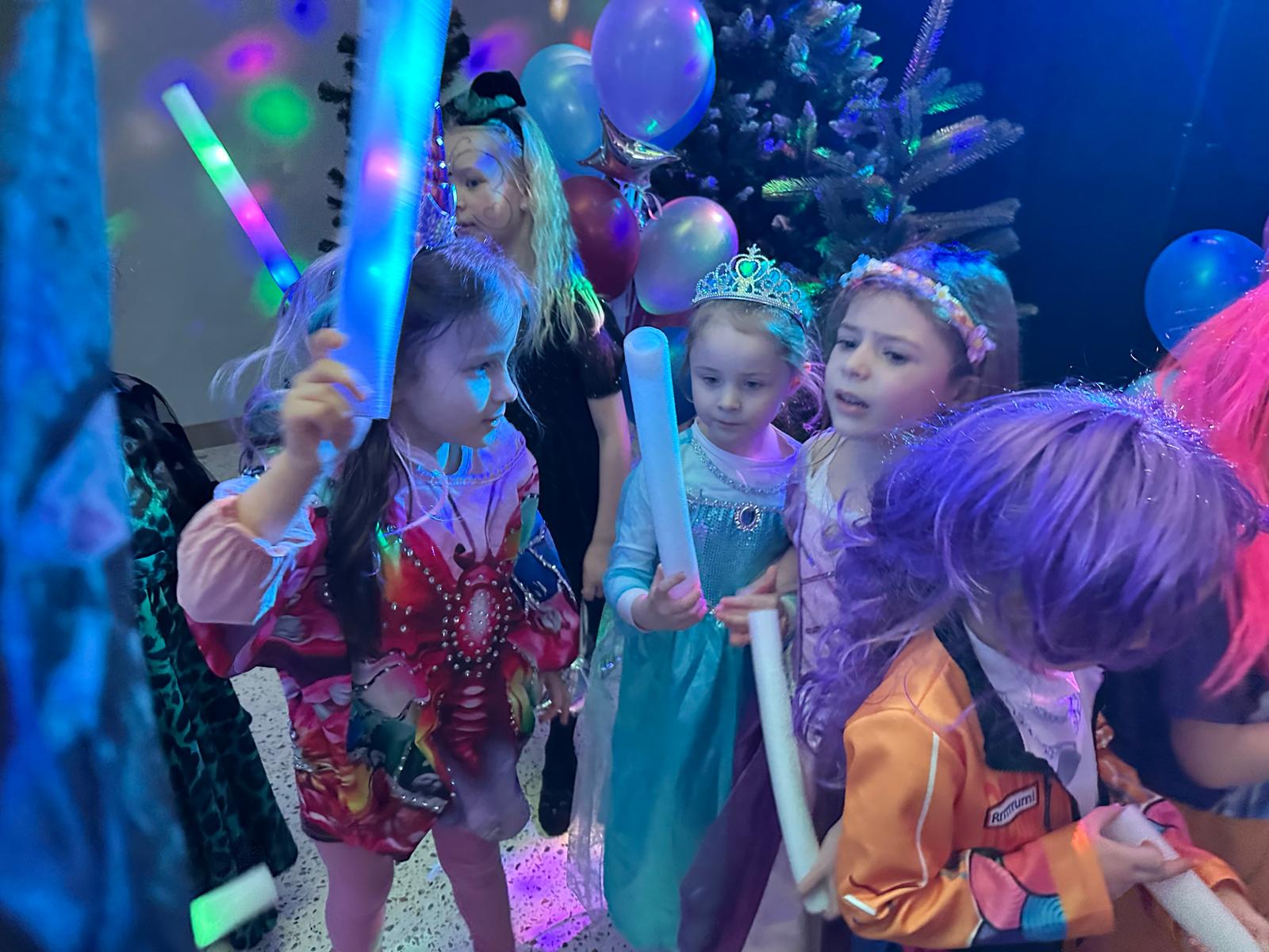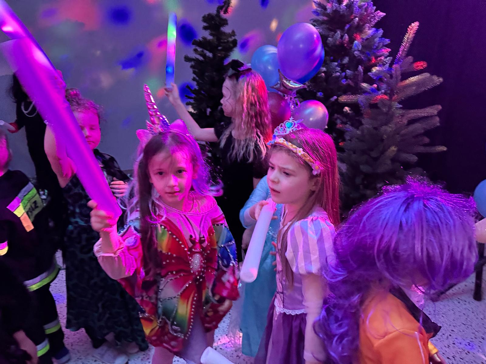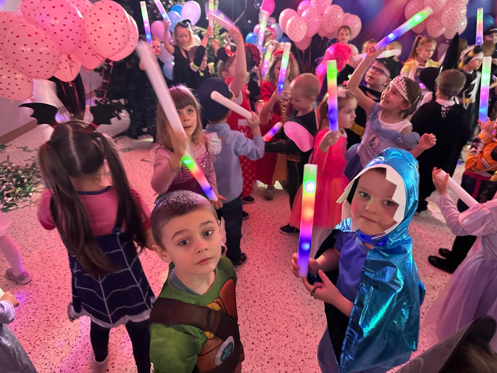 Nie zabrakło także wspaniałych zabaw z magicznymi świecącymi pałeczkami, czy wesołych konkursów do znanych i lubianych przez dzieci utworów z dziecięcych playlist. Wspólne zabawy poprzedzone zostały słodkim poczęstunkiem i wspólnymi rozmowami o bohaterach ze swoich kostiumów.