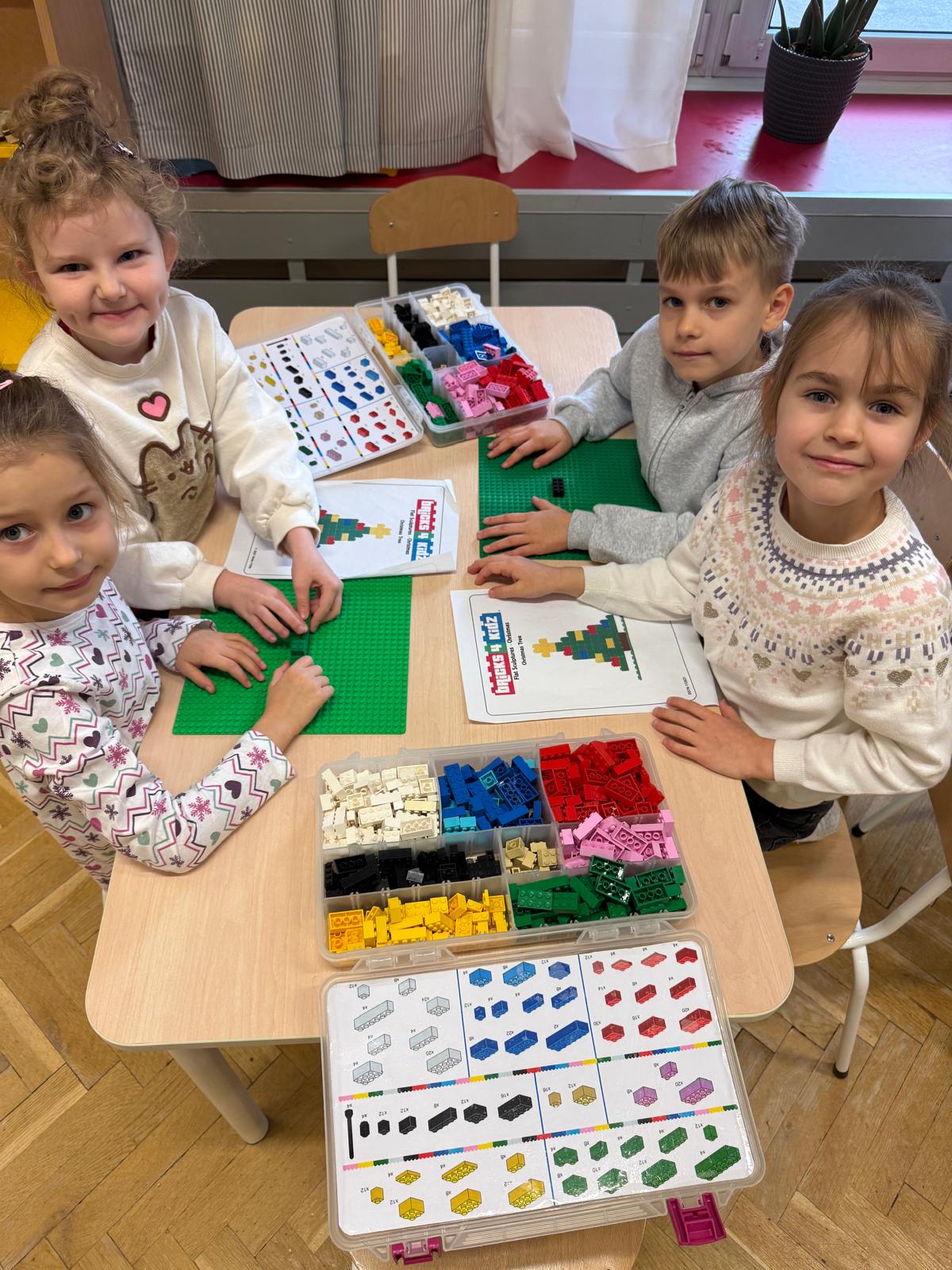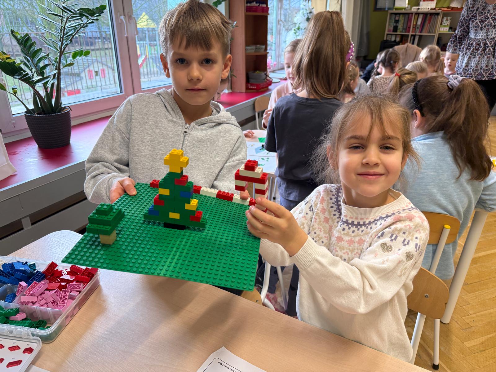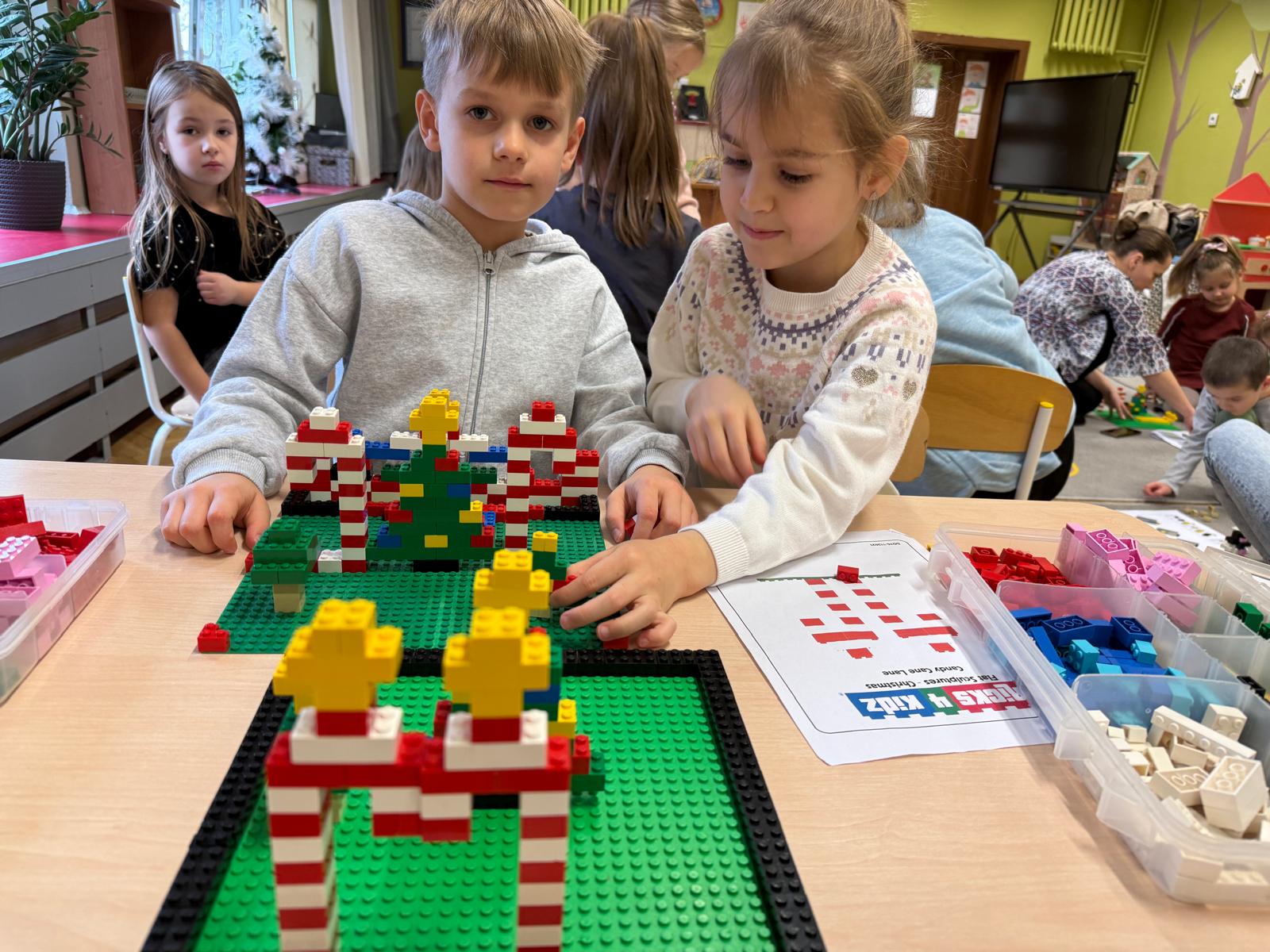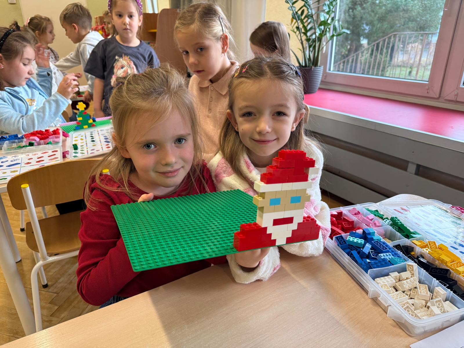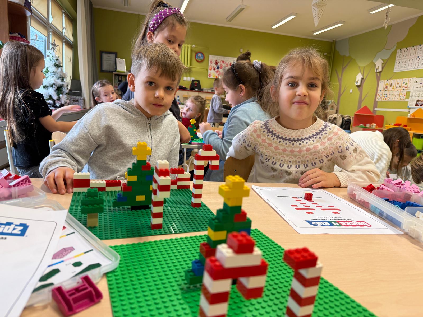W naszej grupie odbyły się niezwykłe warsztaty, które wprowadziły dzieci w świąteczny klimat i pozwoliły im twórczo przygotować się do nadchodzących Świąt Bożego Narodzenia. Celem spotkania było rozwijanie kreatywności dzieci, poszerzanie ich wiedzy o tradycjach bożonarodzeniowych oraz kształtowanie umiejętności konstrukcyjnych poprzez budowanie modeli z klocków LEGO. Podczas zajęć dzieci z zaangażowaniem opowiadały o Świętach Bożego Narodzenia, wieczerzy wigilijnej, potrawach, zwyczajach i rodzinnych tradycjach. Wspólna rozmowa pozwoliła im lepiej zrozumieć sens świątecznych obrzędów i podzielić się własnymi doświadczeniami. Następnie przedszkolaki zamieniły się w małych konstruktorów Fabryki Świętego Mikołaja. Z klocków LEGO budowały choinki, Mikołaja, bałwana, sanie, renifery oraz inne elementy związane ze świętami. Każde dziecko miało okazję stworzyć własny, niepowtarzalny model, wykazując się wyobraźnią i kreatywnością. Warsztaty przyniosły wiele radości, a dzieci utrwaliły wiedzę o tradycjach bożonarodzeniowych, rozwinęły umiejętności konstrukcyjne i współpracy, a także wzbogaciły swoją wyobraźnię przestrzenną. Spotkanie pozwoliło im poczuć magię świąt i z dumą prezentować swoje wyjątkowe prace.