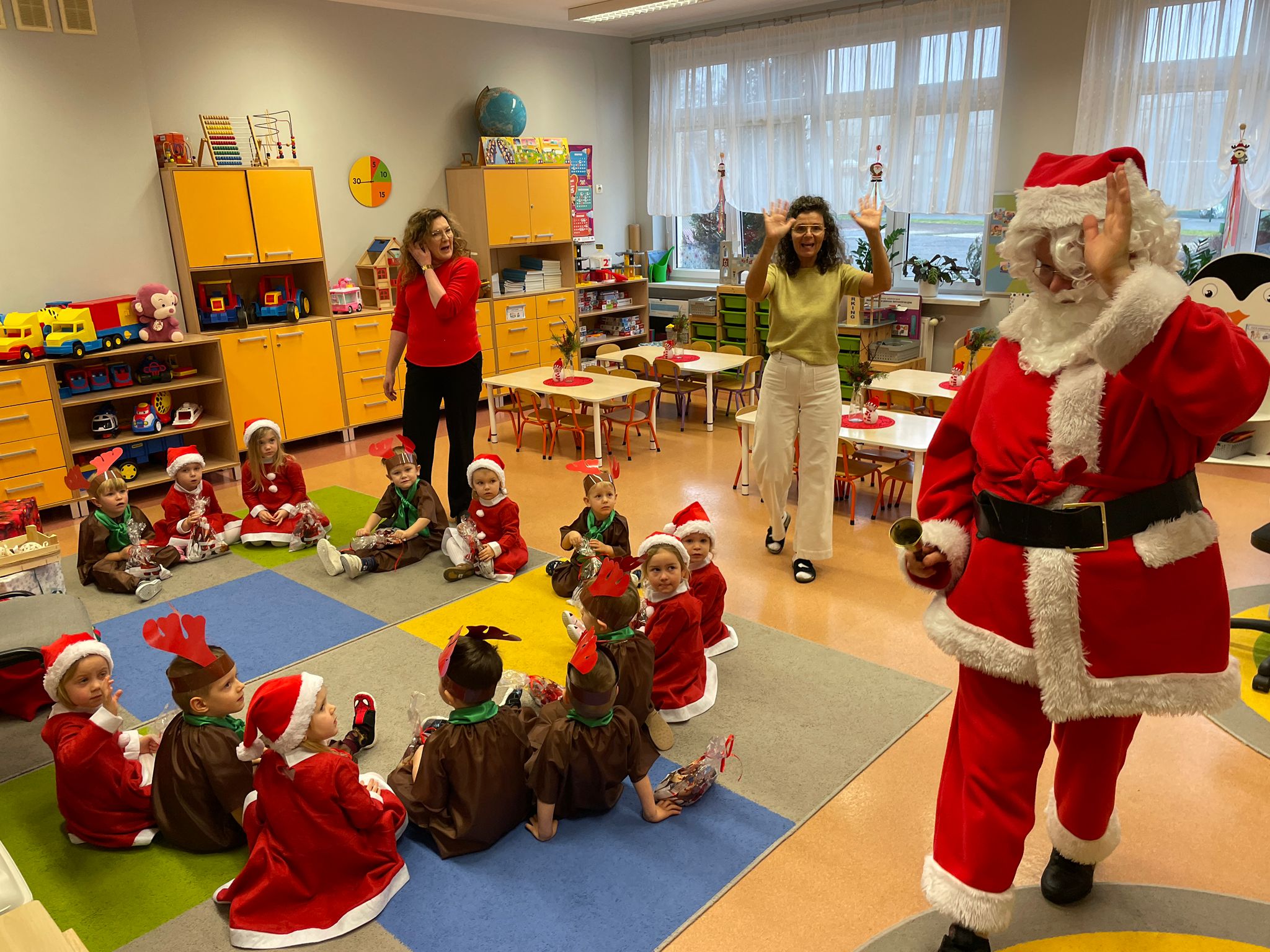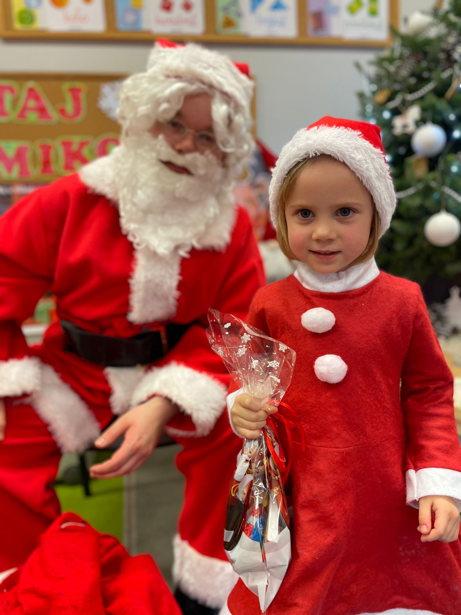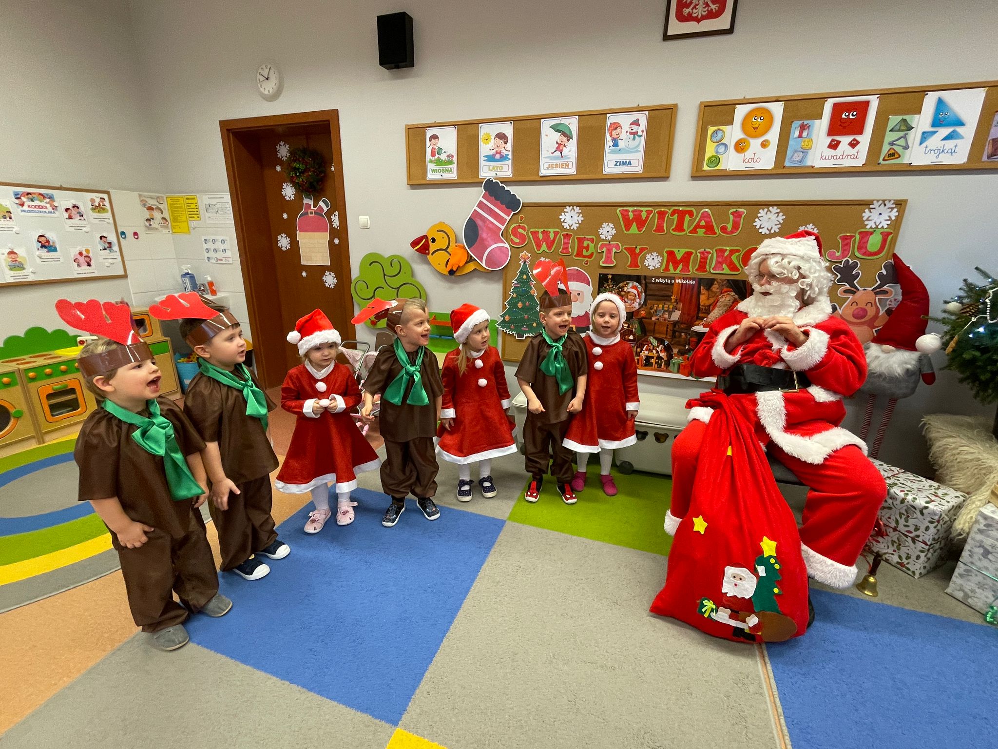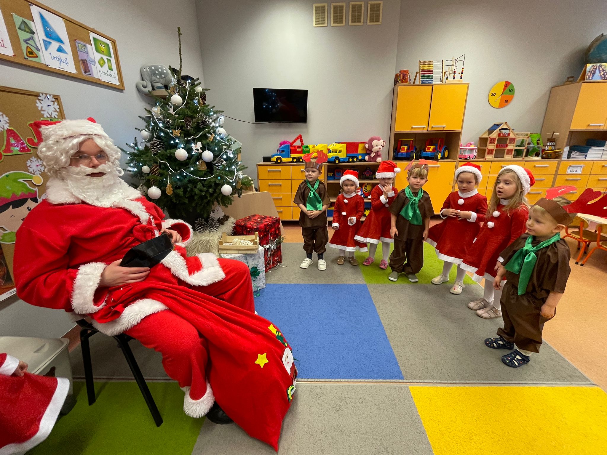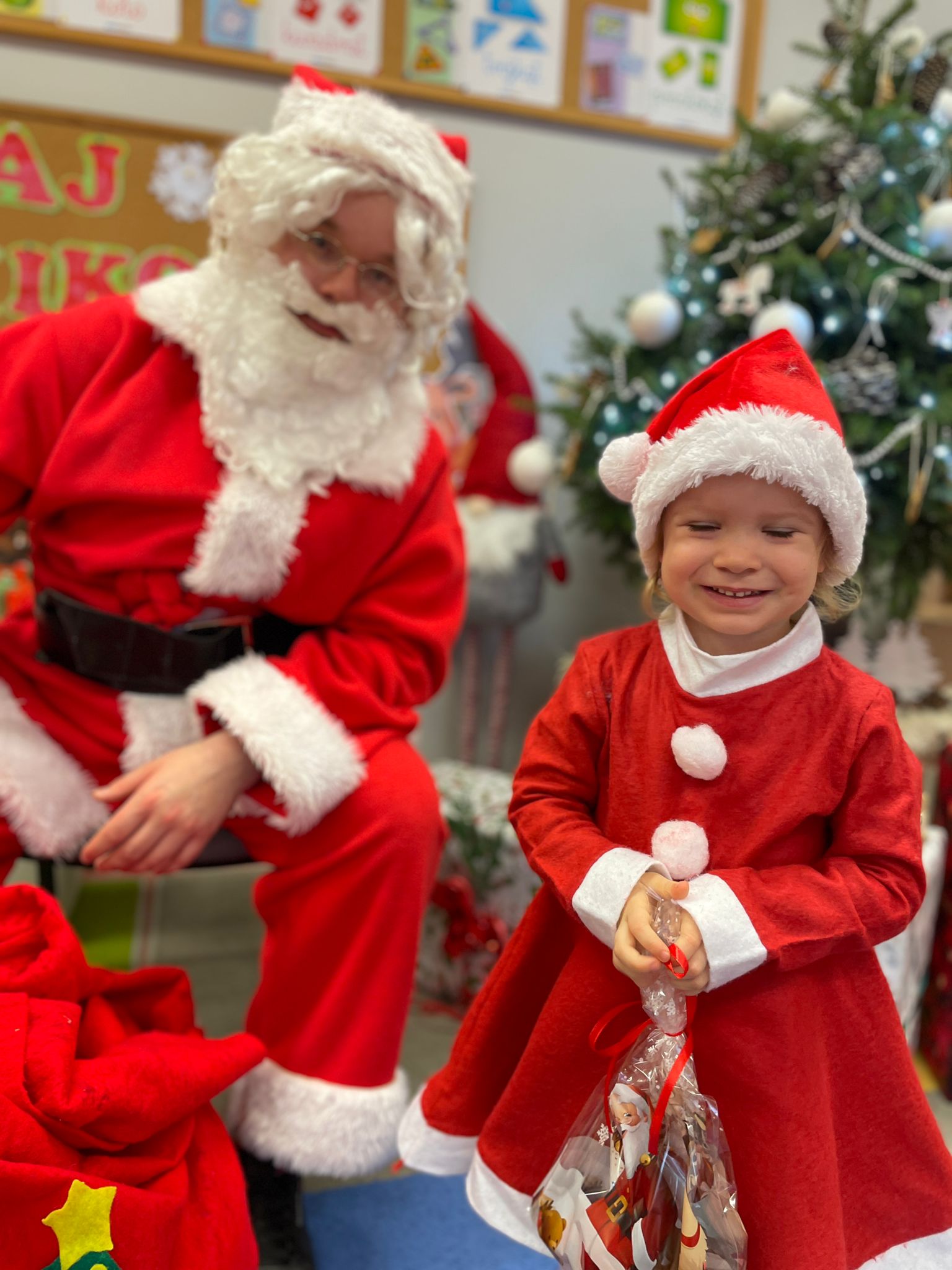 Dziś maluszki z niecierpliwością oczekiwały na wizytę Świętego Mikołaja w naszej przedszkolnej sali. Wszystkie dzieci już od samego rana spoglądały w okno, nasłuchiwały „Mikołajowych” dzwoneczków i radosną piosenką zapraszały Mikołaja. Wyczarowały także świąteczny klimat i wspólnie ubrały choinkę, przy której później wesoło się bawiły. Święty Mikołaj nie zawiódł i i nie kazał długo na siebie czekać… Wszedł ze swoim tubalnym „Ho, Ho, Ho „…I z pewnością też był bardzo zadowolony ze spotkania, bo uśmiech nie znikał z jego twarzy. Dzieci długo wspominały chwile spędzone z Mikołajem, z dużym entuzjazmem rozpakowywały prezenty oraz zerkały przez okno z nadzieją, że jeszcze raz zobaczą naszego gościa i pomachają mu na pożegnanie.