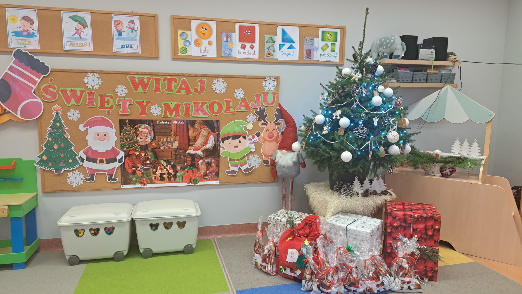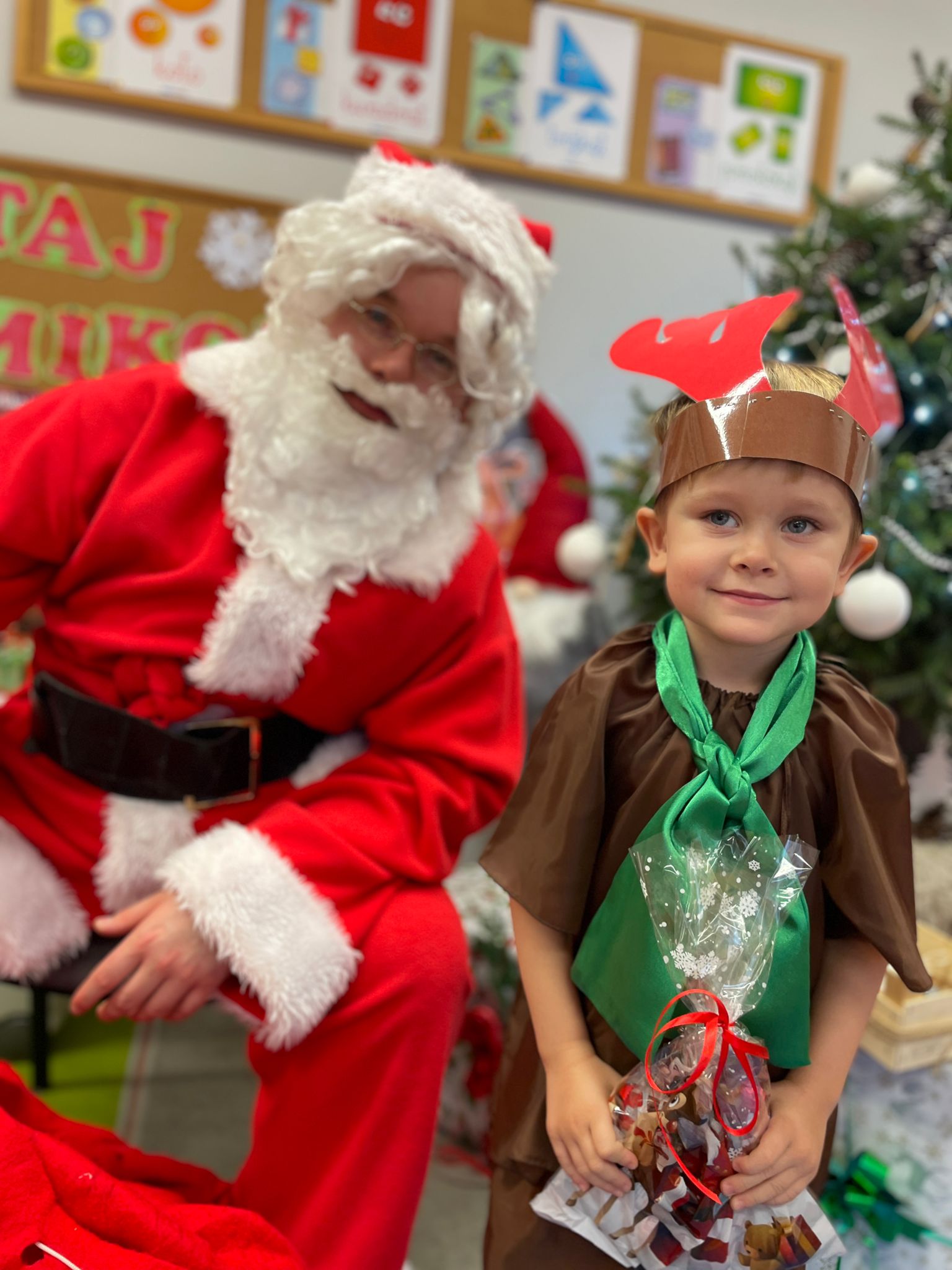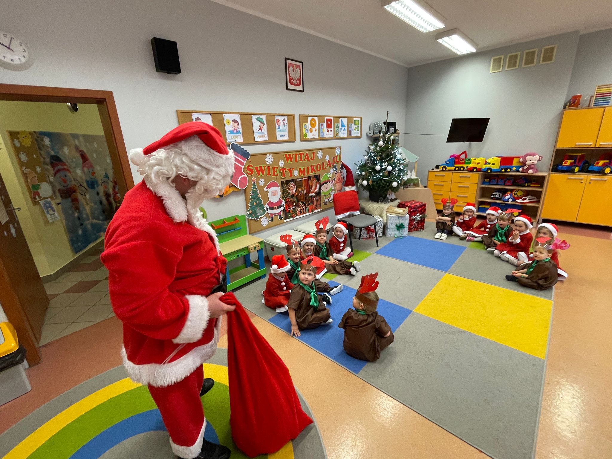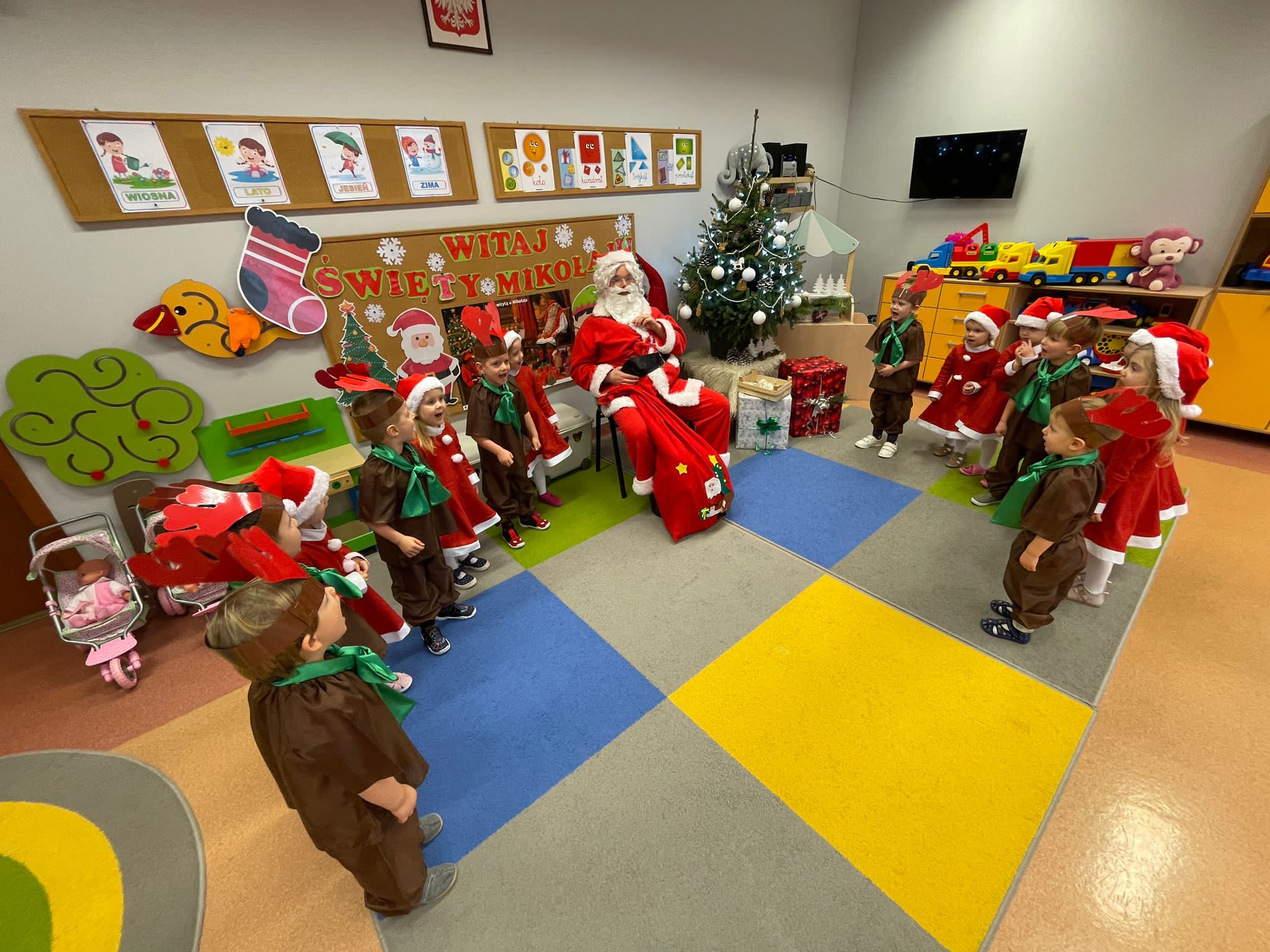Dziś maluszki z niecierpliwością oczekiwały na wizytę Świętego Mikołaja w naszej przedszkolnej sali. Wszystkie dzieci już od samego rana spoglądały w okno, nasłuchiwały „Mikołajowych” dzwoneczków i radosną piosenką zapraszały Mikołaja. Wyczarowały także świąteczny klimat i wspólnie ubrały choinkę, przy której później wesoło się bawiły. Święty Mikołaj nie zawiódł i i nie kazał długo na siebie czekać… Wszedł ze swoim tubalnym „Ho, Ho, Ho „…I z pewnością też był bardzo zadowolony ze spotkania, bo uśmiech nie znikał z jego twarzy. Dzieci długo wspominały chwile spędzone z Mikołajem, z dużym entuzjazmem rozpakowywały prezenty oraz zerkały przez okno z nadzieją, że jeszcze raz zobaczą naszego gościa i pomachają mu na pożegnanie.