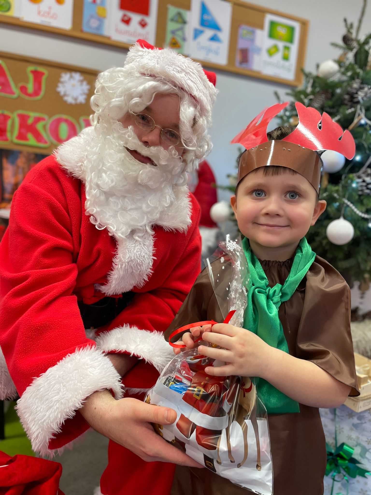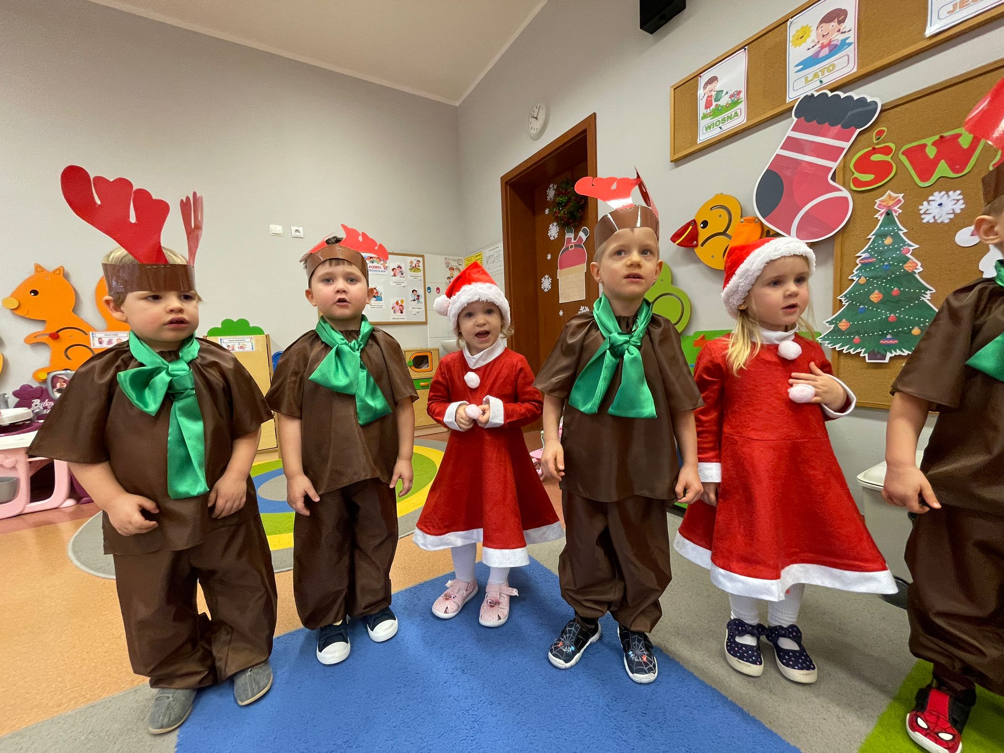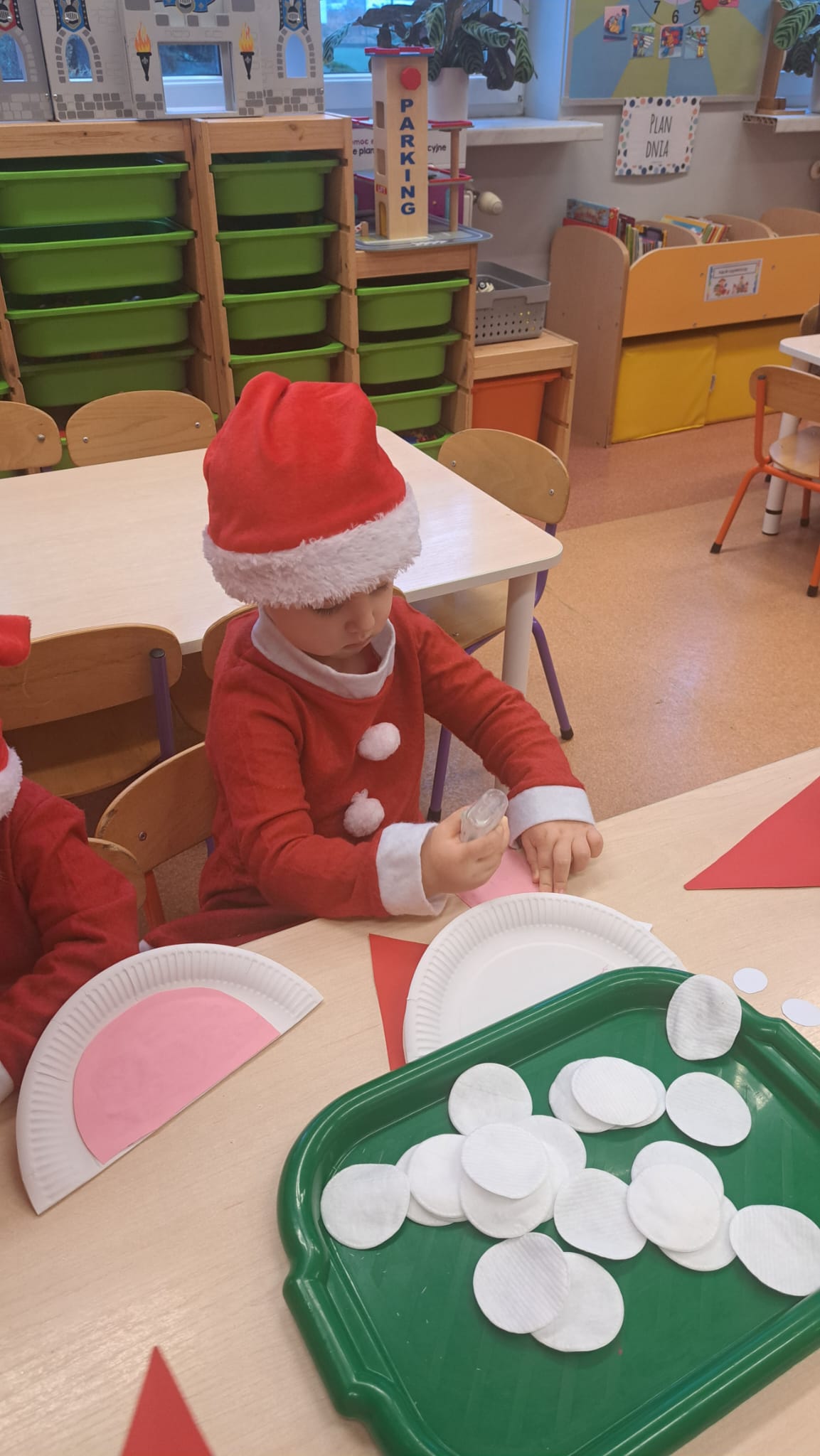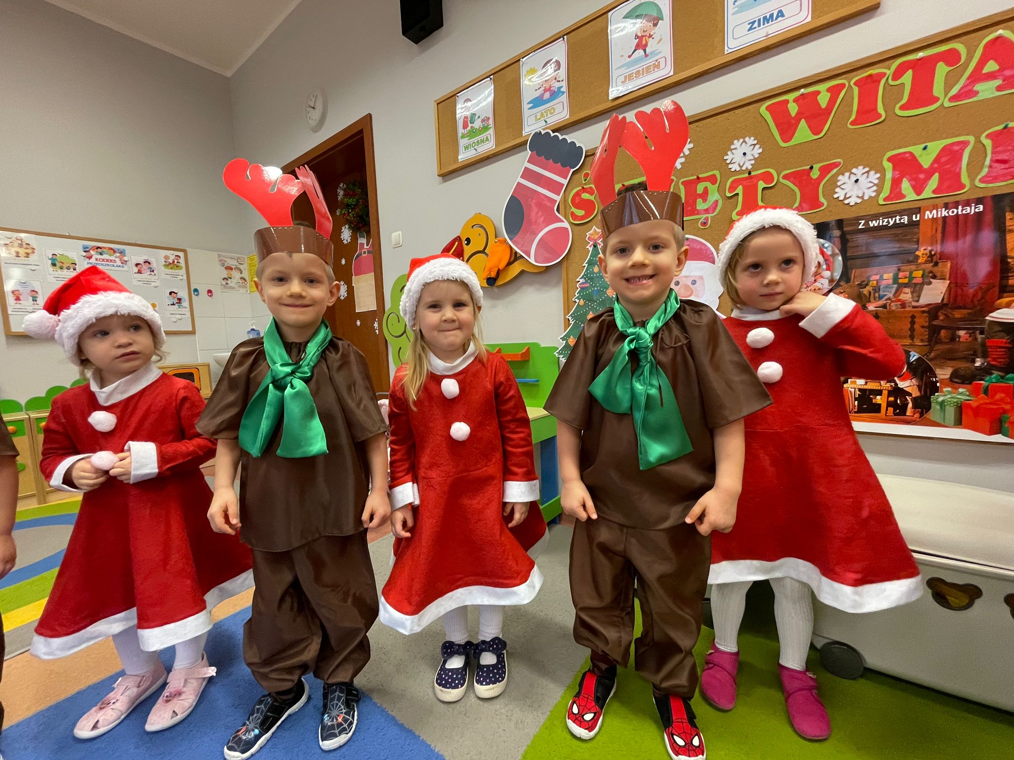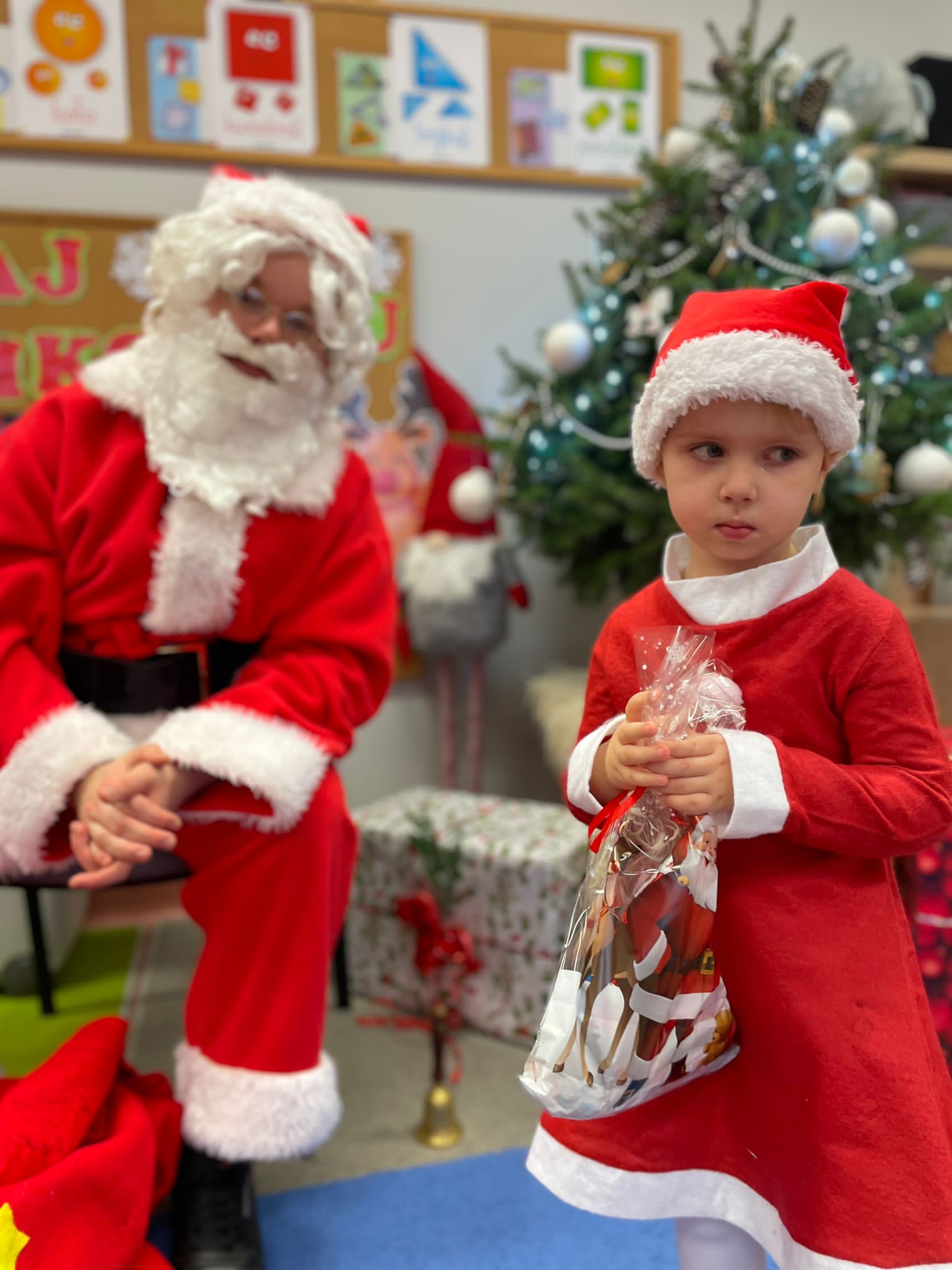 Dziś maluszki z niecierpliwością oczekiwały na wizytę Świętego Mikołaja w naszej przedszkolnej sali. Wszystkie dzieci już od samego rana spoglądały w okno, nasłuchiwały „Mikołajowych” dzwoneczków i radosną piosenką zapraszały Mikołaja. Wyczarowały także świąteczny klimat i wspólnie ubrały choinkę, przy której później wesoło się bawiły. Święty Mikołaj nie zawiódł i i nie kazał długo na siebie czekać… Wszedł ze swoim tubalnym „Ho, Ho, Ho „…I z pewnością też był bardzo zadowolony ze spotkania, bo uśmiech nie znikał z jego twarzy. Dzieci długo wspominały chwile spędzone z Mikołajem, z dużym entuzjazmem rozpakowywały prezenty oraz zerkały przez okno z nadzieją, że jeszcze raz zobaczą naszego gościa i pomachają mu na pożegnanie.