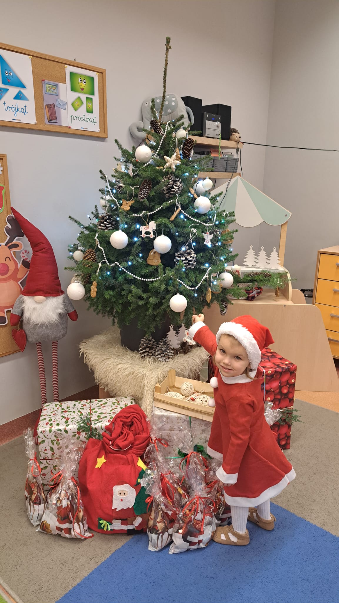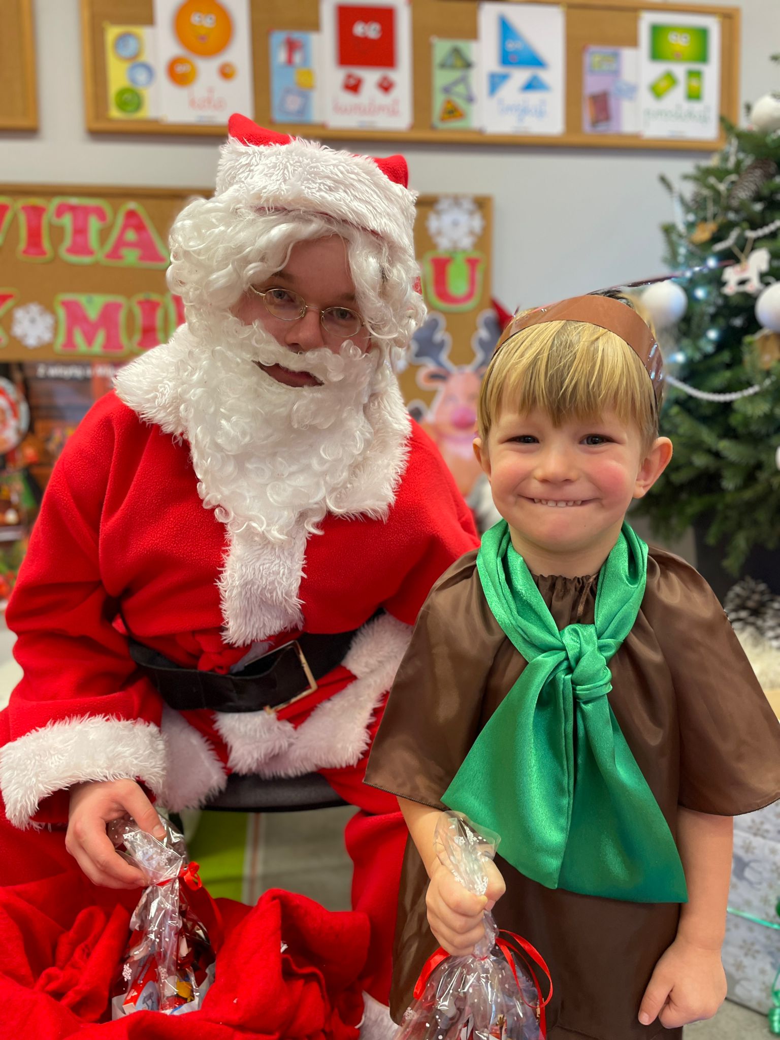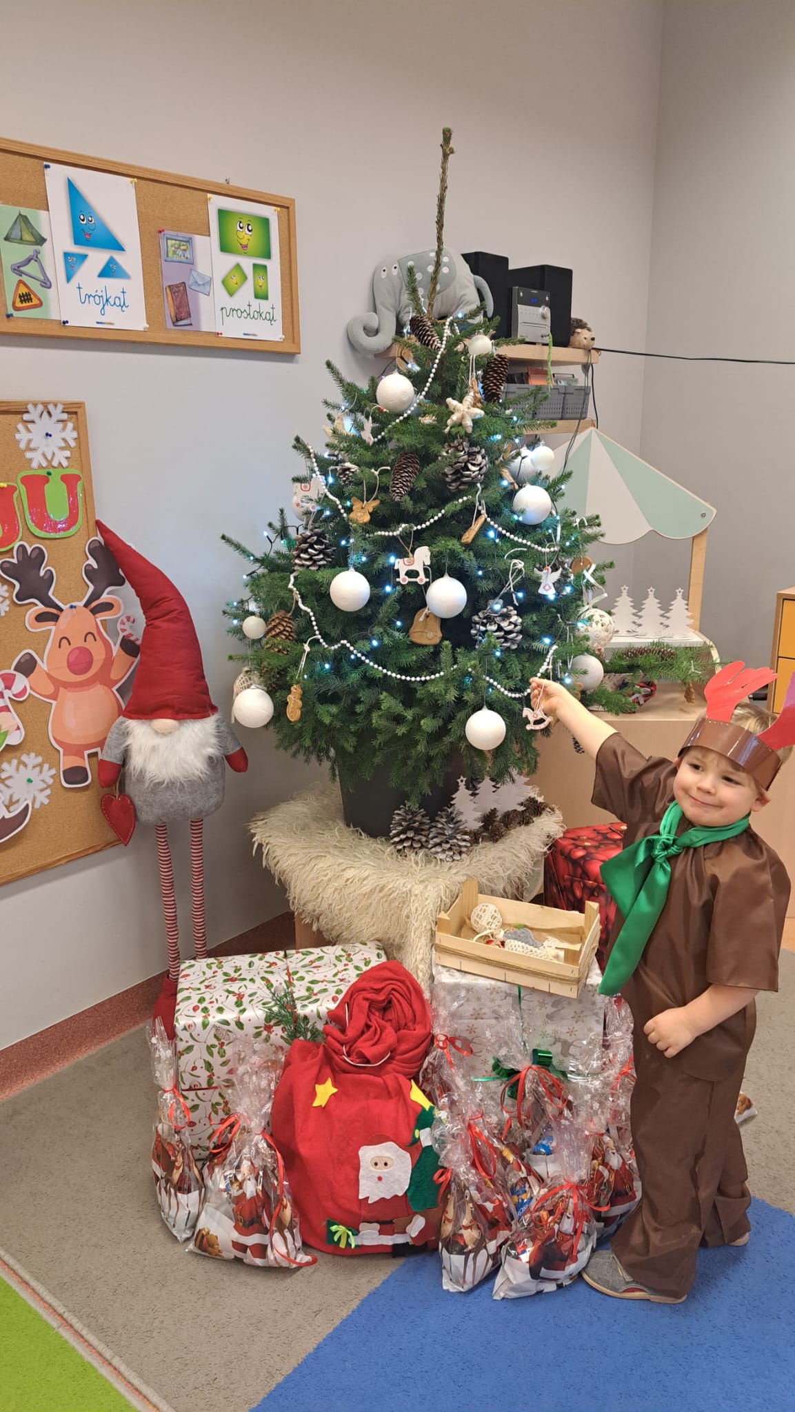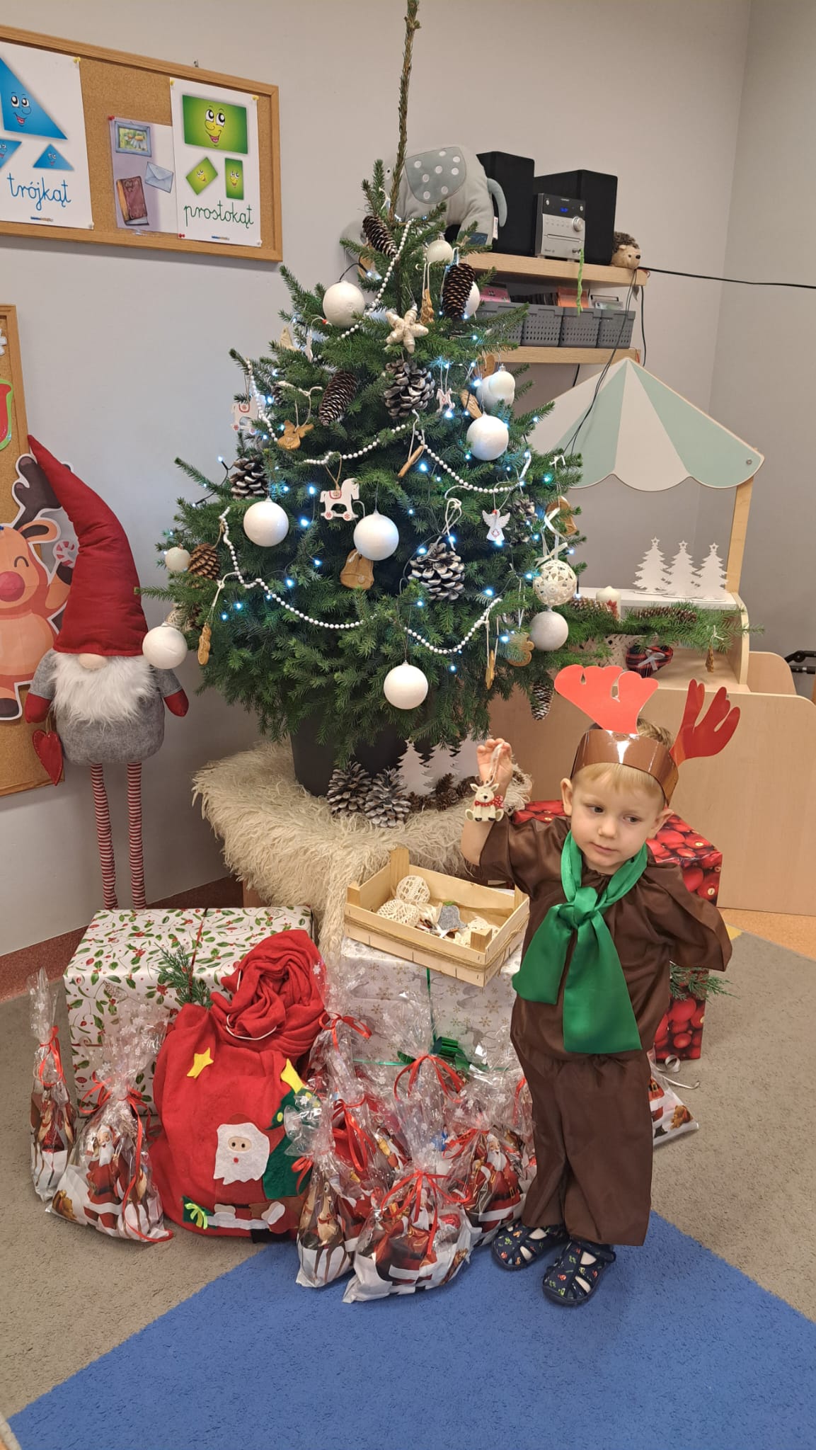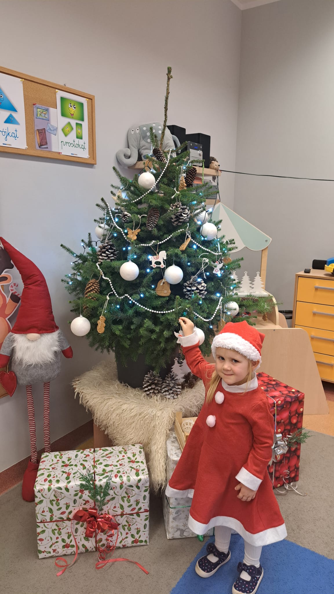 Dziś maluszki z niecierpliwością oczekiwały na wizytę Świętego Mikołaja w naszej przedszkolnej sali. Wszystkie dzieci już od samego rana spoglądały w okno, nasłuchiwały „Mikołajowych” dzwoneczków i radosną piosenką zapraszały Mikołaja. Wyczarowały także świąteczny klimat i wspólnie ubrały choinkę, przy której później wesoło się bawiły. Święty Mikołaj nie zawiódł i i nie kazał długo na siebie czekać… Wszedł ze swoim tubalnym „Ho, Ho, Ho „…I z pewnością też był bardzo zadowolony ze spotkania, bo uśmiech nie znikał z jego twarzy. Dzieci długo wspominały chwile spędzone z Mikołajem, z dużym entuzjazmem rozpakowywały prezenty oraz zerkały przez okno z nadzieją, że jeszcze raz zobaczą naszego gościa i pomachają mu na pożegnanie.