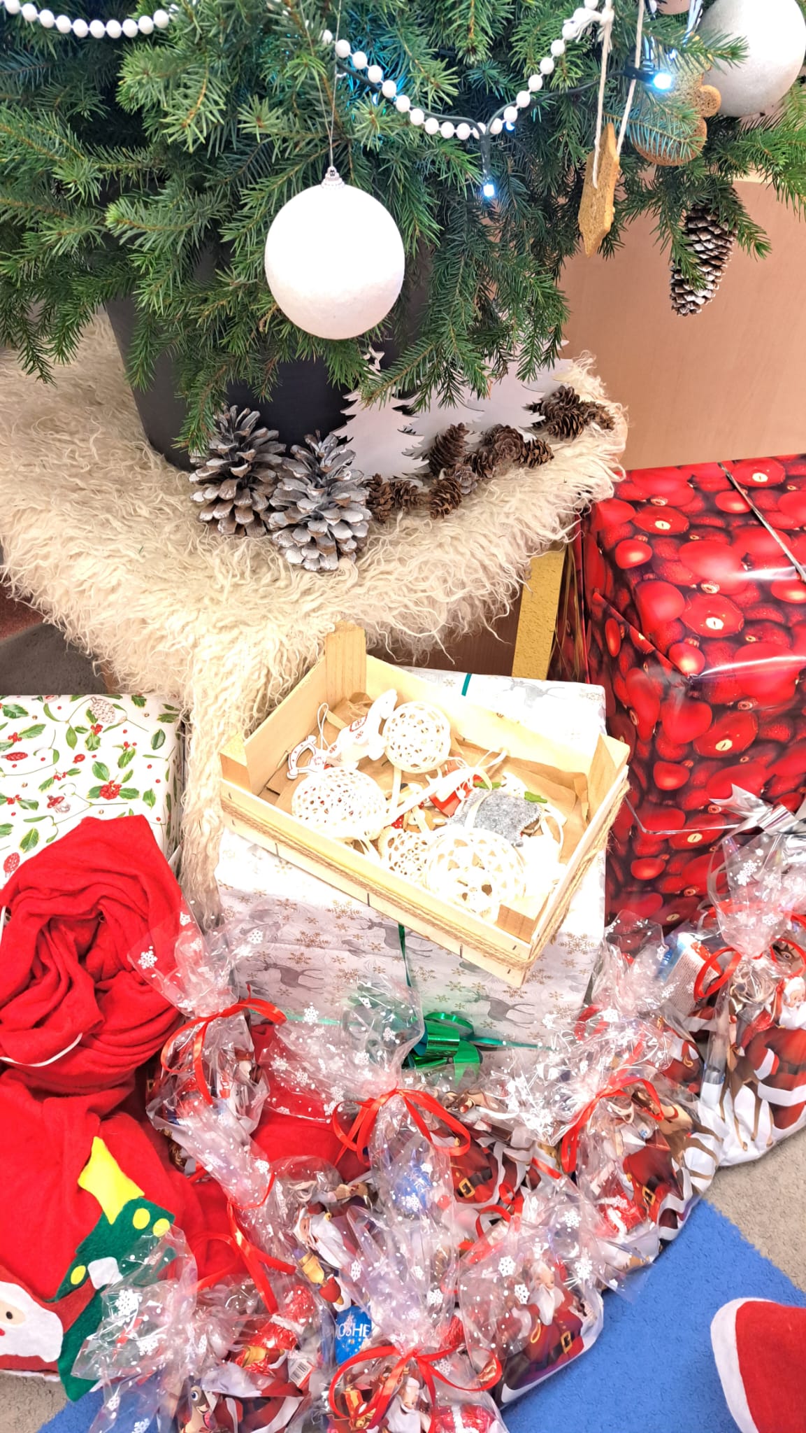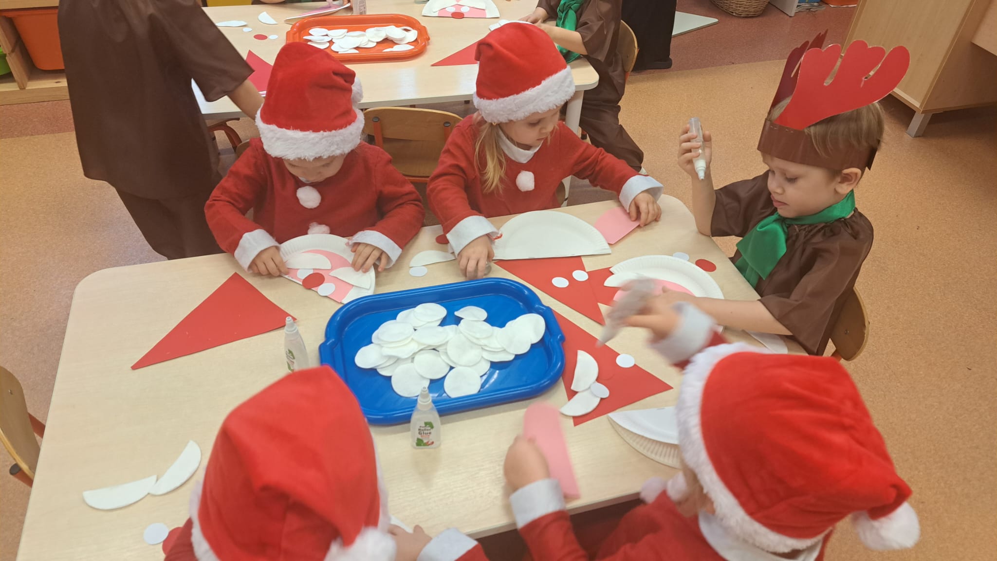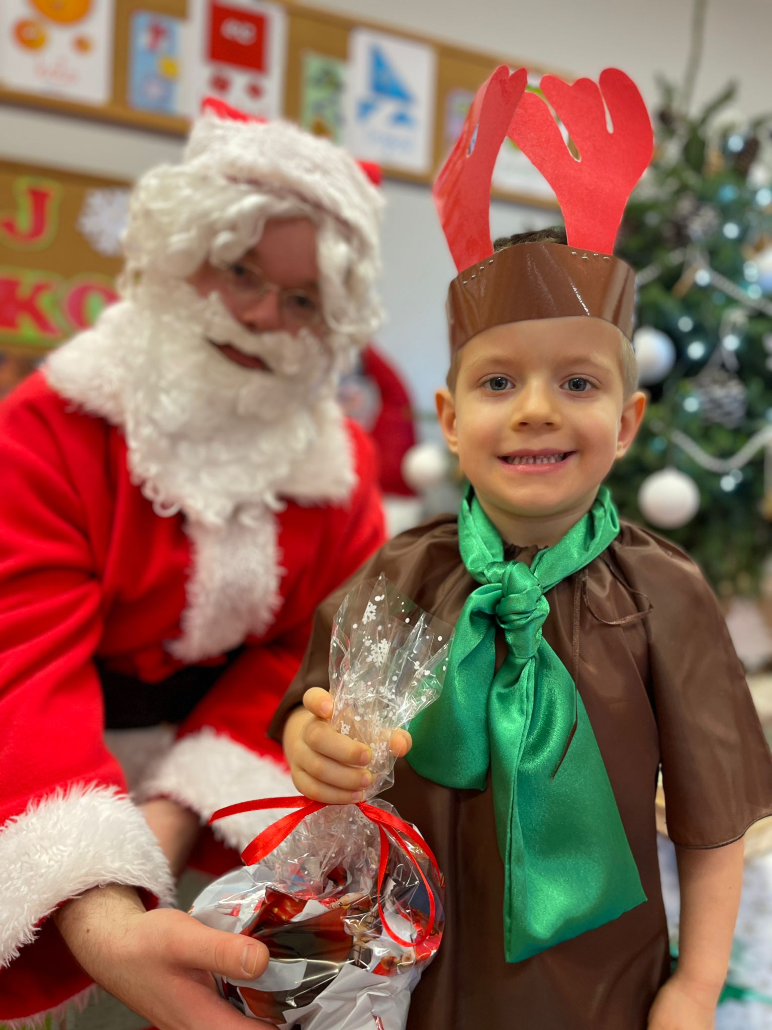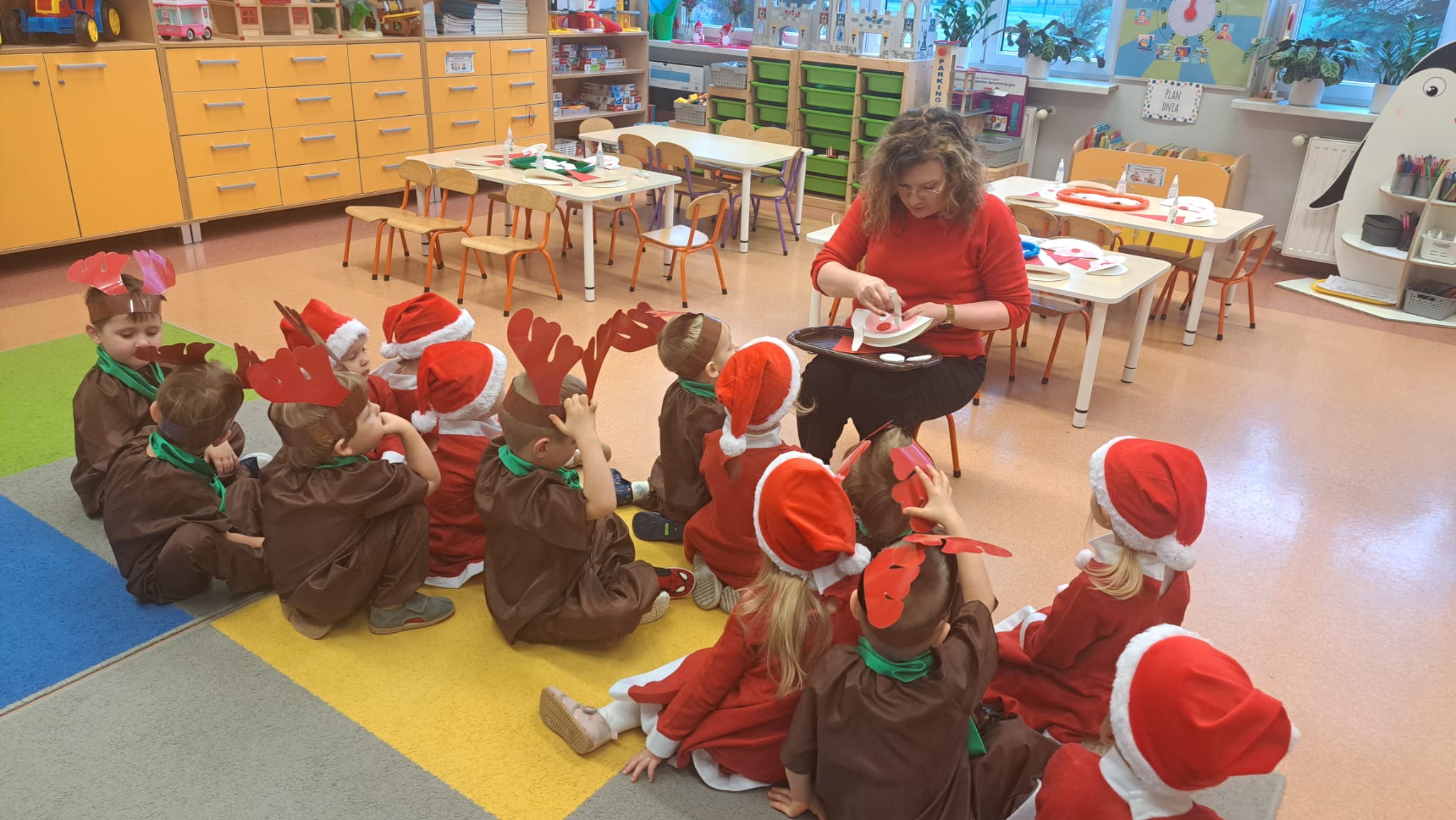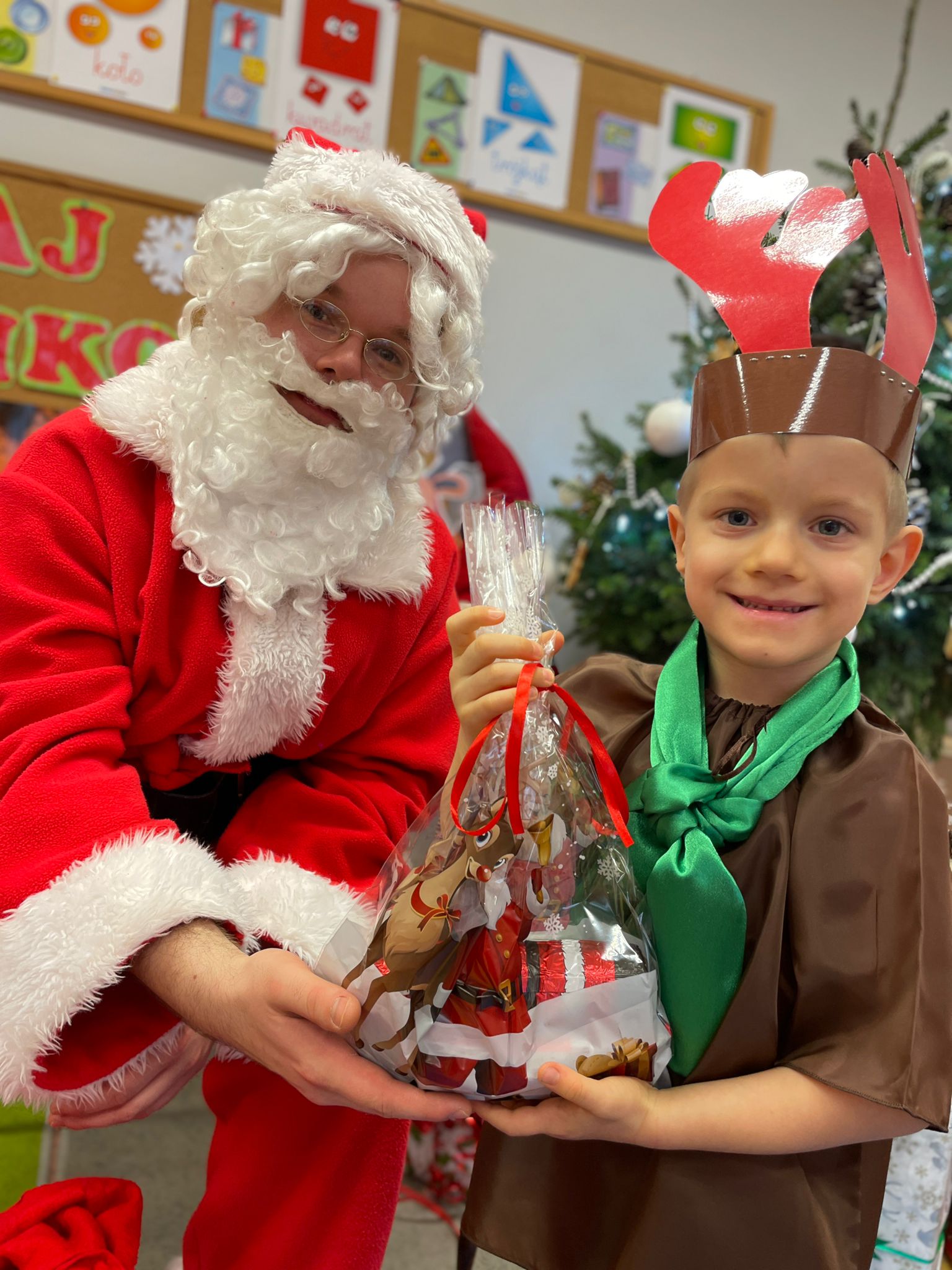Dziś maluszki z niecierpliwością oczekiwały na wizytę Świętego Mikołaja w naszej przedszkolnej sali. Wszystkie dzieci już od samego rana spoglądały w okno, nasłuchiwały „Mikołajowych” dzwoneczków i radosną piosenką zapraszały Mikołaja. Wyczarowały także świąteczny klimat i wspólnie ubrały choinkę, przy której później wesoło się bawiły. Święty Mikołaj nie zawiódł i i nie kazał długo na siebie czekać… Wszedł ze swoim tubalnym „Ho, Ho, Ho „…I z pewnością też był bardzo zadowolony ze spotkania, bo uśmiech nie znikał z jego twarzy. Dzieci długo wspominały chwile spędzone z Mikołajem, z dużym entuzjazmem rozpakowywały prezenty oraz zerkały przez okno z nadzieją, że jeszcze raz zobaczą naszego gościa i pomachają mu na pożegnanie.
