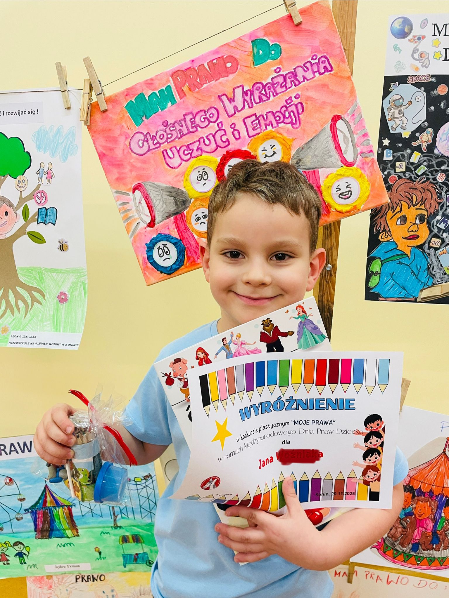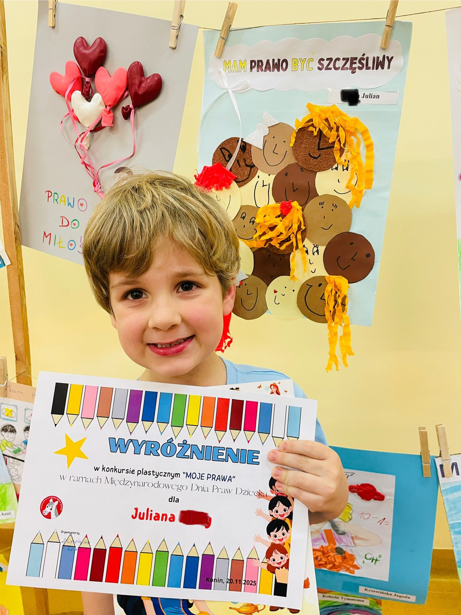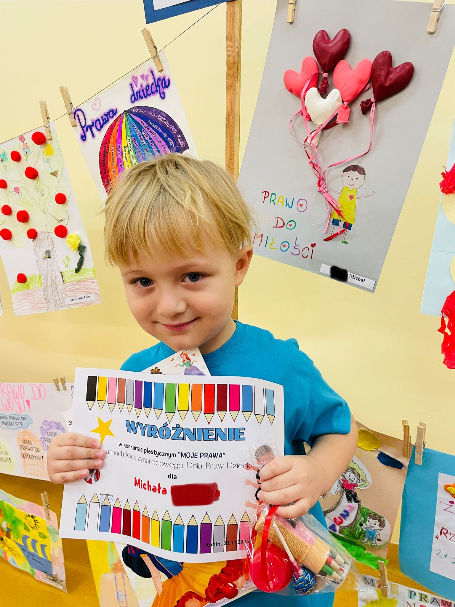 Z okazji listopadowego Międzynarodowego Dnia Praw Dziecka w Białym koniki zorganizowany został konkurs plastyczny "Moje prawa". Wzięły w nim udział dzieci z grupy XI i XII. Celem akcji było promowanie wiedzy o prawach dziecka oraz rozwijanie twórczej ekspresji najmłodszych. Uczestnicy przygotowywali swoje prace w domu, wykazując się dużą kreatywnością i wrażliwością. Wszystkie dzieci zostały docenione za wkład pracy i podjęcie się tego działania. Każdy z nich otrzymał drobne nagrody za udział. Trzy prace naszych przedszkolaków otrzymały wyróżnienie. Natomiast praca Leona G. z gr. XI została wybrana, jako najlepiej wpisująca się w tematykę konkursu i będzie ją można zobaczyć wyświetlaną na ekranach autobusów miejskiej komunikacji w Koninie. Dziękujemy dzieciom za zaangażowanie, a rodzicom za wsparcie. Gratulujemy wszystkim uczestnikom i laureatom!